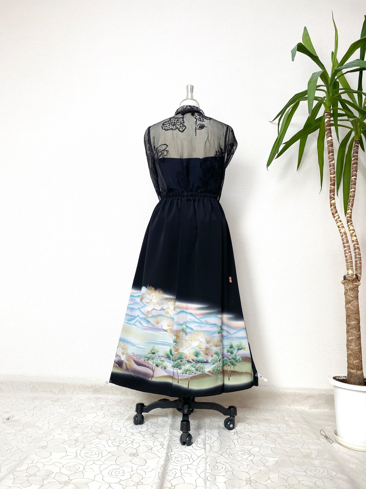 黒留袖着物をリメイクして作製したウエストゴムロングドレススカートフリーサイズです