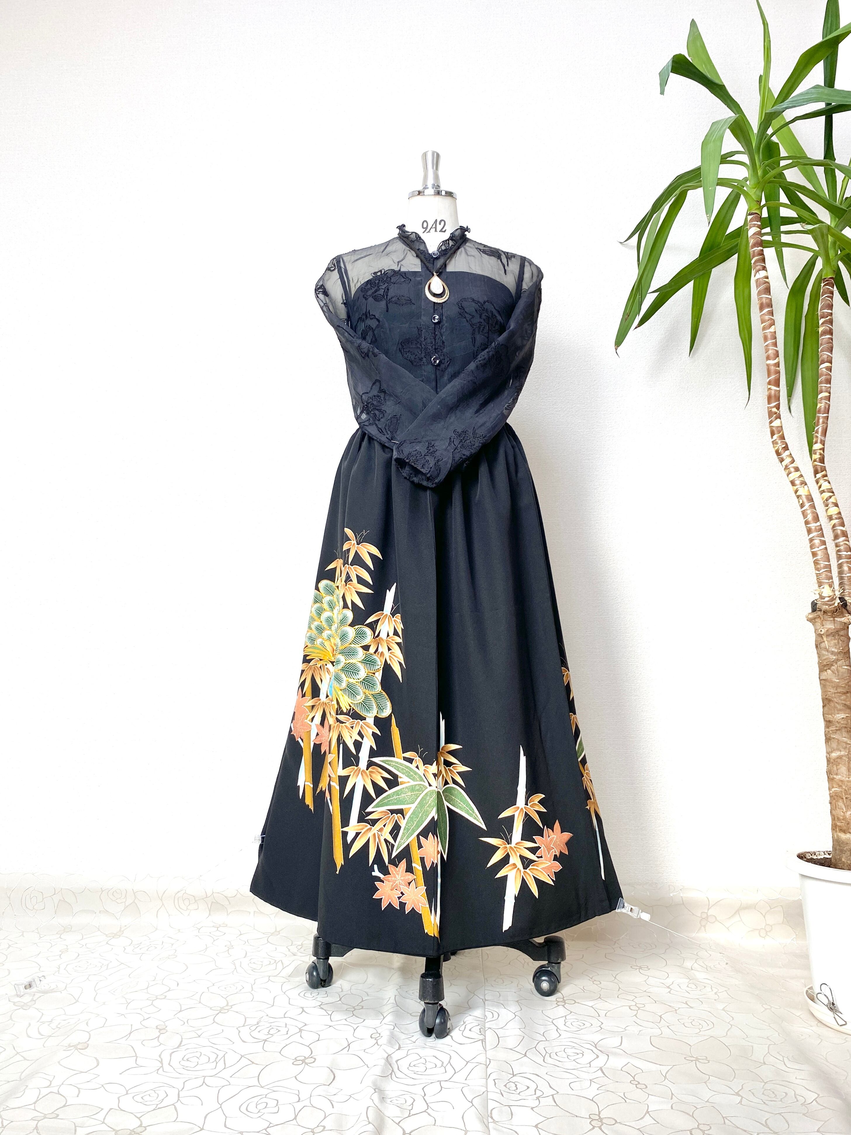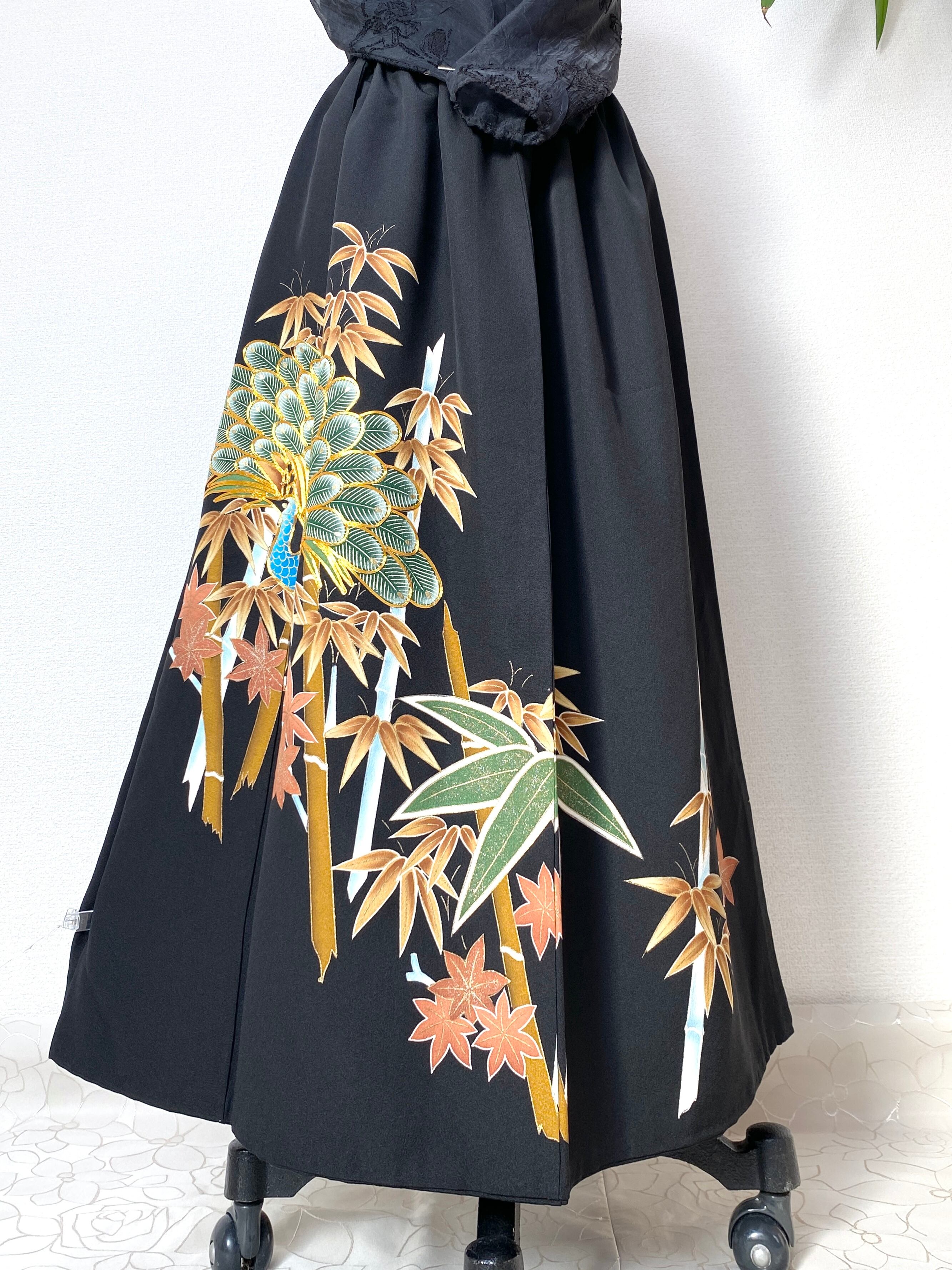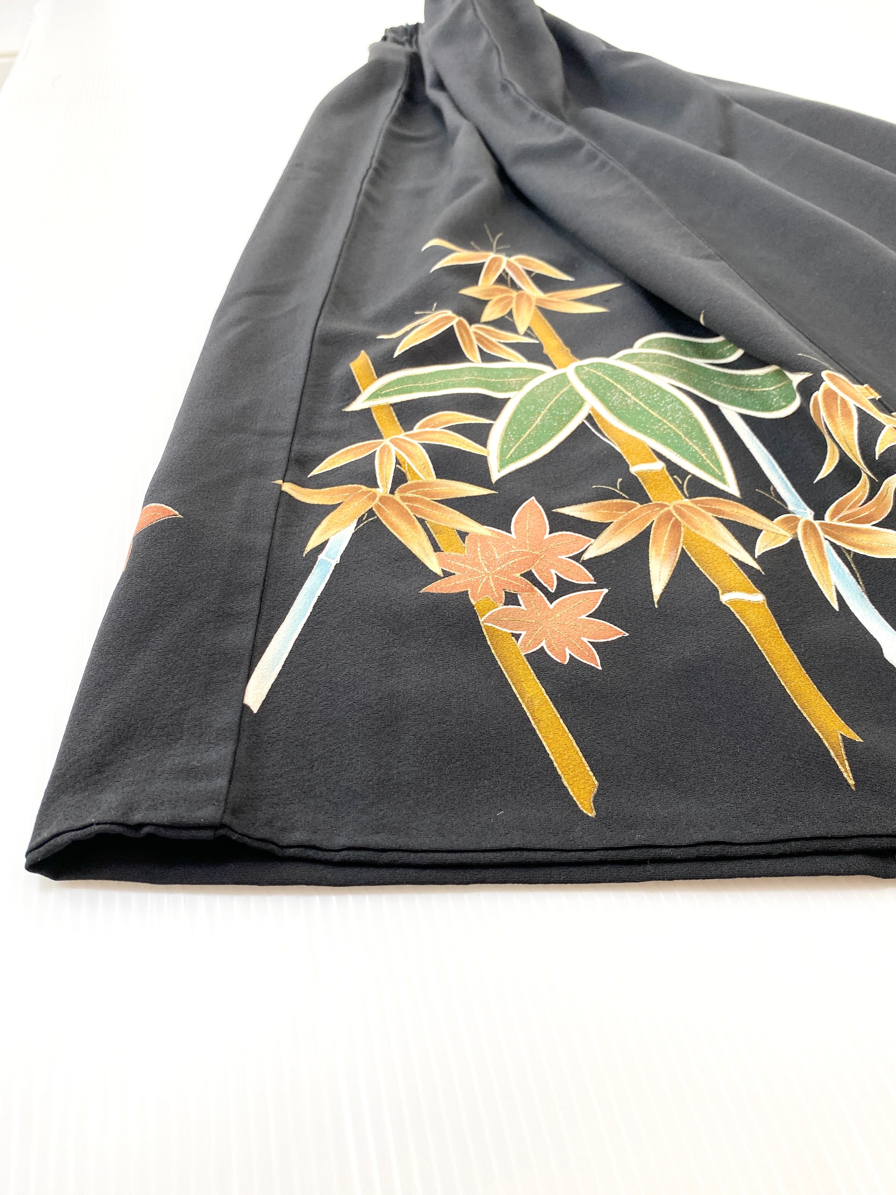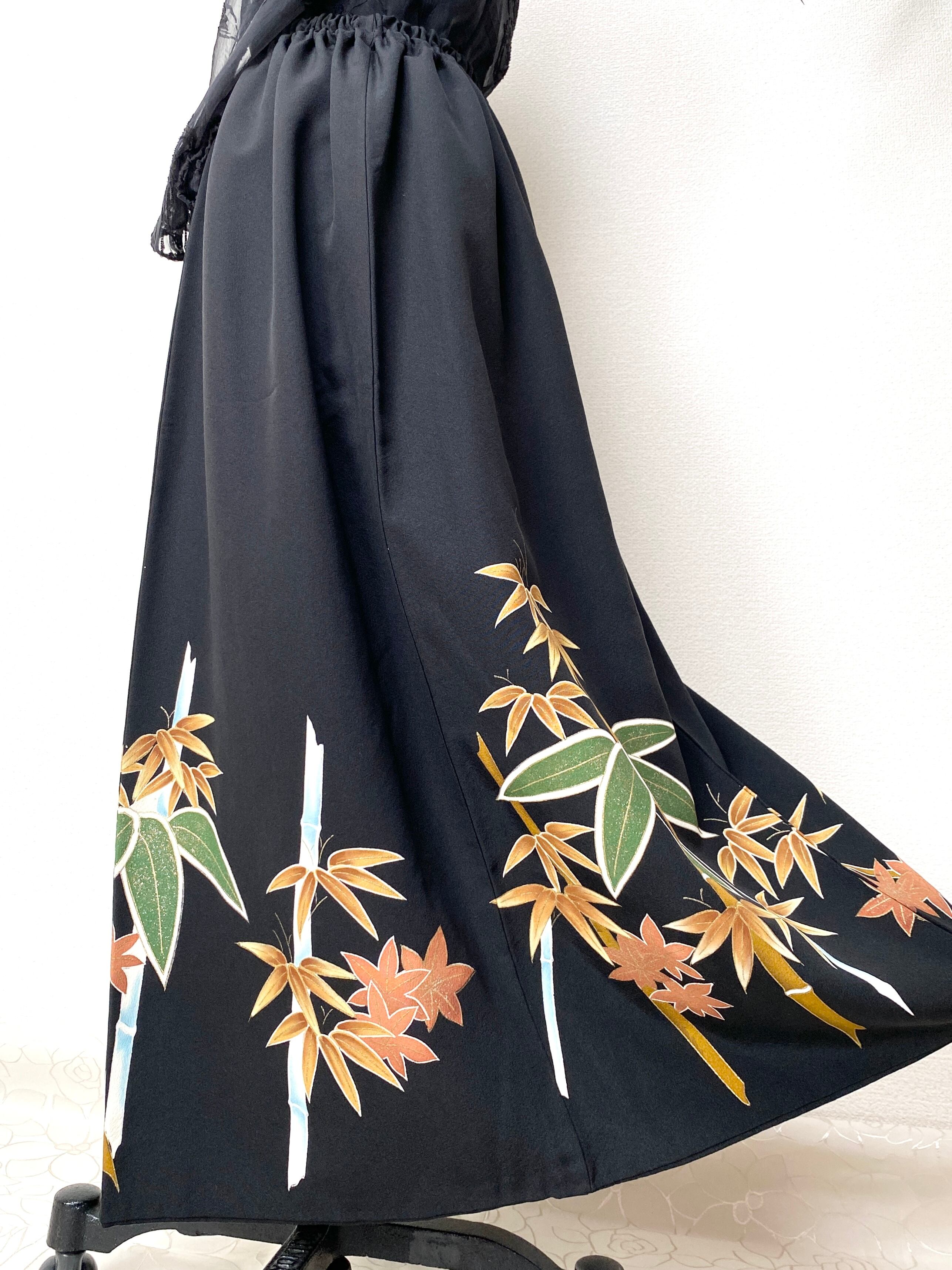 大人可愛いセレブ着物スカートフリーサイズ黒留袖着物リメイクウエストゴムロングスカート