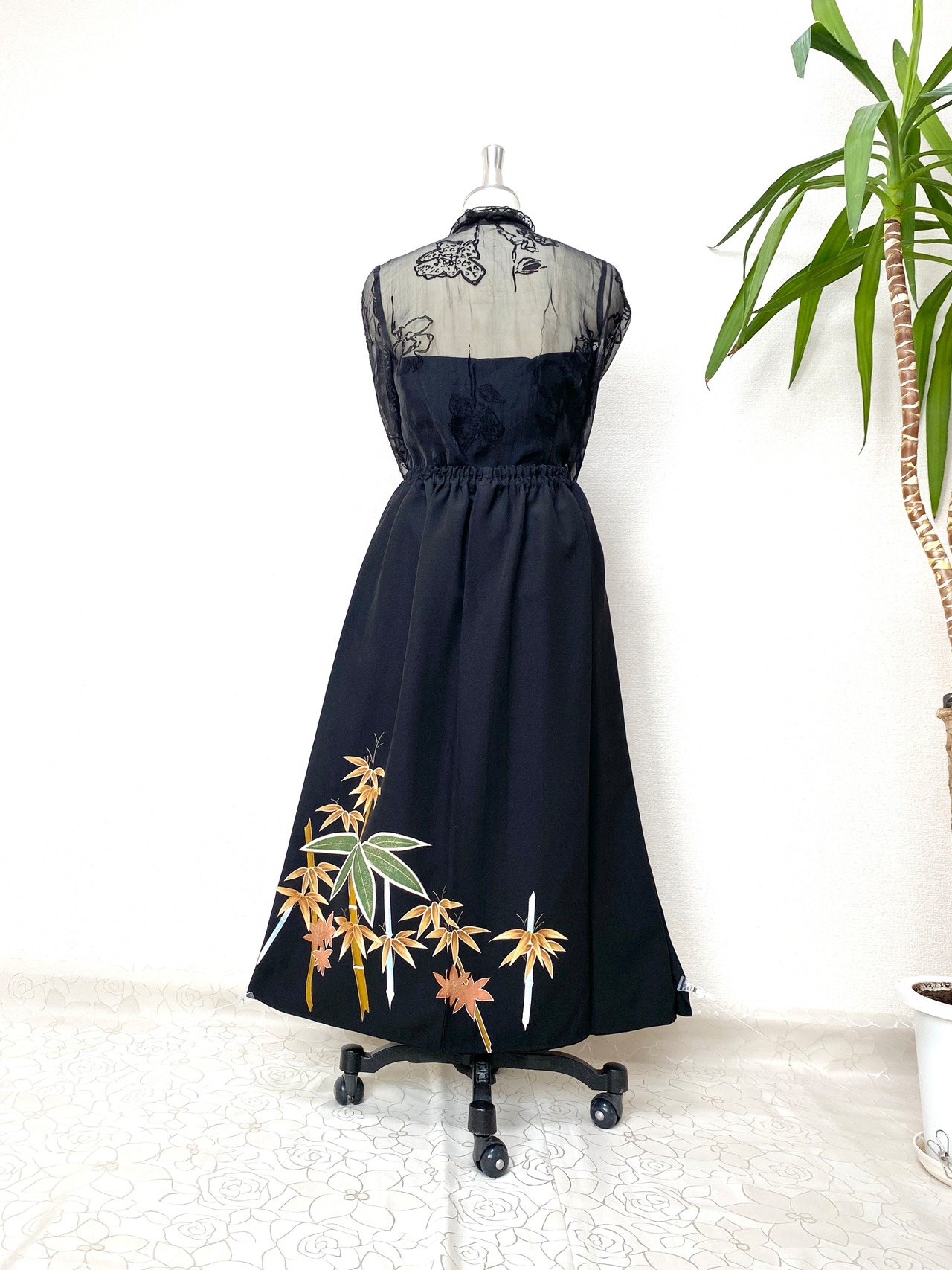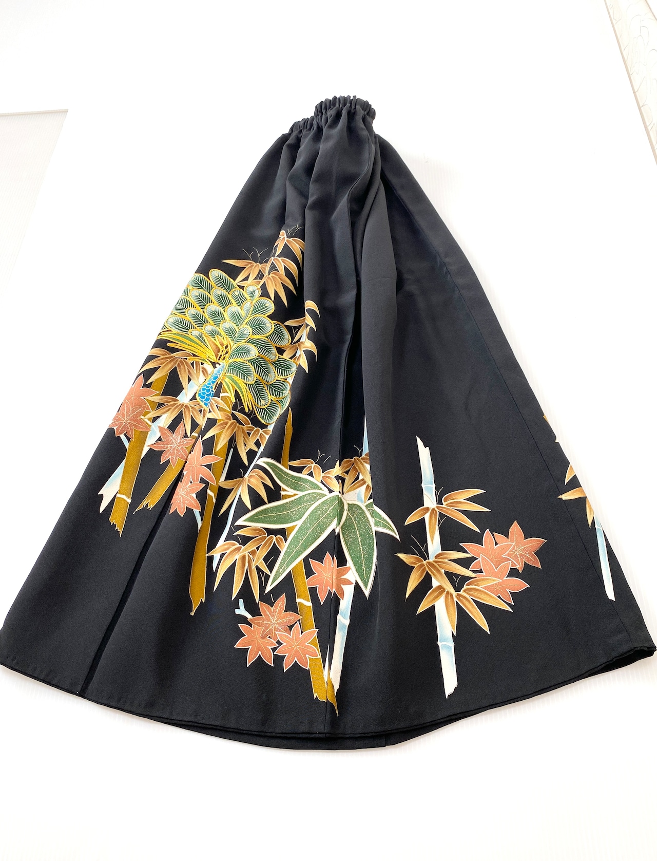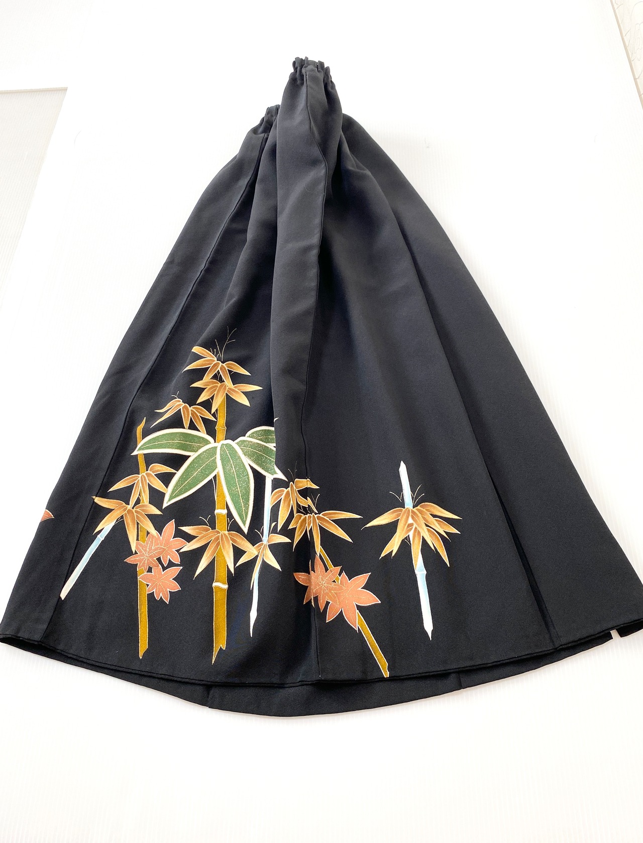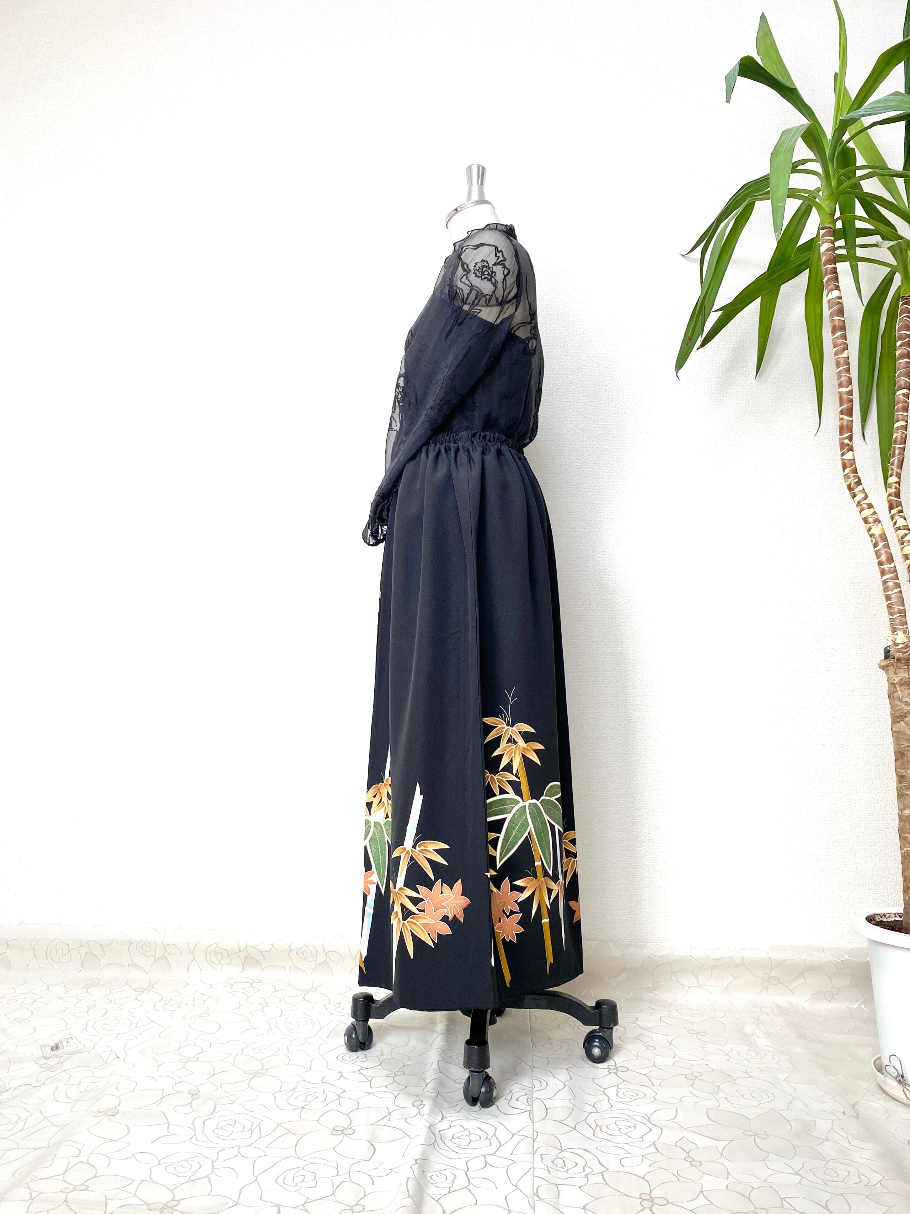 黒留袖着物をリメイクして作製したウエストゴムロングドレススカートフリーサイズです