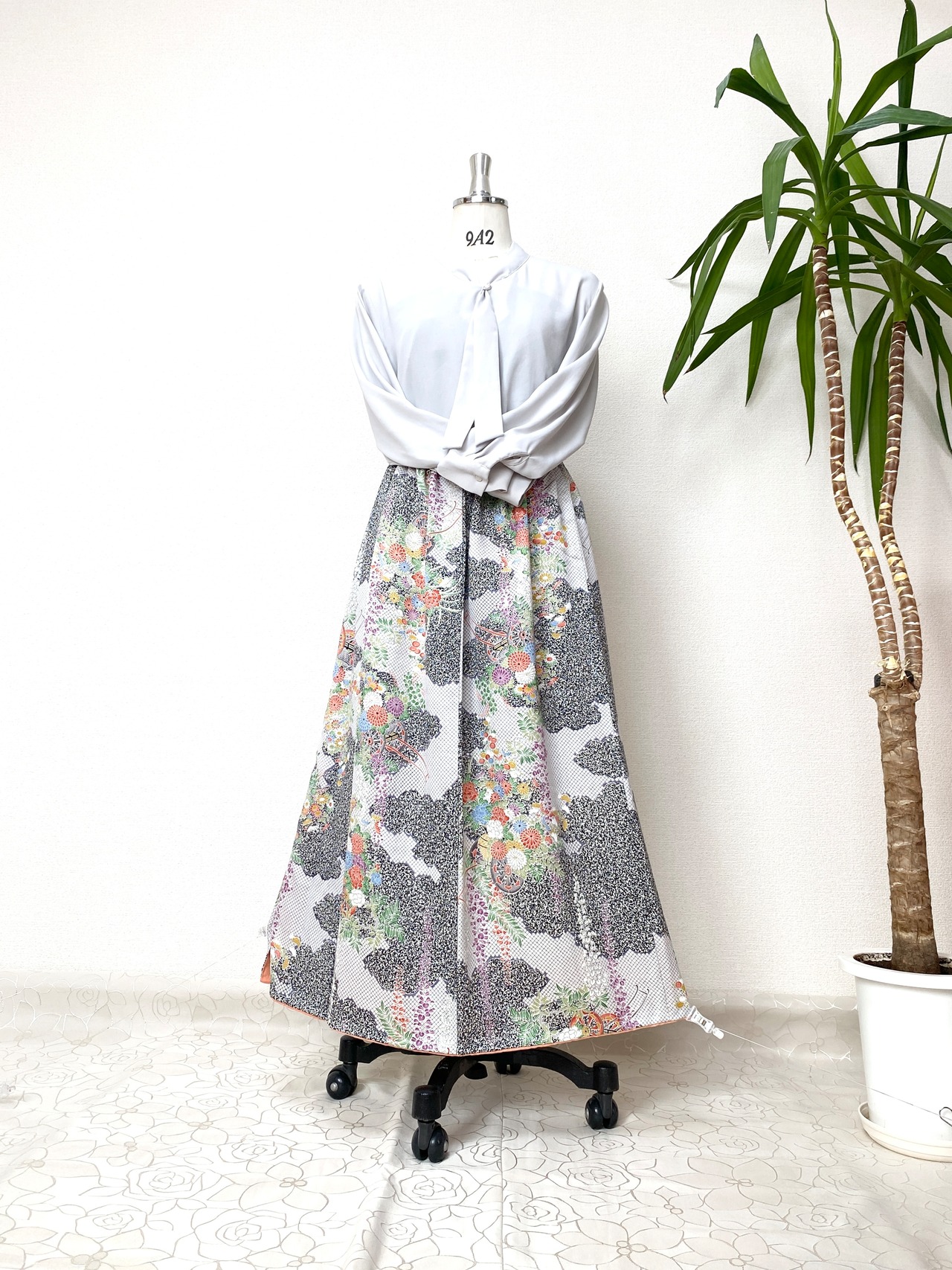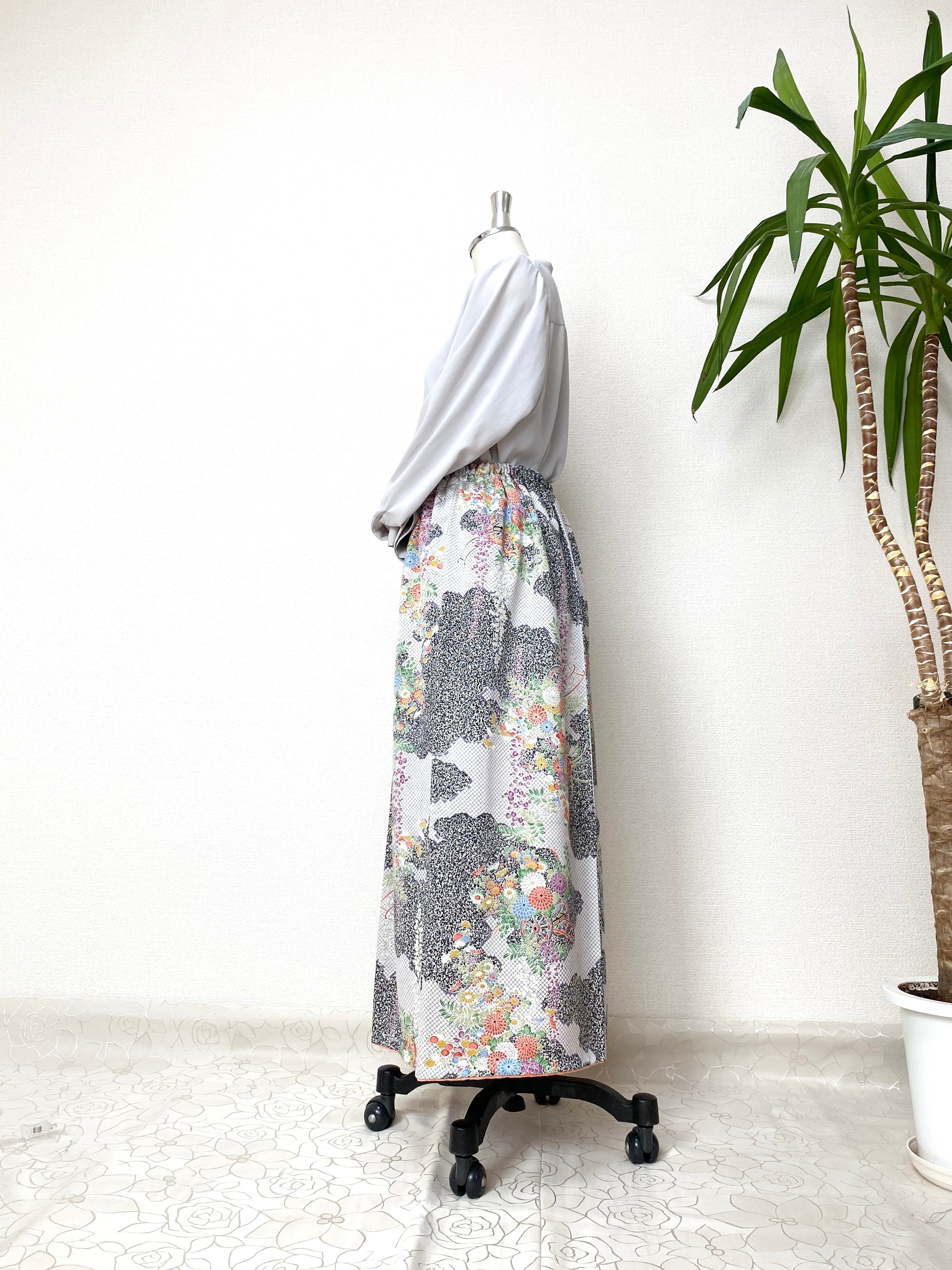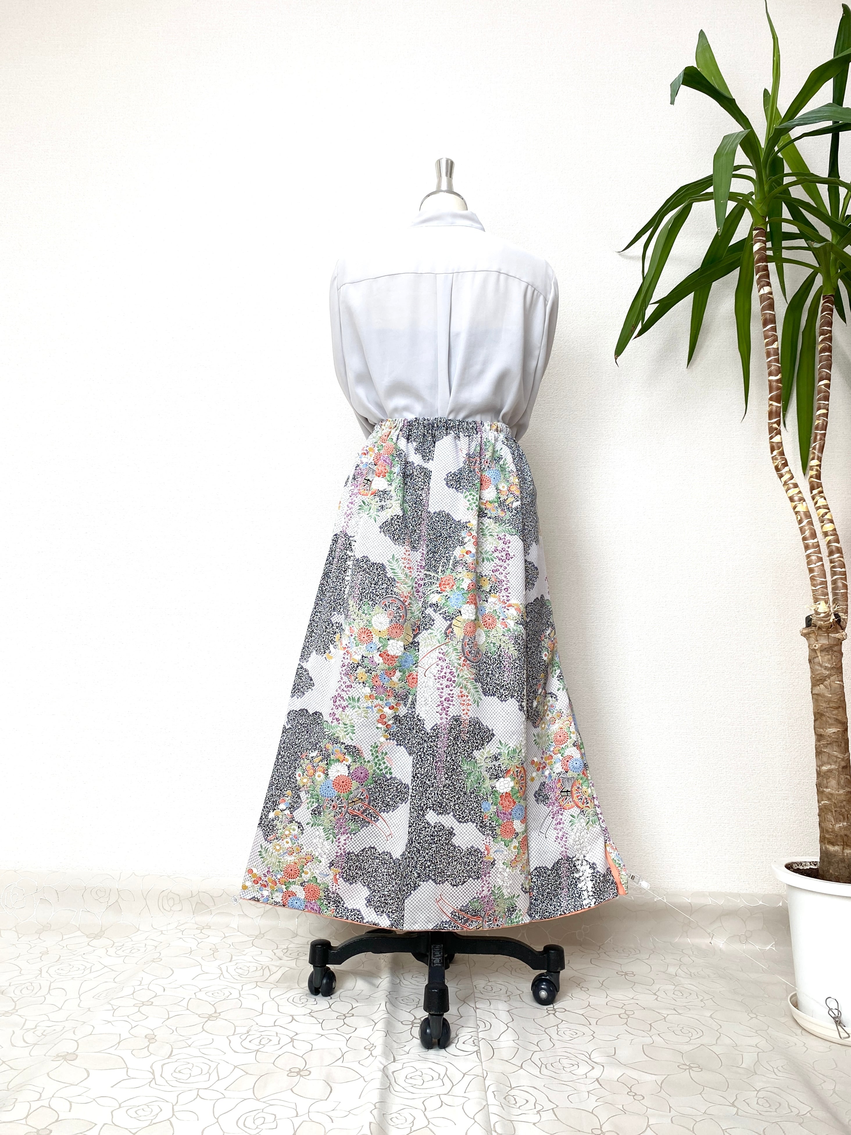 着物をリメイクして作製したウエストゴムロングドレススカートフリーサイズです
