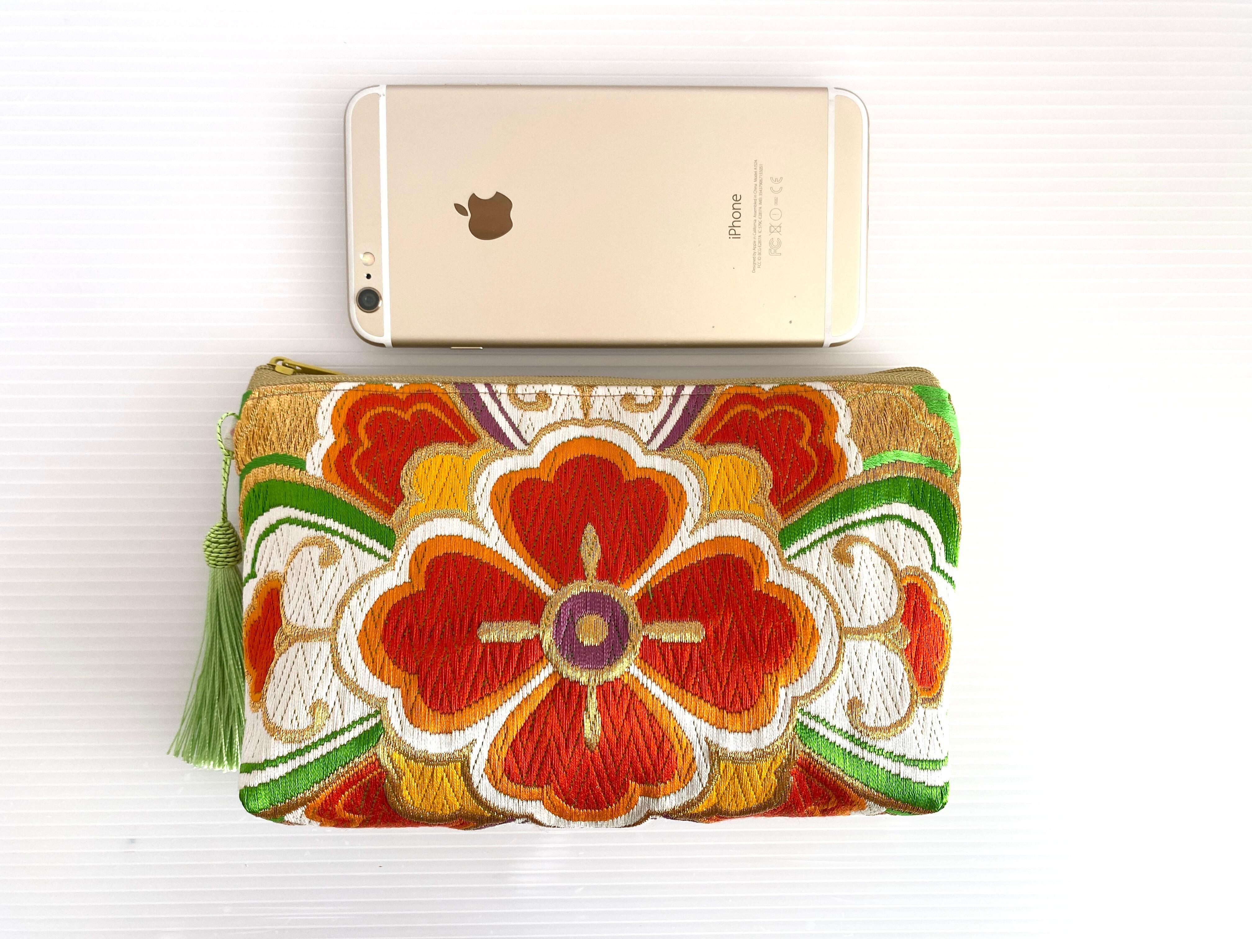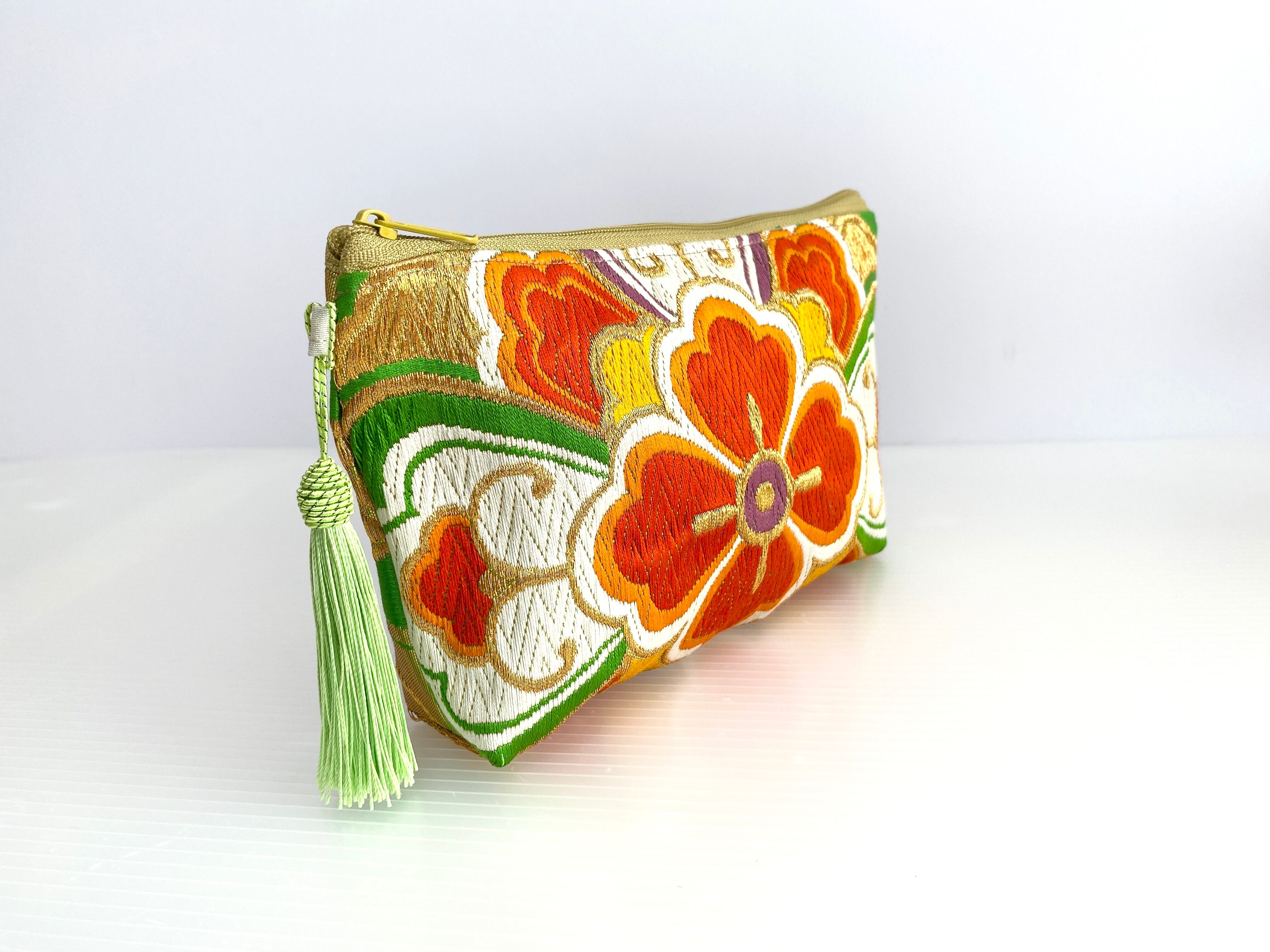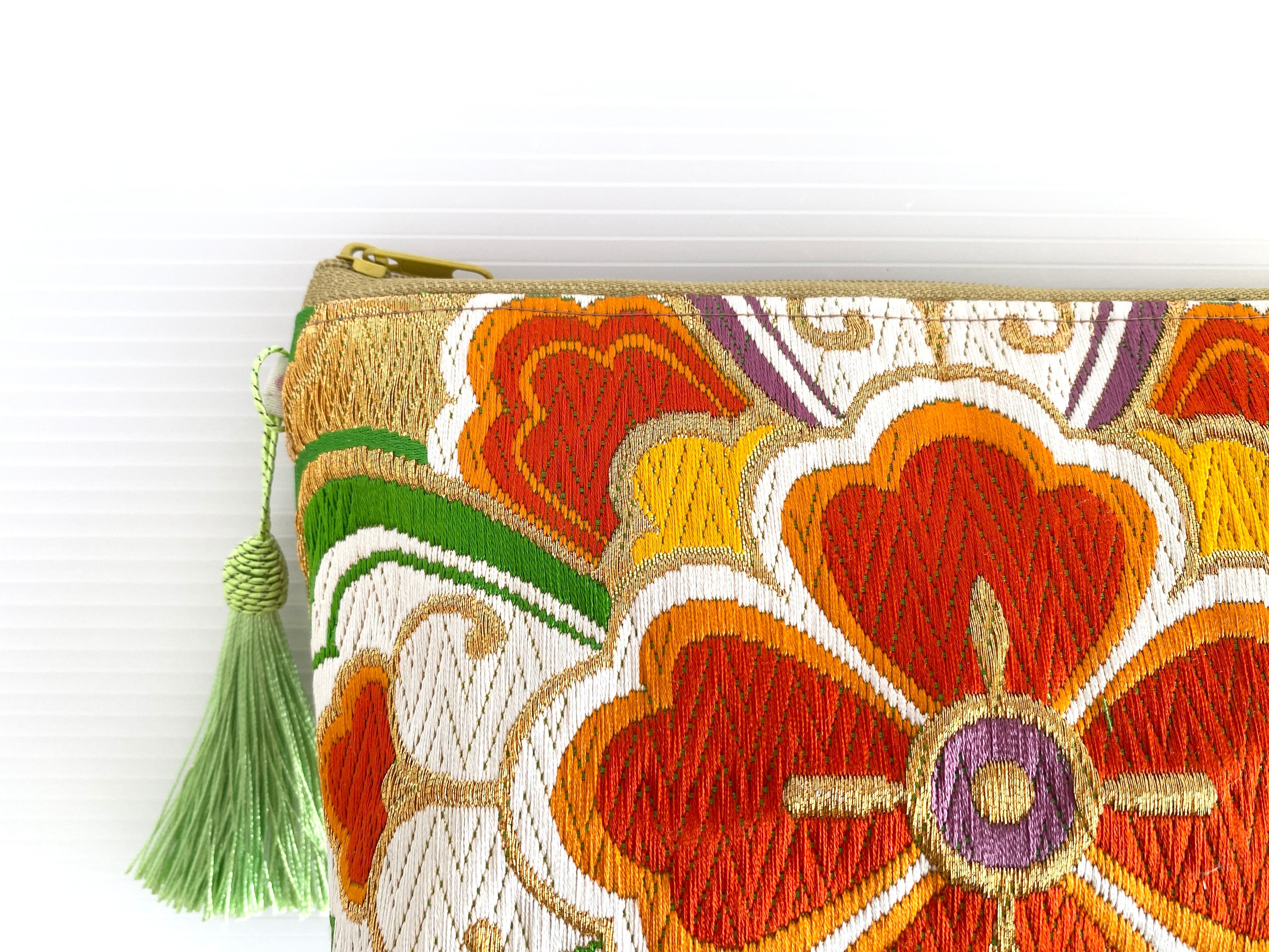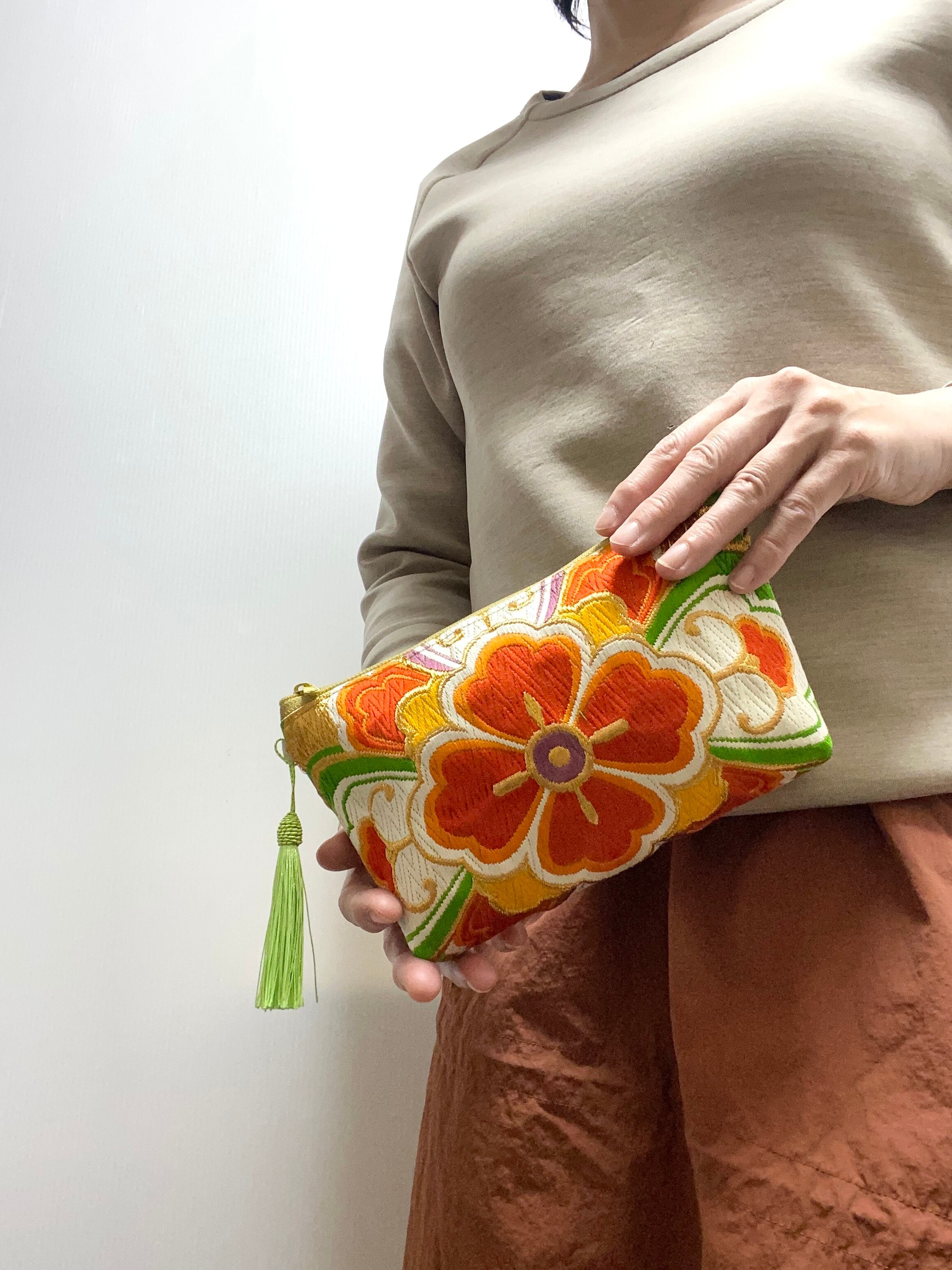 日本の古着物帯をリメイクして作製したポーチでハンドメイド品です