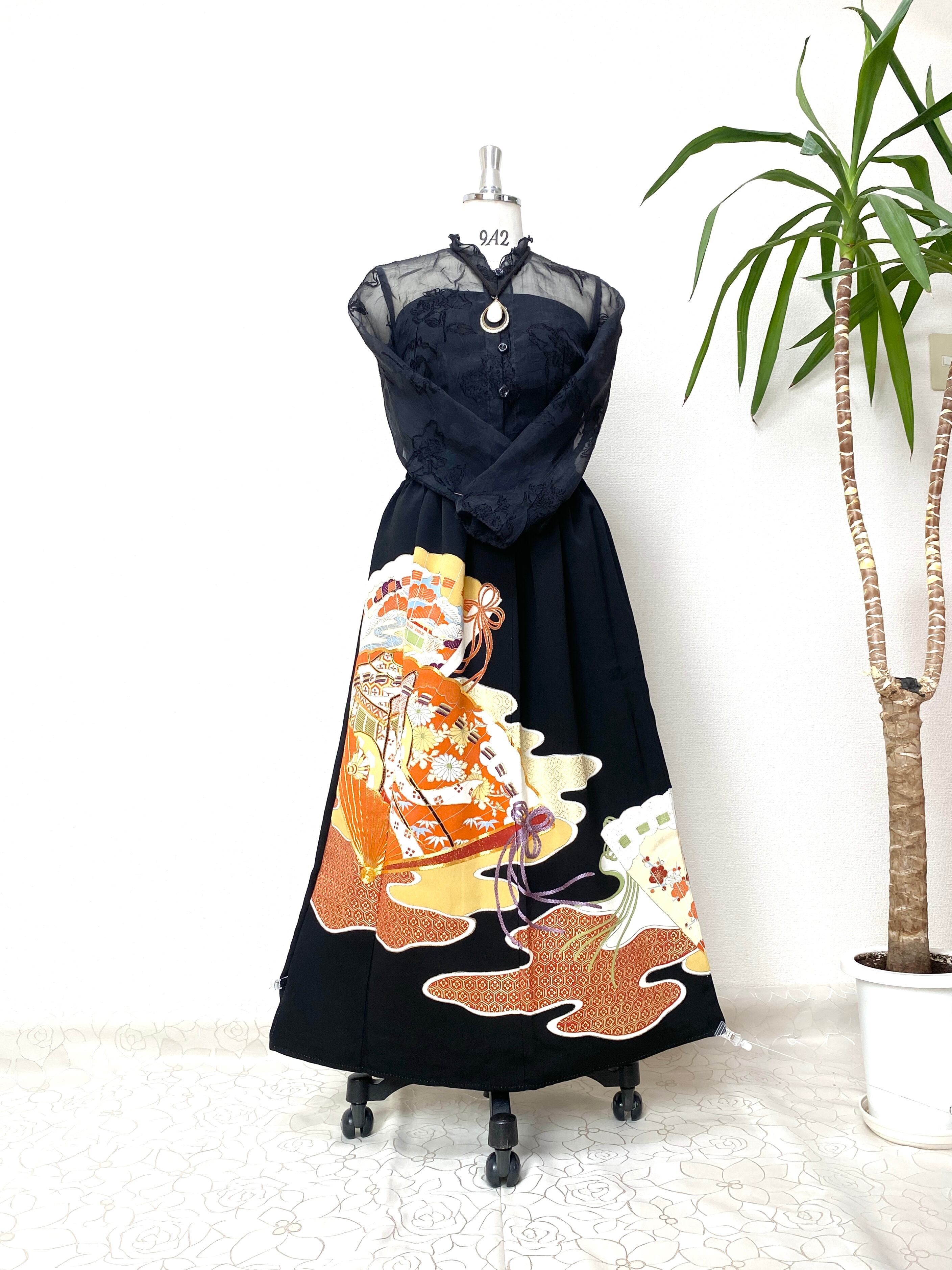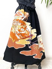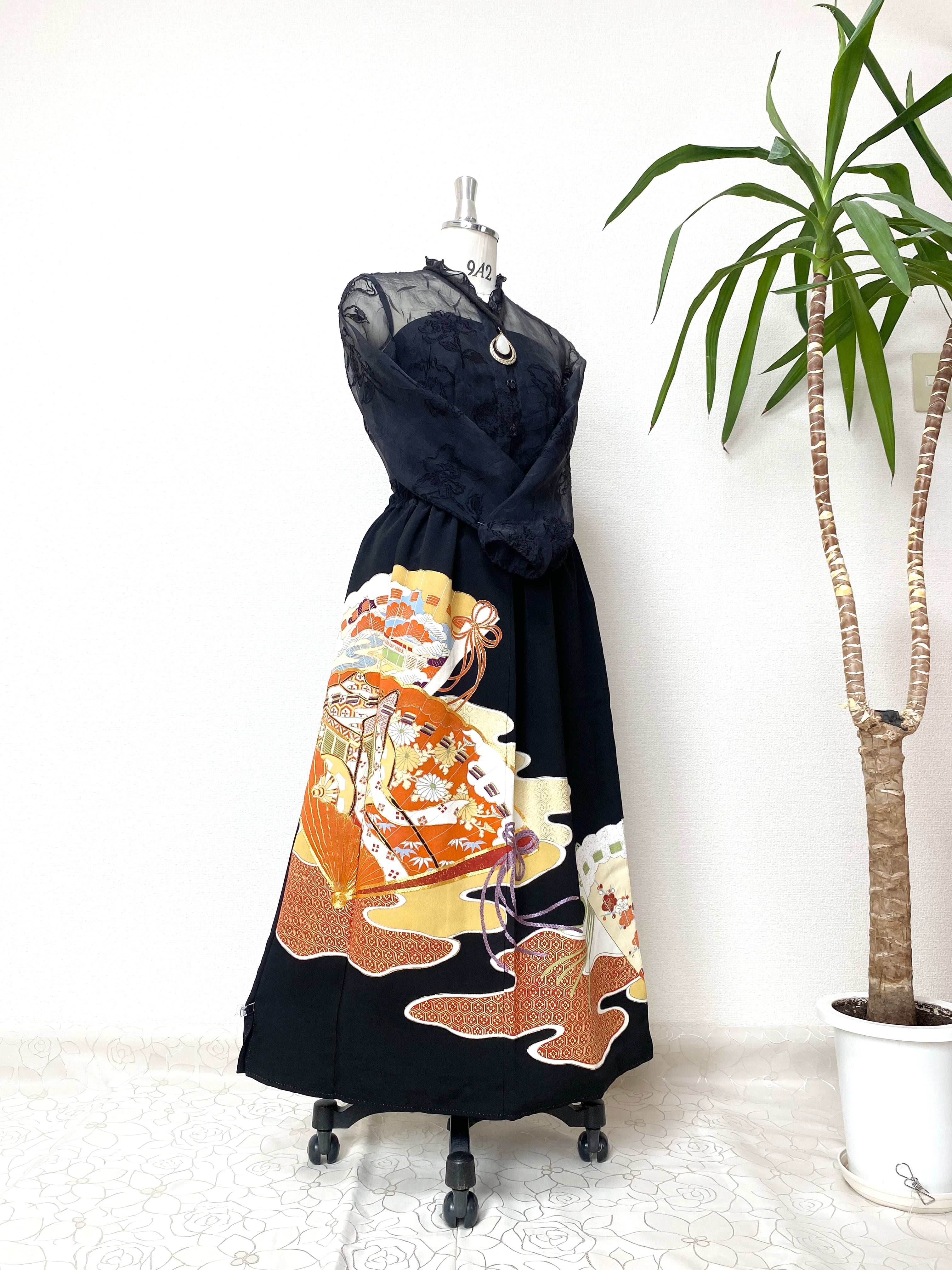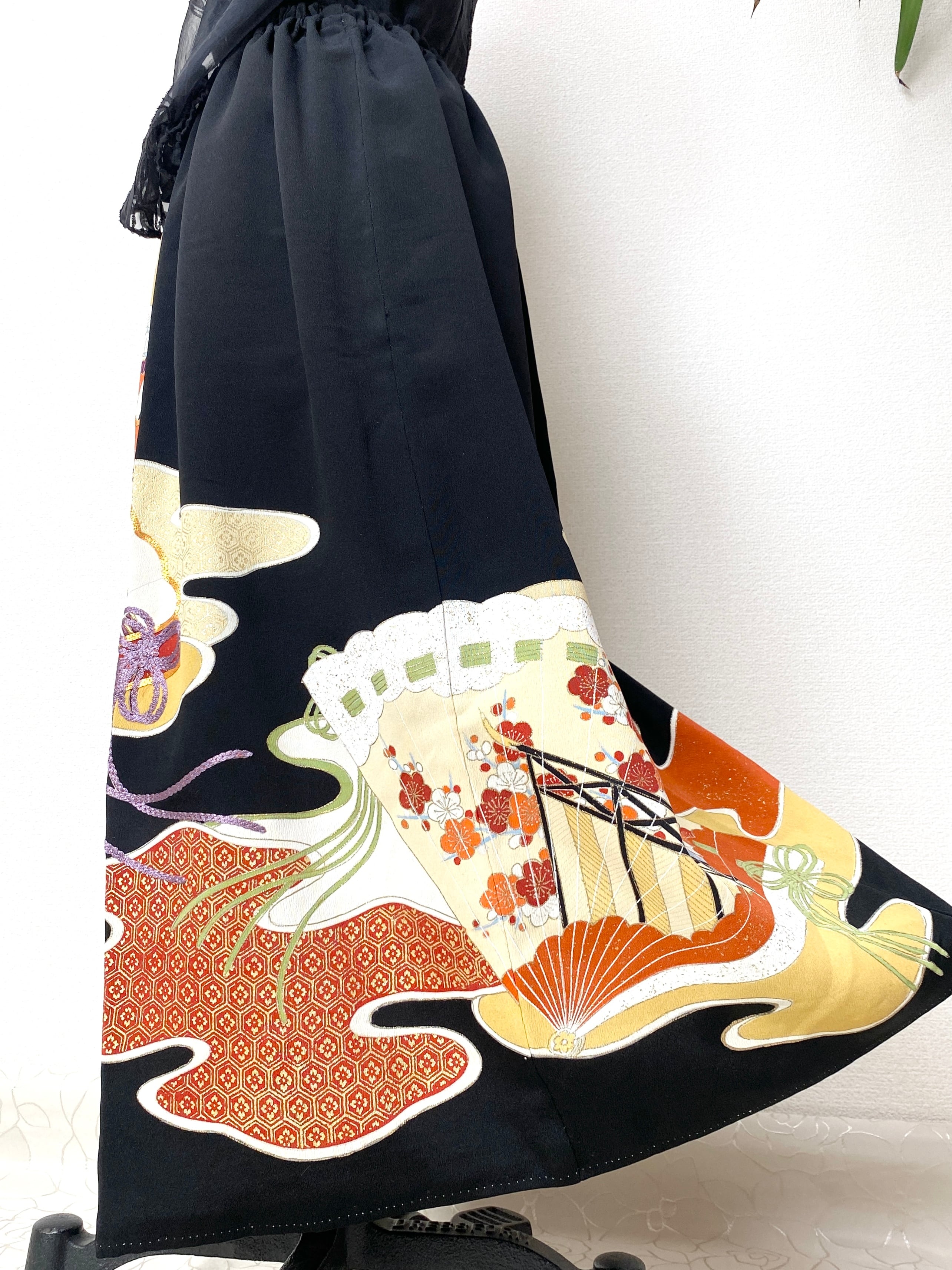 大人可愛いセレブ着物スカートフリーサイズ黒留袖着物リメイクウエストゴムロングスカート