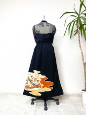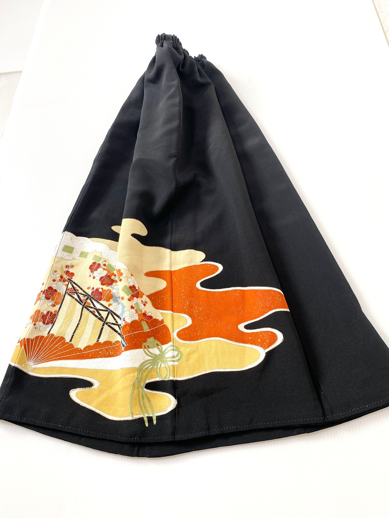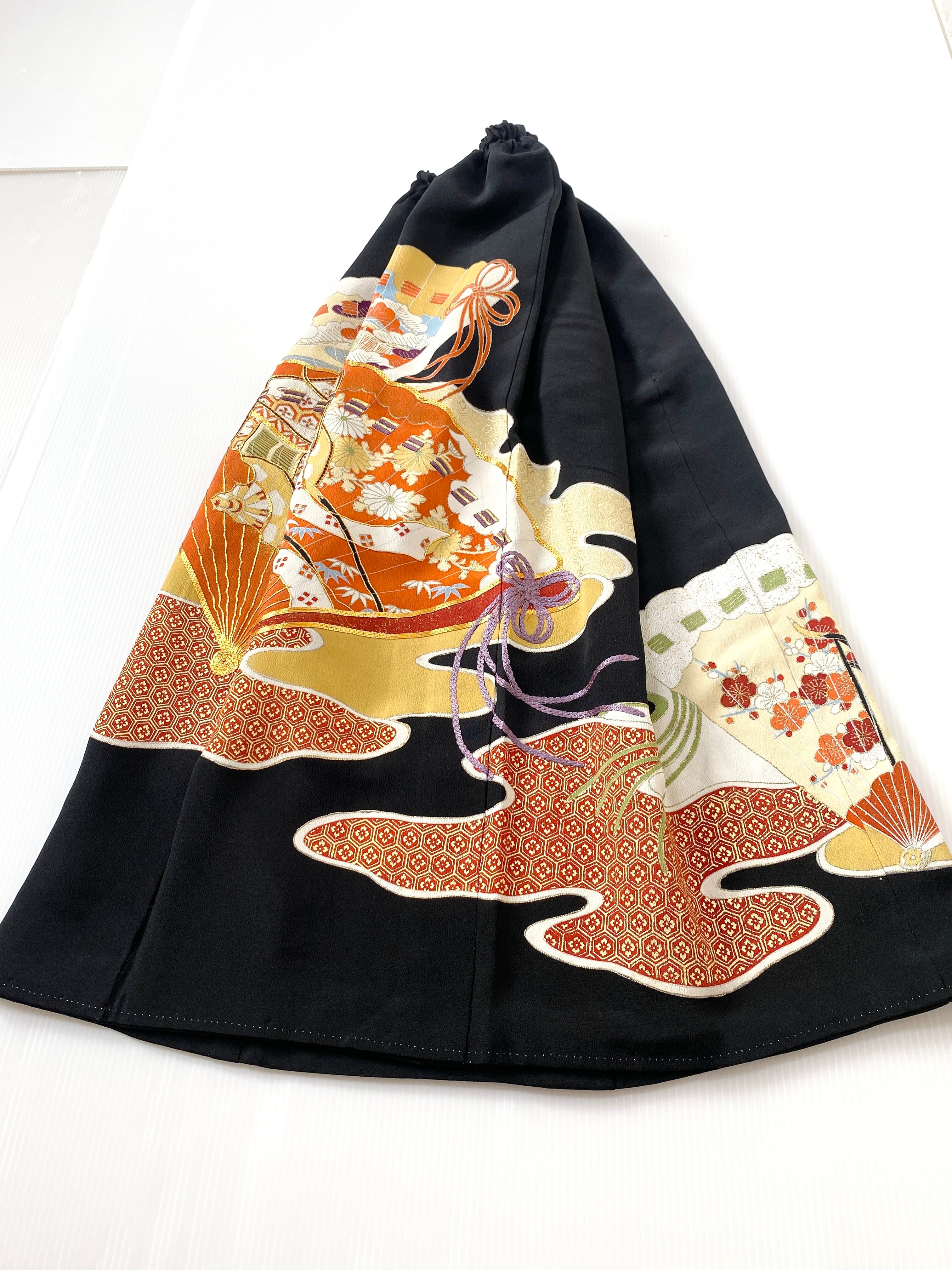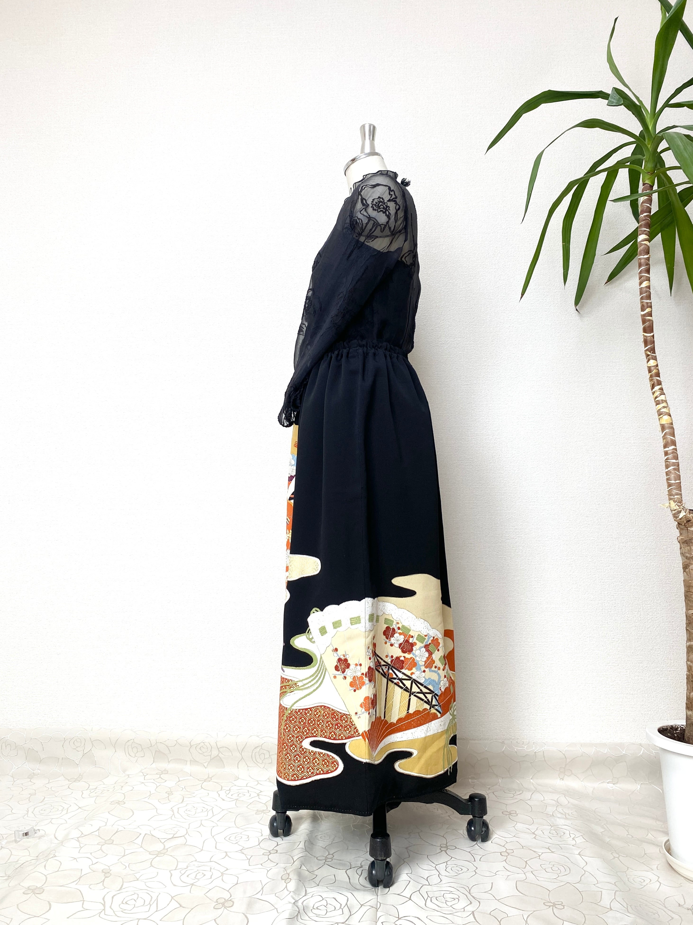 黒留袖着物をリメイクして作製したウエストゴムロングドレススカートフリーサイズです