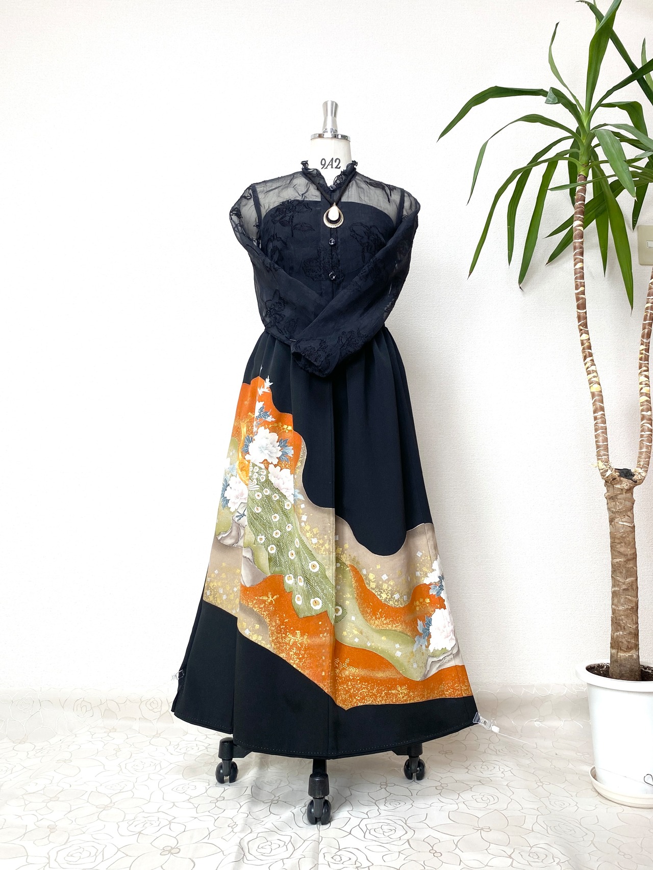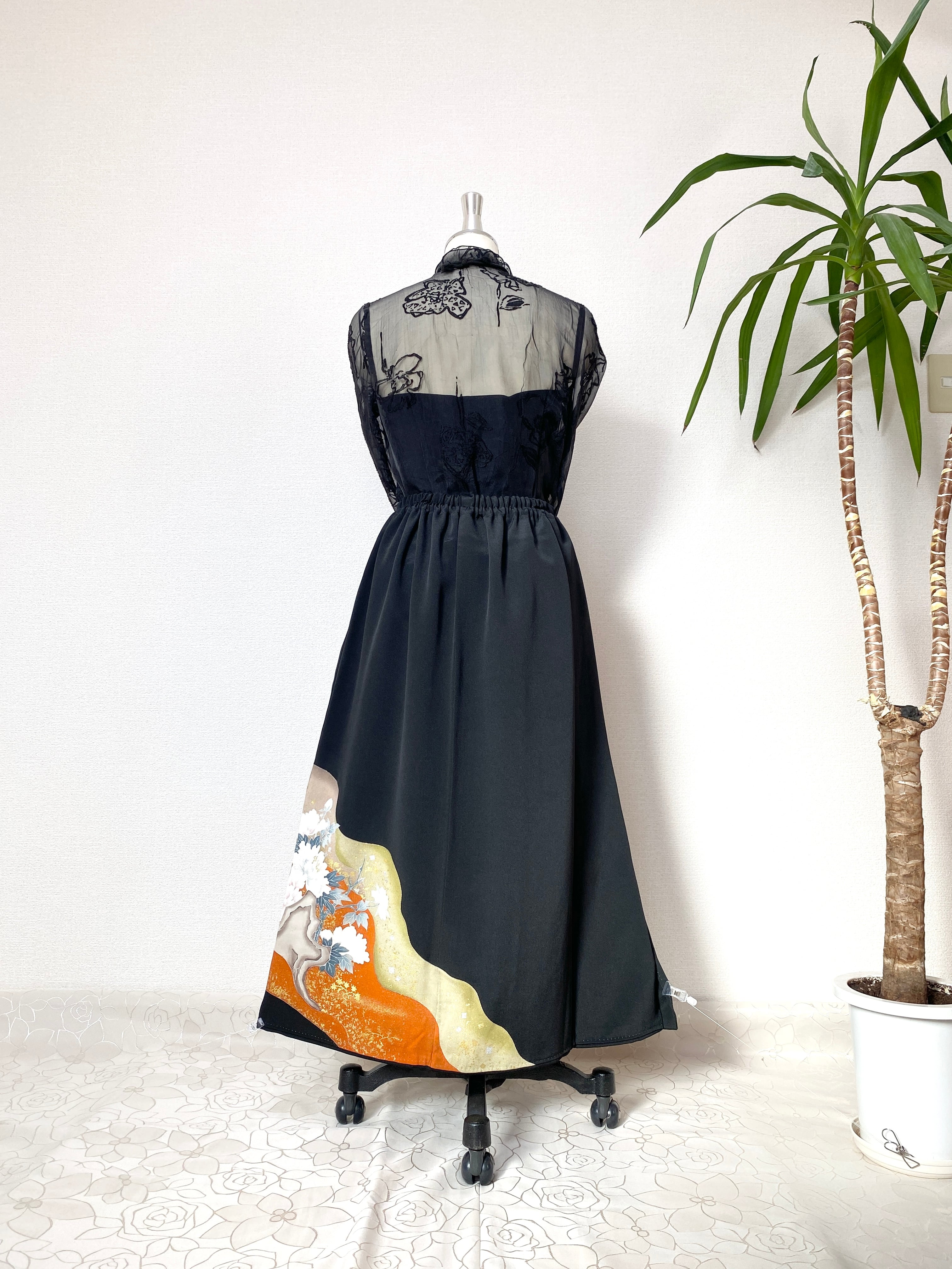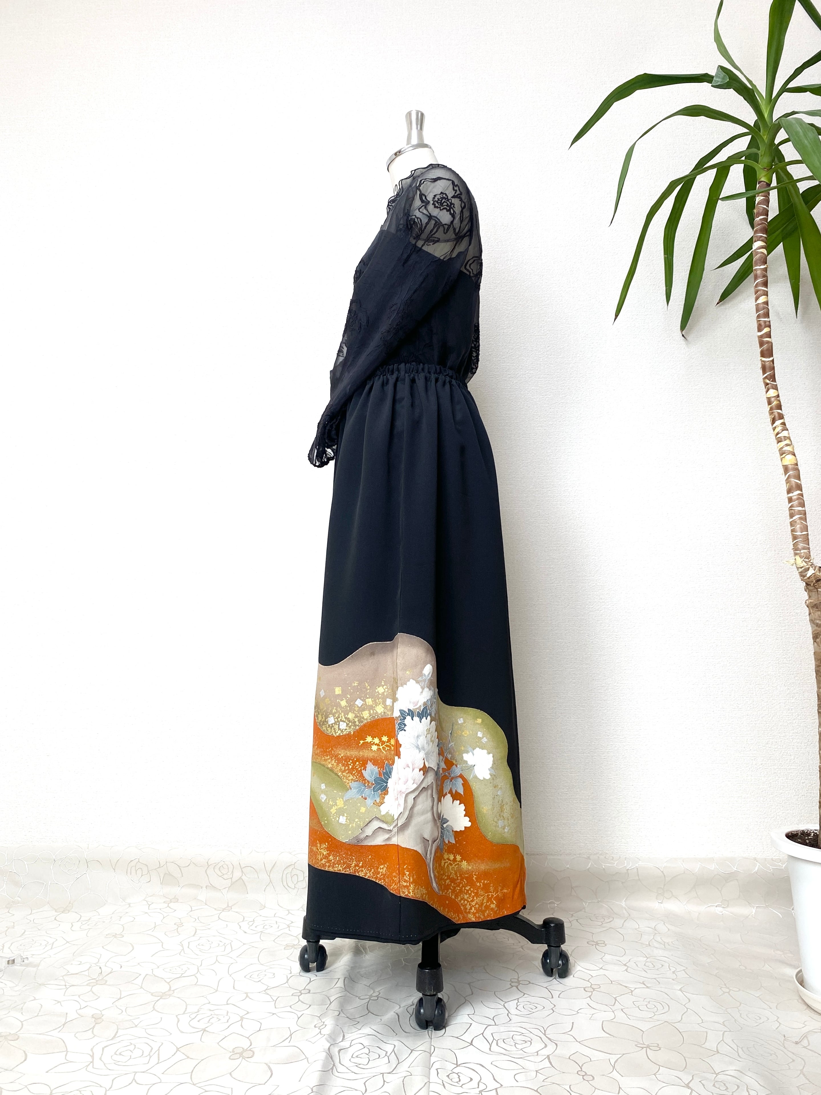 黒留袖着物をリメイクして作製したウエストゴムロングドレススカートフリーサイズです