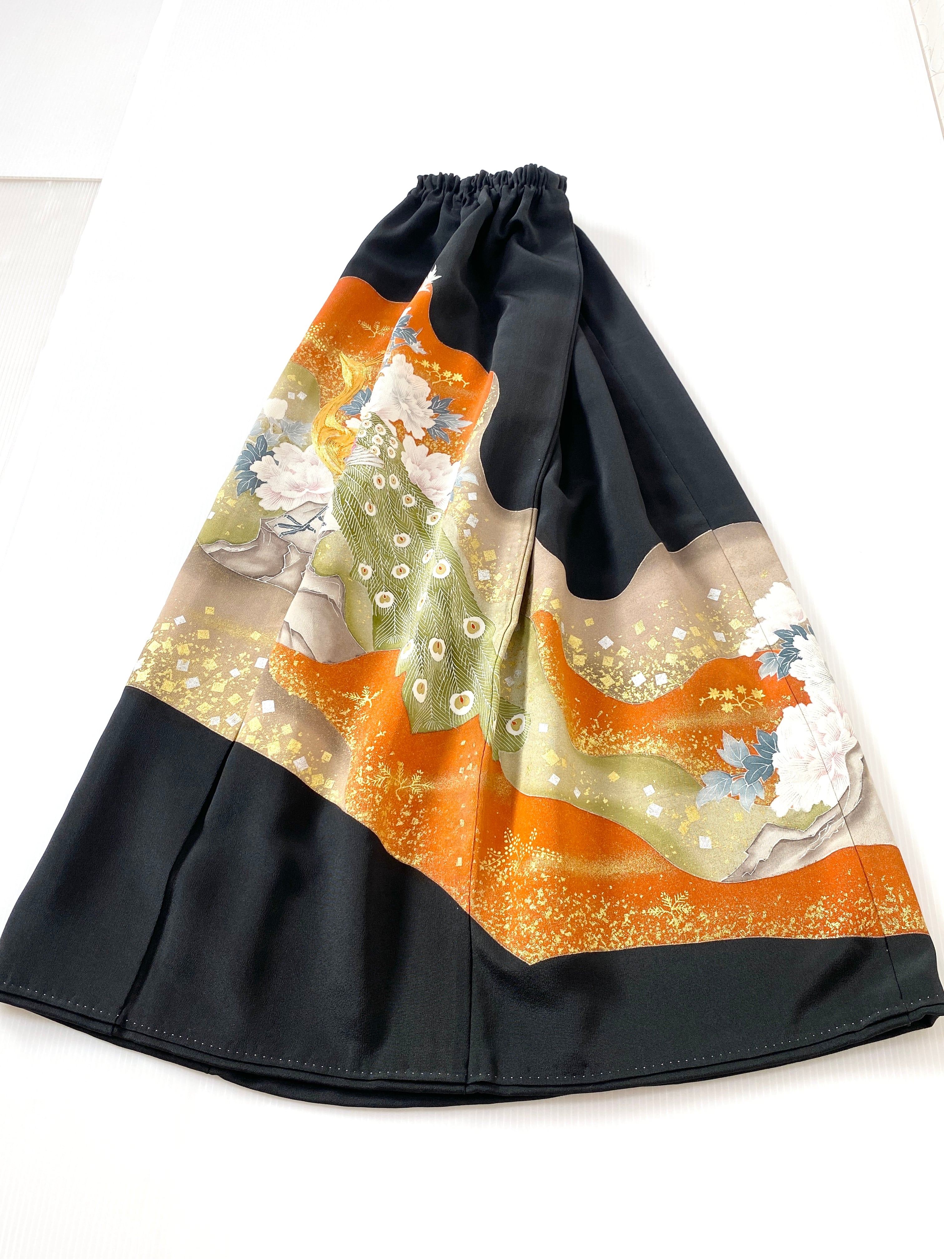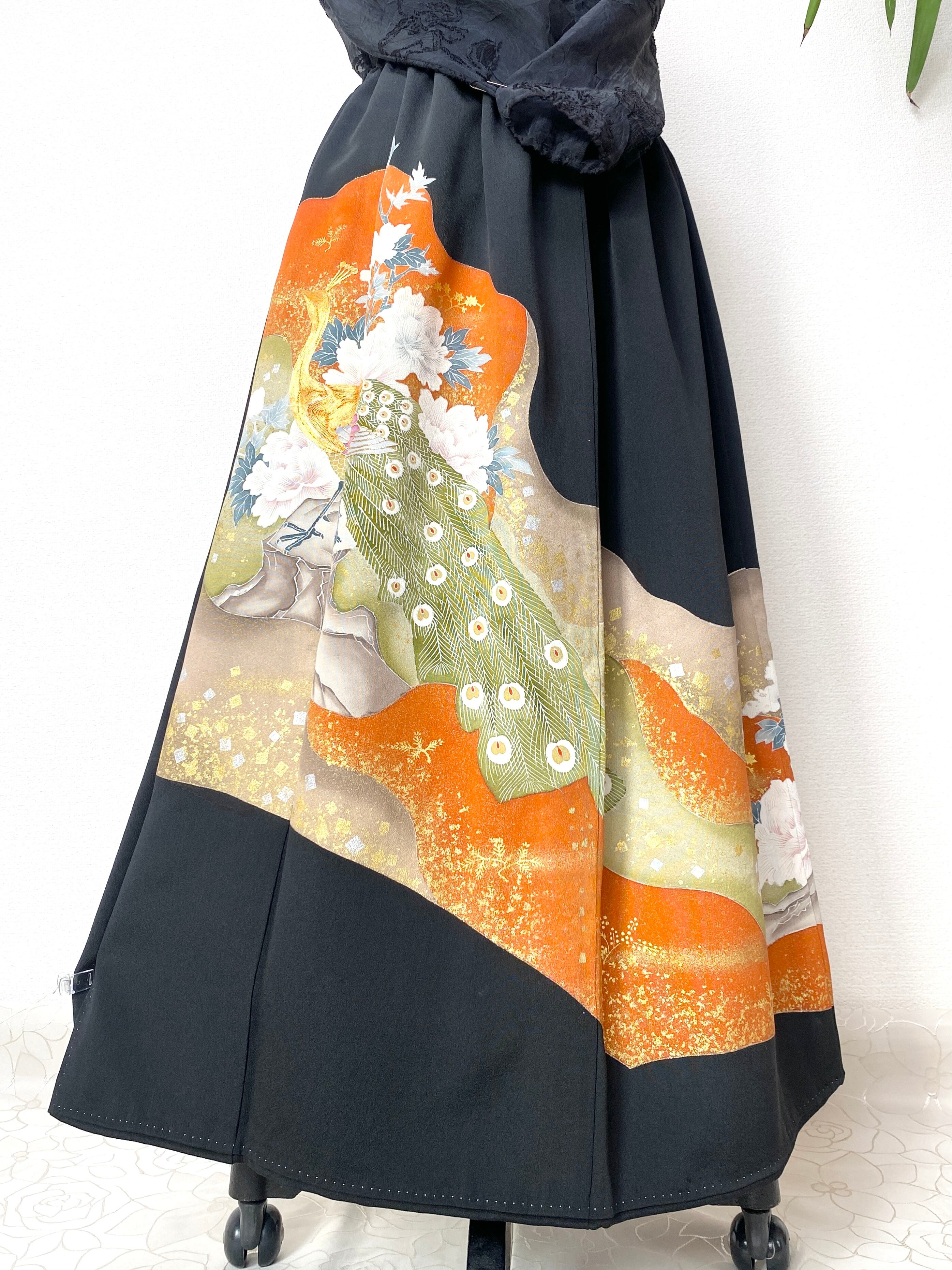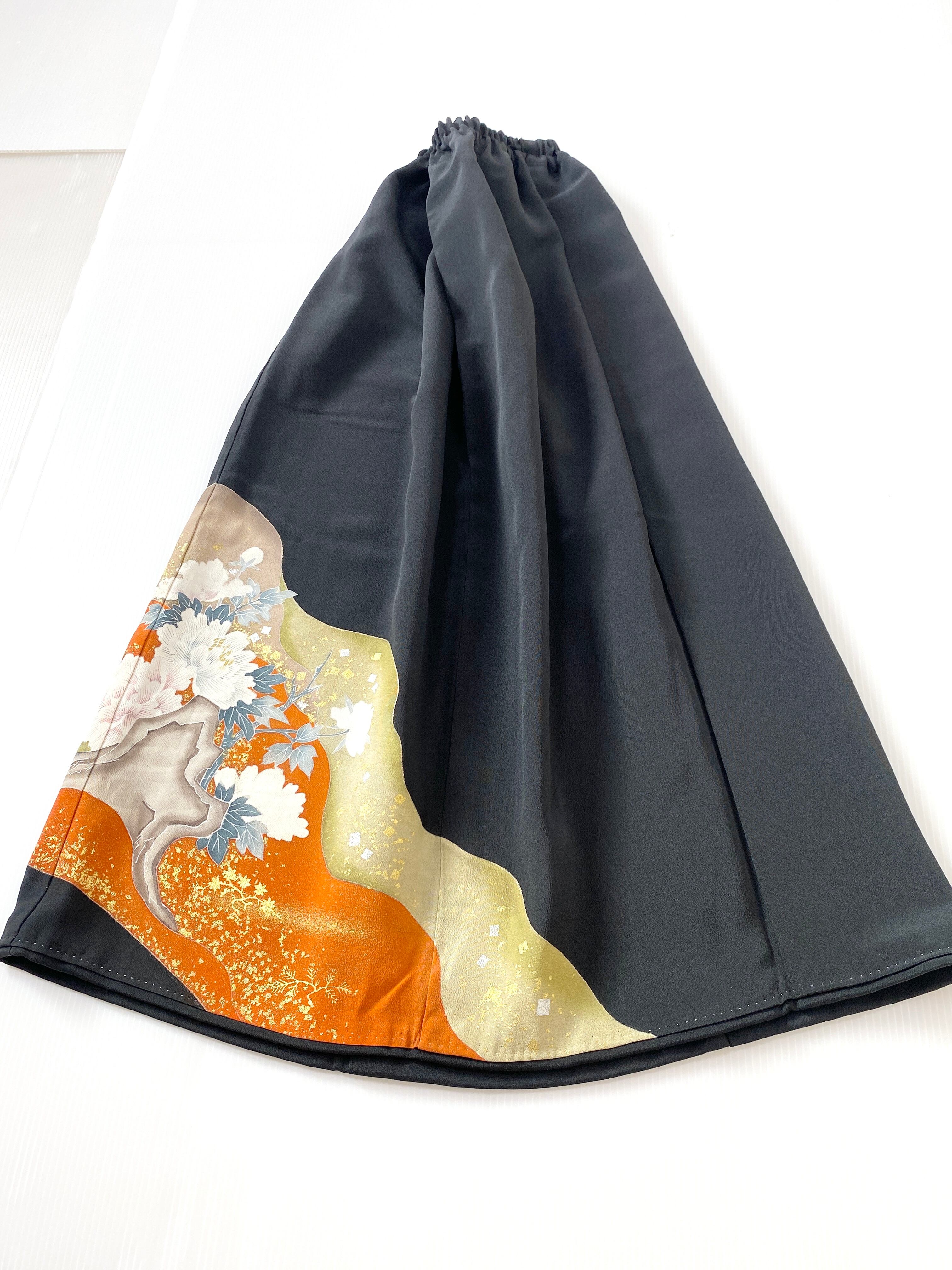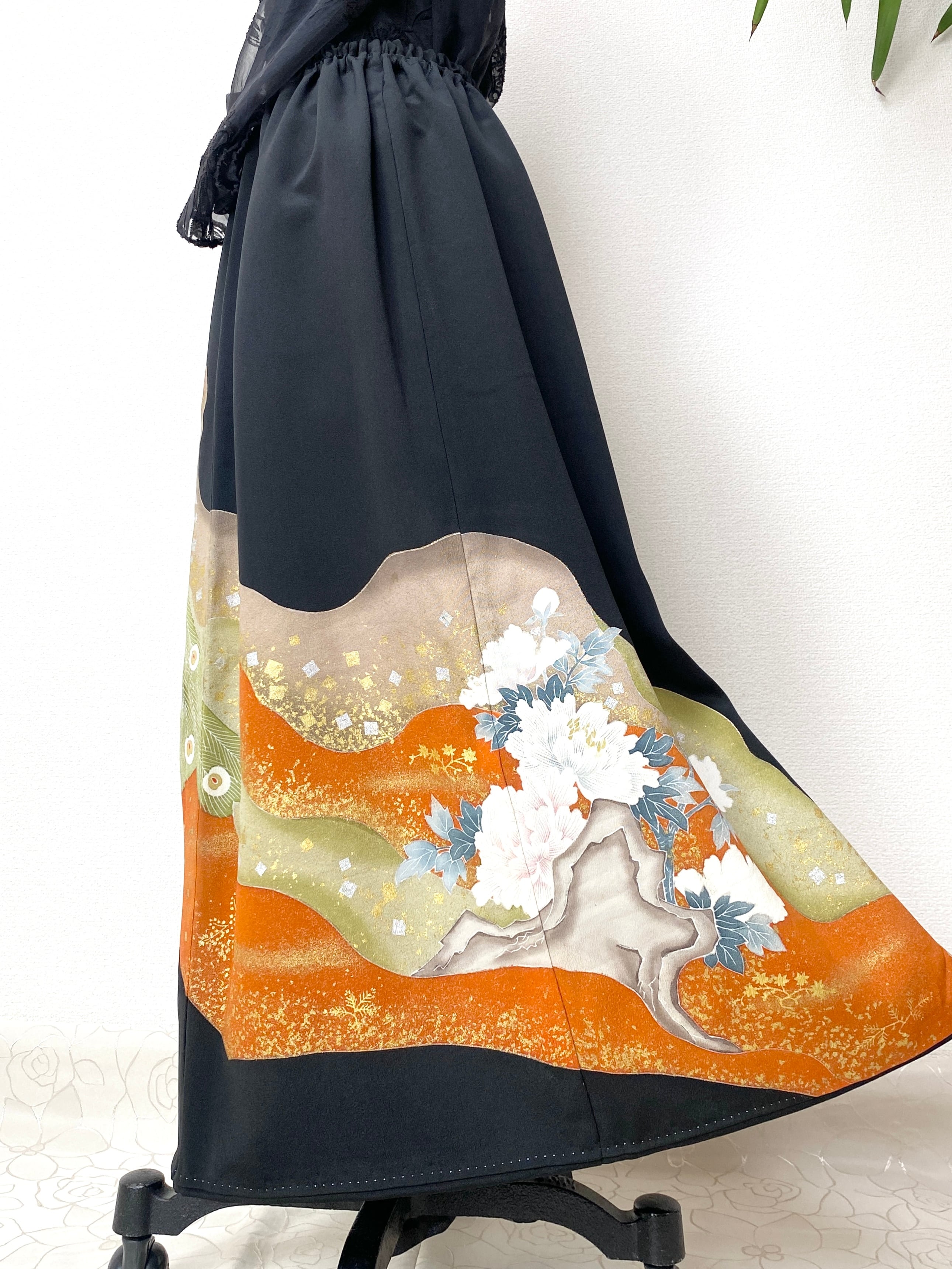 大人可愛いセレブ着物スカートフリーサイズ黒留袖着物リメイクウエストゴムロングスカート