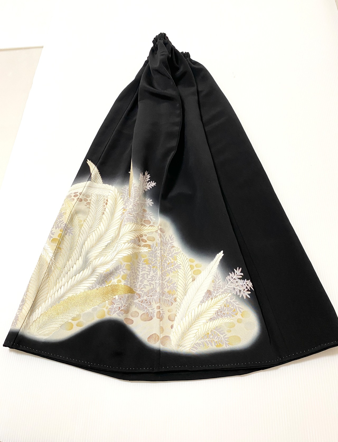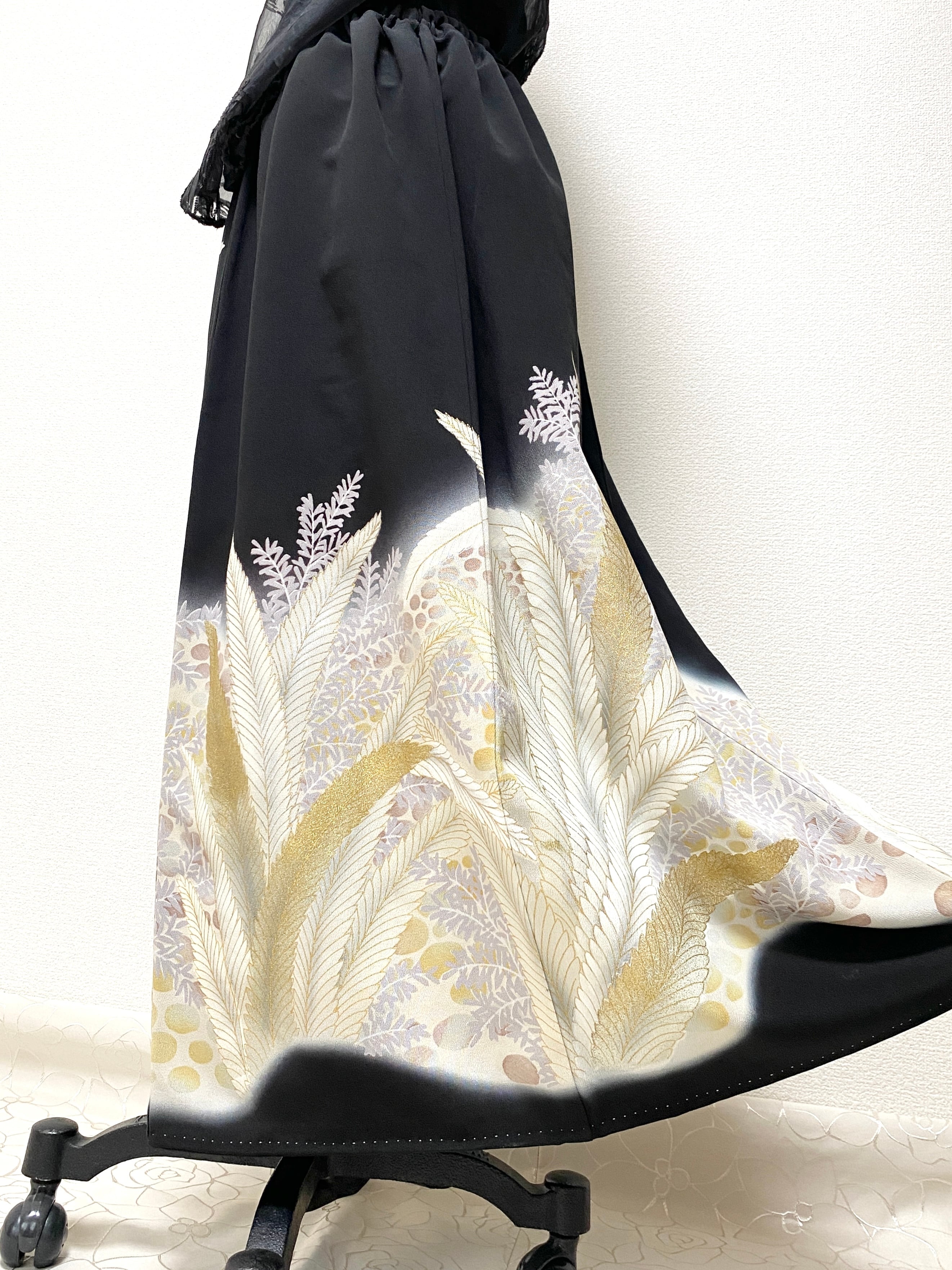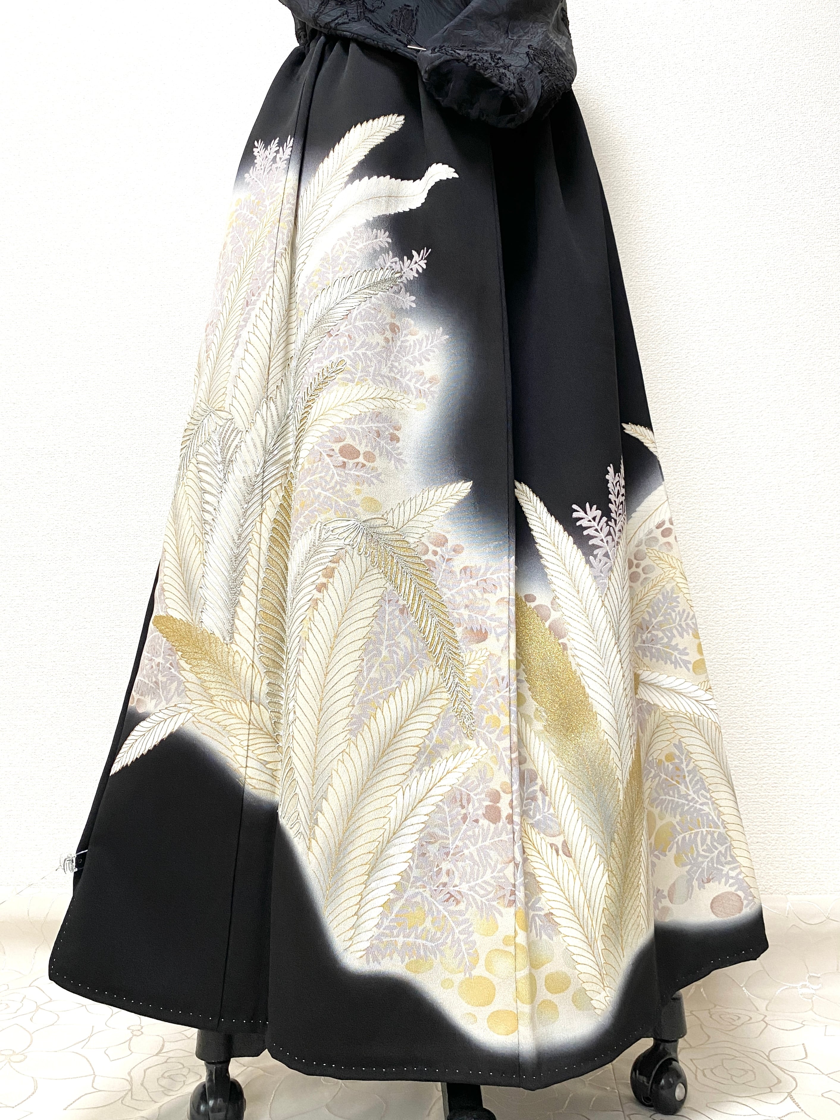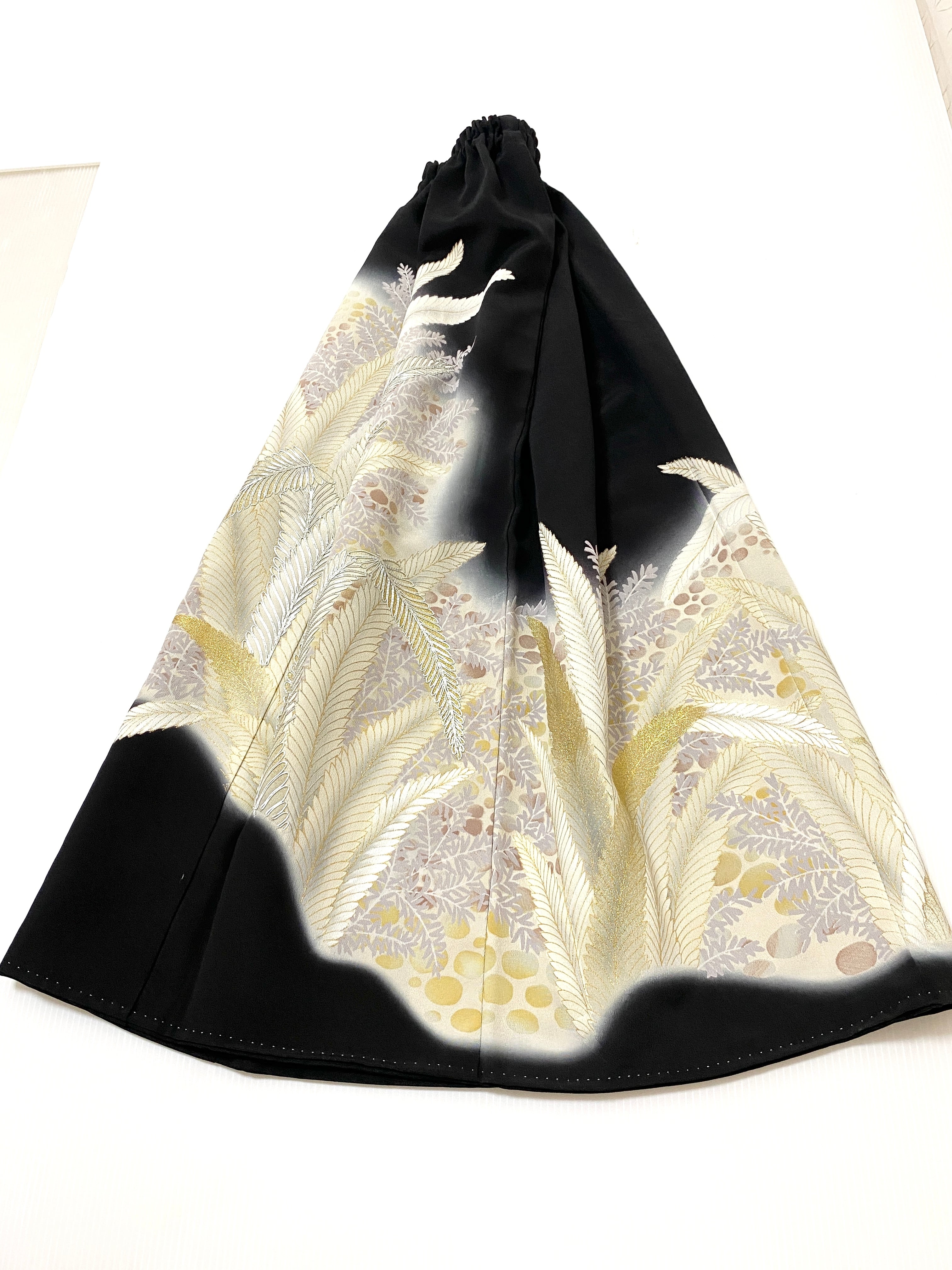 黒留袖着物をリメイクして作製したウエストゴムロングドレススカートフリーサイズです