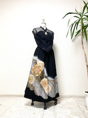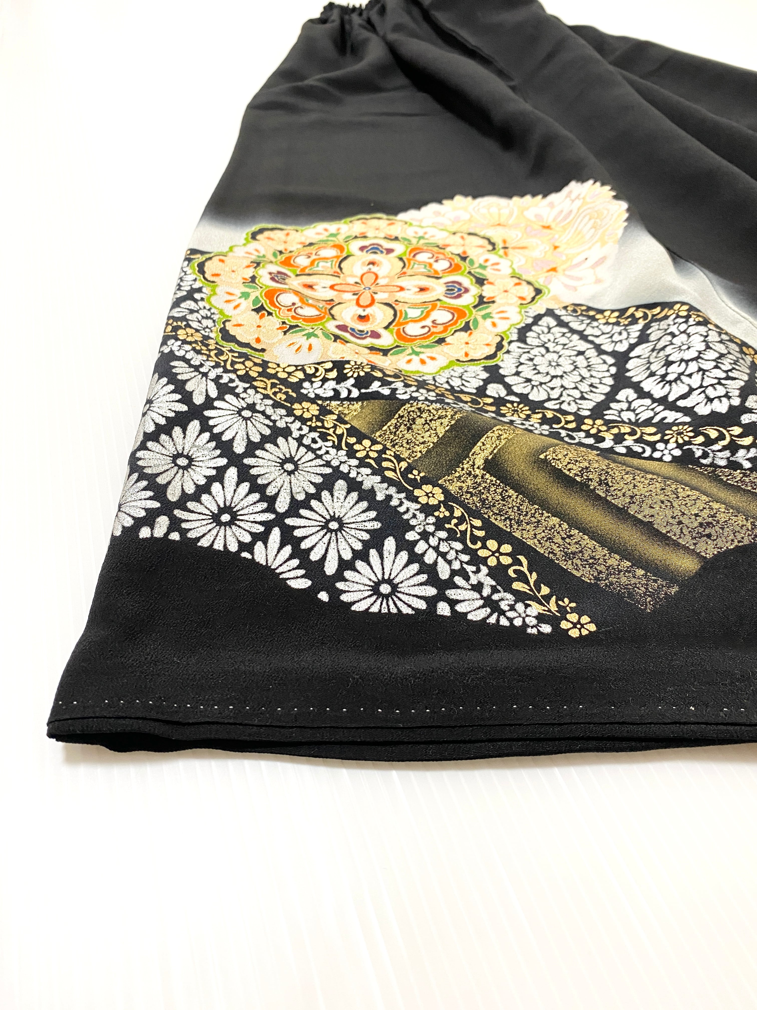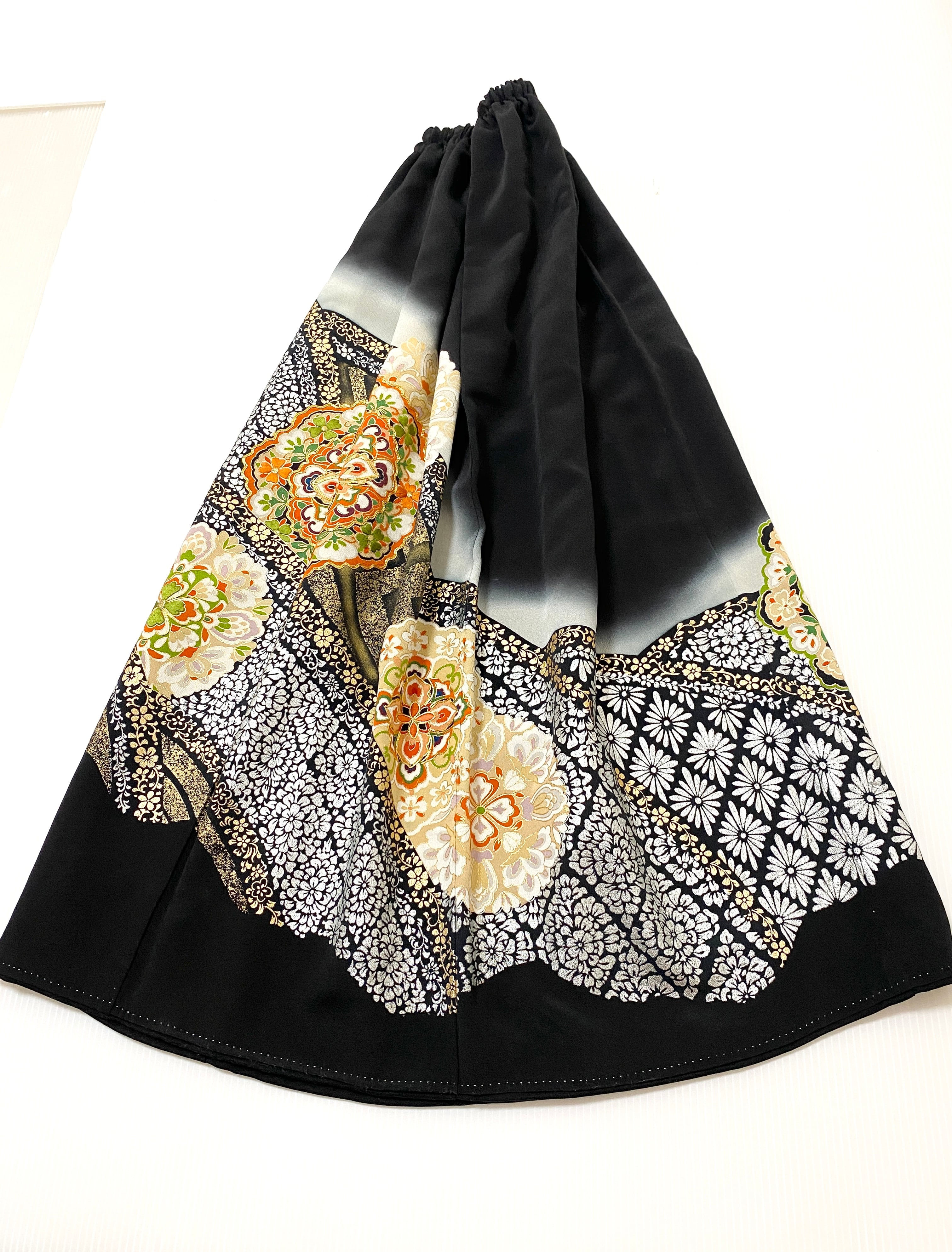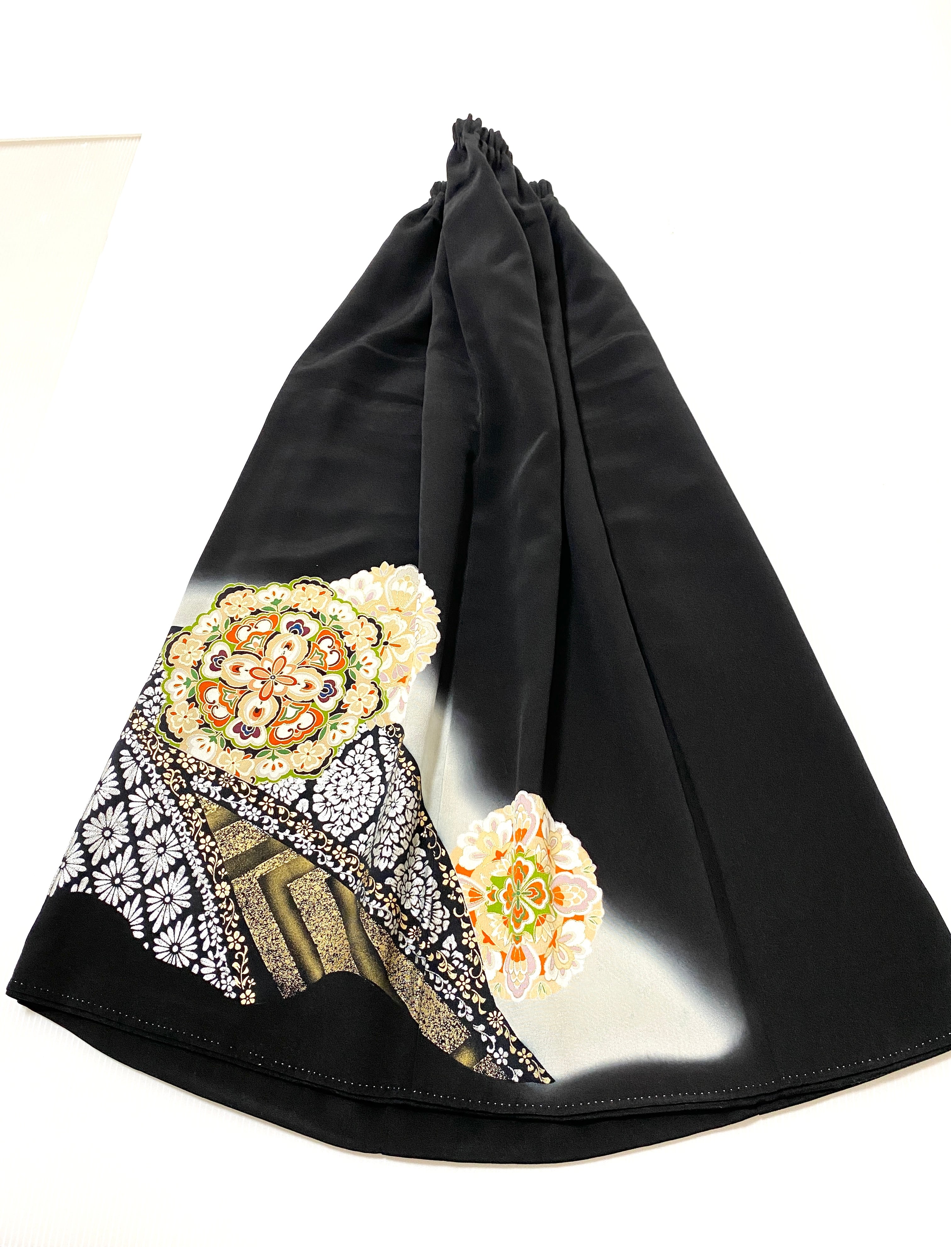黒留袖着物をリメイクして作製したウエストゴムロングドレススカートフリーサイズです