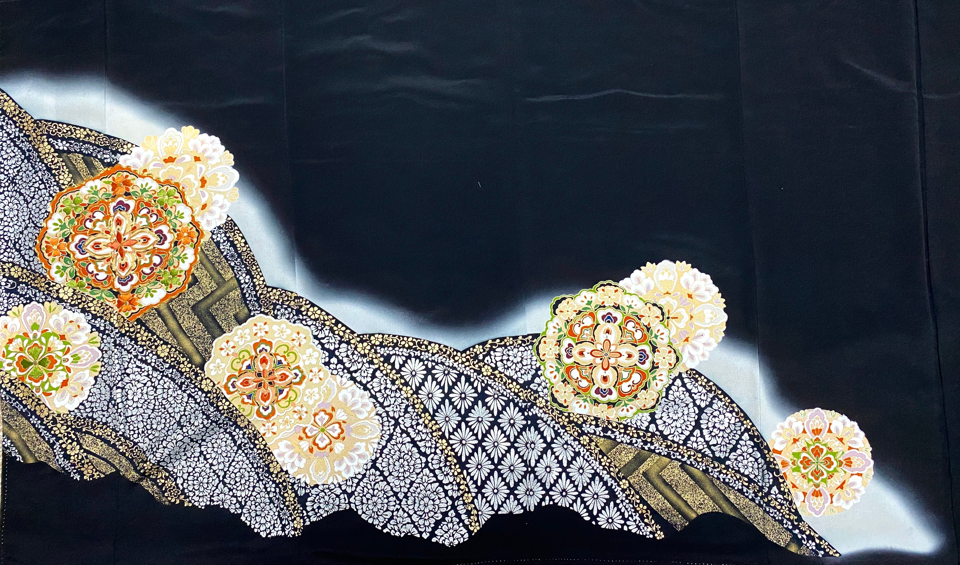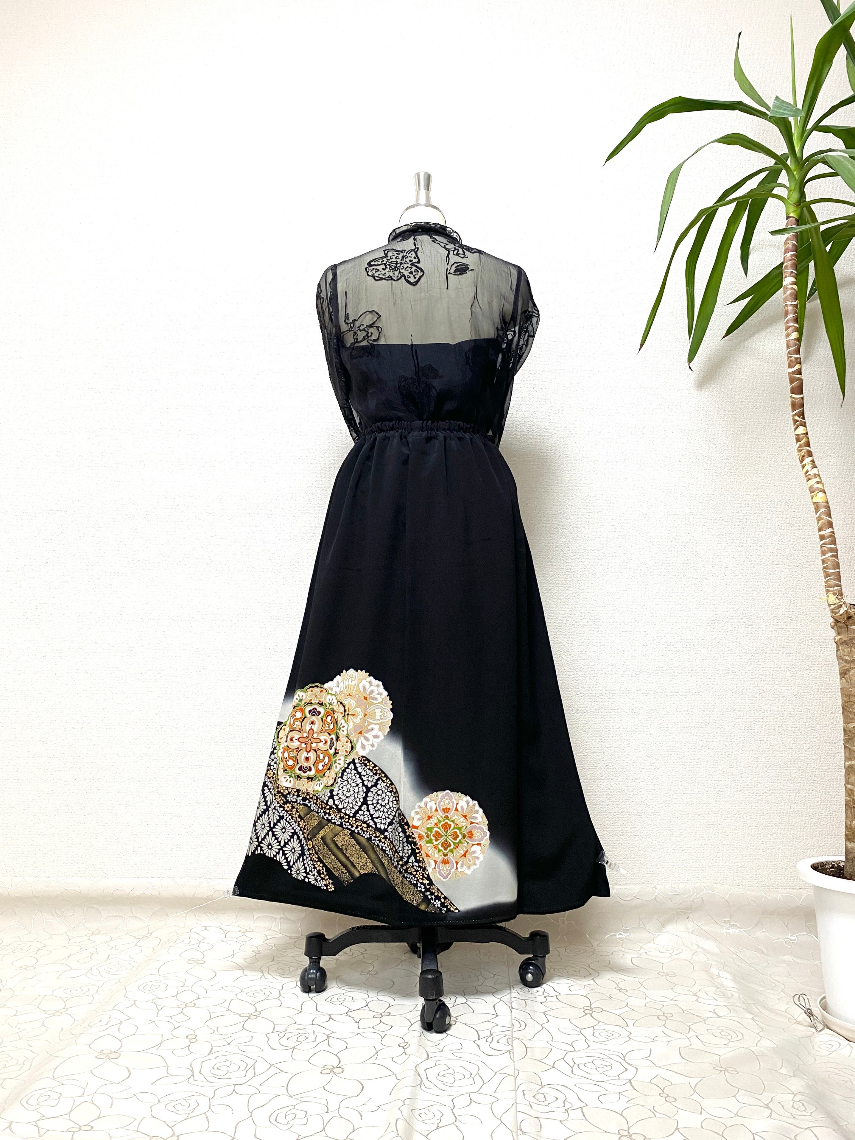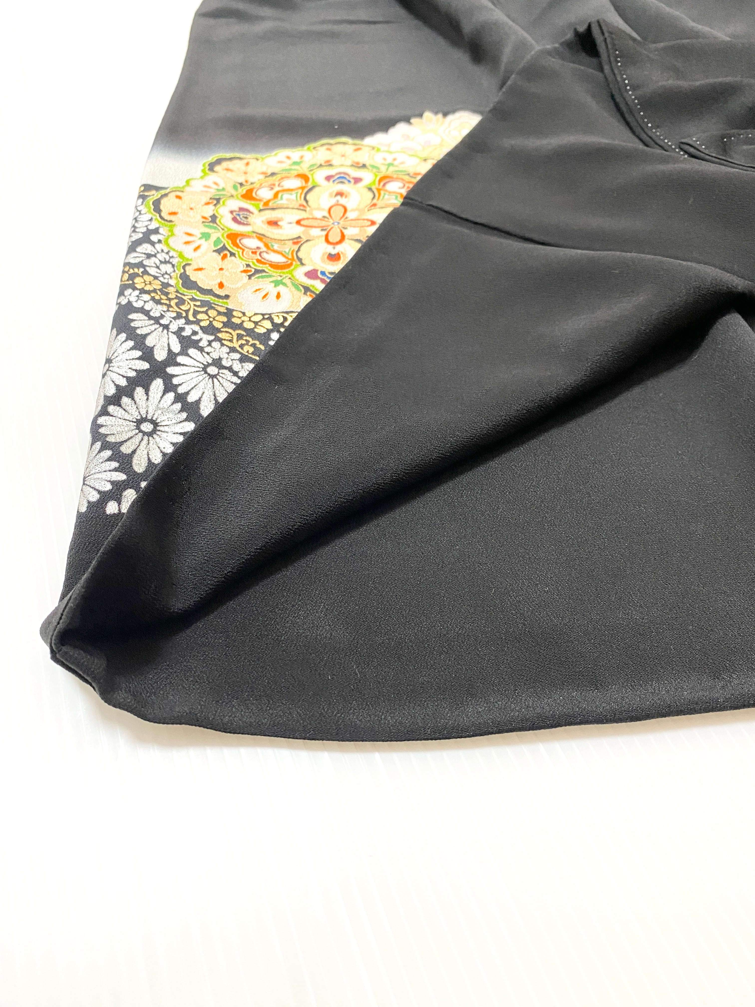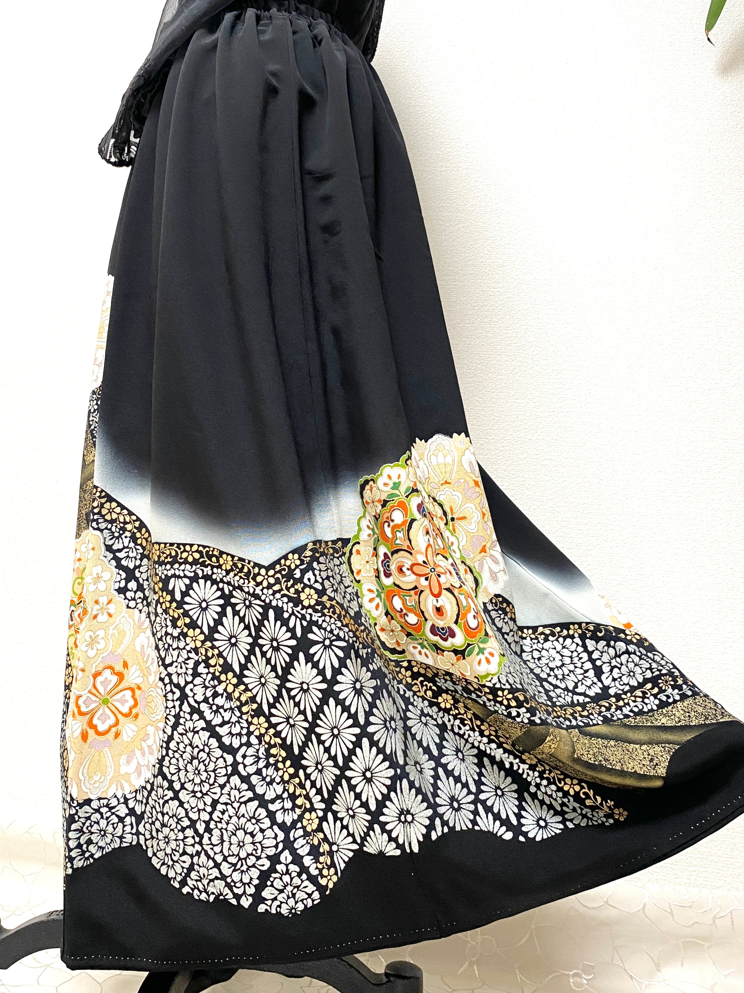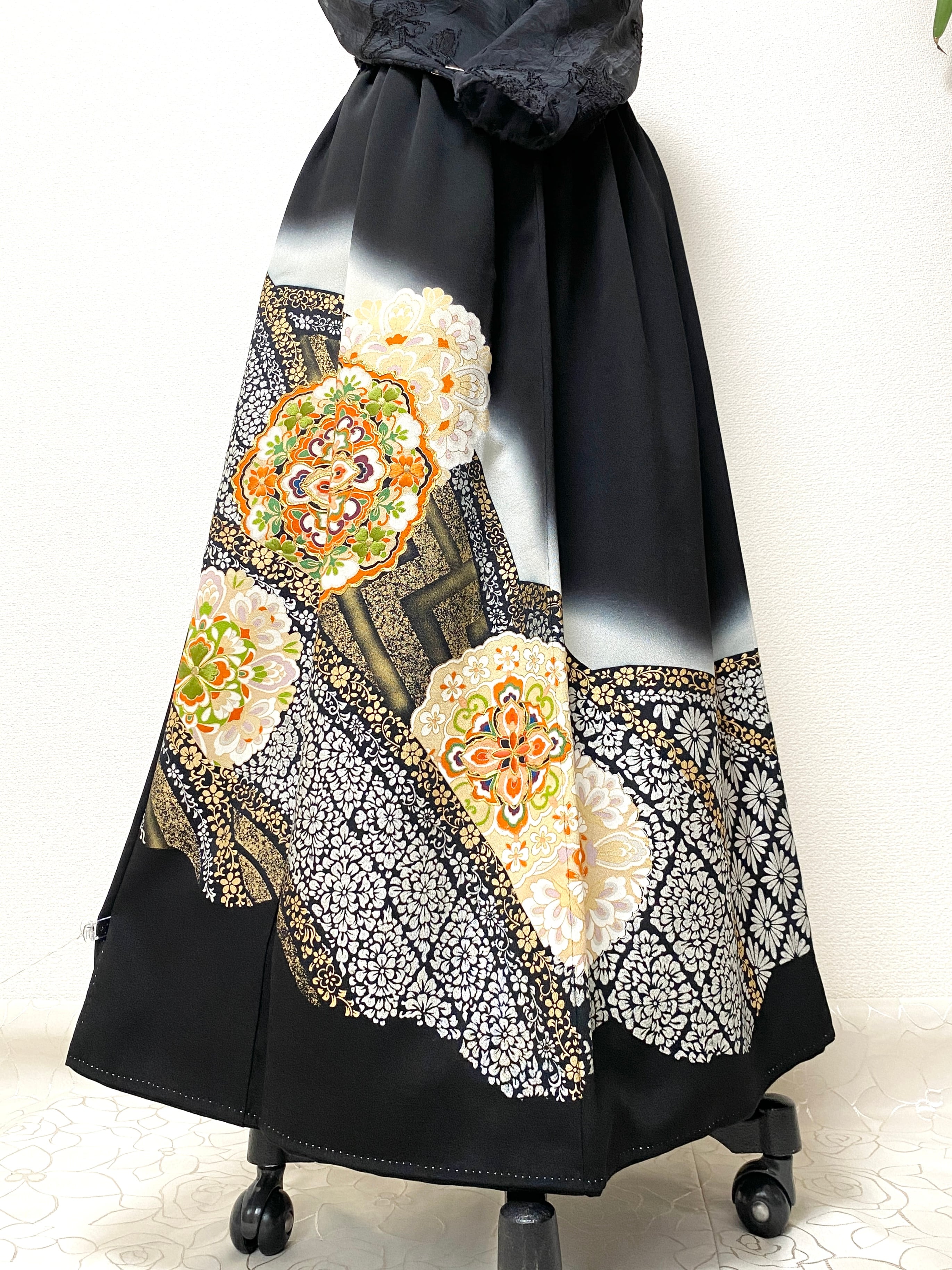 大人可愛いセレブ着物スカートフリーサイズ黒留袖着物リメイクウエストゴムロングスカート