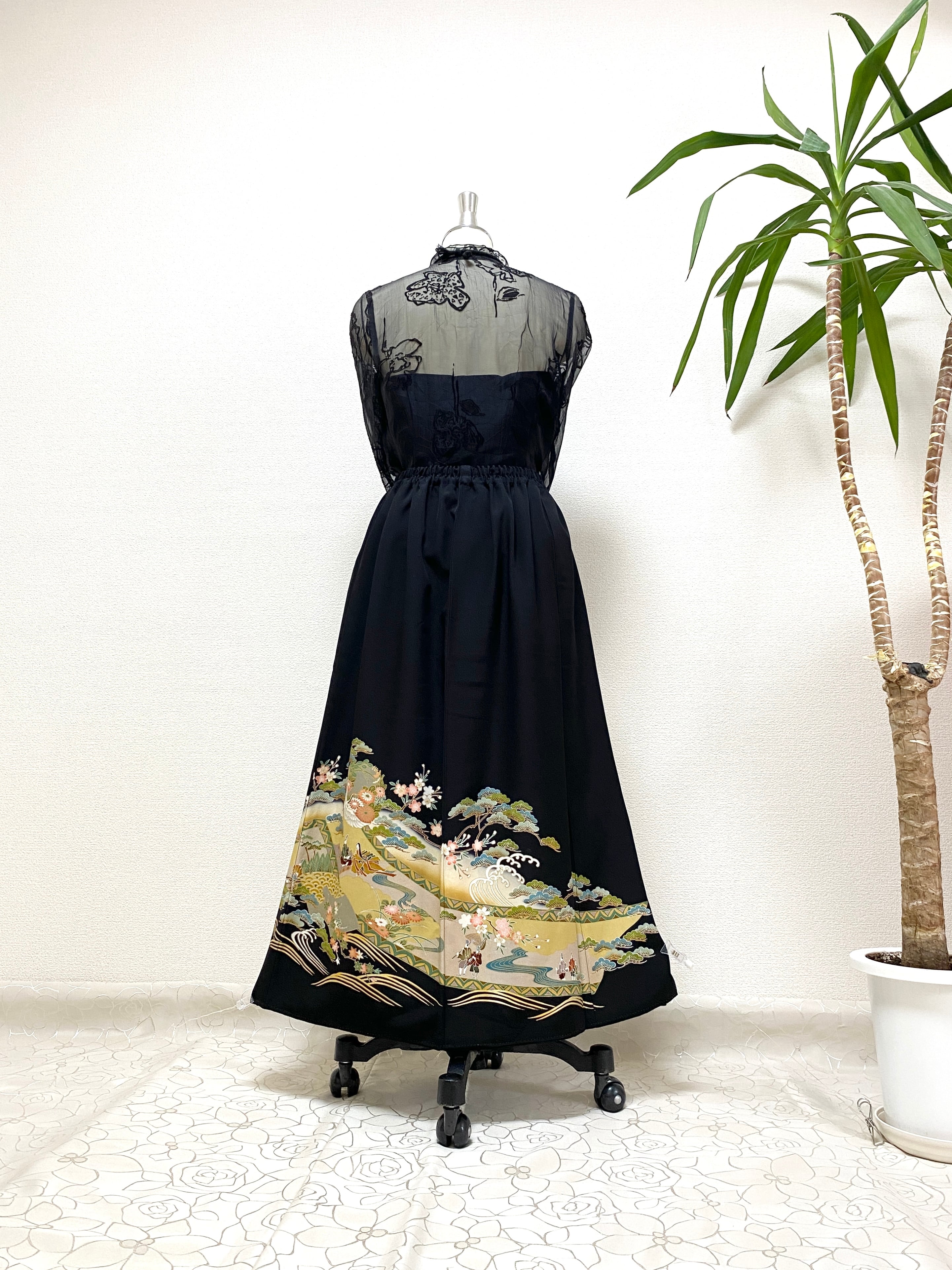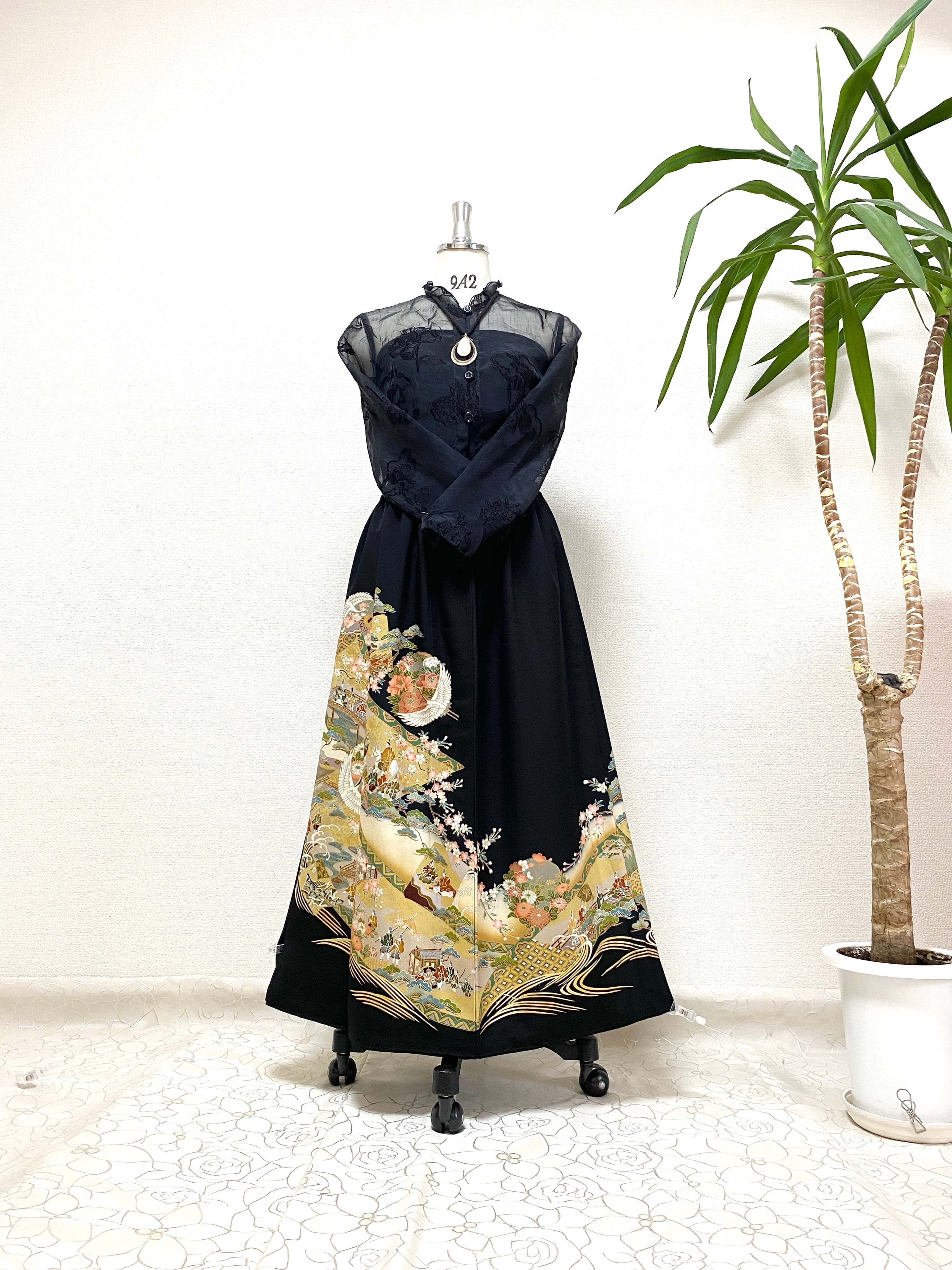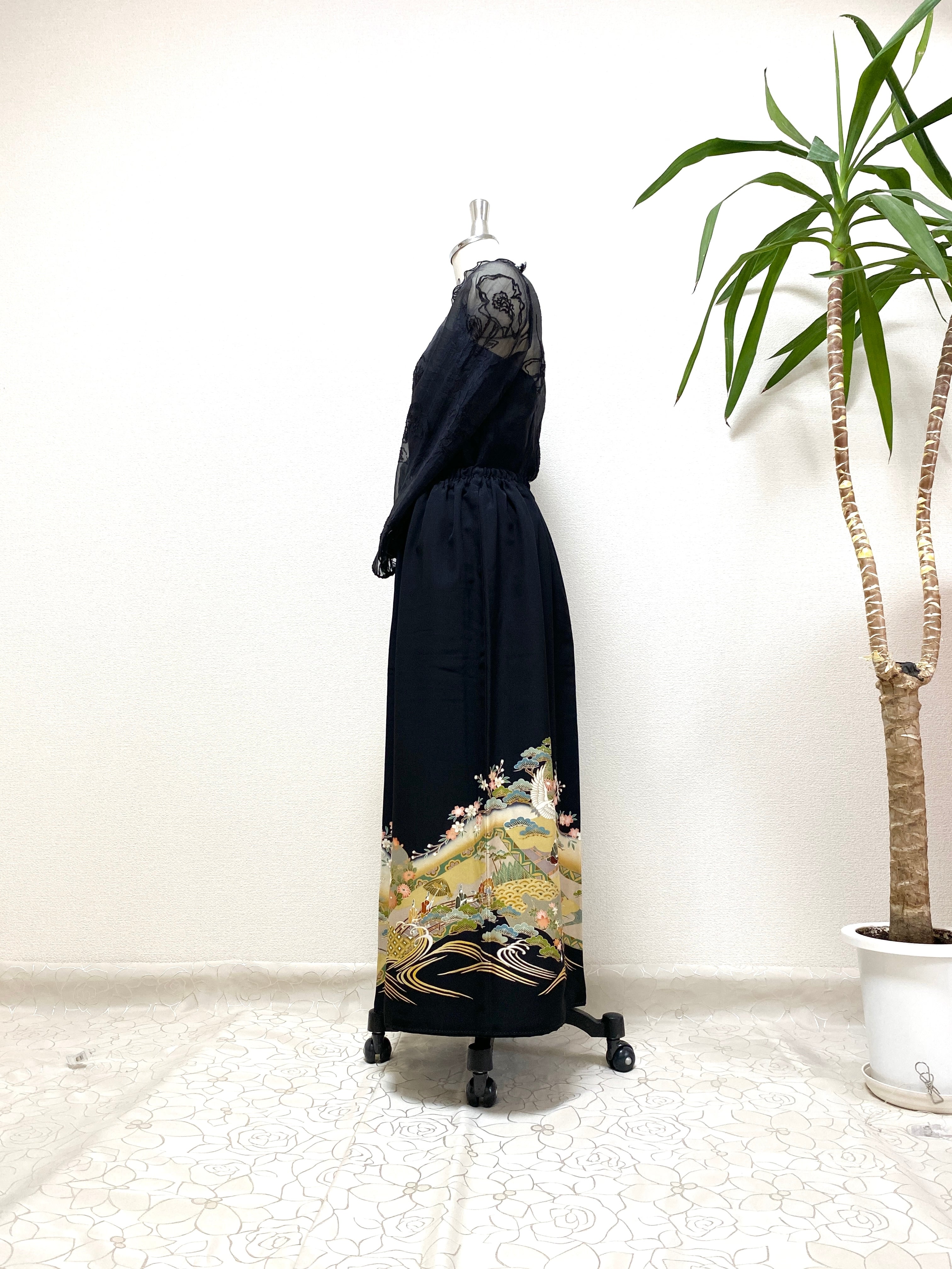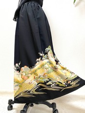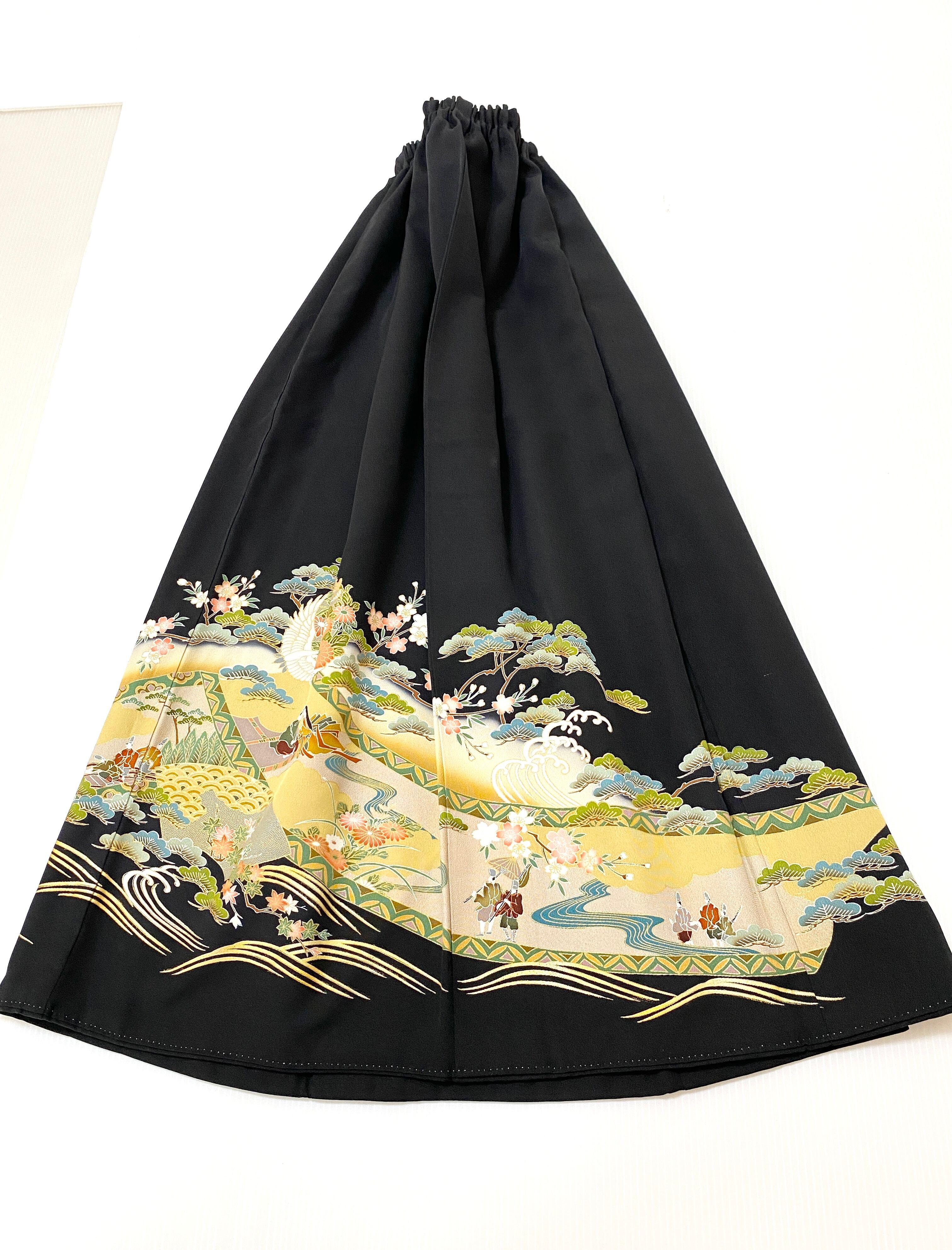 大人可愛いセレブ着物スカートフリーサイズ黒留袖着物リメイクウエストゴムロングスカート