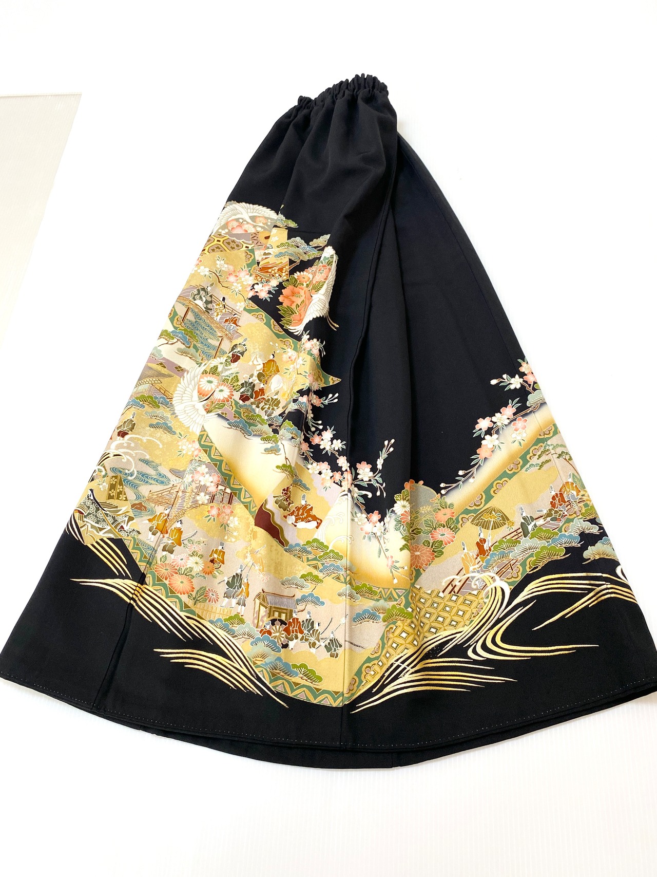 黒留袖着物をリメイクして作製したウエストゴムロングドレススカートフリーサイズです