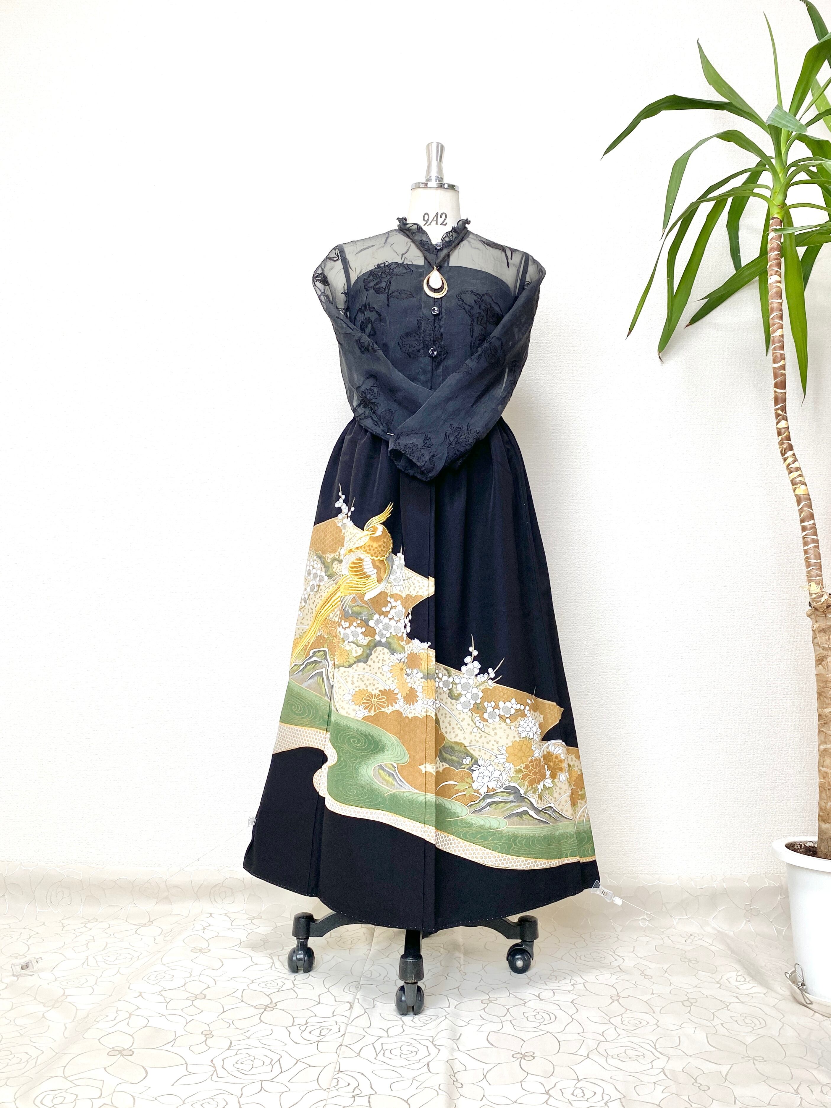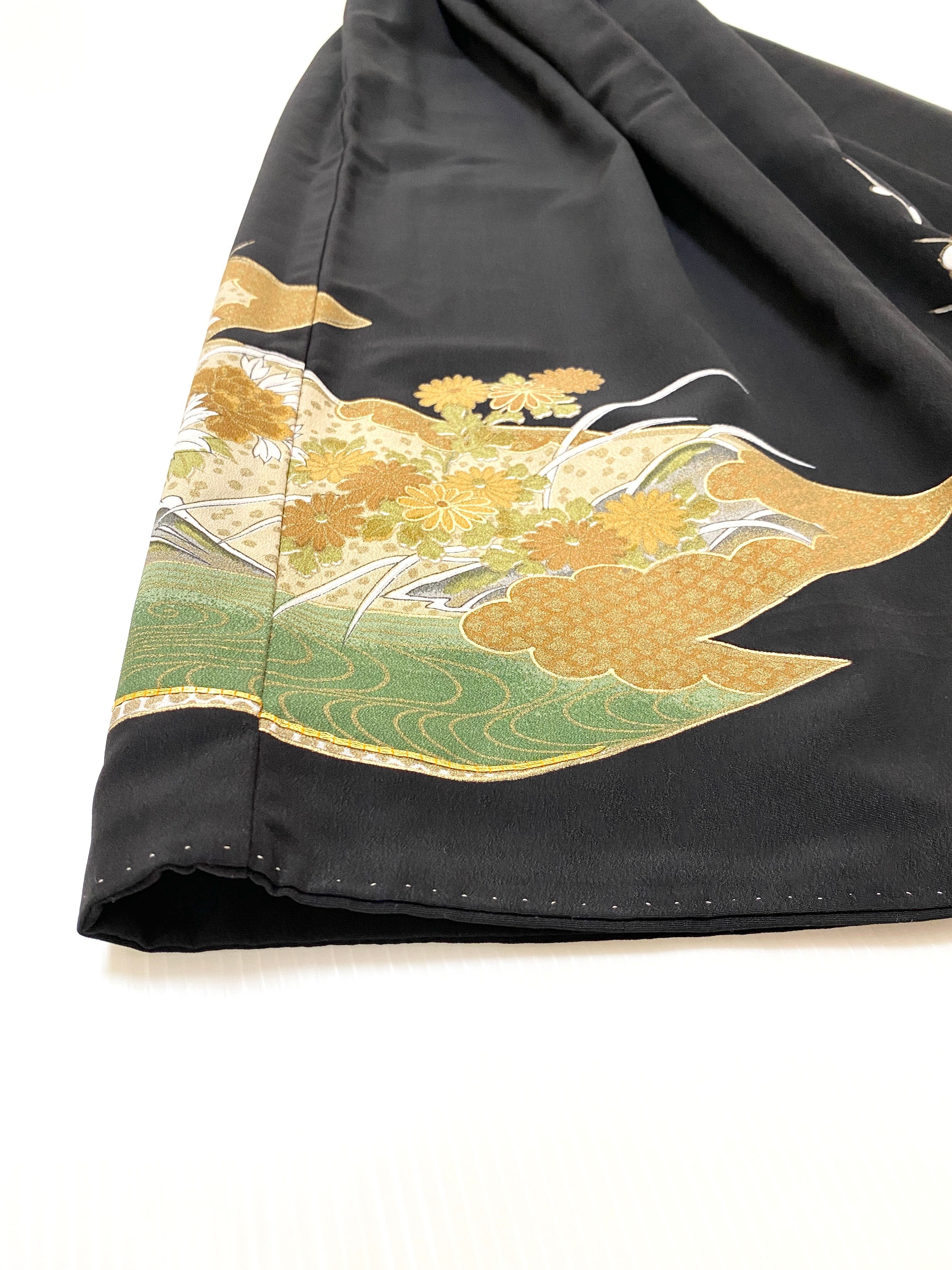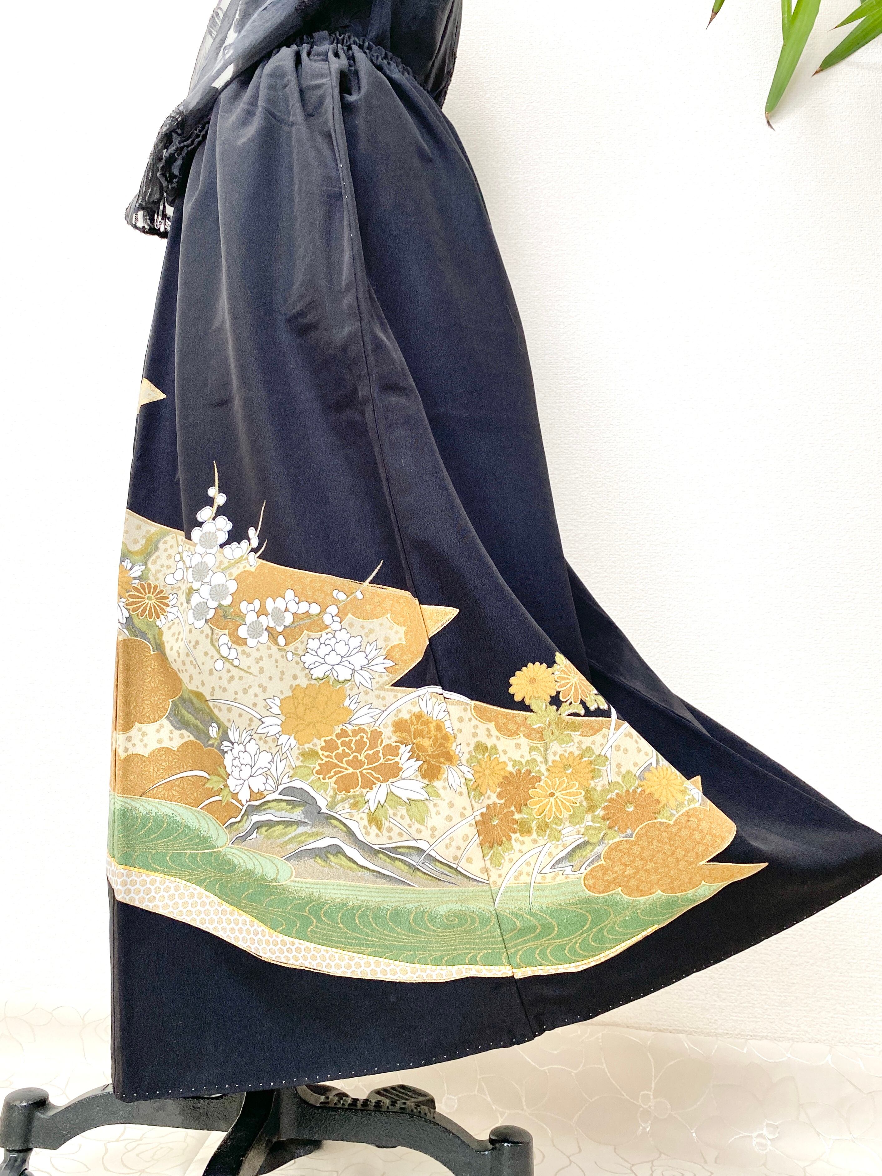 大人可愛いセレブ着物スカートフリーサイズ黒留袖着物リメイクウエストゴムロングスカート送料込みハンドメイドNO.6111