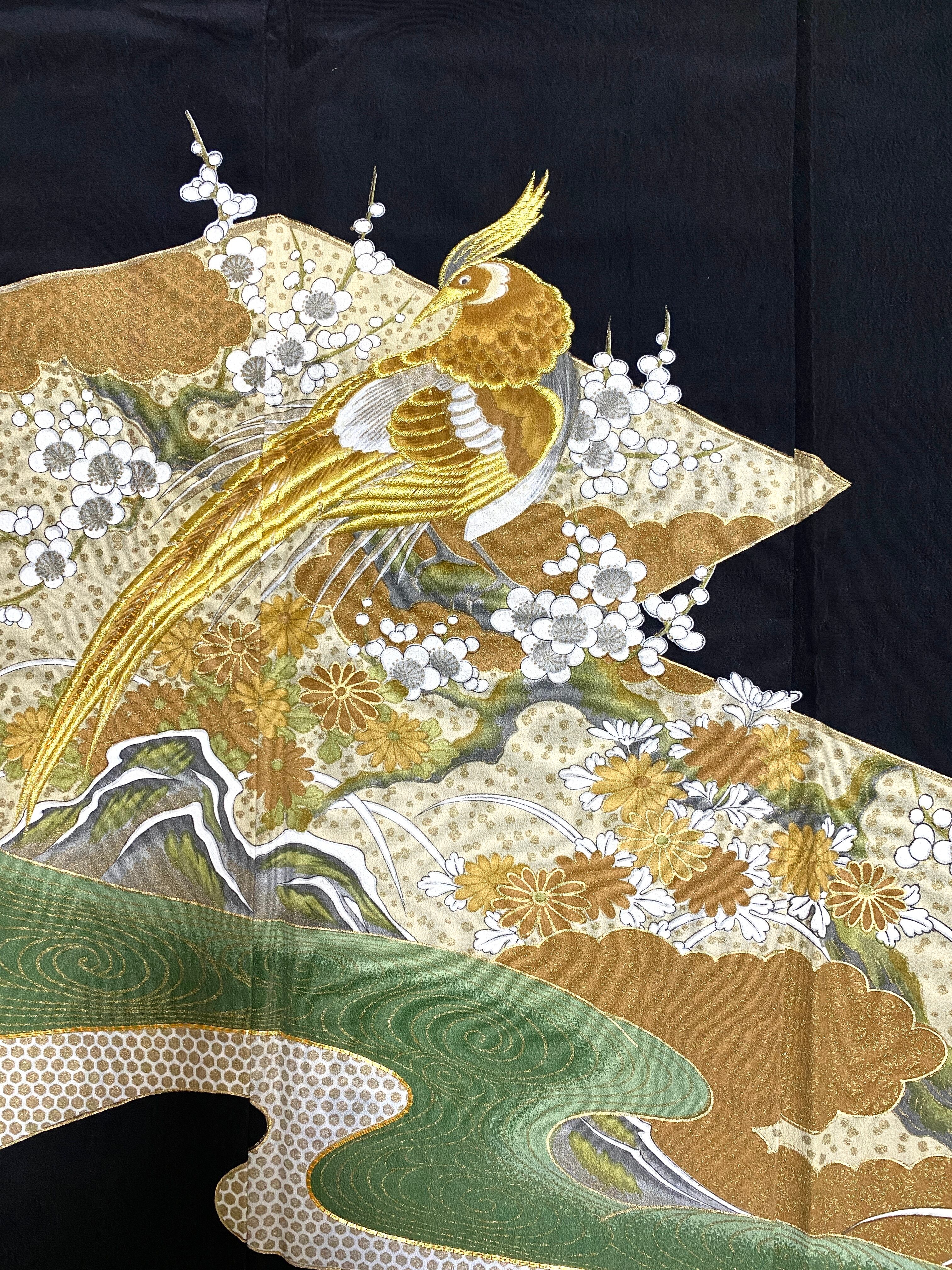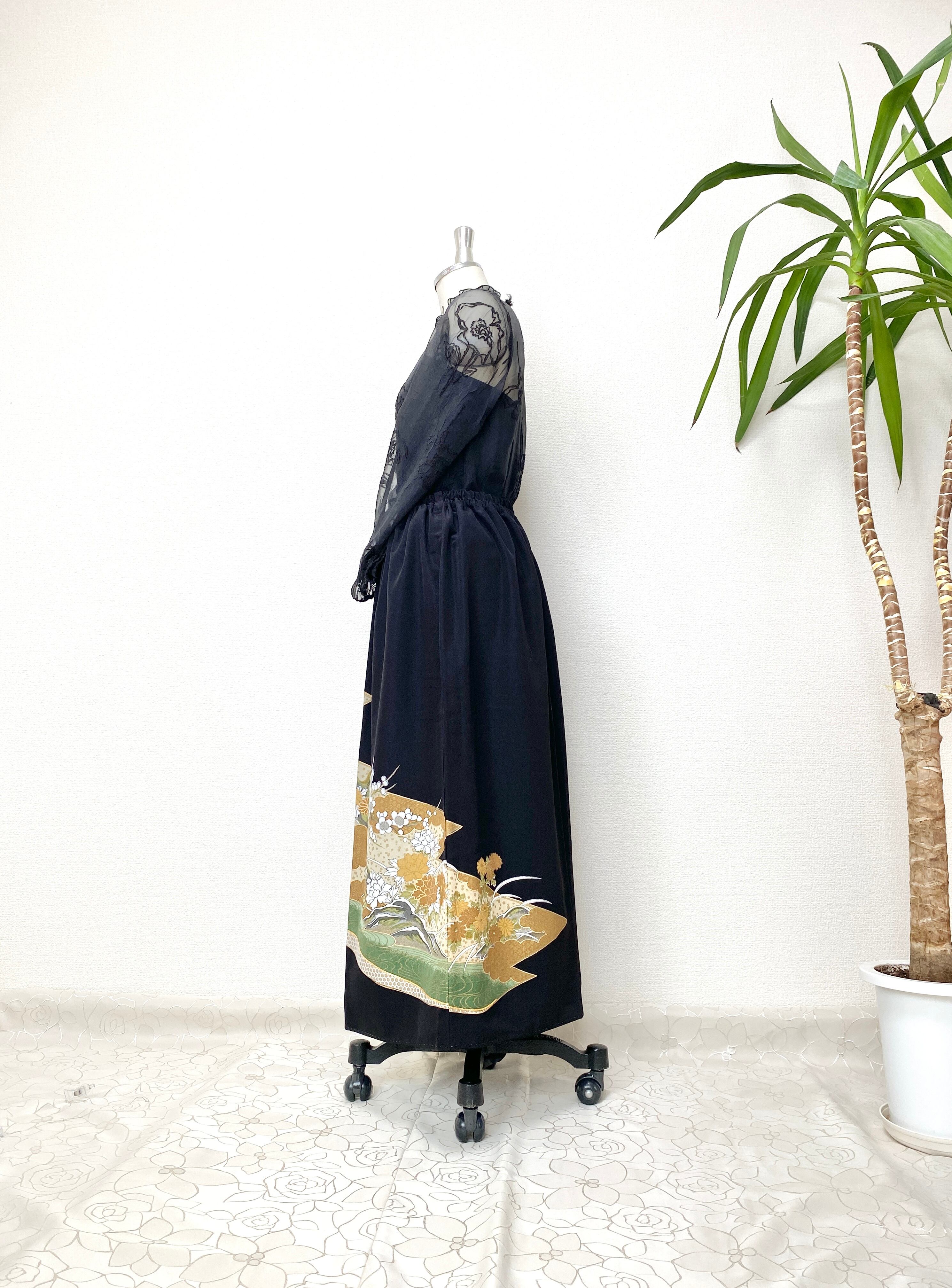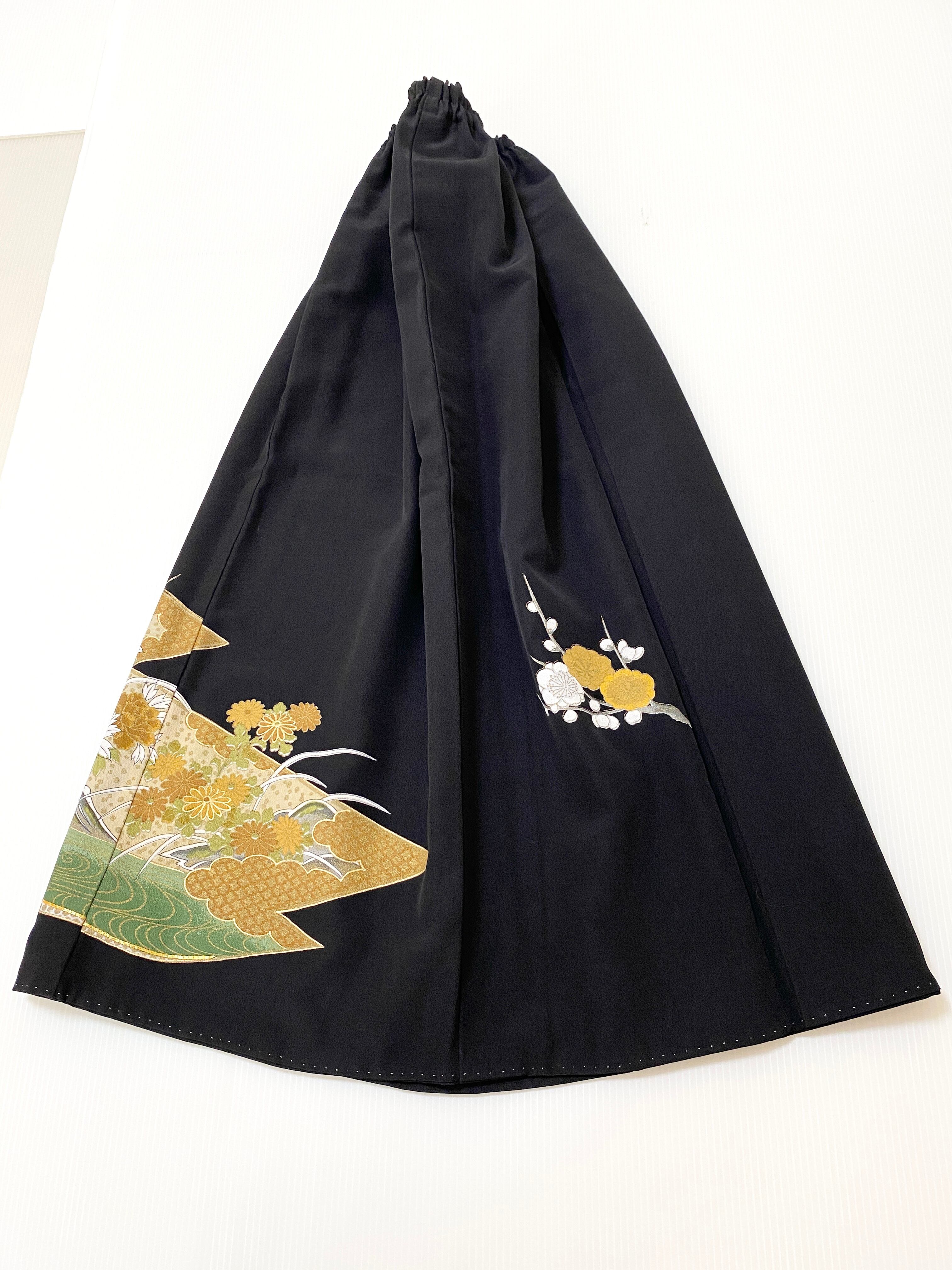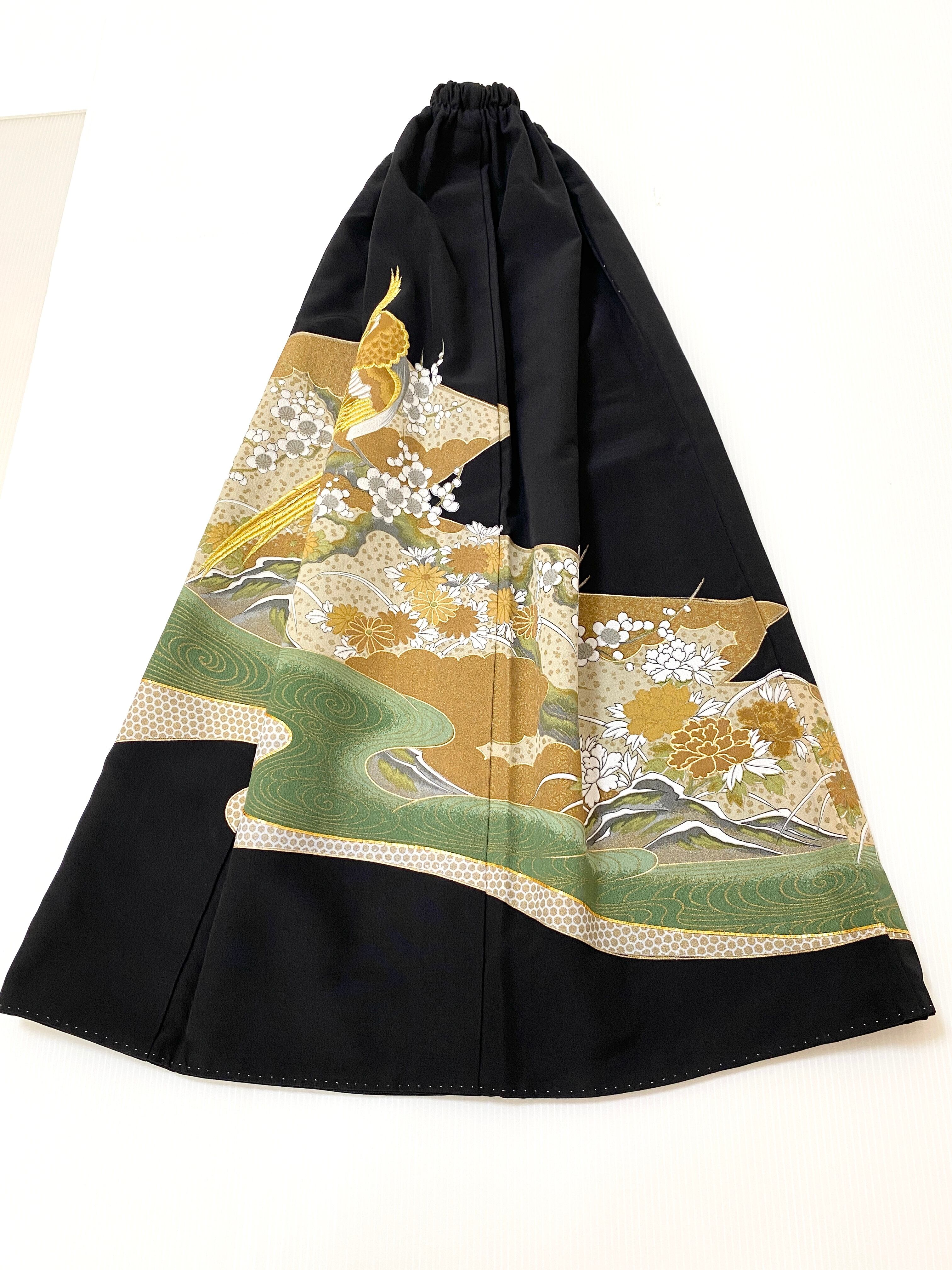 黒留袖着物をリメイクして作製したウエストゴムロングスカートフリーサイズです