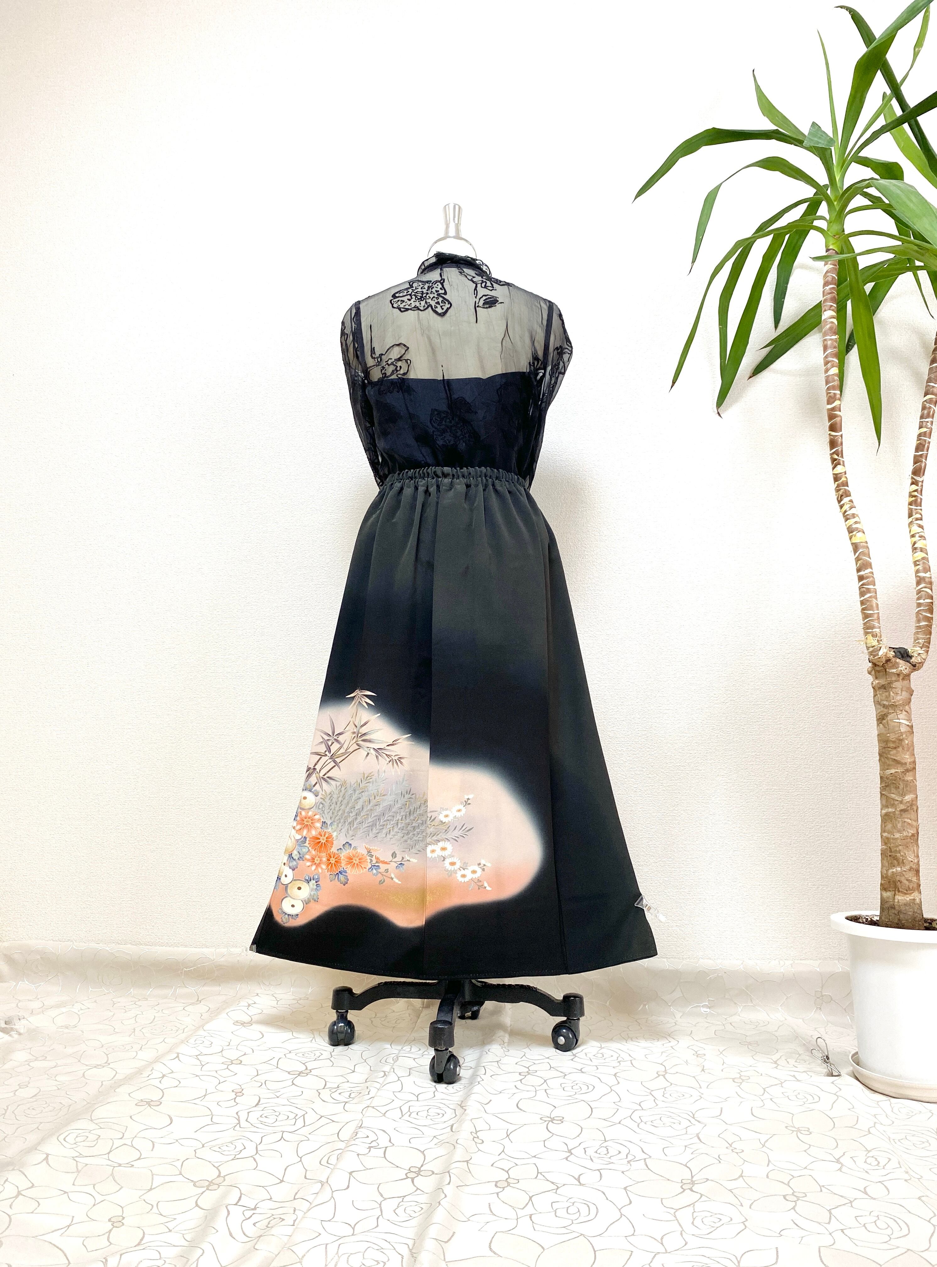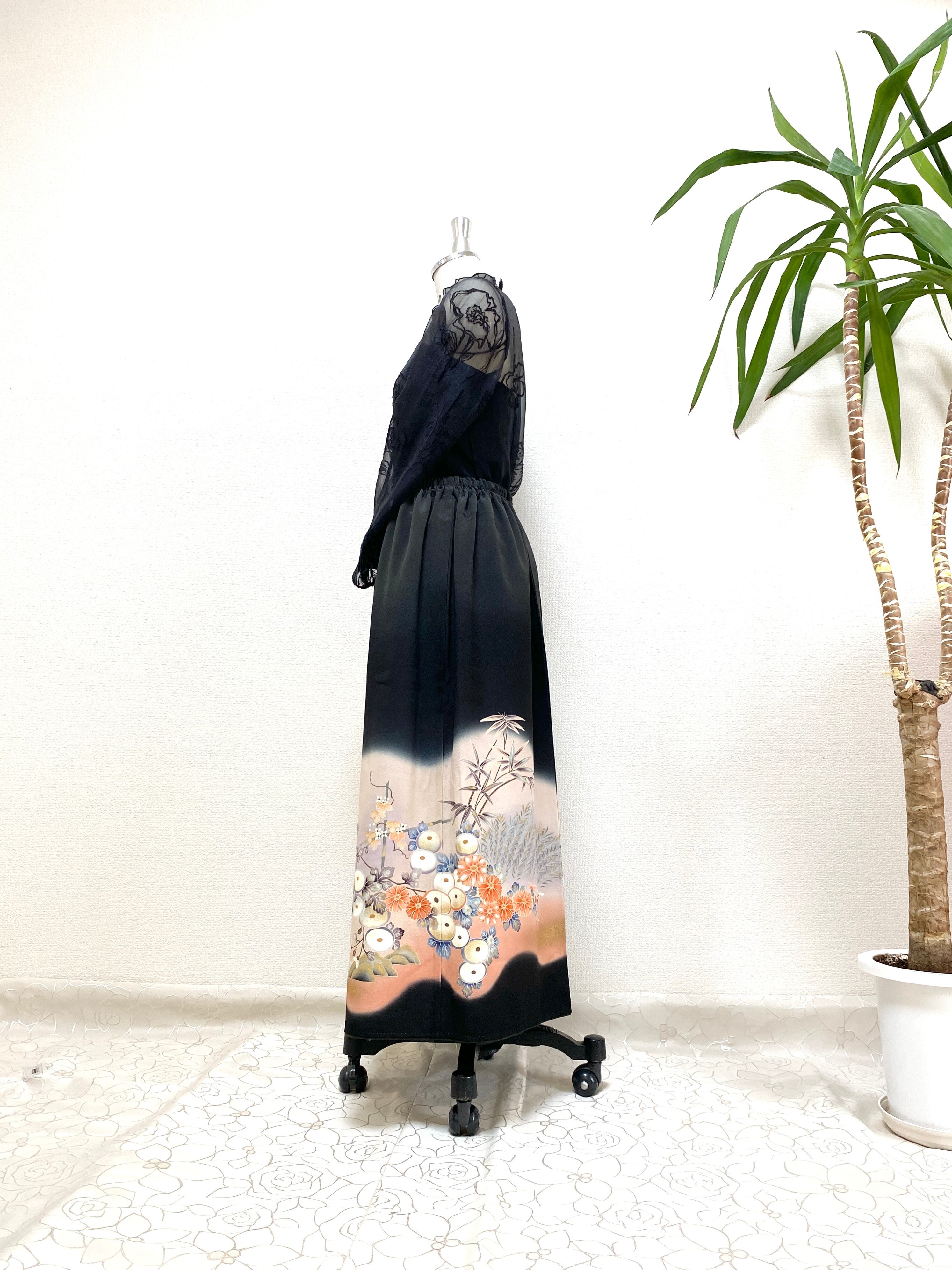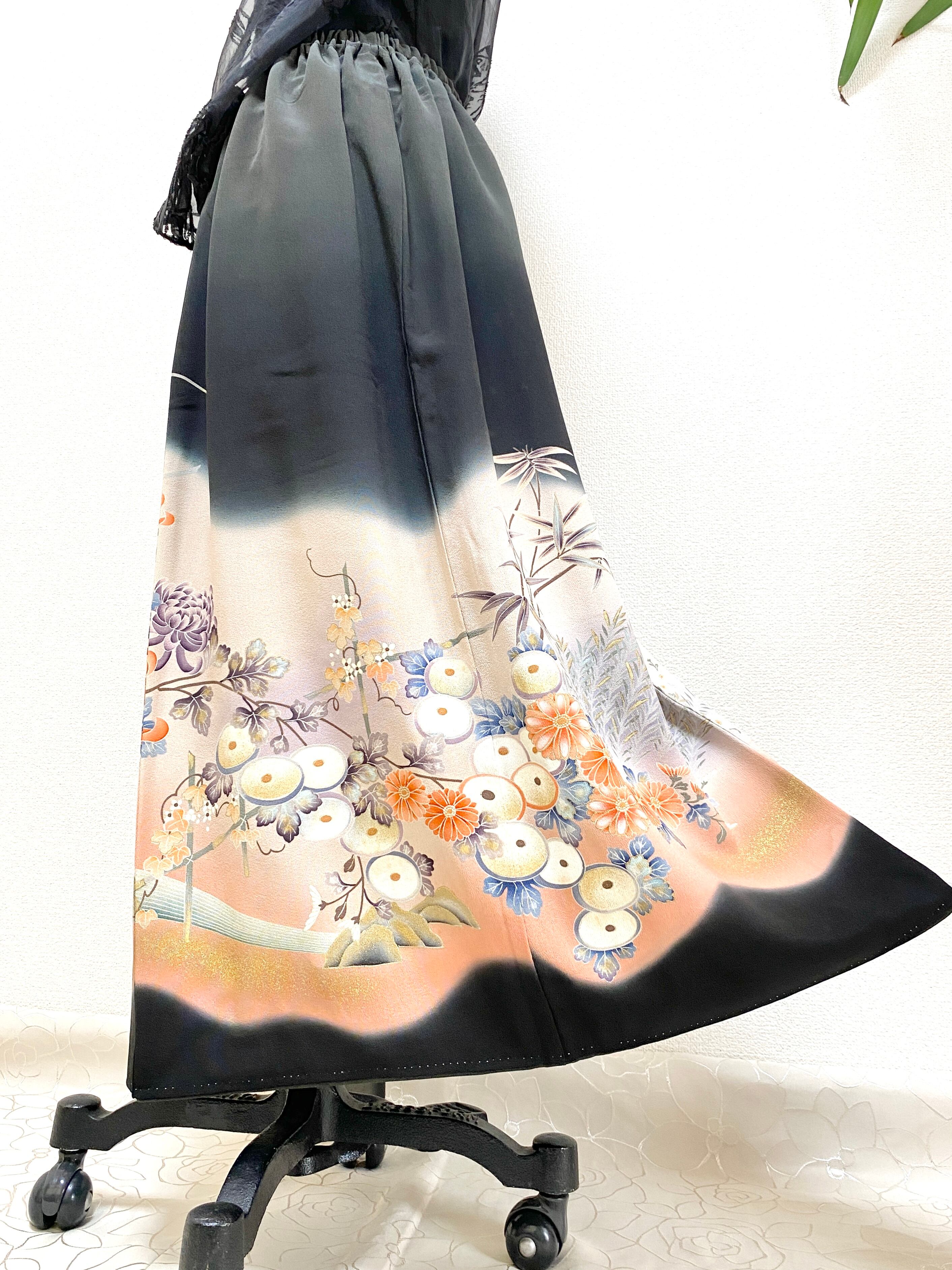 大人可愛いセレブ着物スカートフリーサイズ黒留袖着物リメイクウエストゴムロングスカート送料込みハンドメイドNO.6113