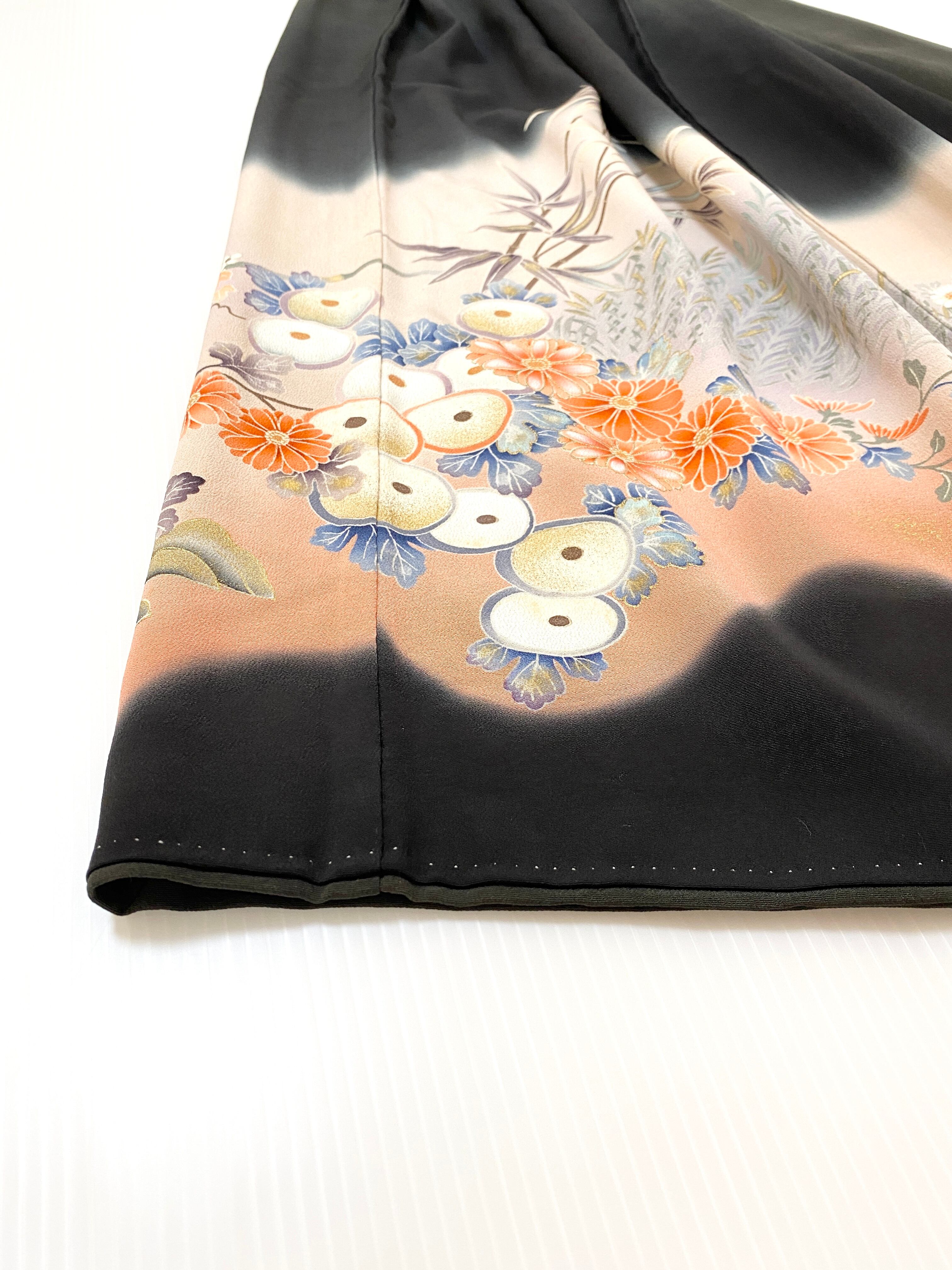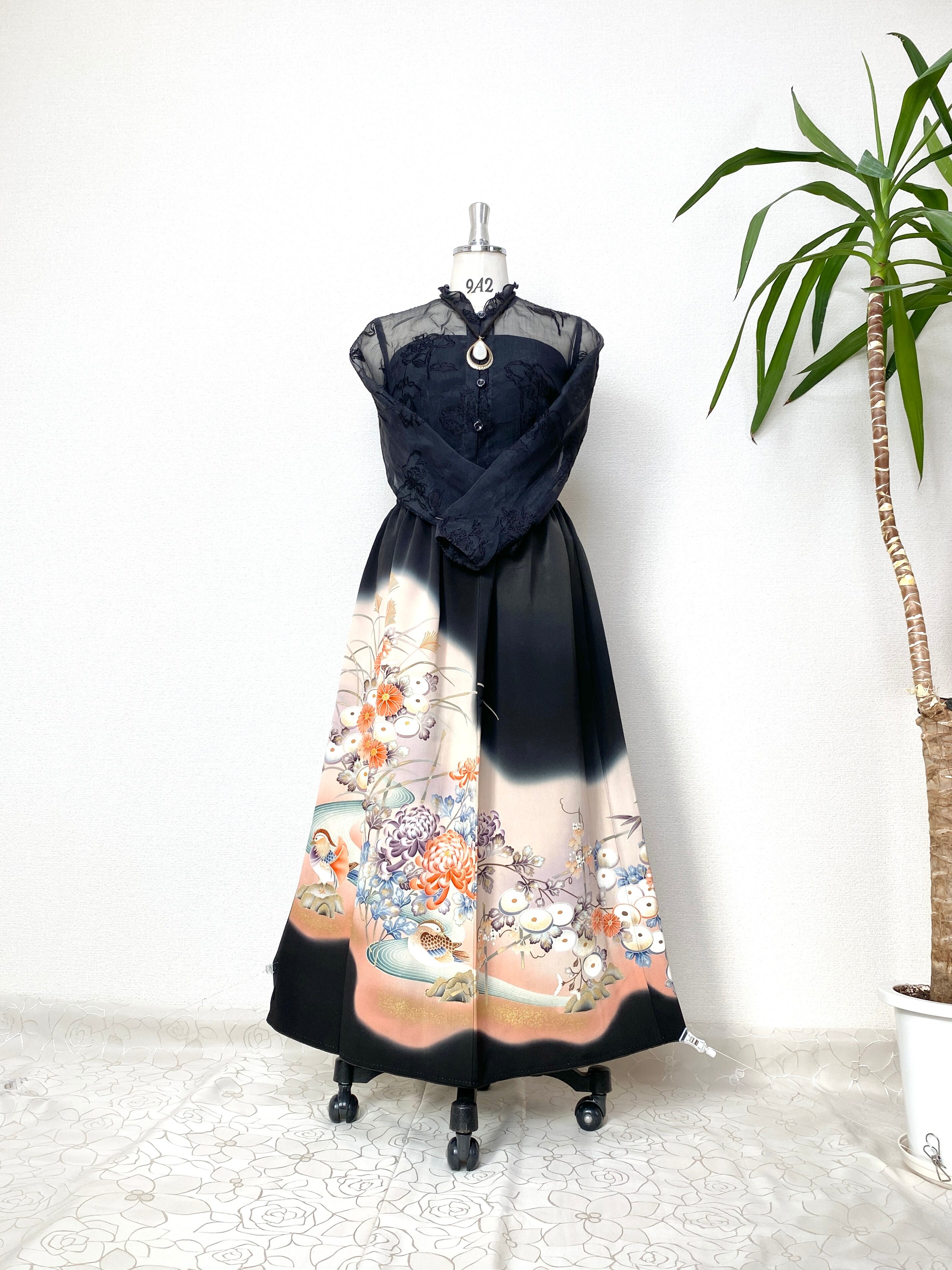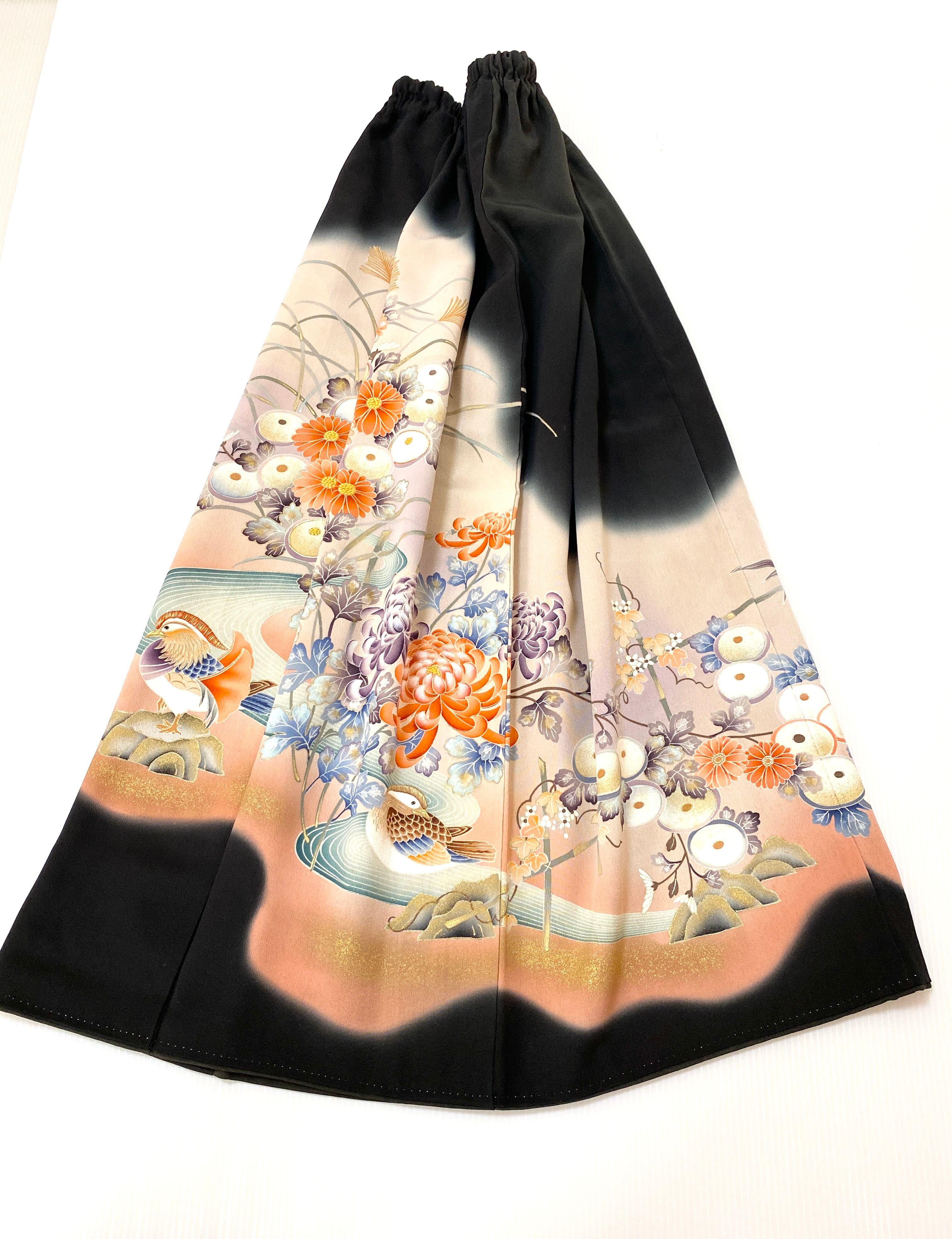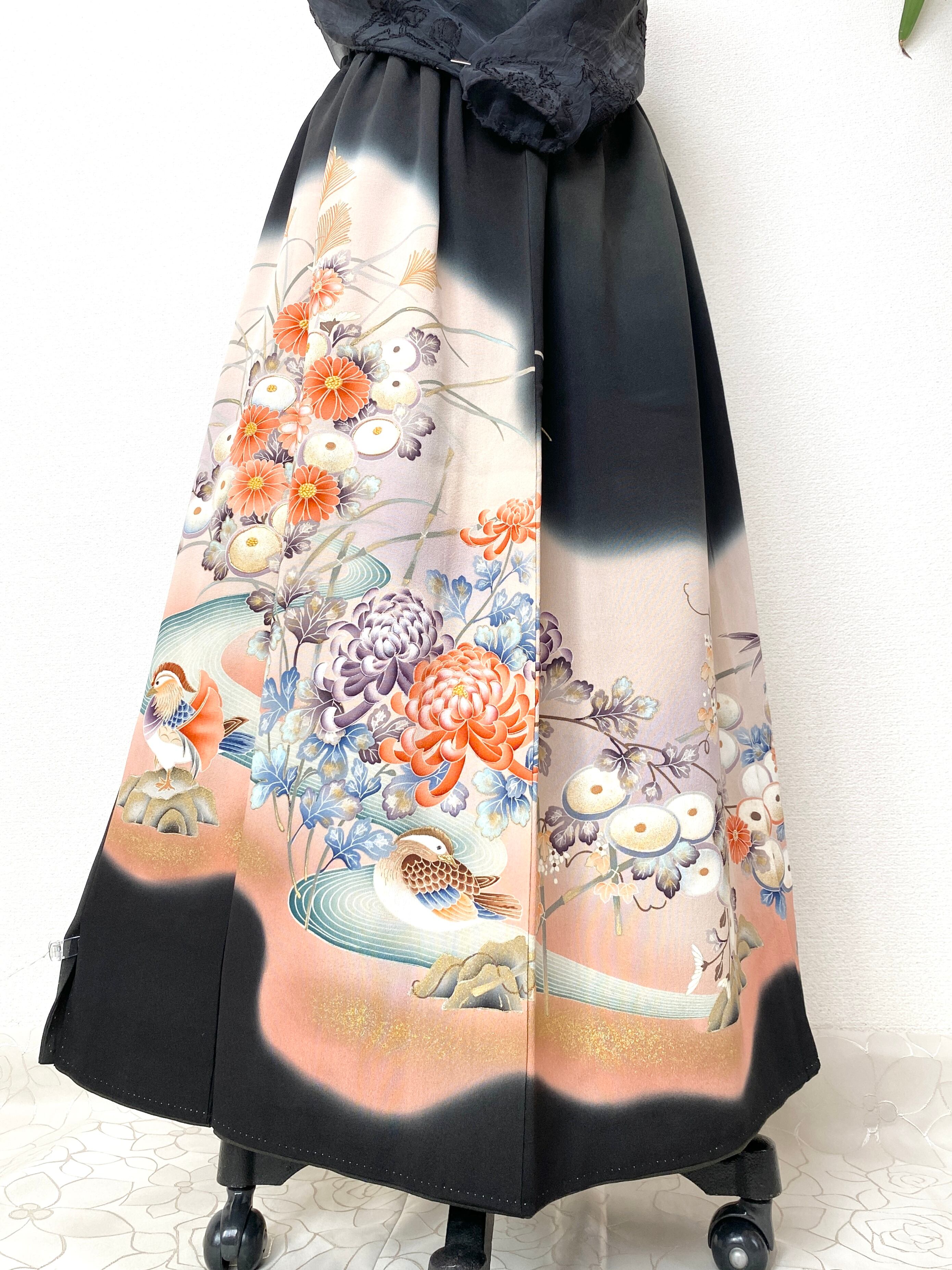 大人可愛いセレブ着物スカートフリーサイズ黒留袖着物リメイクウエストゴムロングスカート送料込みハンドメイドNO.6113