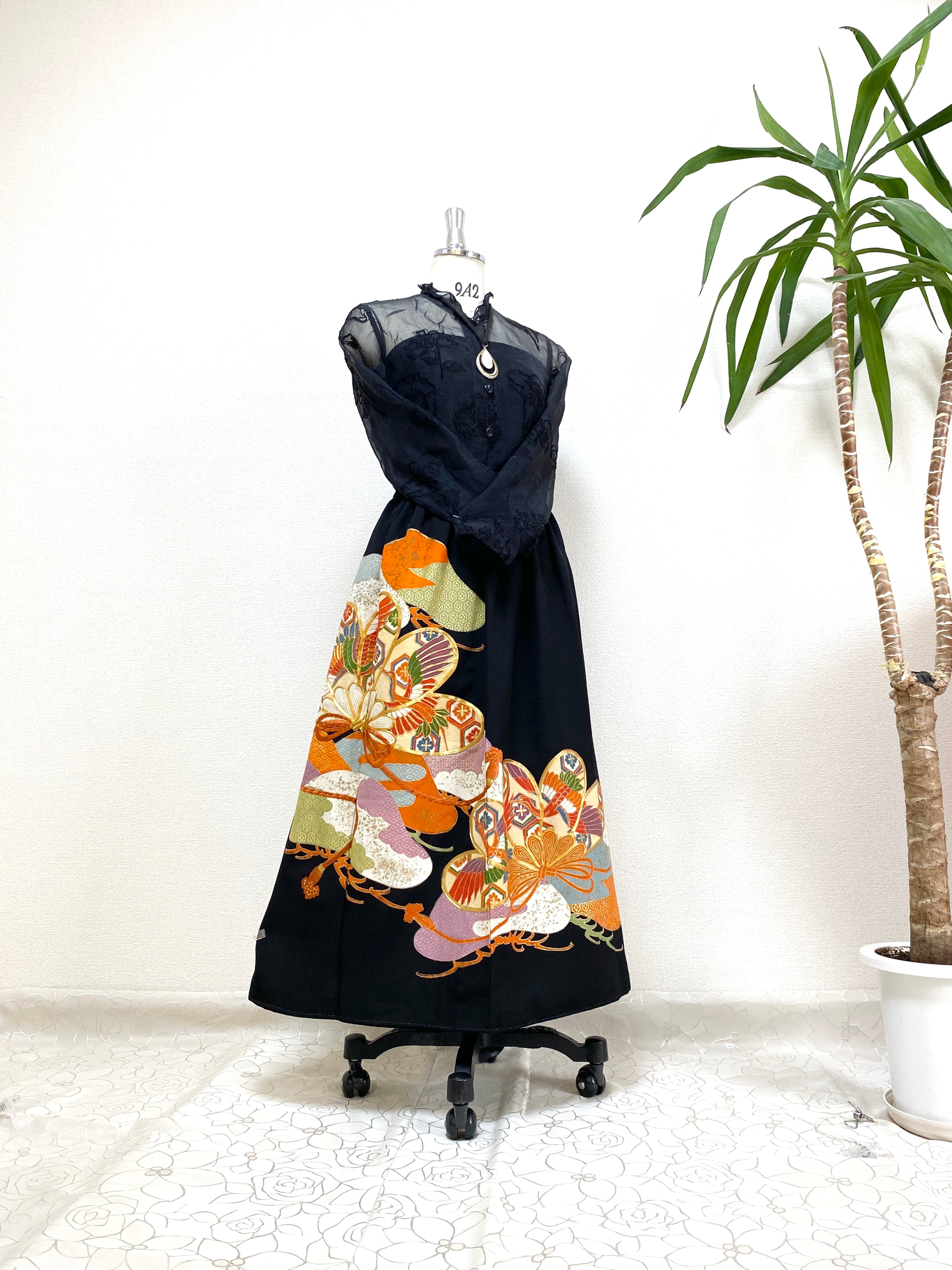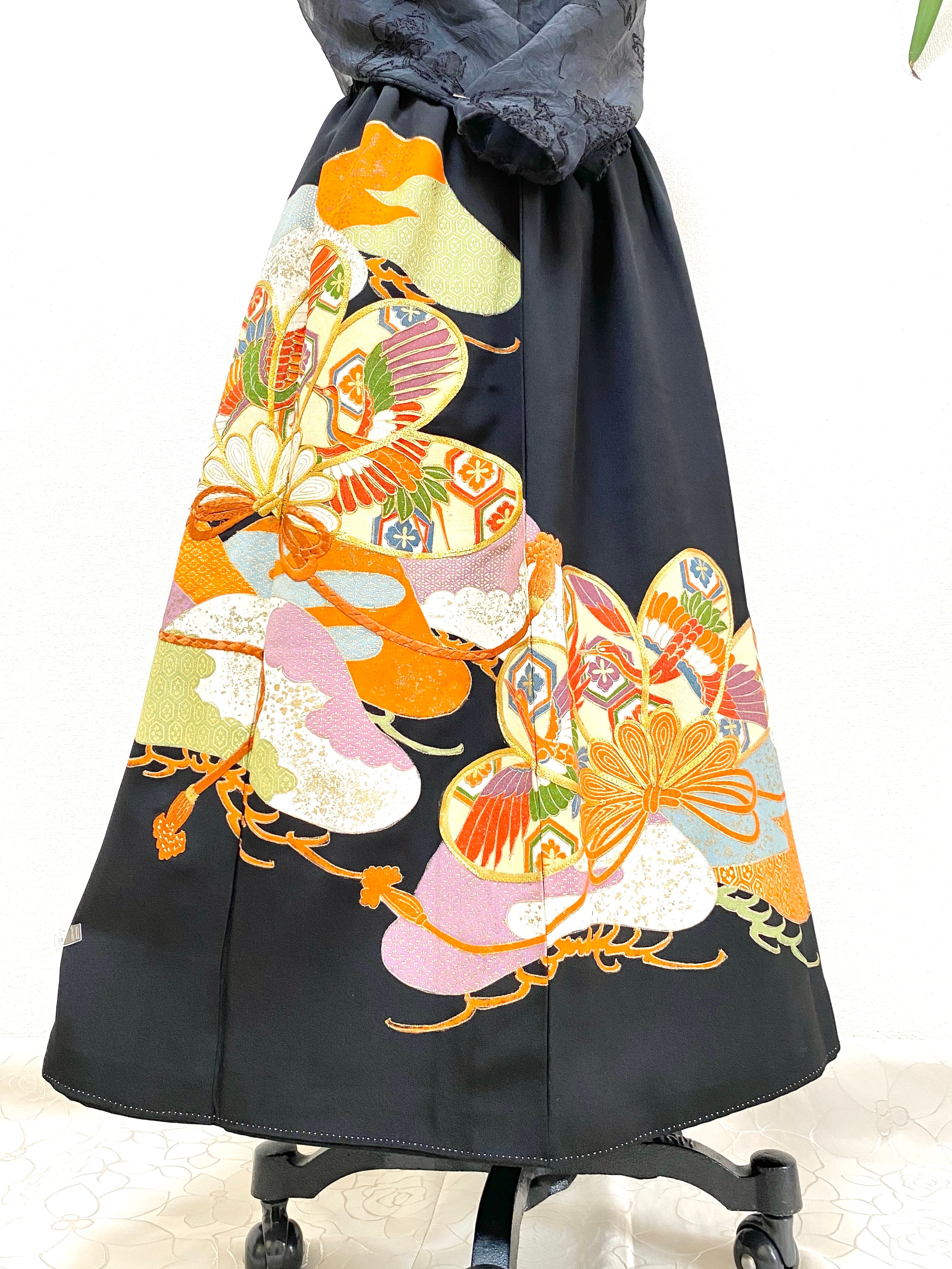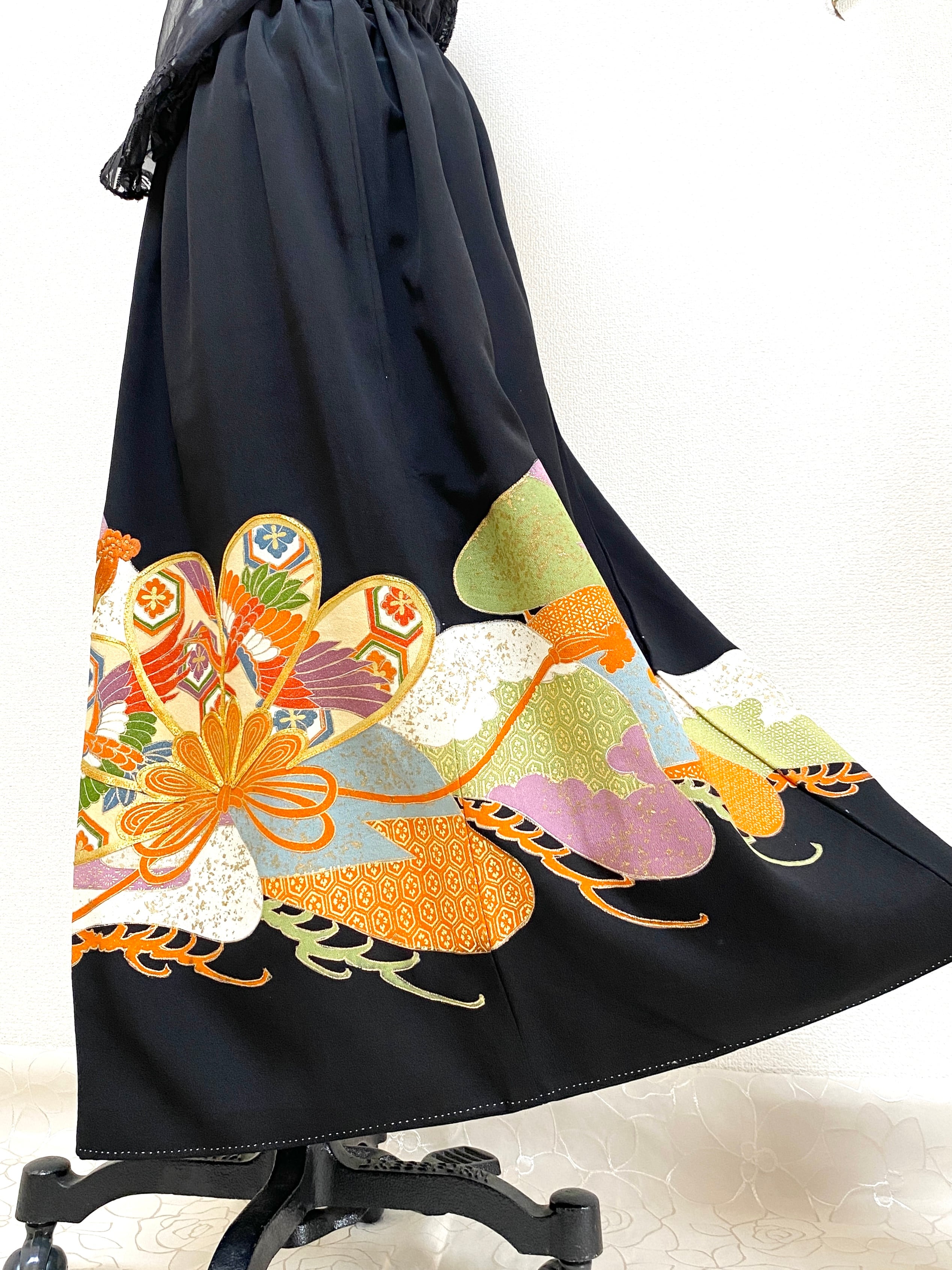 大人可愛いセレブ着物スカートフリーサイズ黒留袖着物リメイクウエストゴムロングスカート送料込みハンドメイドNO.6118