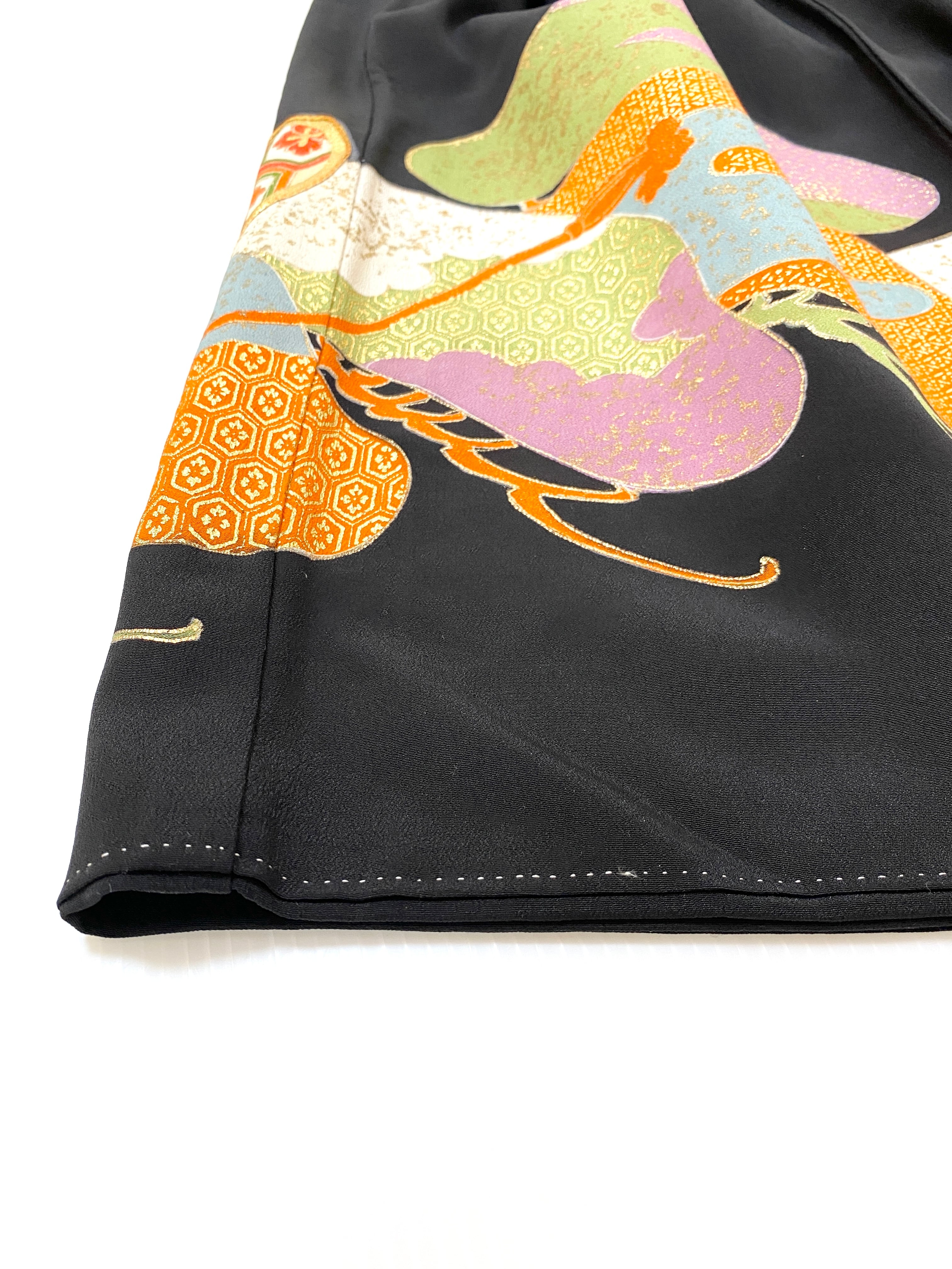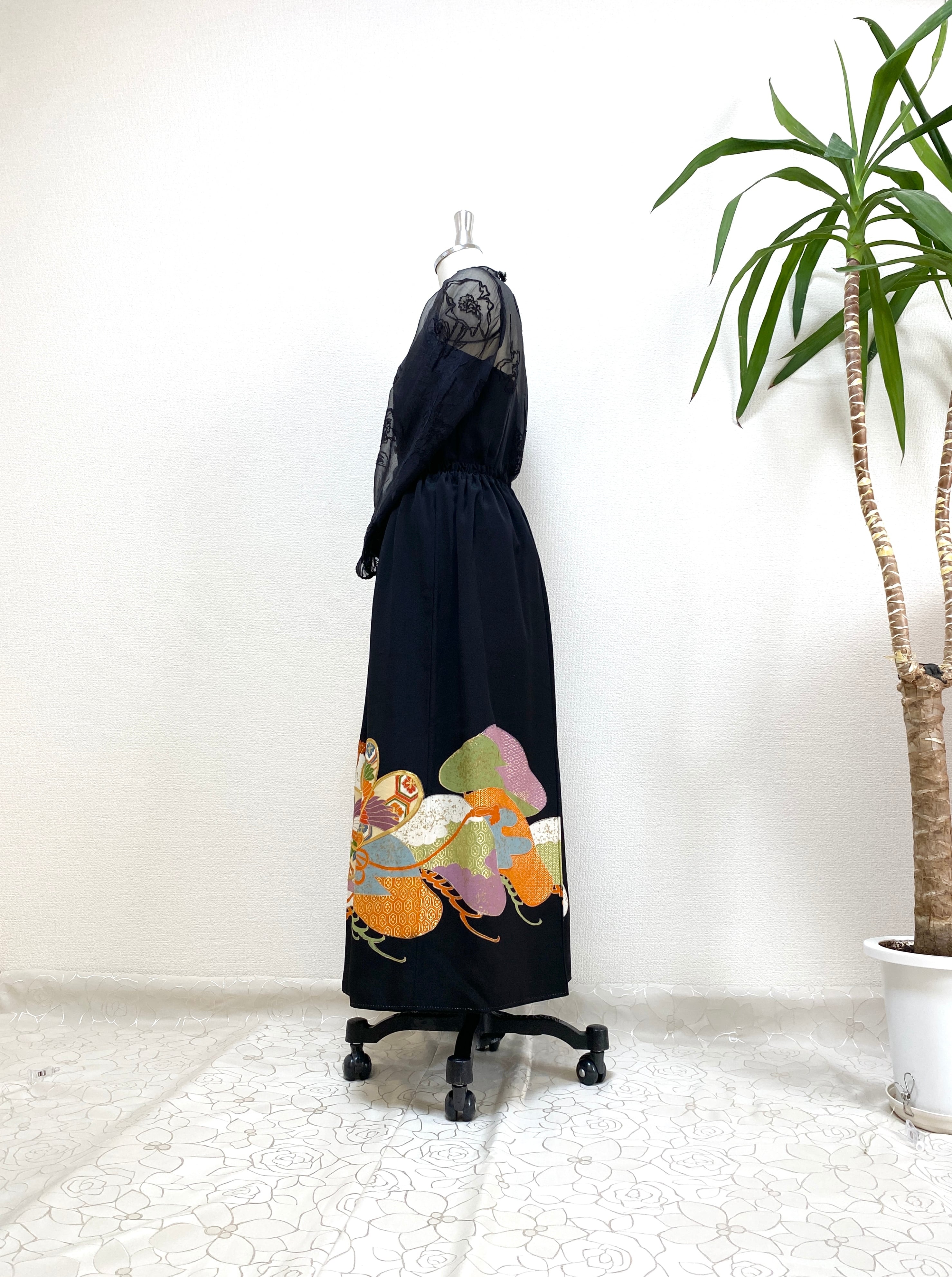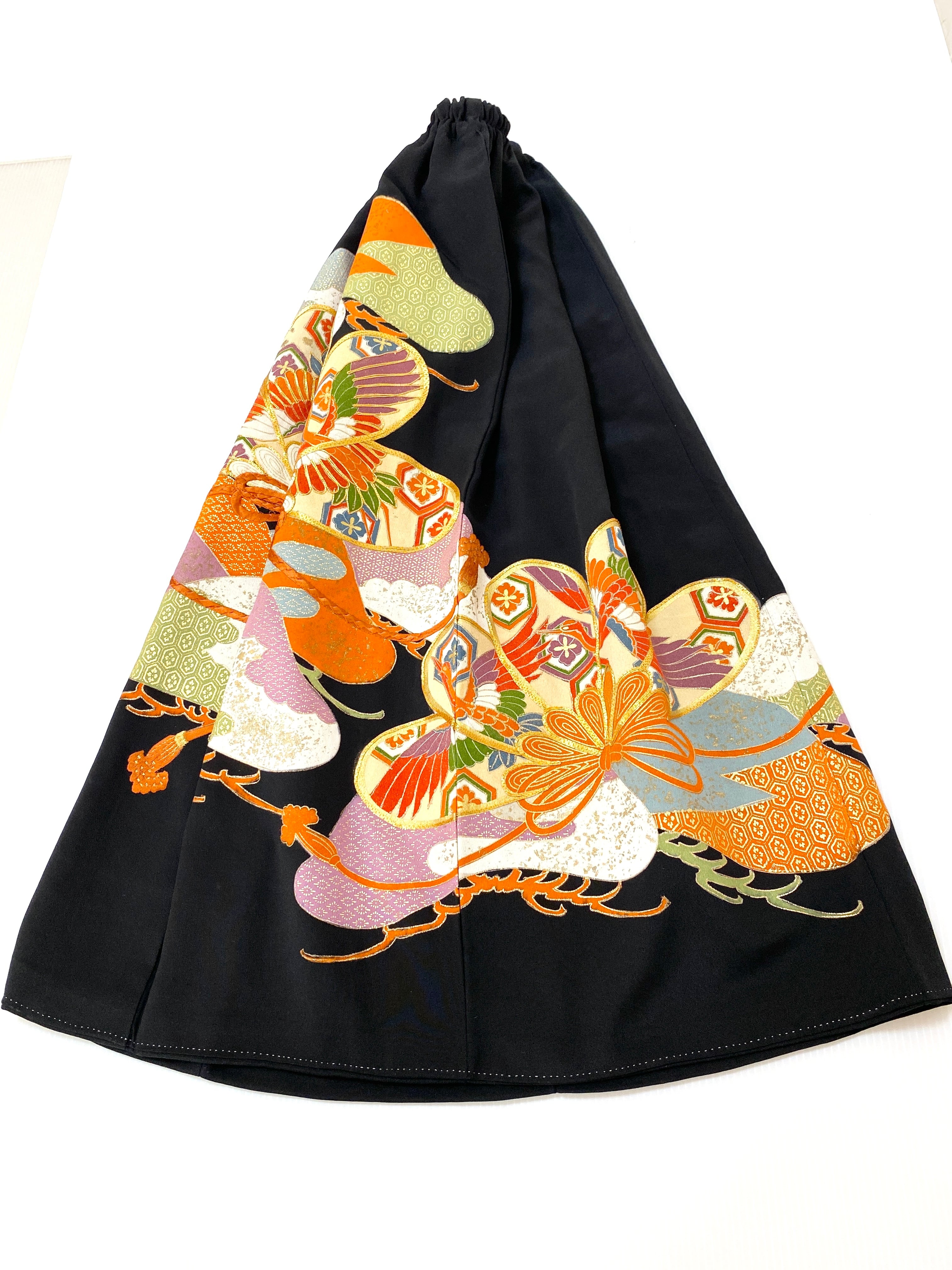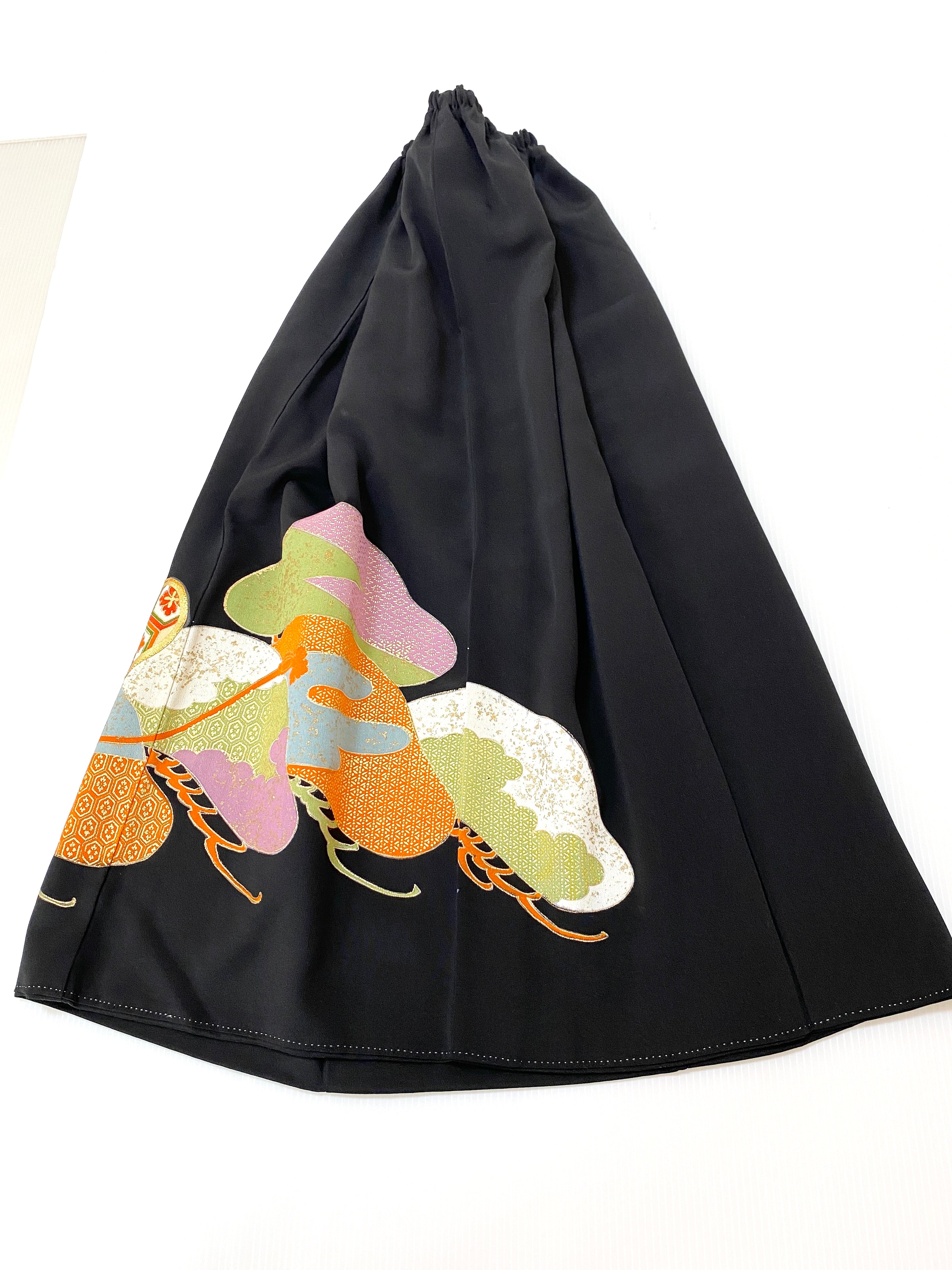 黒留袖着物をリメイクして作製したウエストゴムロングスカートフリーサイズです