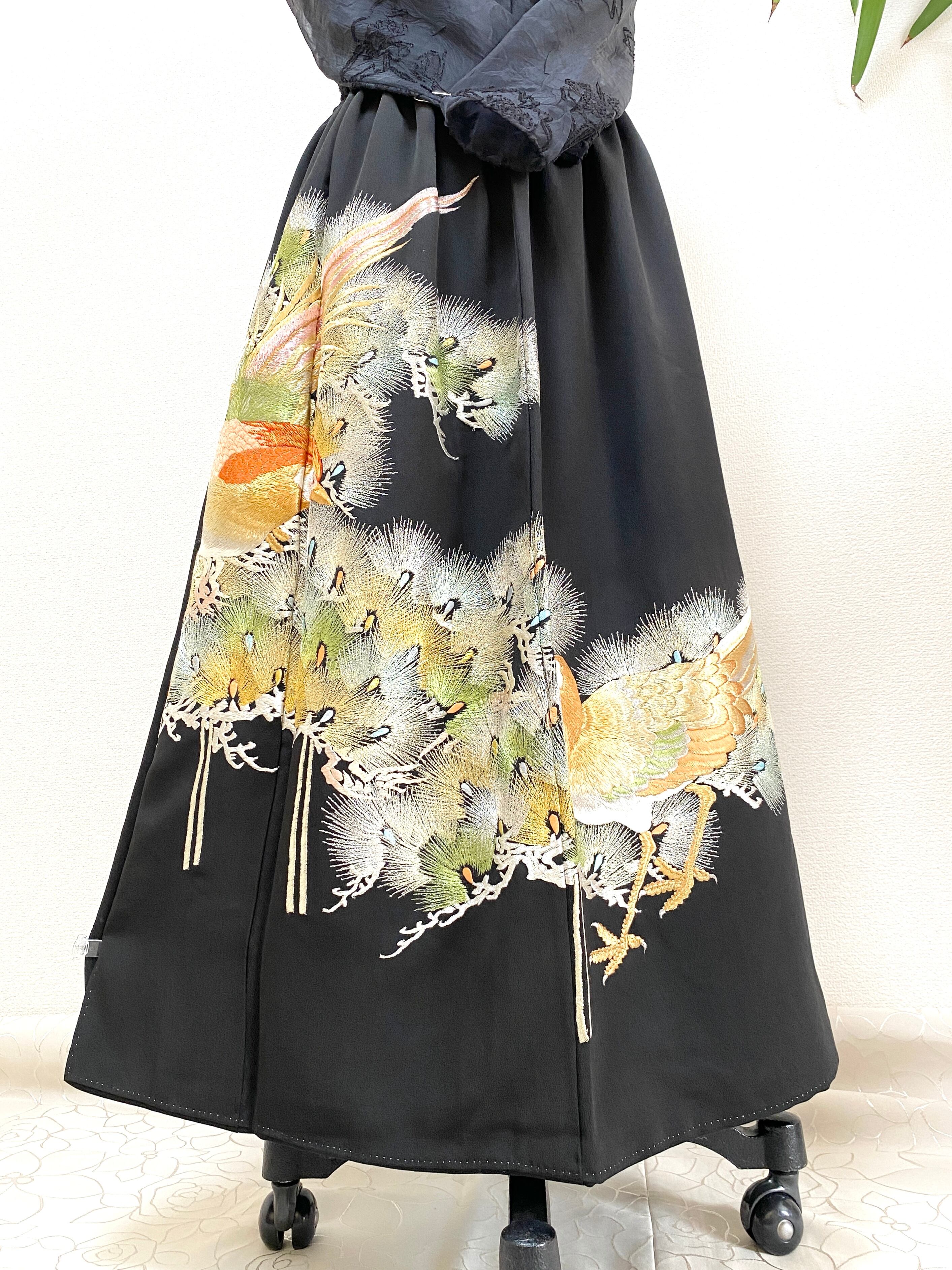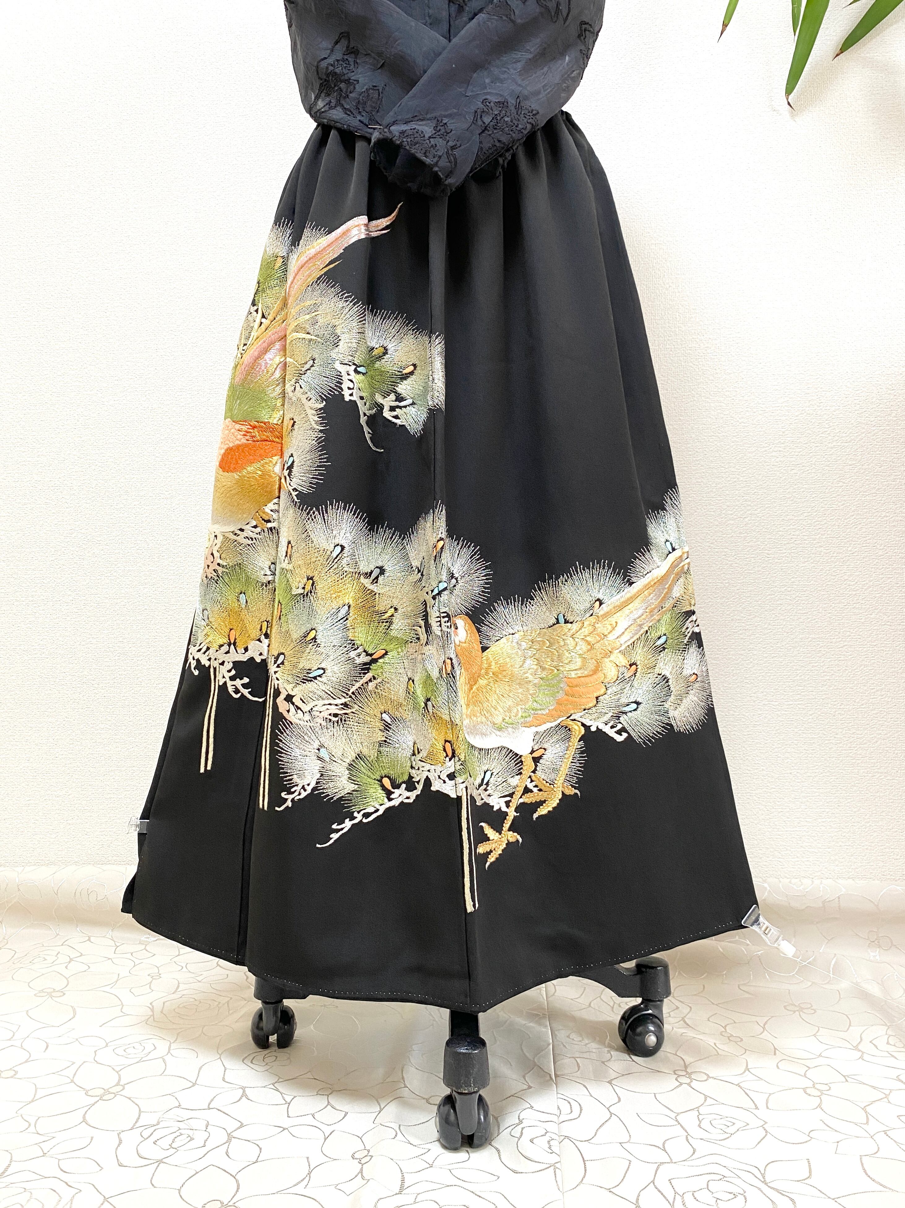 大人可愛いセレブ着物スカートフリーサイズ黒留袖着物リメイクウエストゴムロングスカート送料込みハンドメイドNO.6128