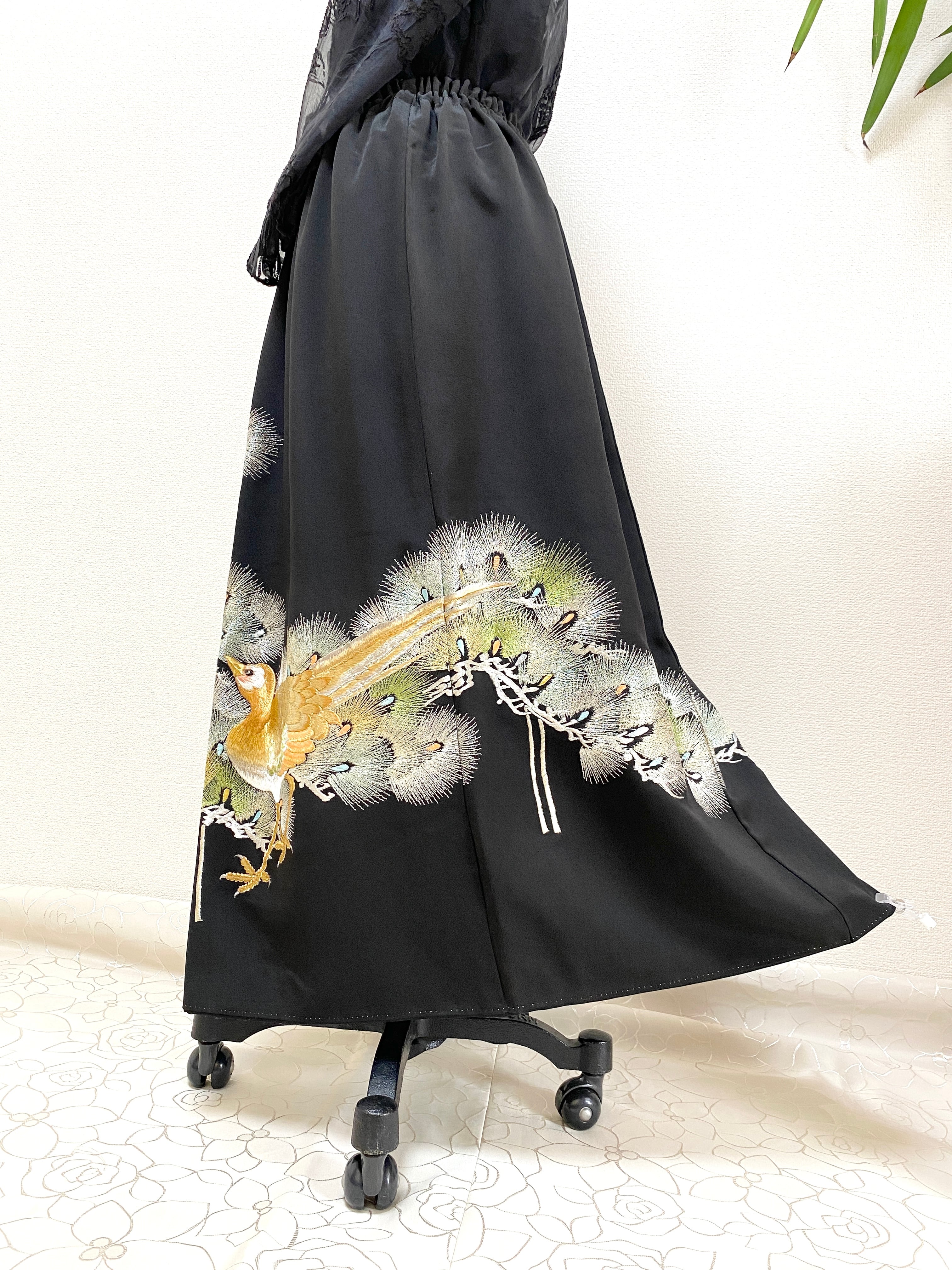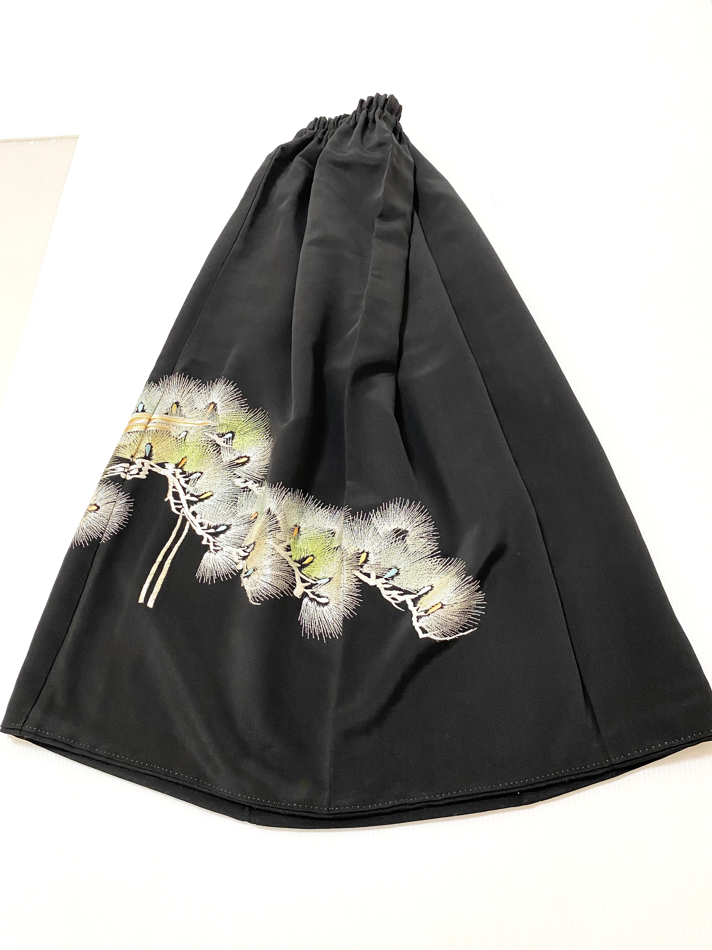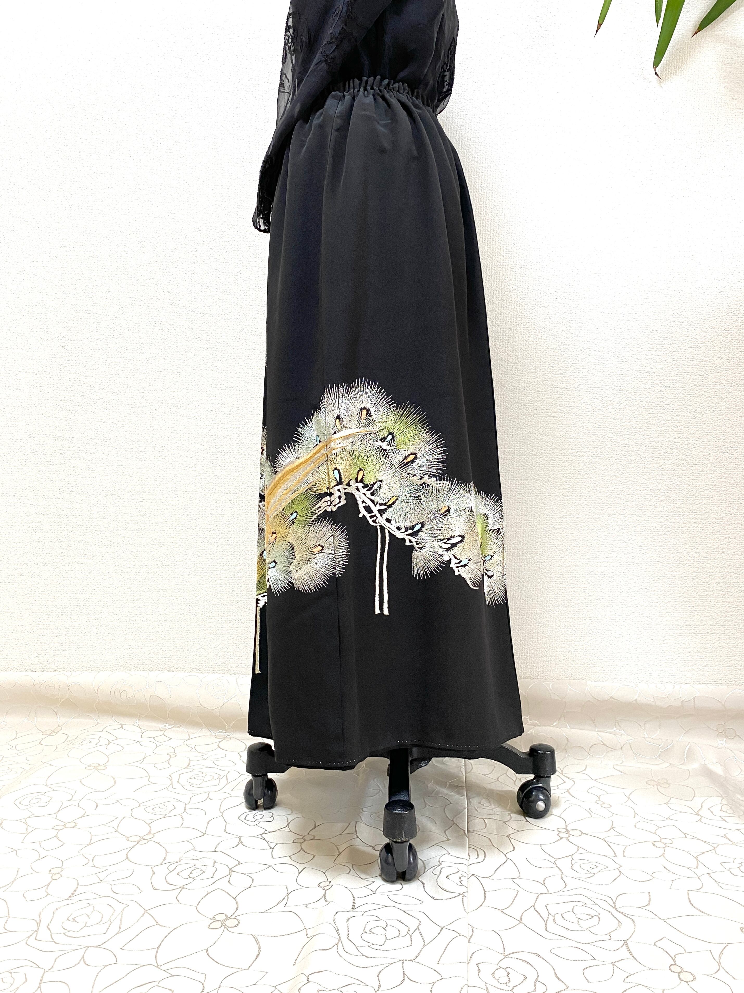 黒留袖着物をリメイクして作製したウエストゴムロングスカートフリーサイズです