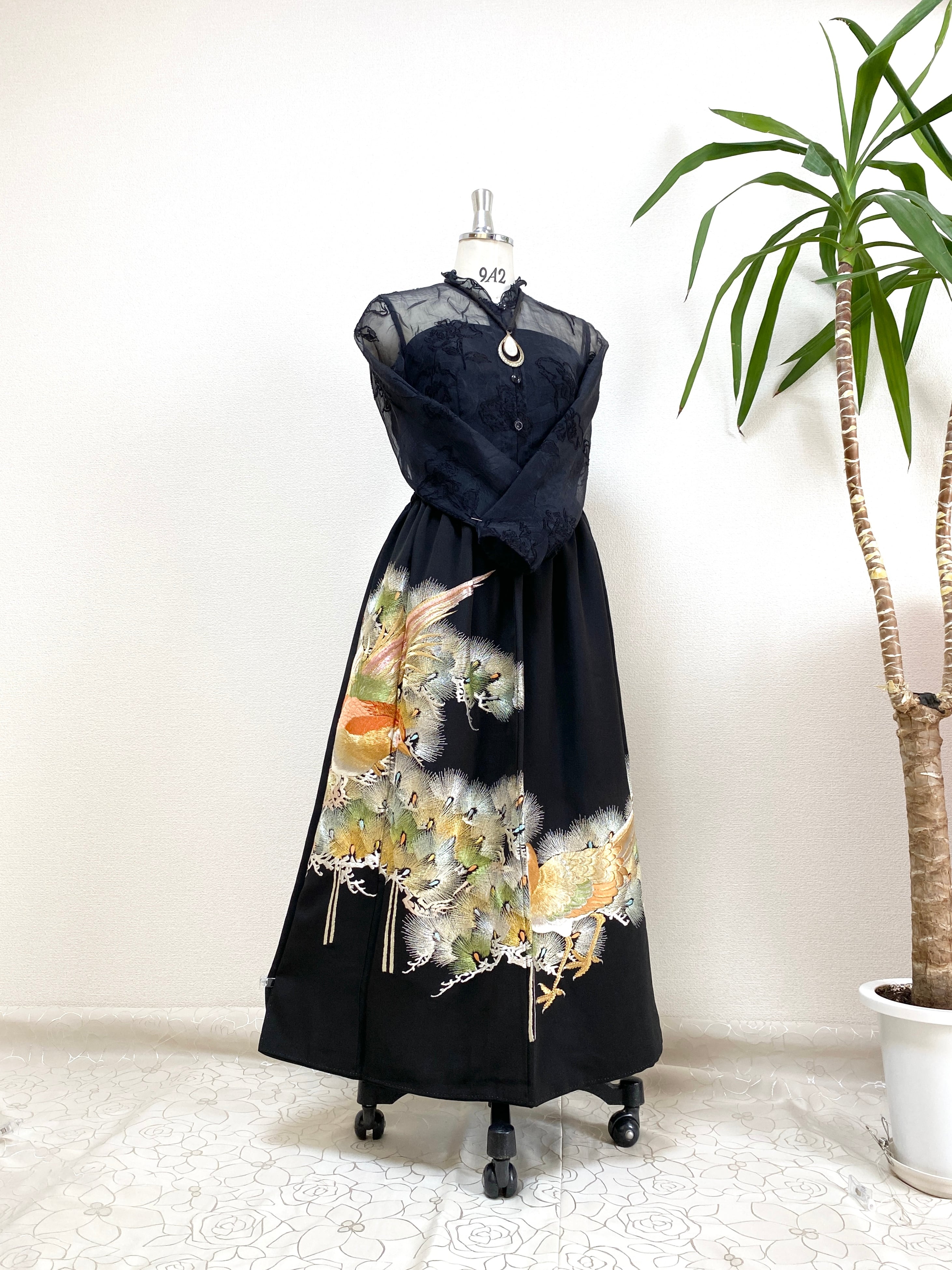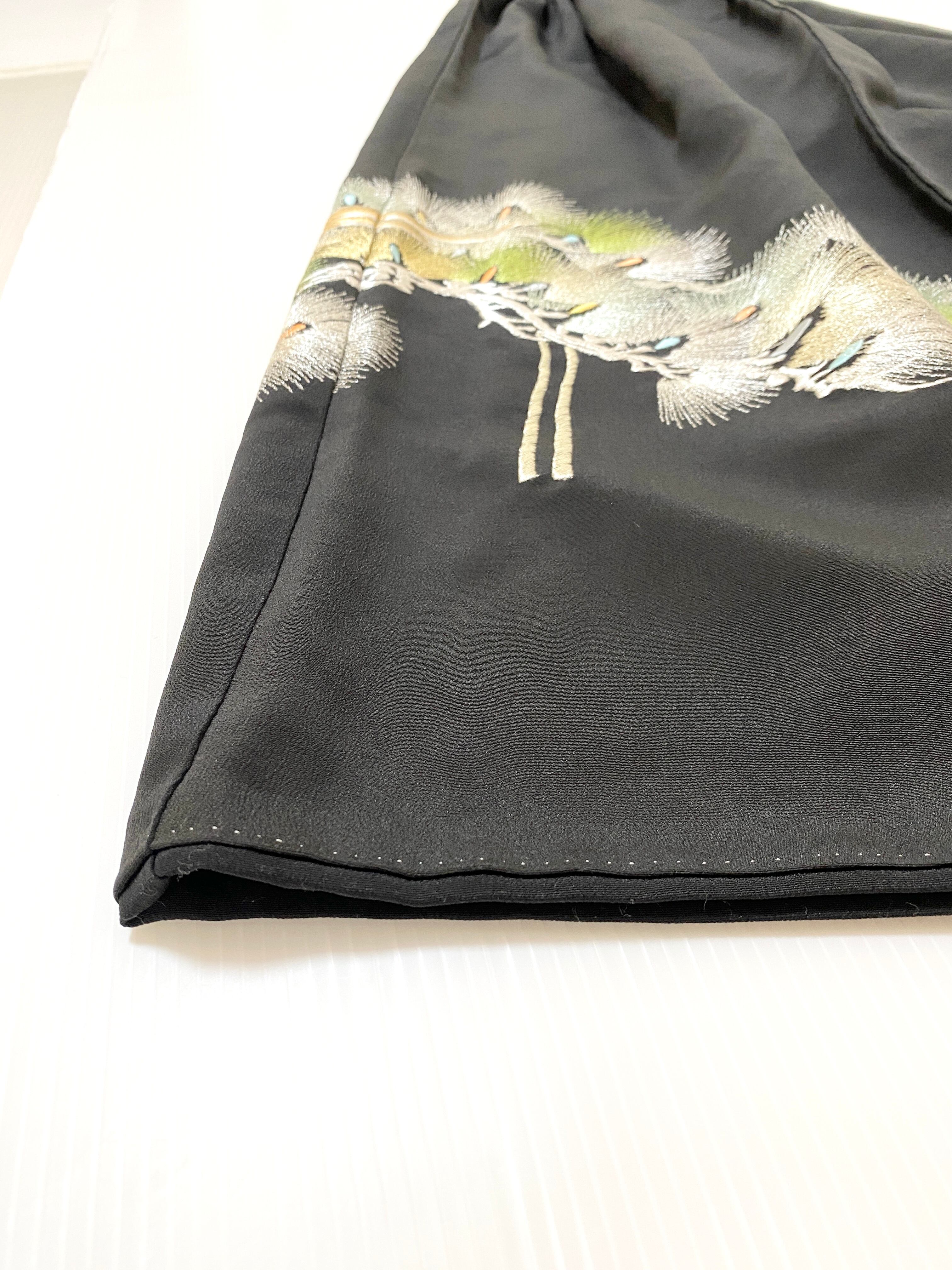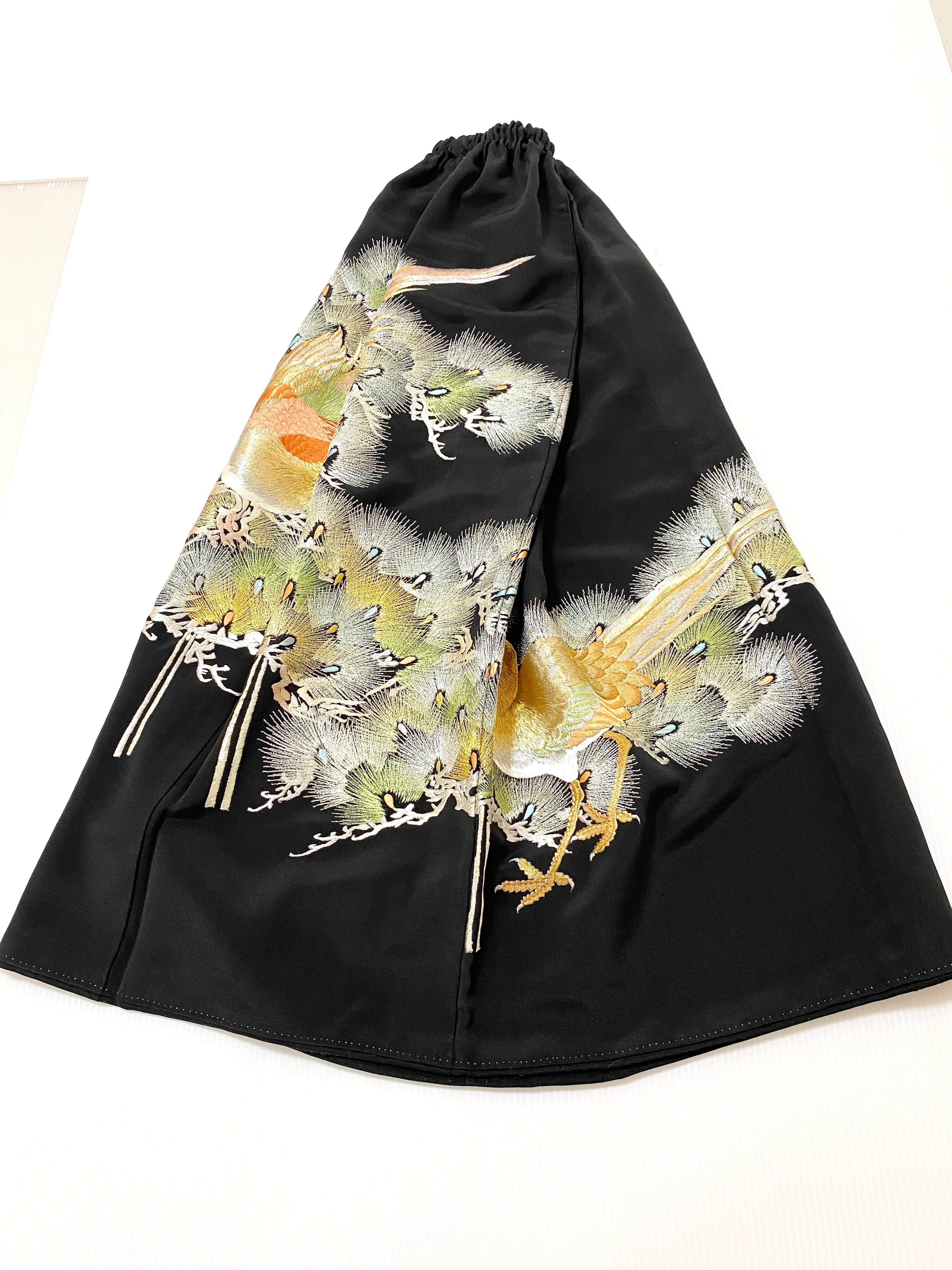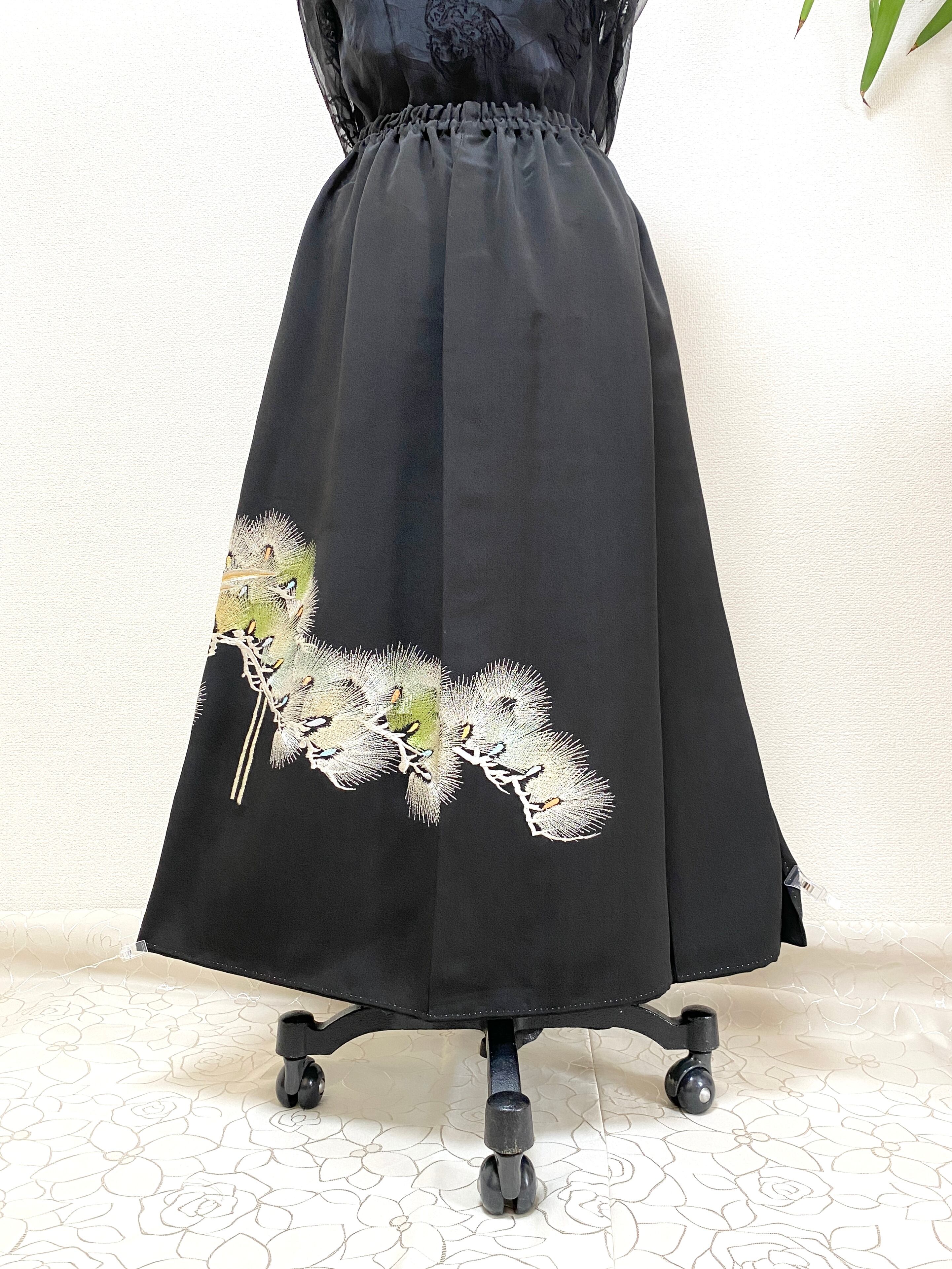 黒留袖着物をリメイクして作製したウエストゴムロングスカートフリーサイズです