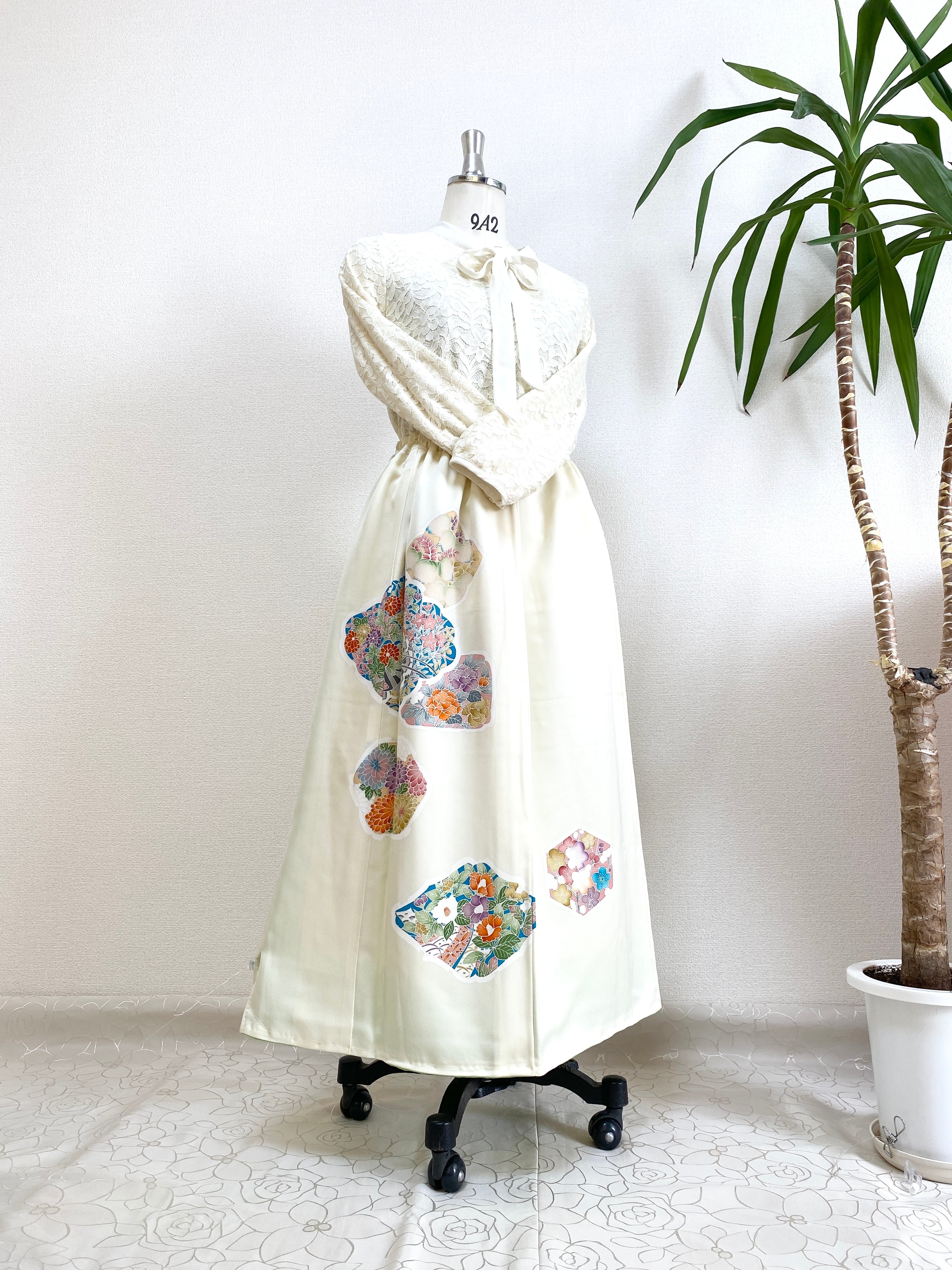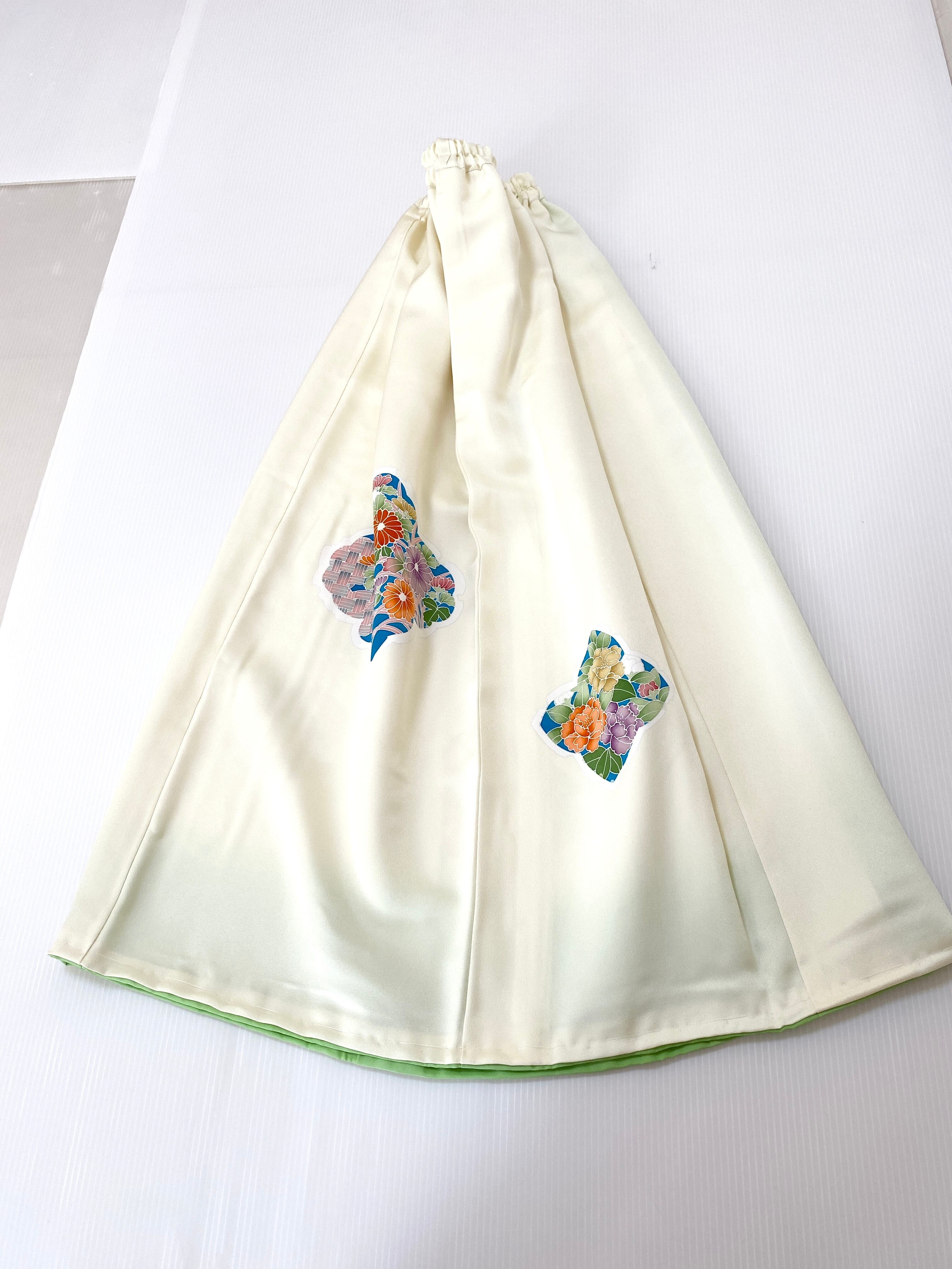 着物をリメイクして作製したウエストゴムロングスカートフリーサイズです
