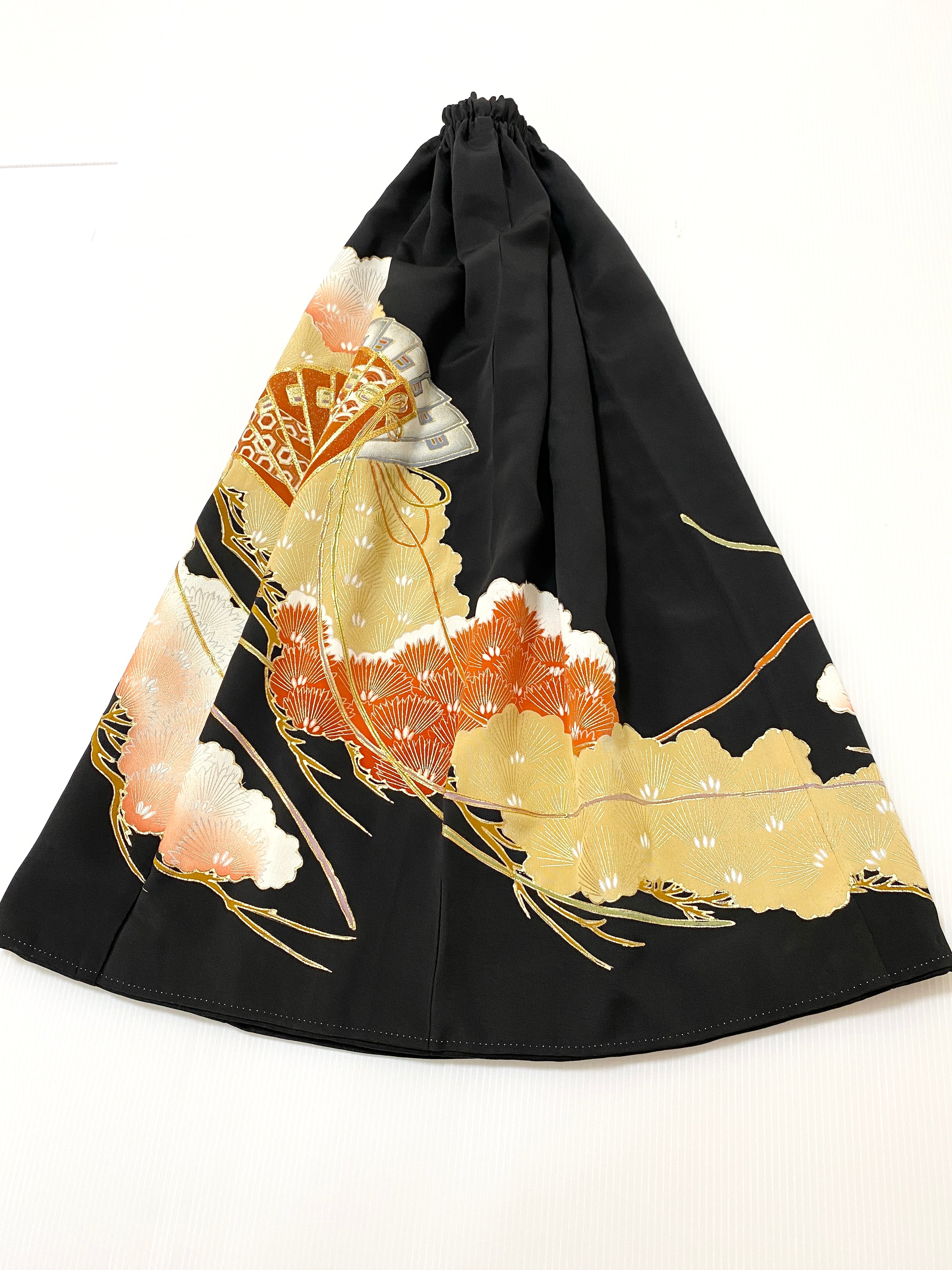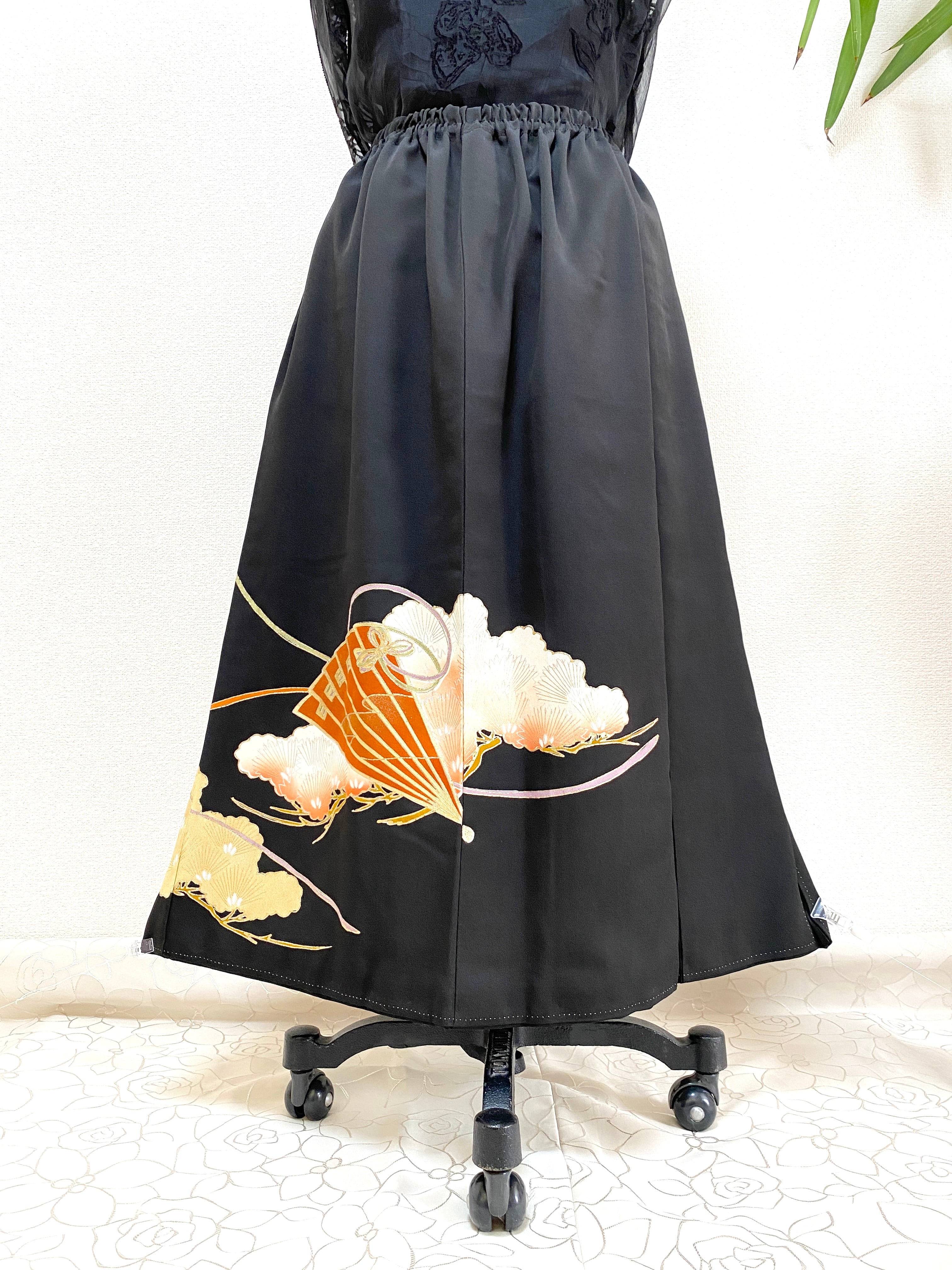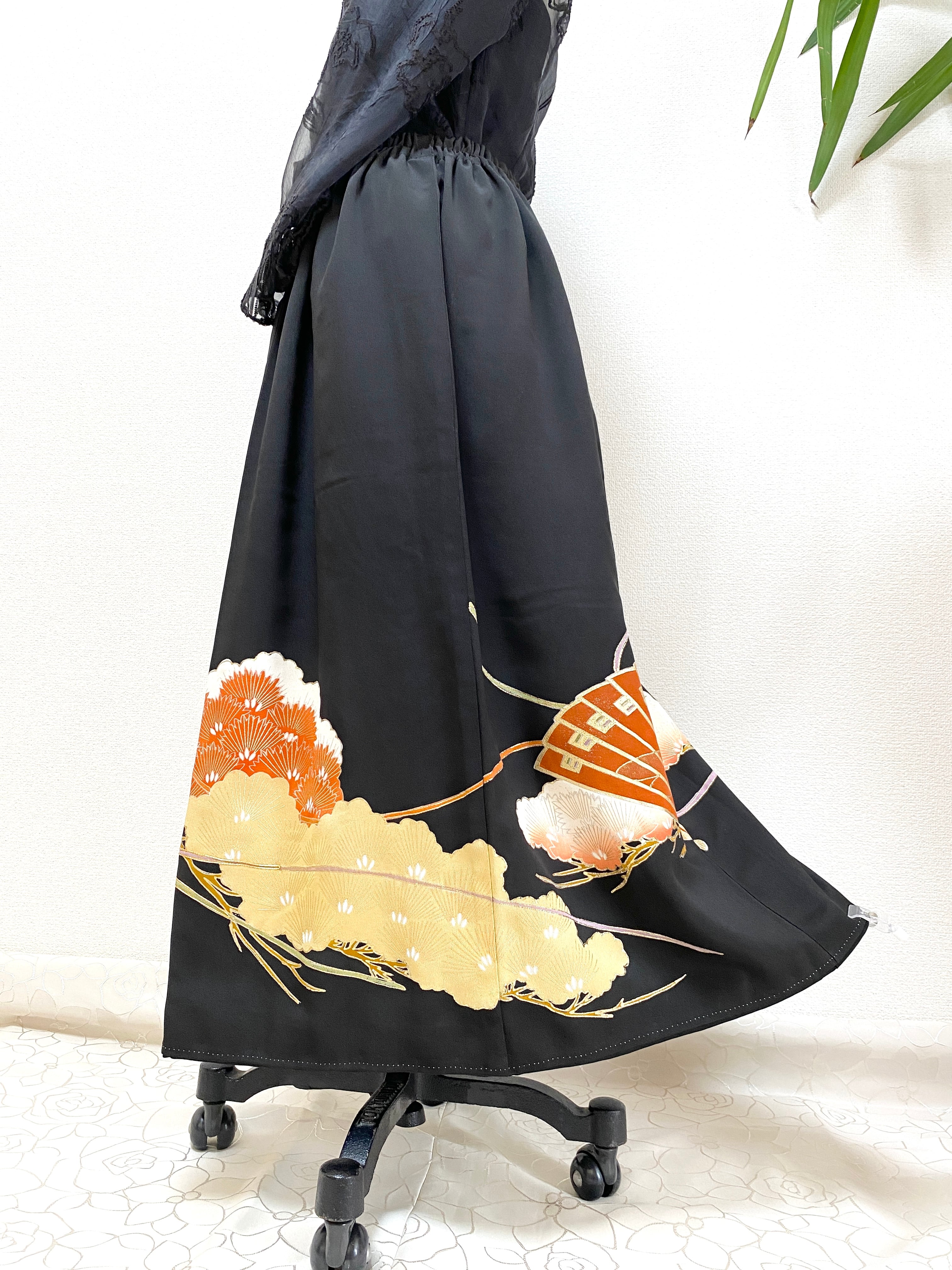大人可愛いセレブ着物スカートフリーサイズ黒留袖着物リメイクウエストゴムロングスカート送料込みハンドメイドNO.6167