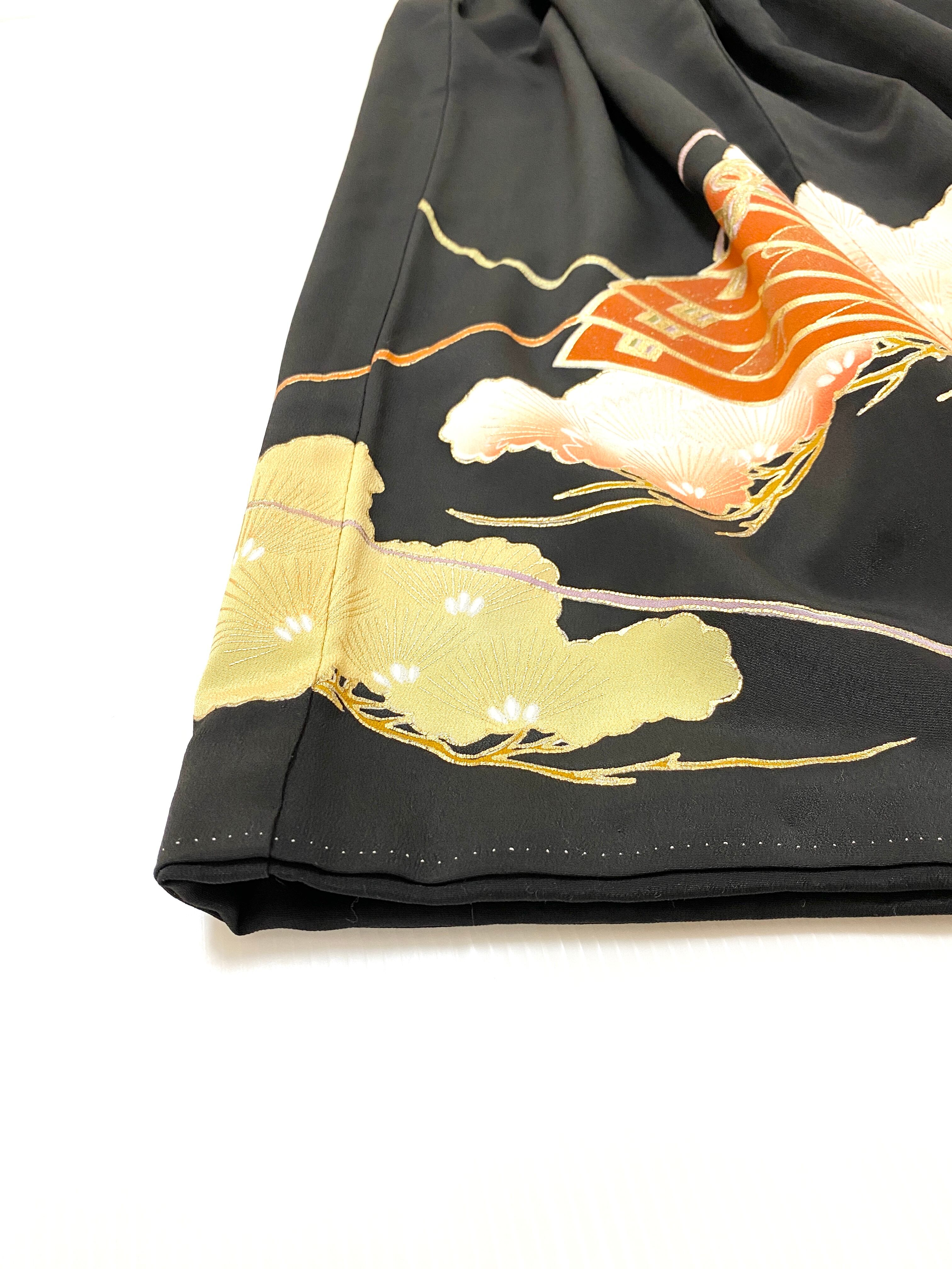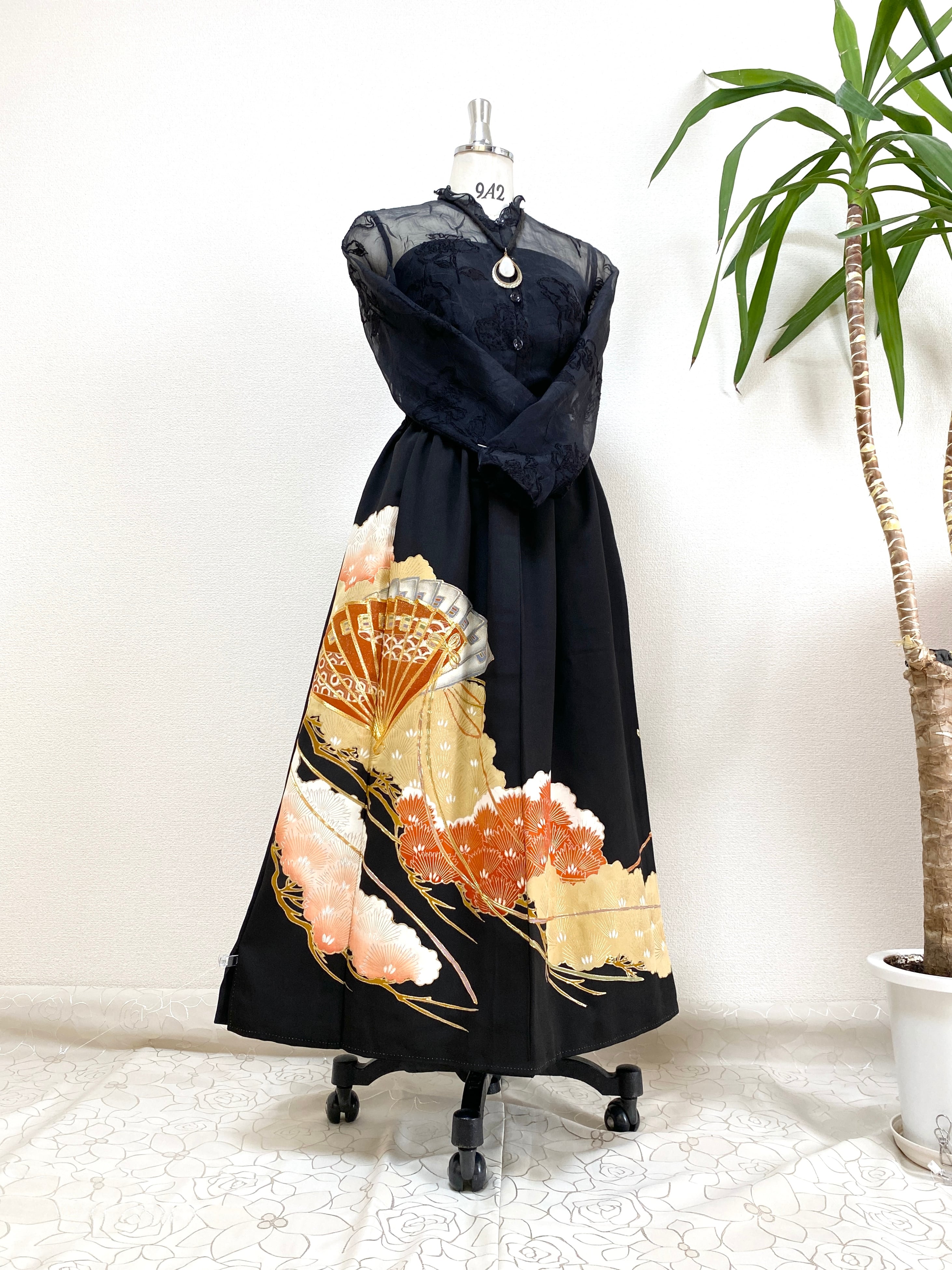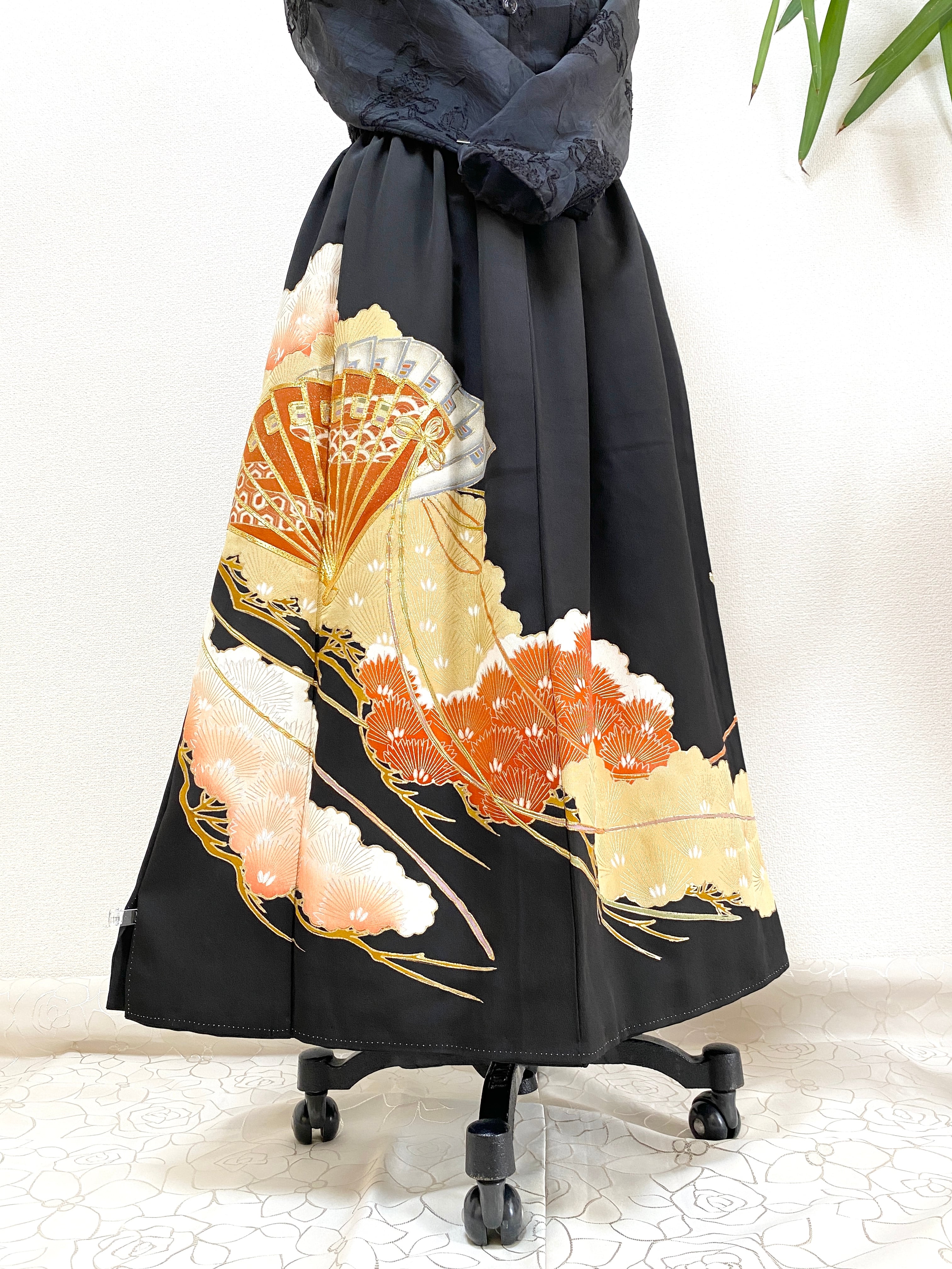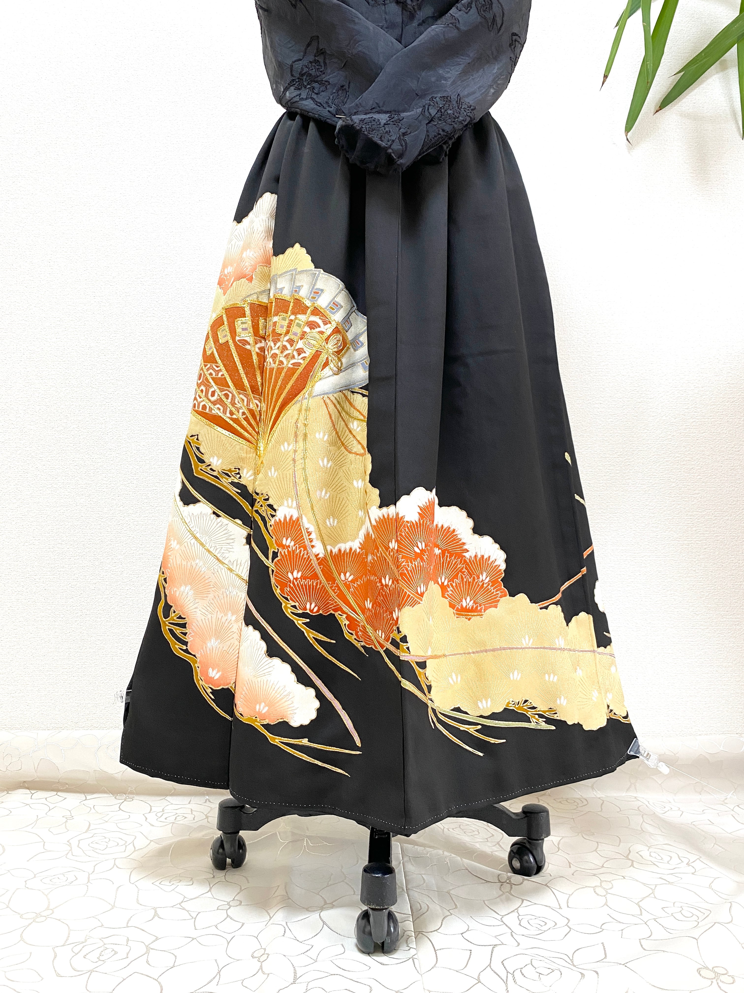 大人可愛いセレブ着物スカートフリーサイズ黒留袖着物リメイクウエストゴムロングスカート送料込みハンドメイドNO.6167