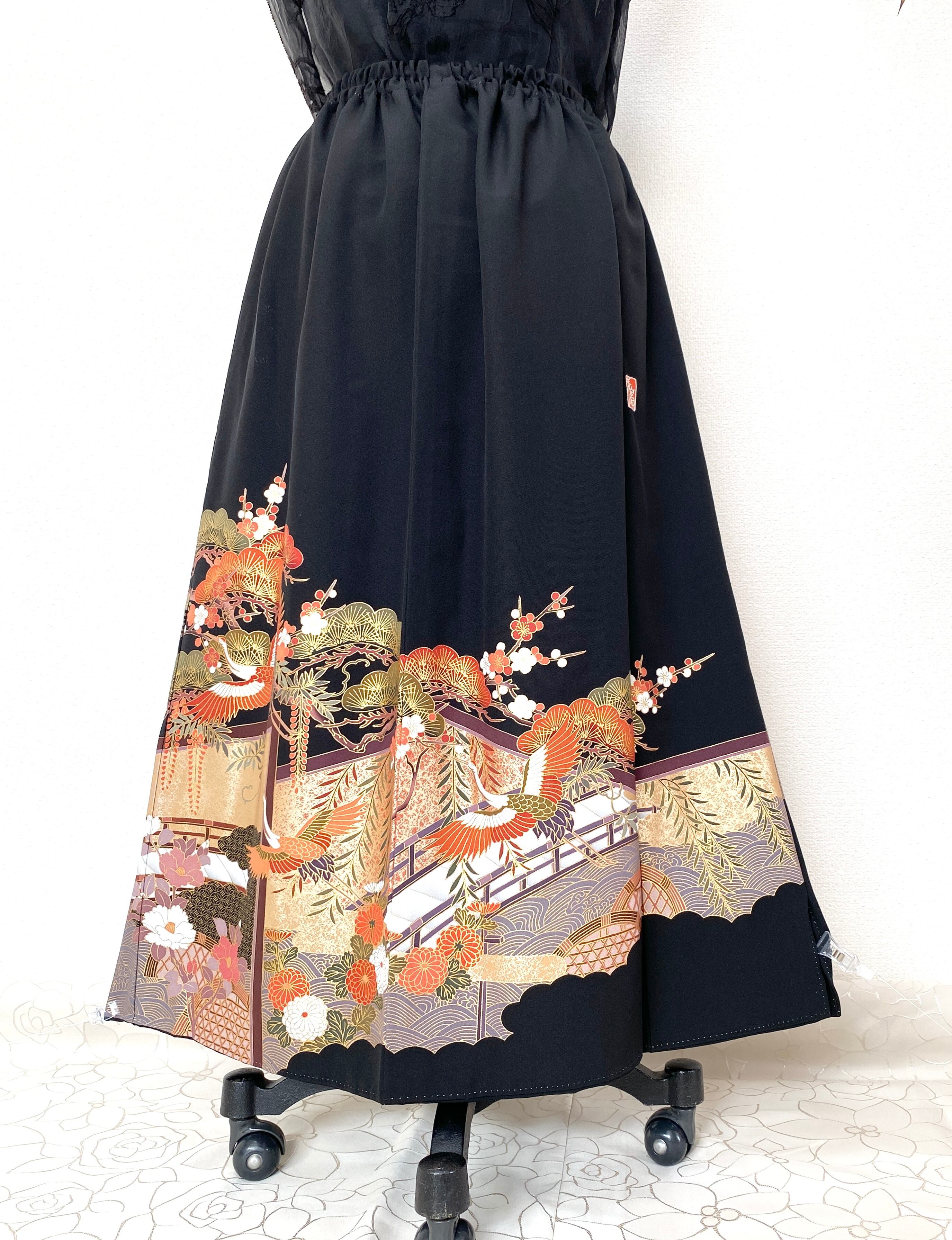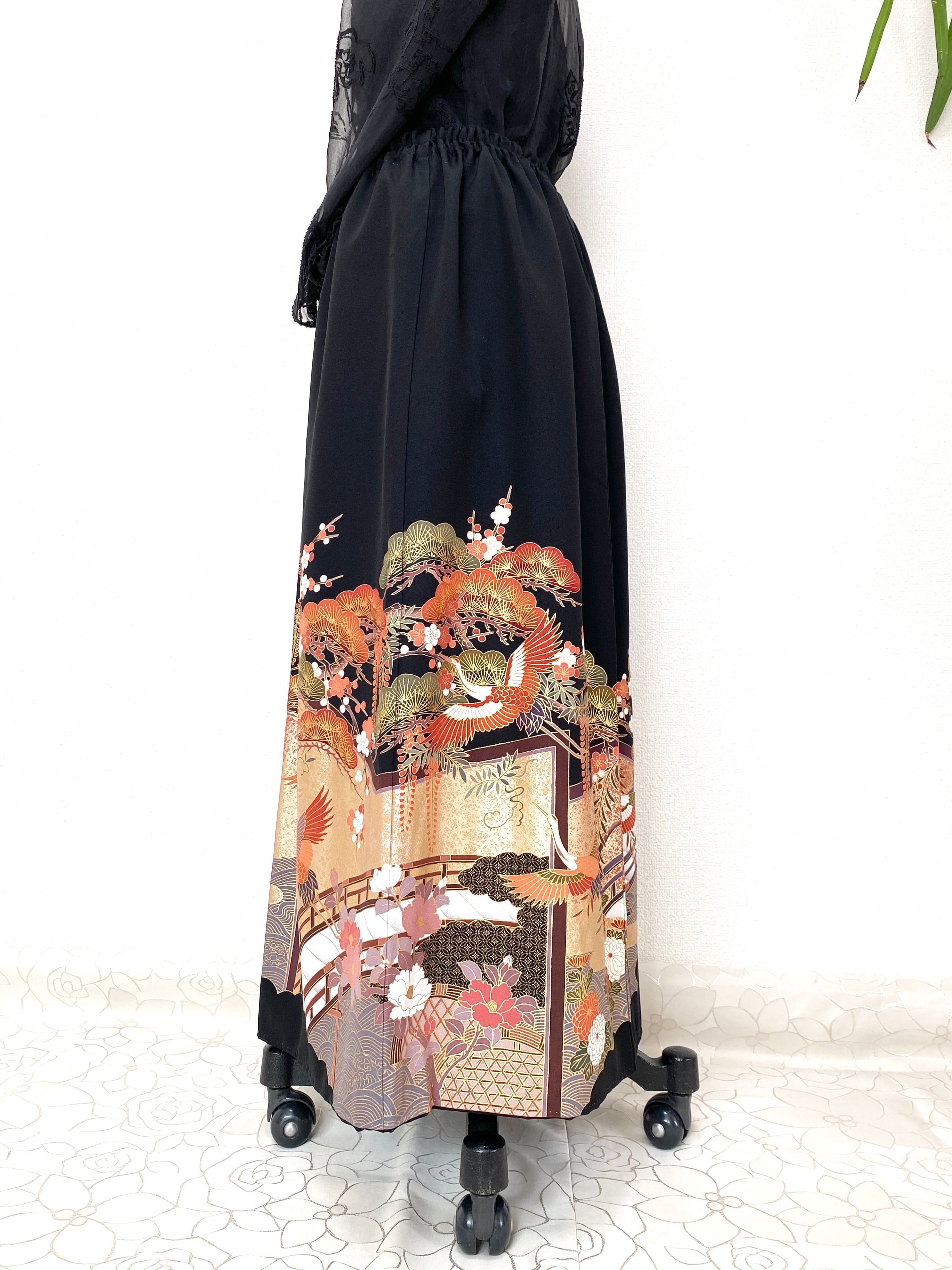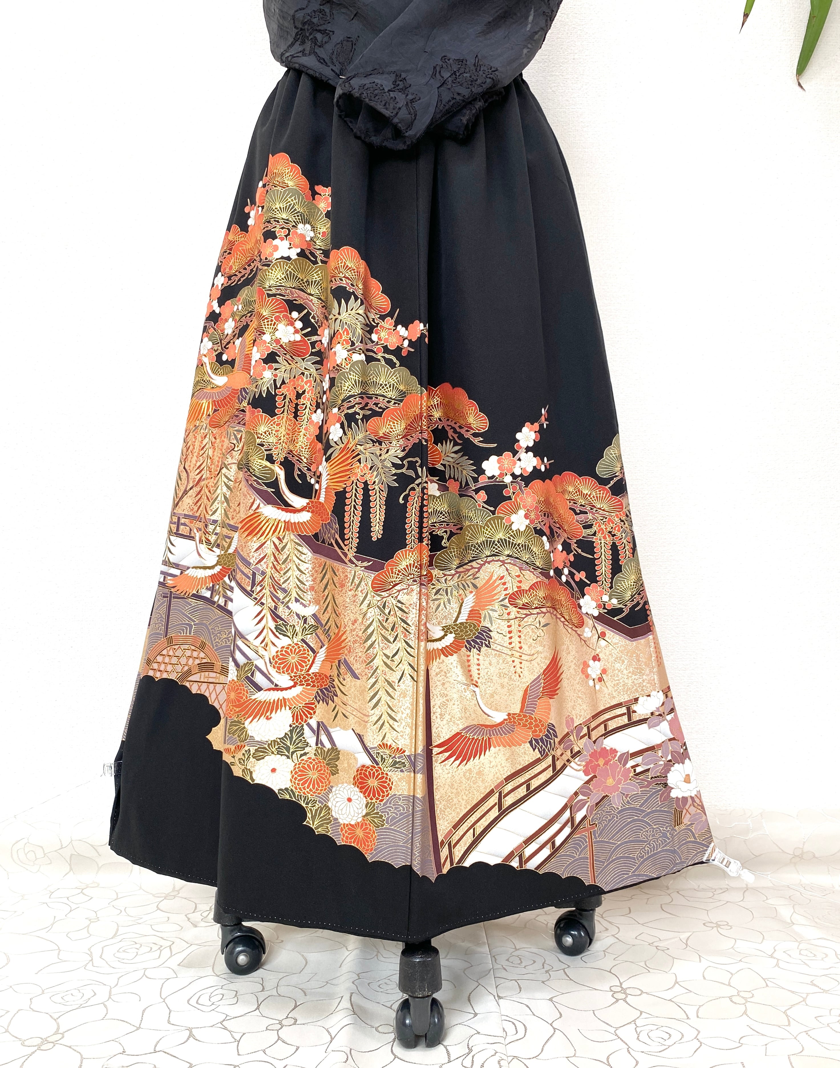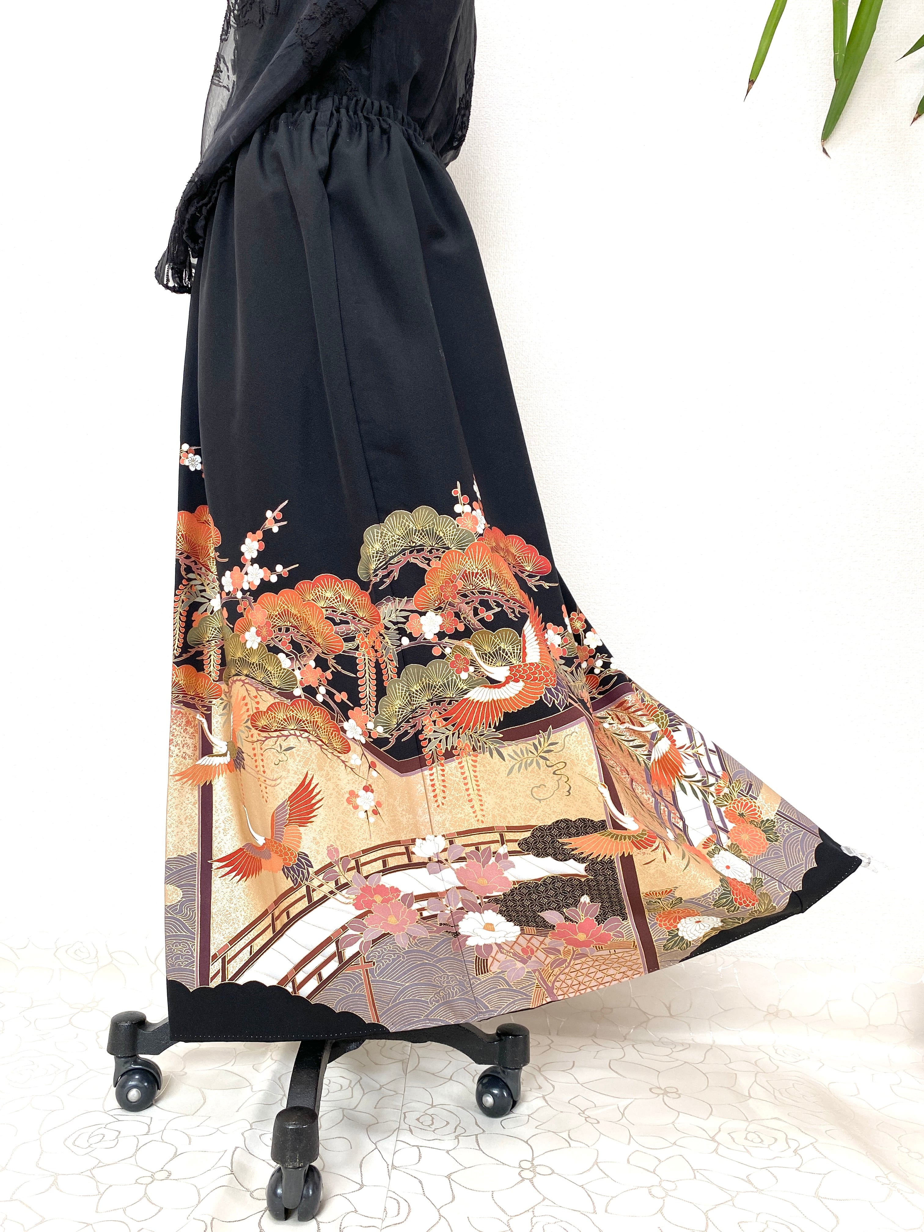 大人可愛いセレブ着物スカートフリーサイズ黒留袖着物リメイクウエストゴムロングスカート送料込みハンドメイドNO.6216