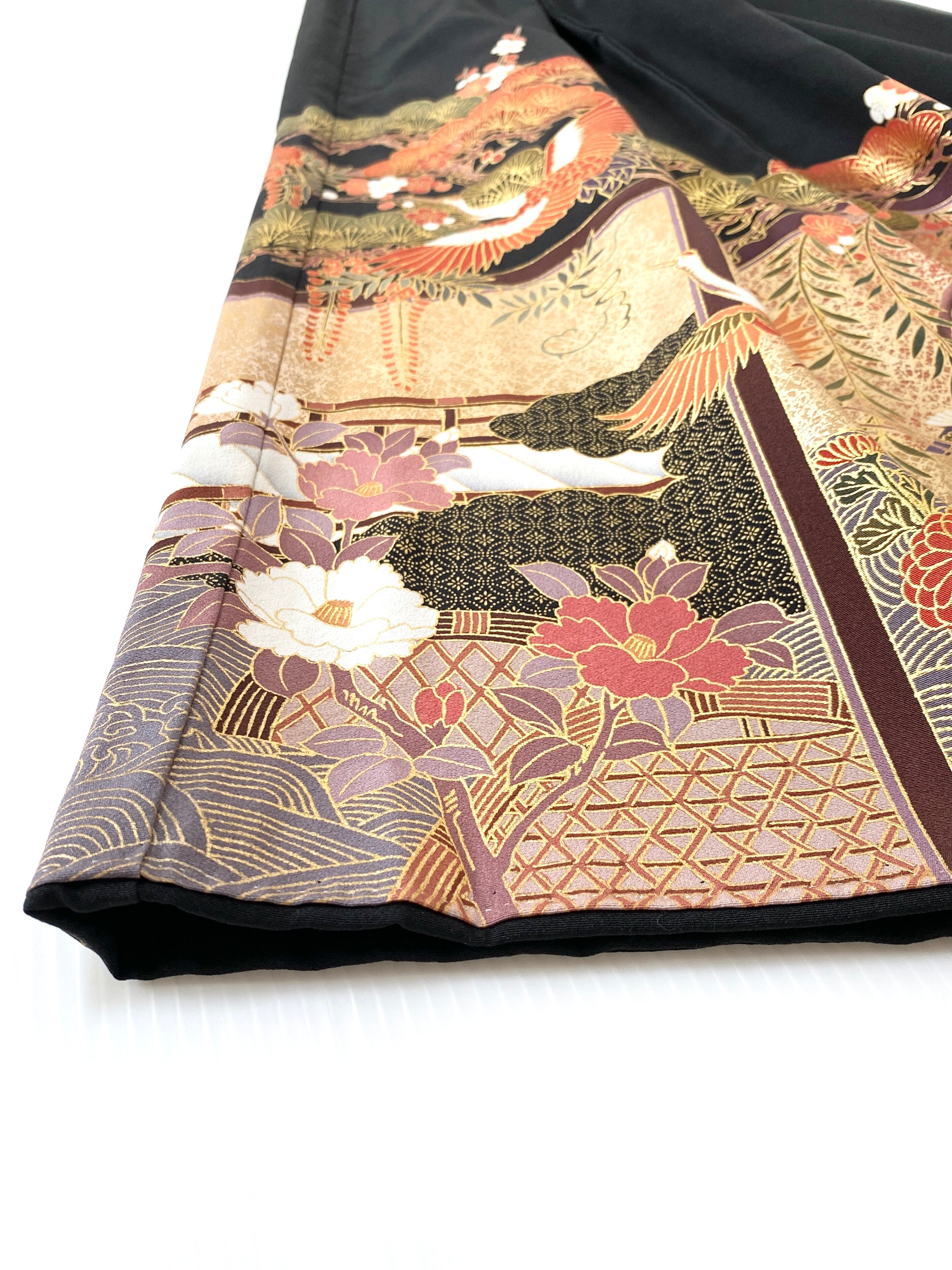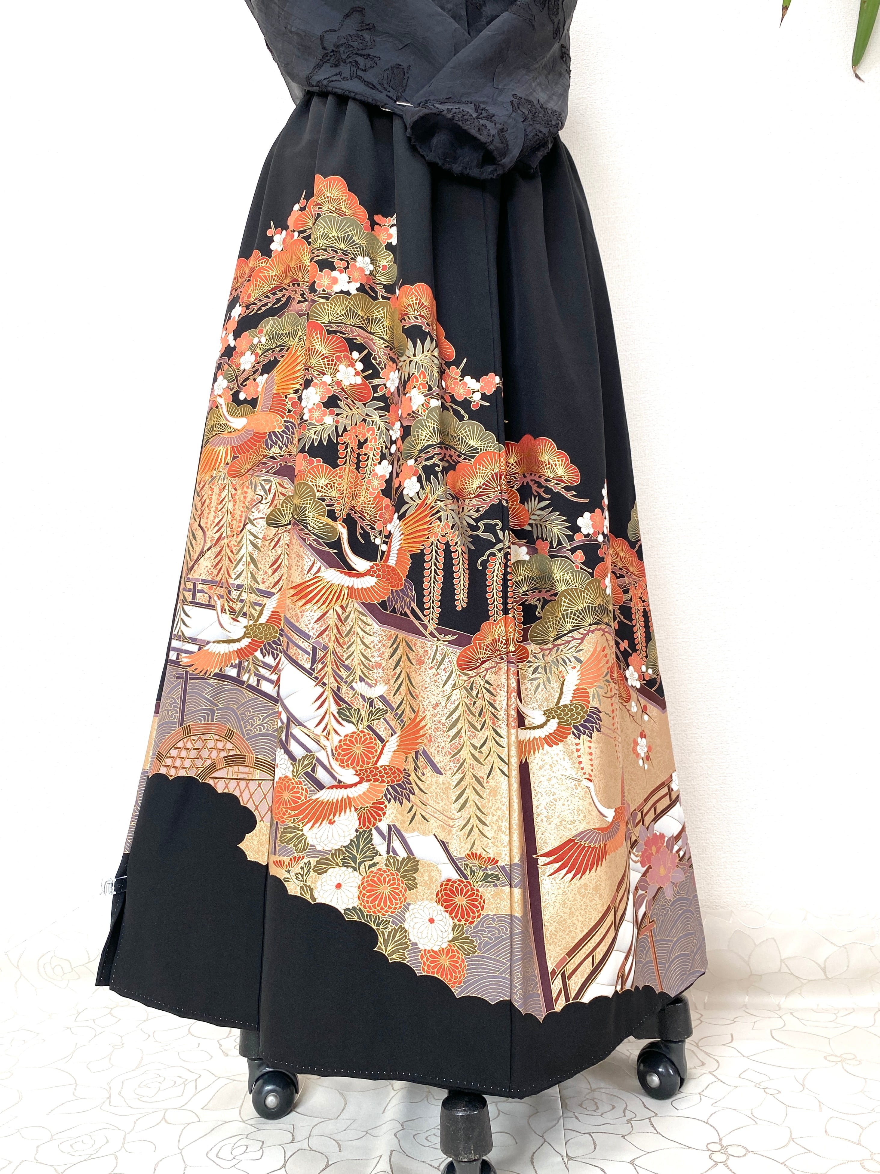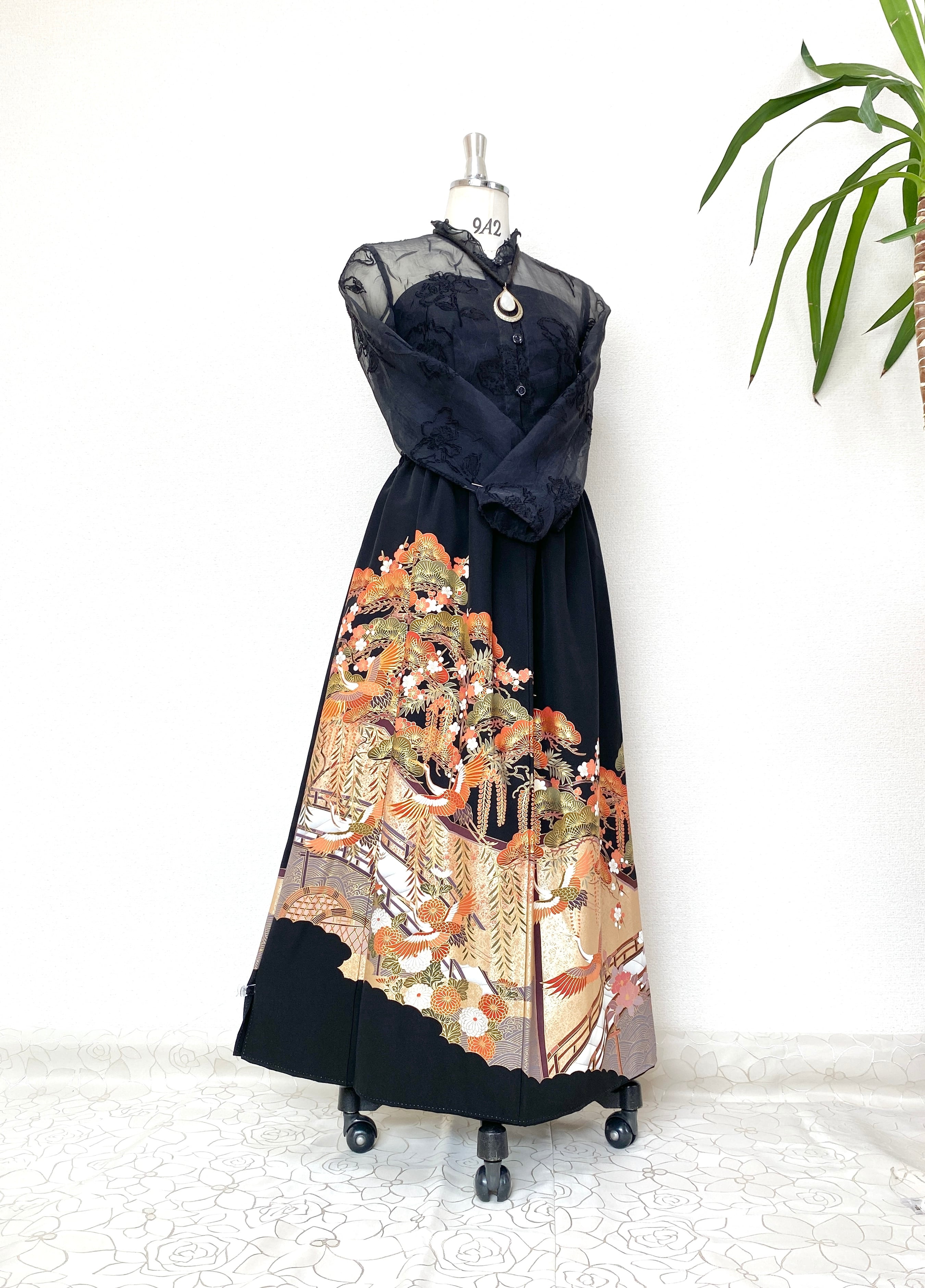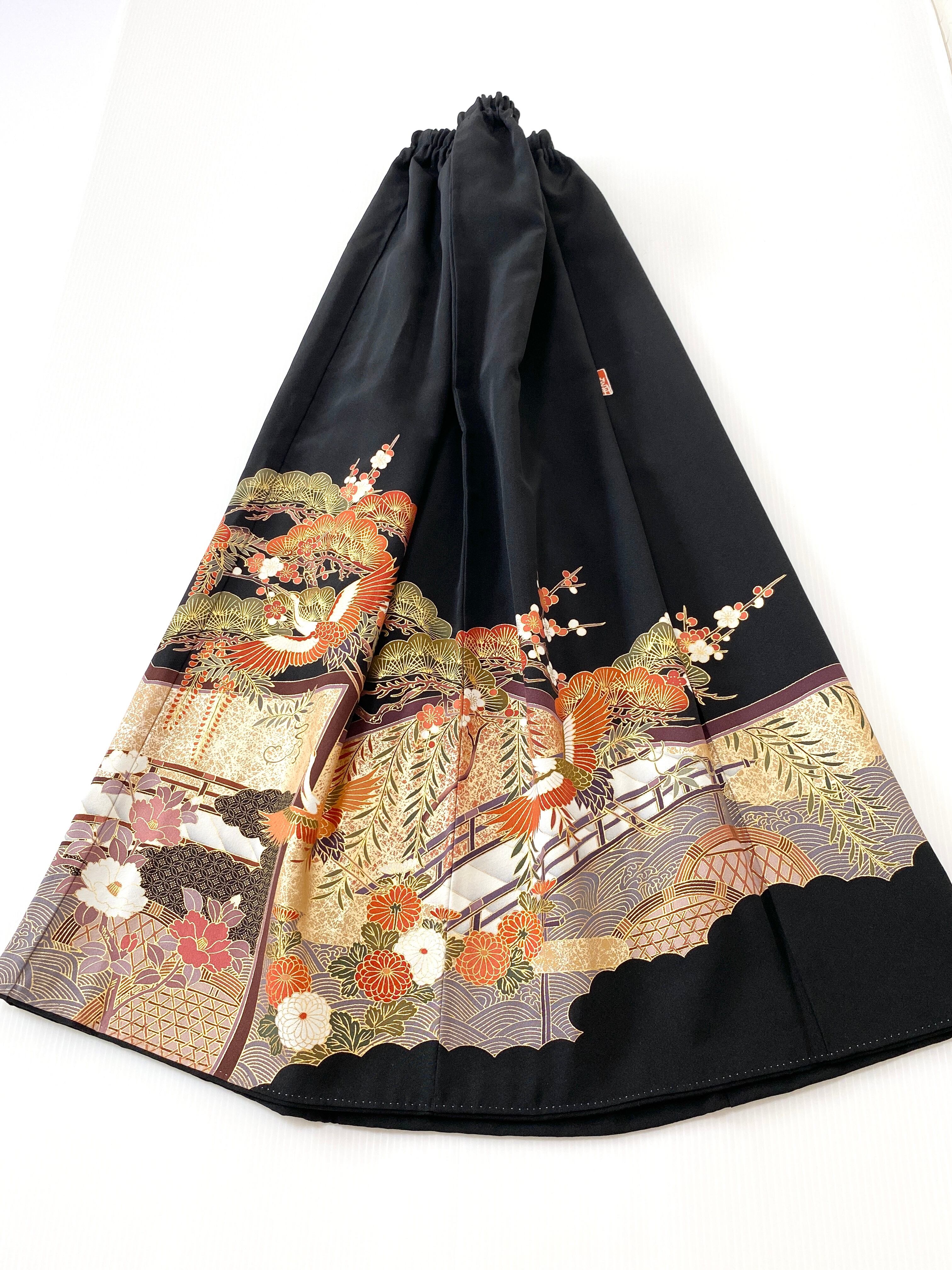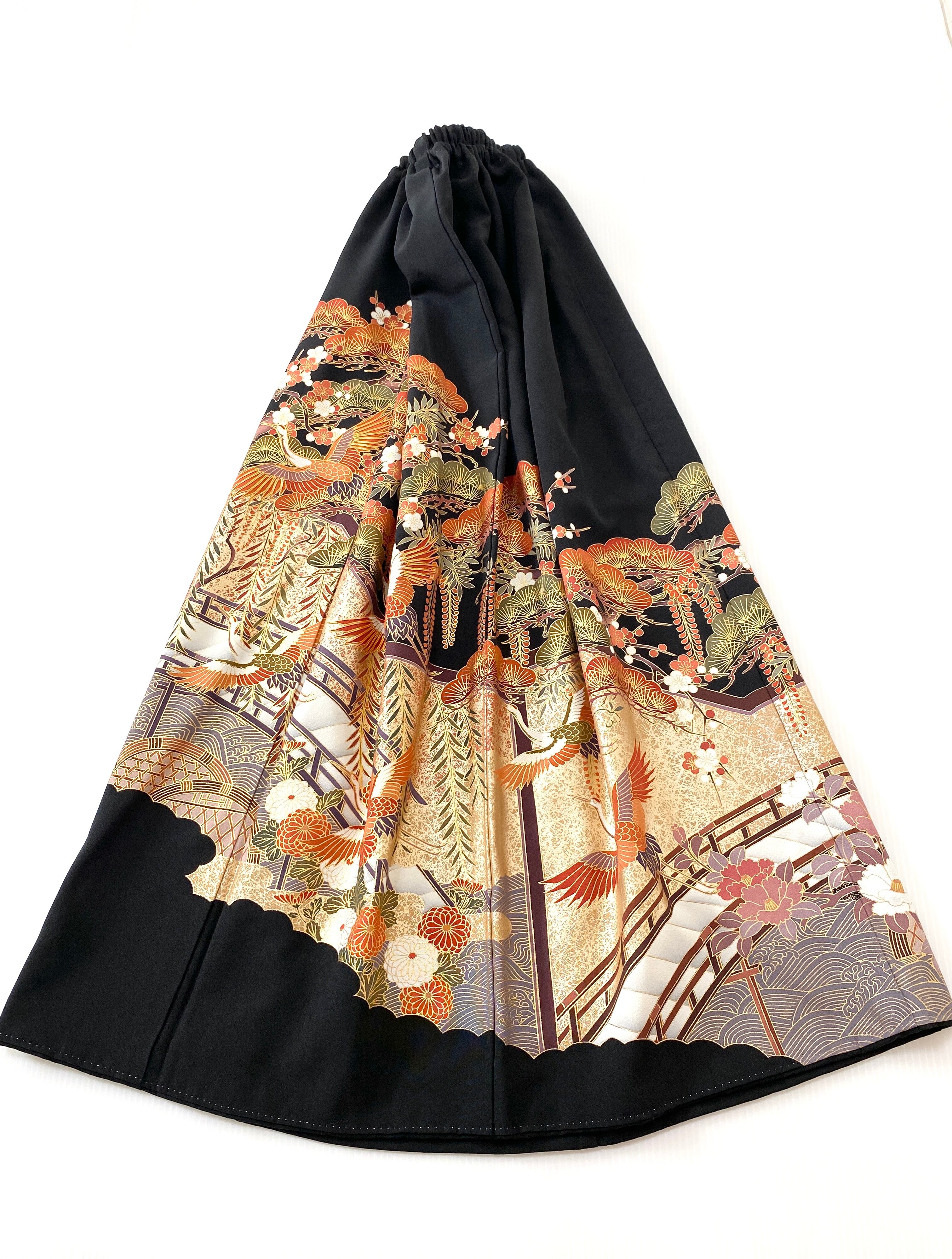 大人可愛いセレブ着物スカートフリーサイズ黒留袖着物リメイクウエストゴムロングスカート送料込みハンドメイドNO.6216
