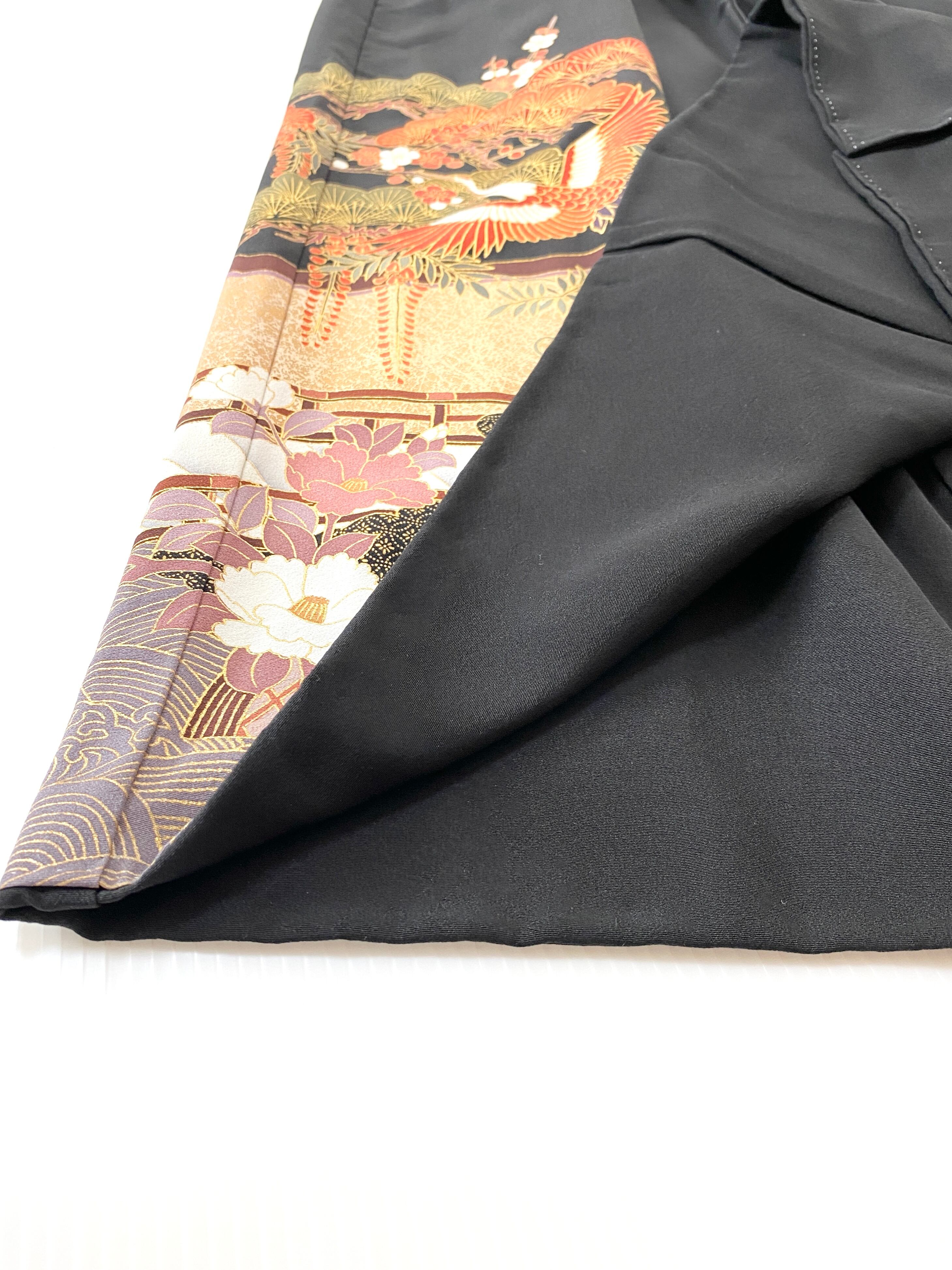 上衣の組み合わせ例として、ジャケット、ブラウス、カーディガン、カットソー、チュニック、ニット、セーター、ボレロなど、黒色上衣にこのスカートを合わせるだけで上がる気分にさせてくれる着物コーディネートスカート