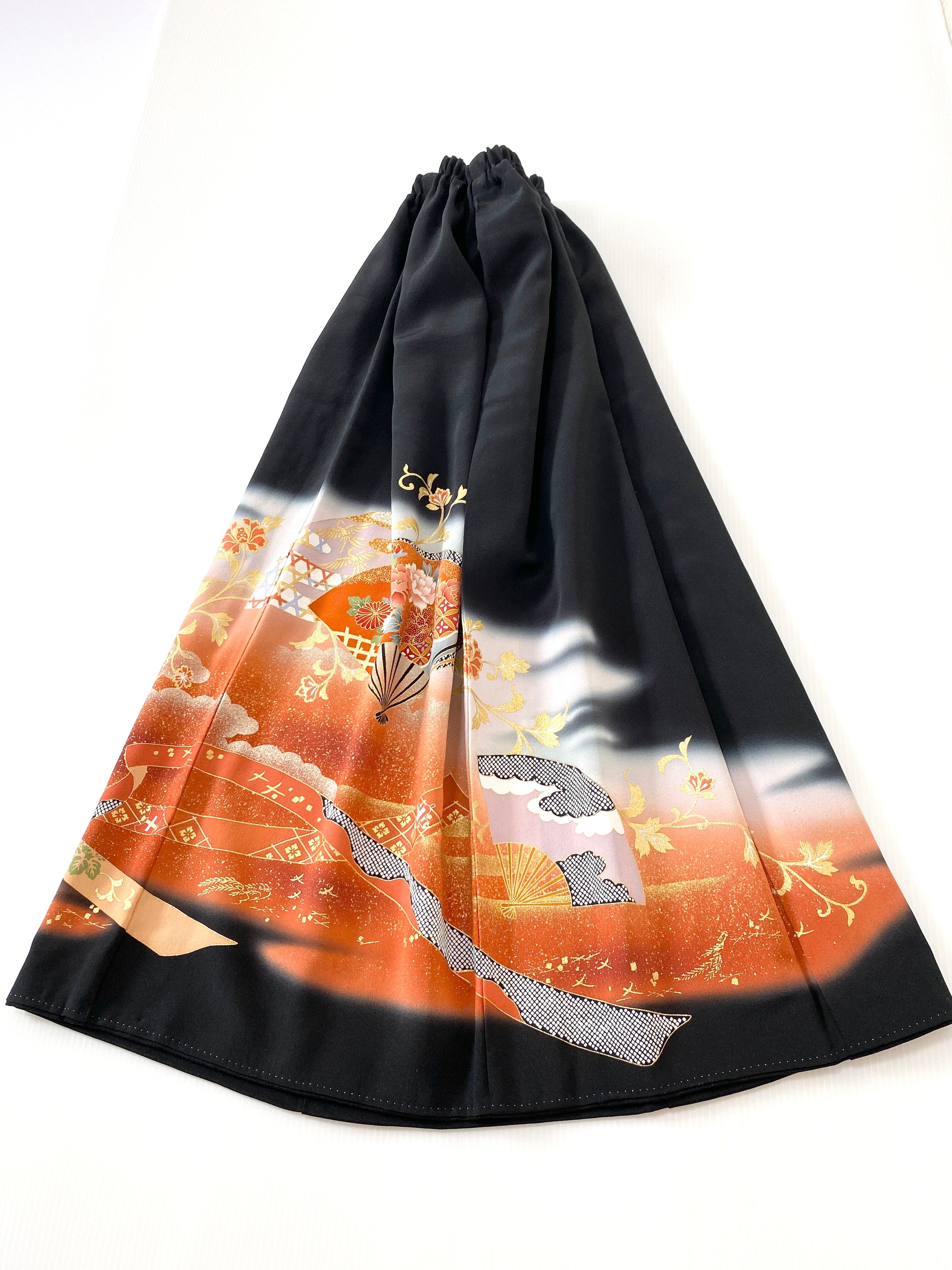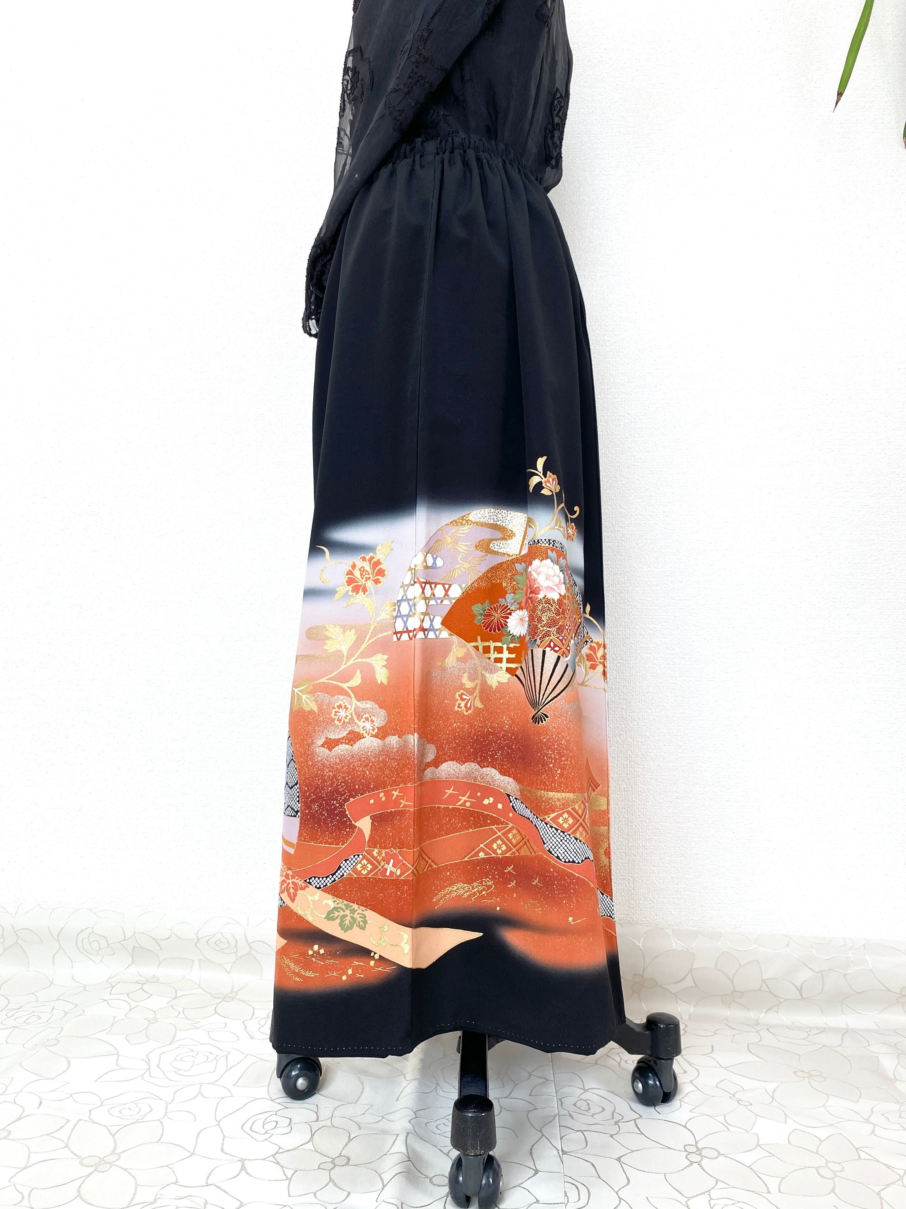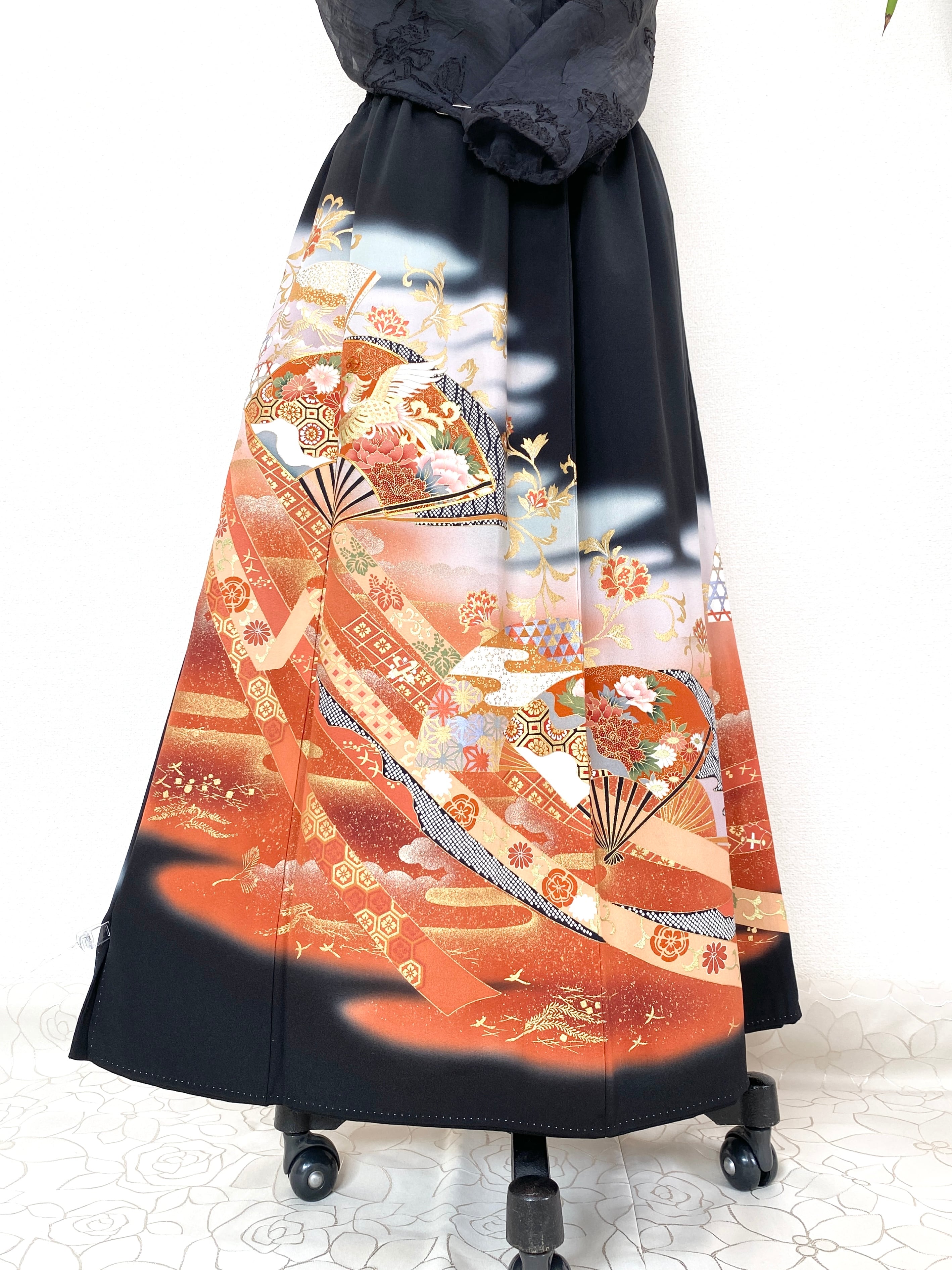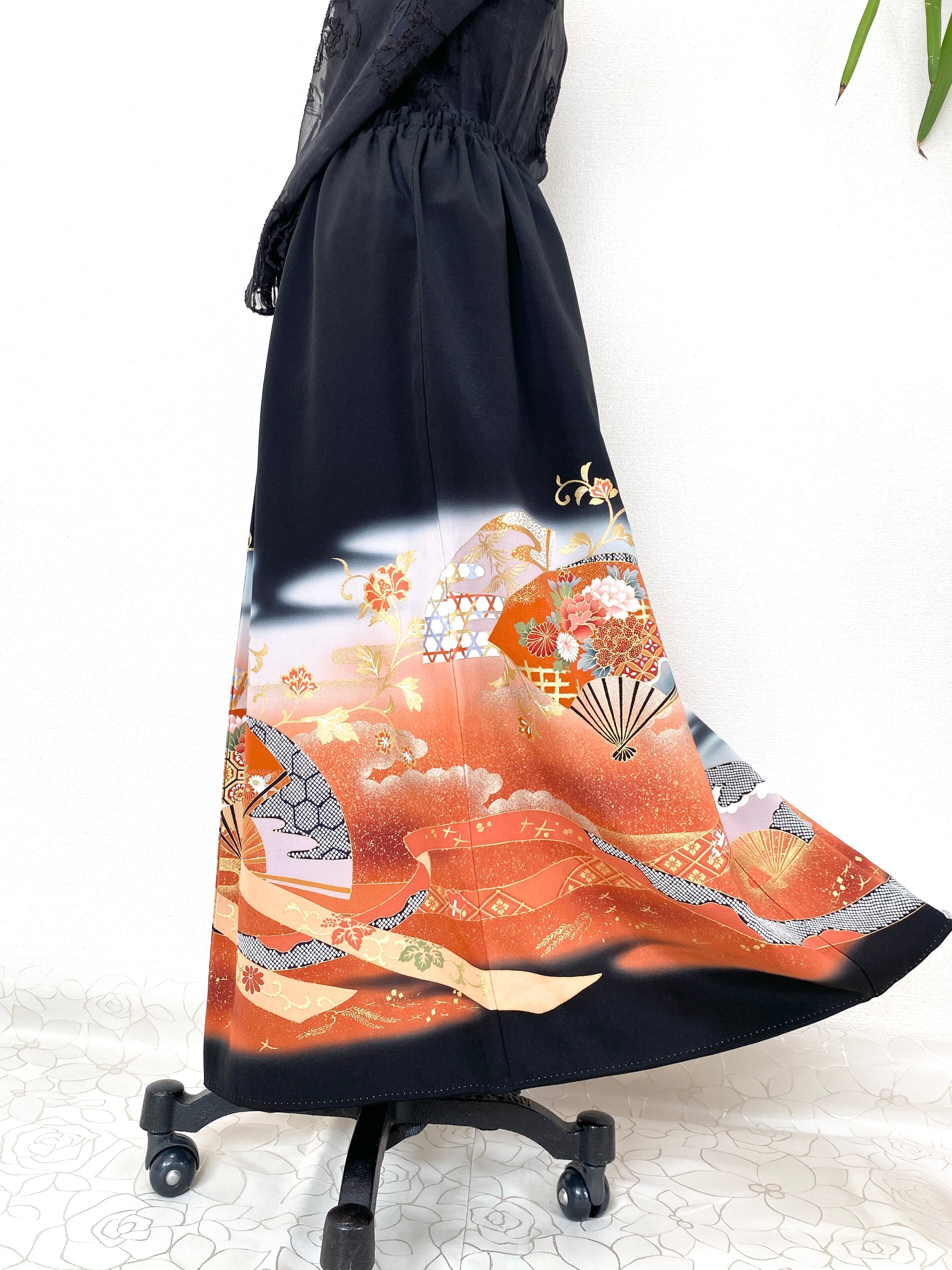 大人可愛いセレブ着物スカートフリーサイズ黒留袖着物リメイクウエストゴムロングスカート送料込みハンドメイドNO.6222