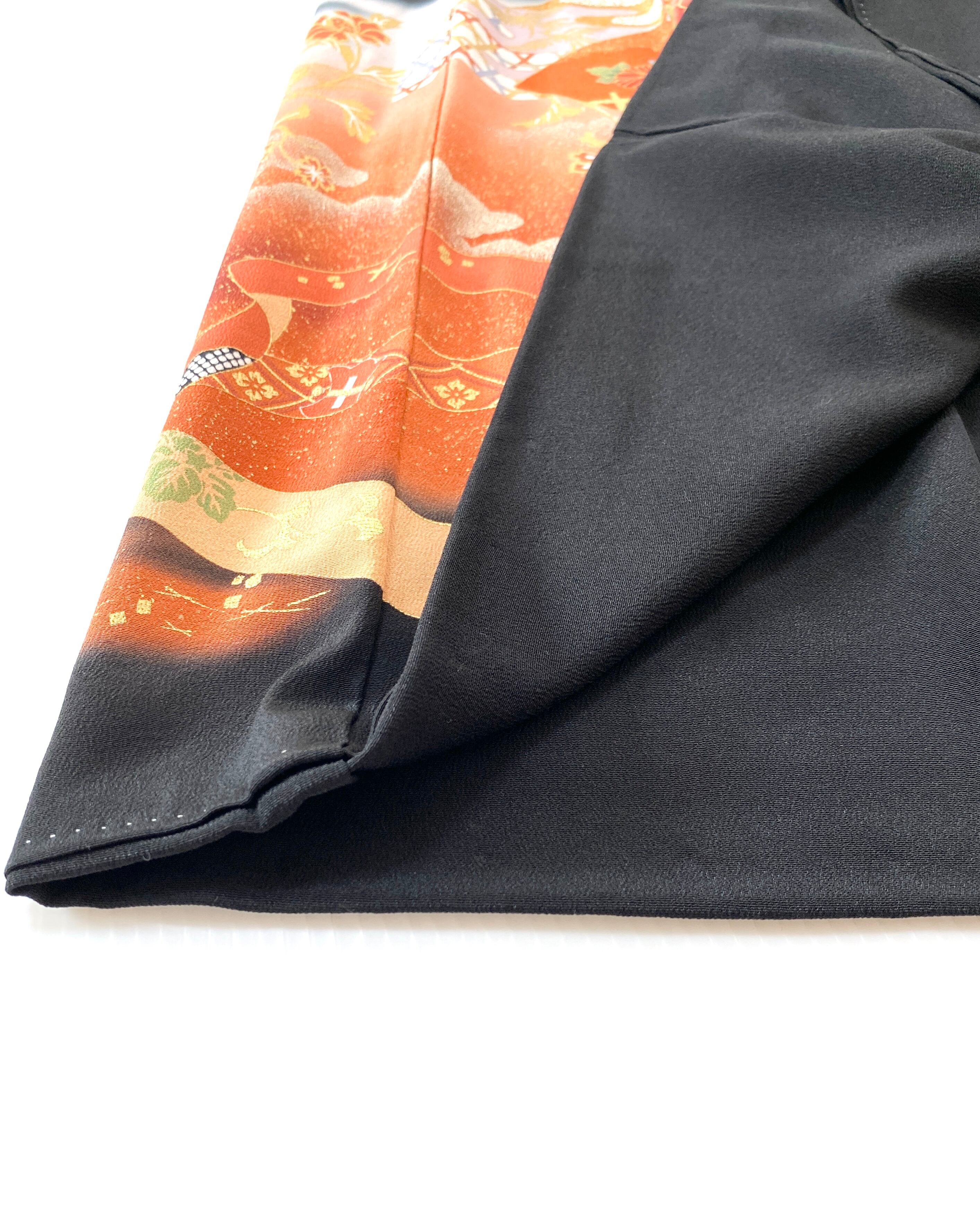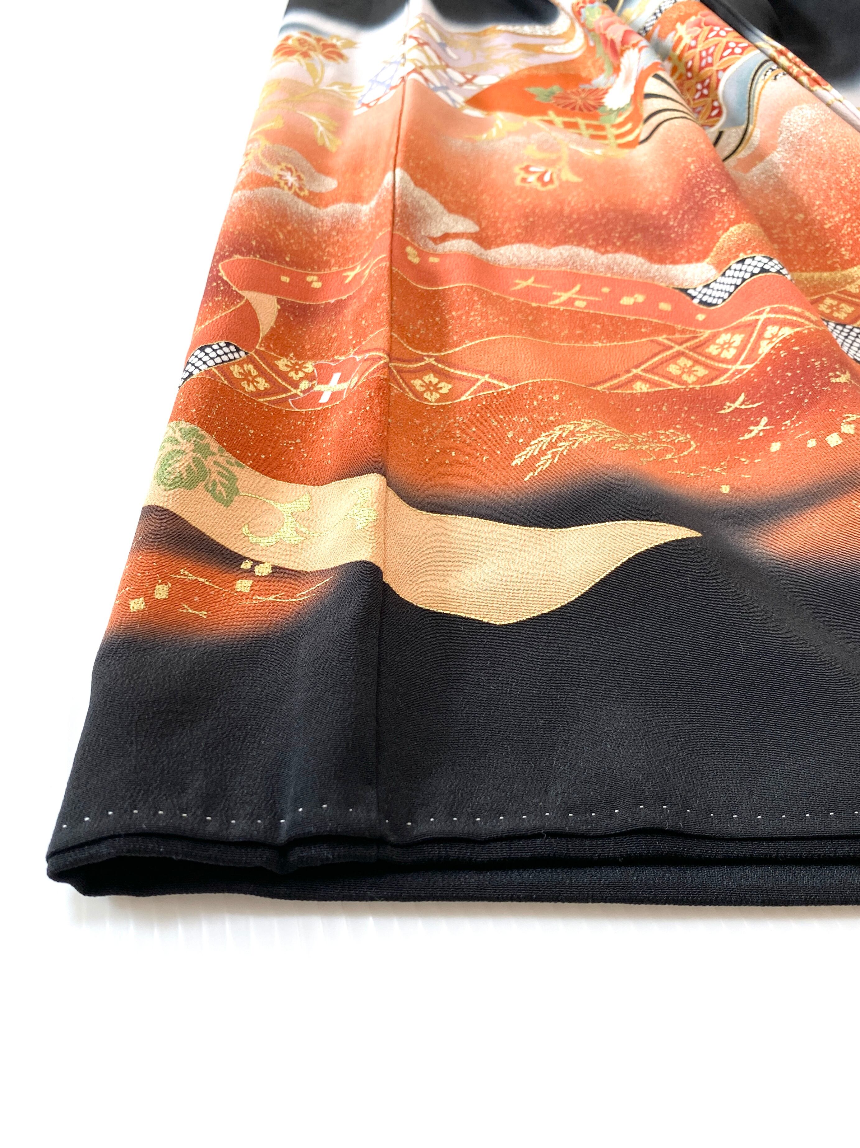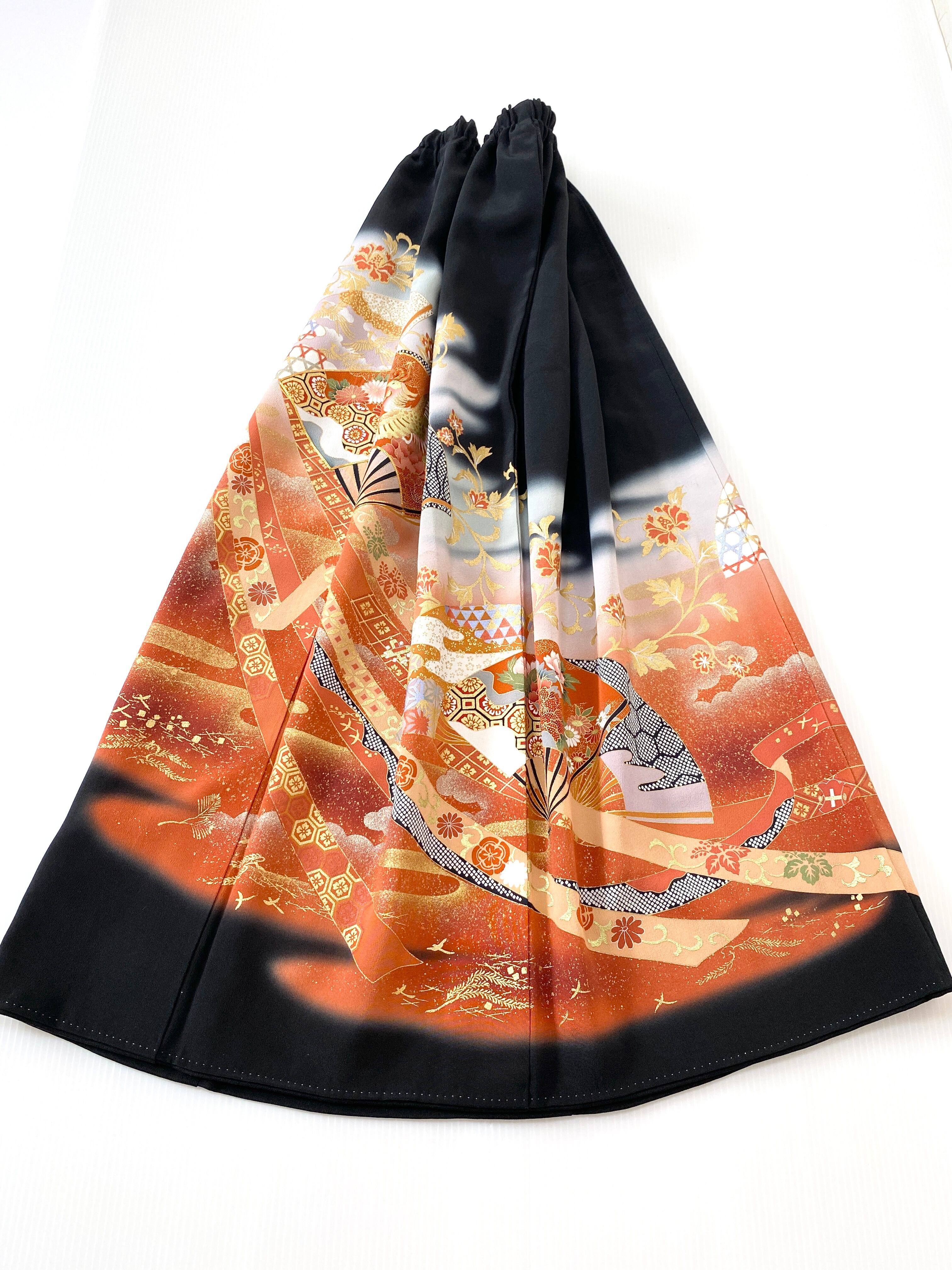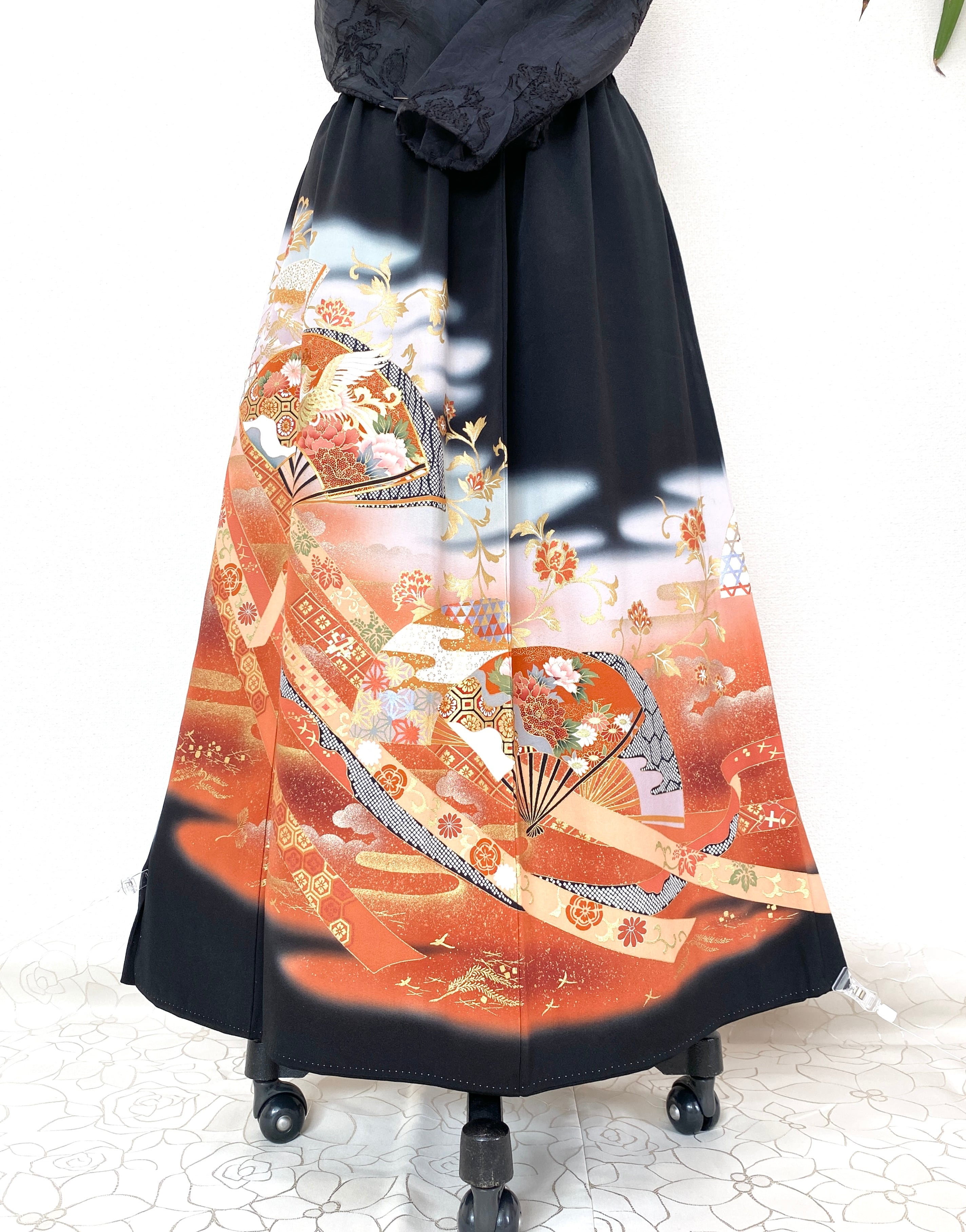 大人可愛いセレブ着物スカートフリーサイズ黒留袖着物リメイクウエストゴムロングスカート送料込みハンドメイドNO.6222