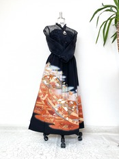 上衣の組み合わせ例として、ジャケット、ブラウス、カーディガン、カットソー、チュニック、ニット、セーター、ボレロなど、黒色上衣にこのスカートを合わせるだけで上がる気分にさせてくれる着物コーディネートスカート