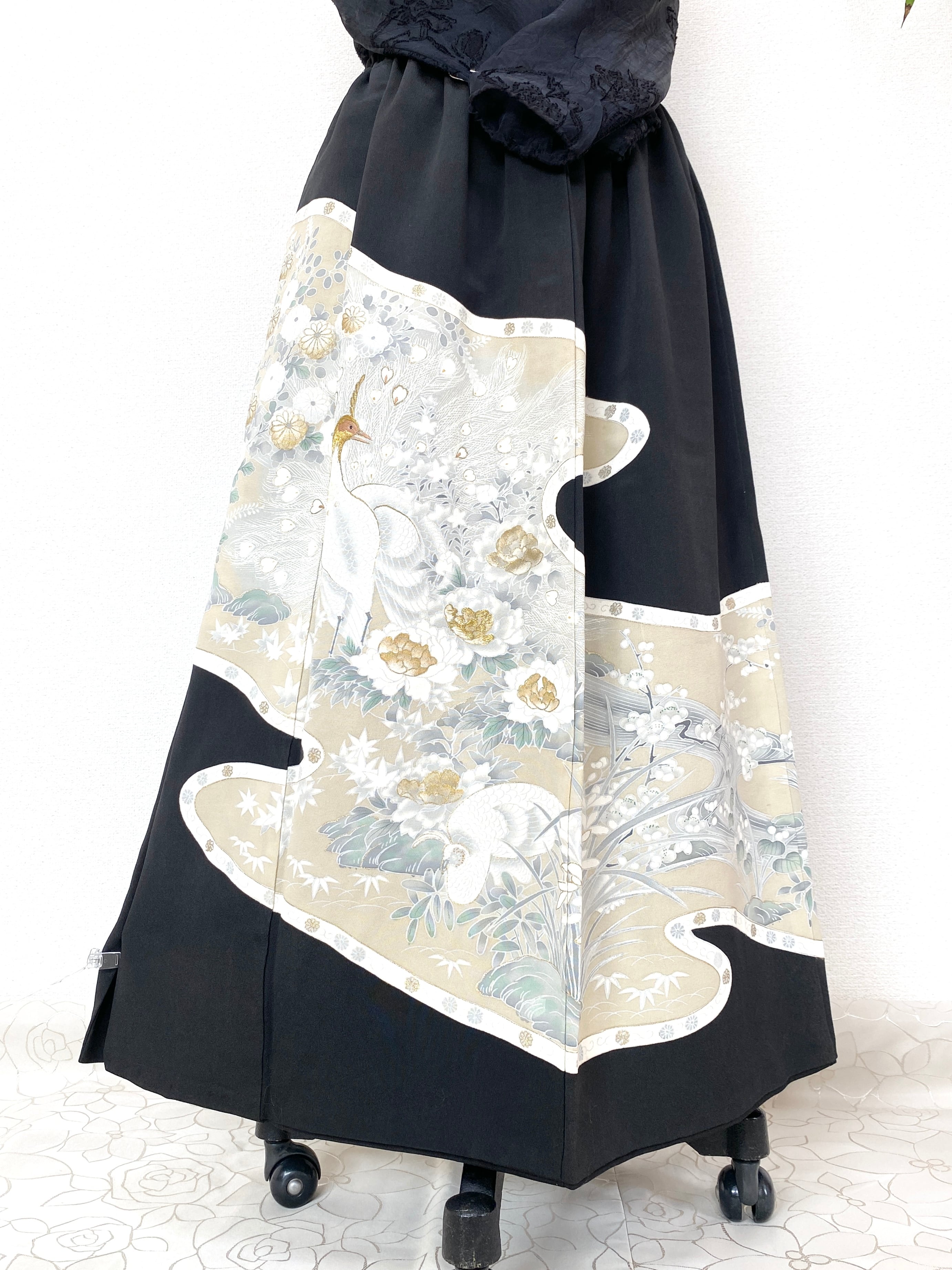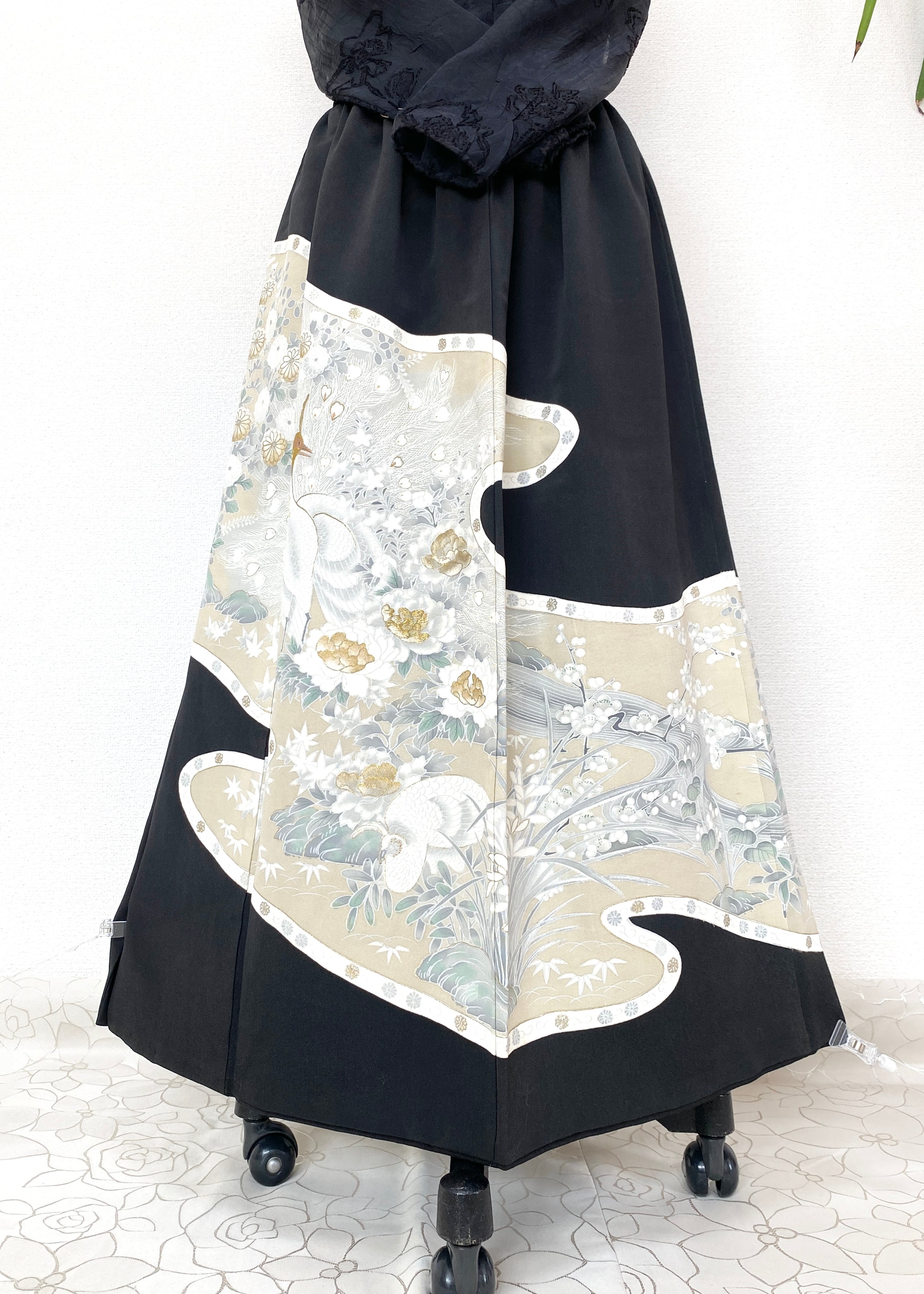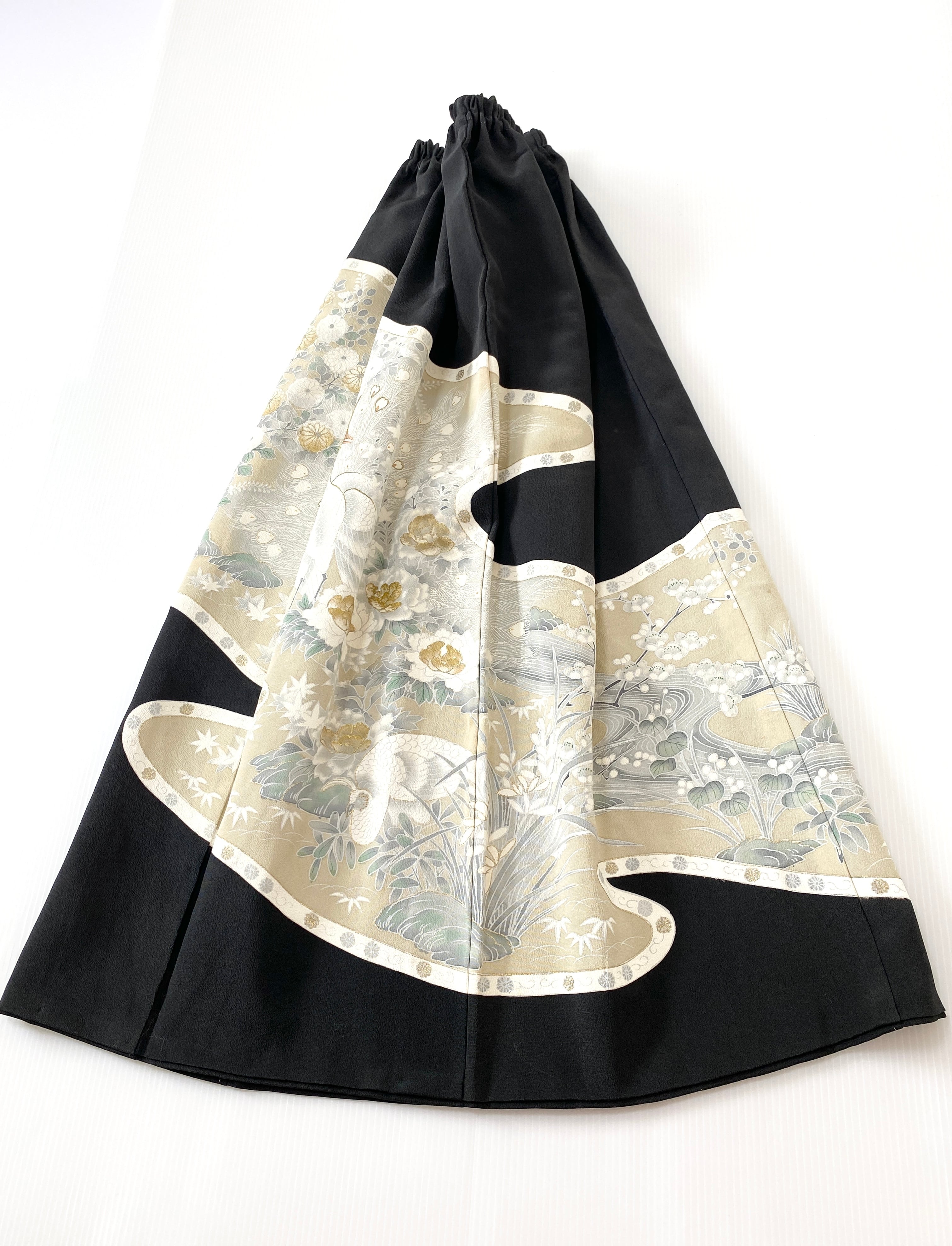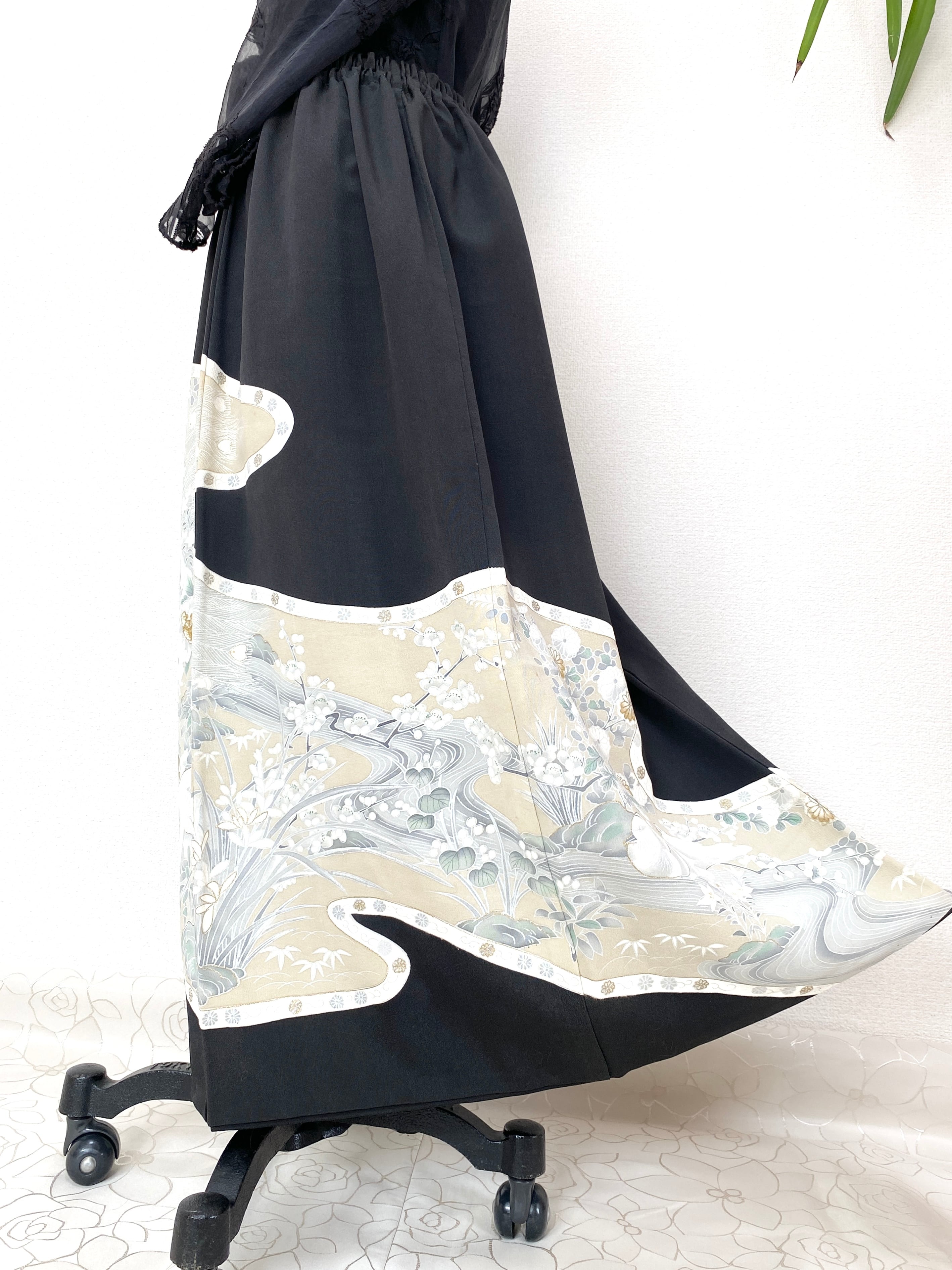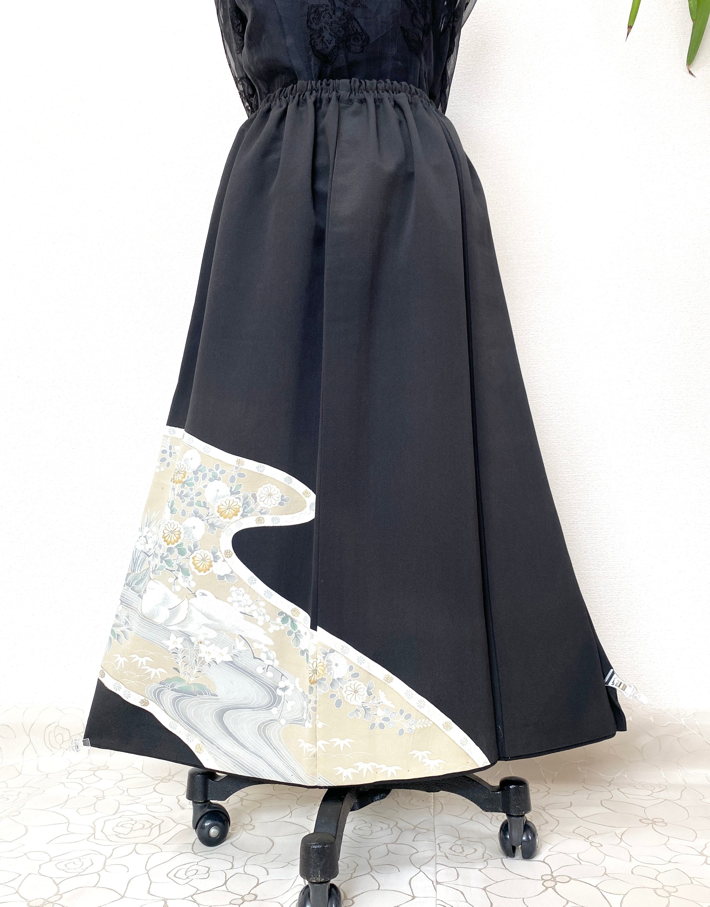 大人可愛いセレブ着物スカートフリーサイズ黒留袖着物リメイクウエストゴムロングスカート送料込みハンドメイドNO.6227