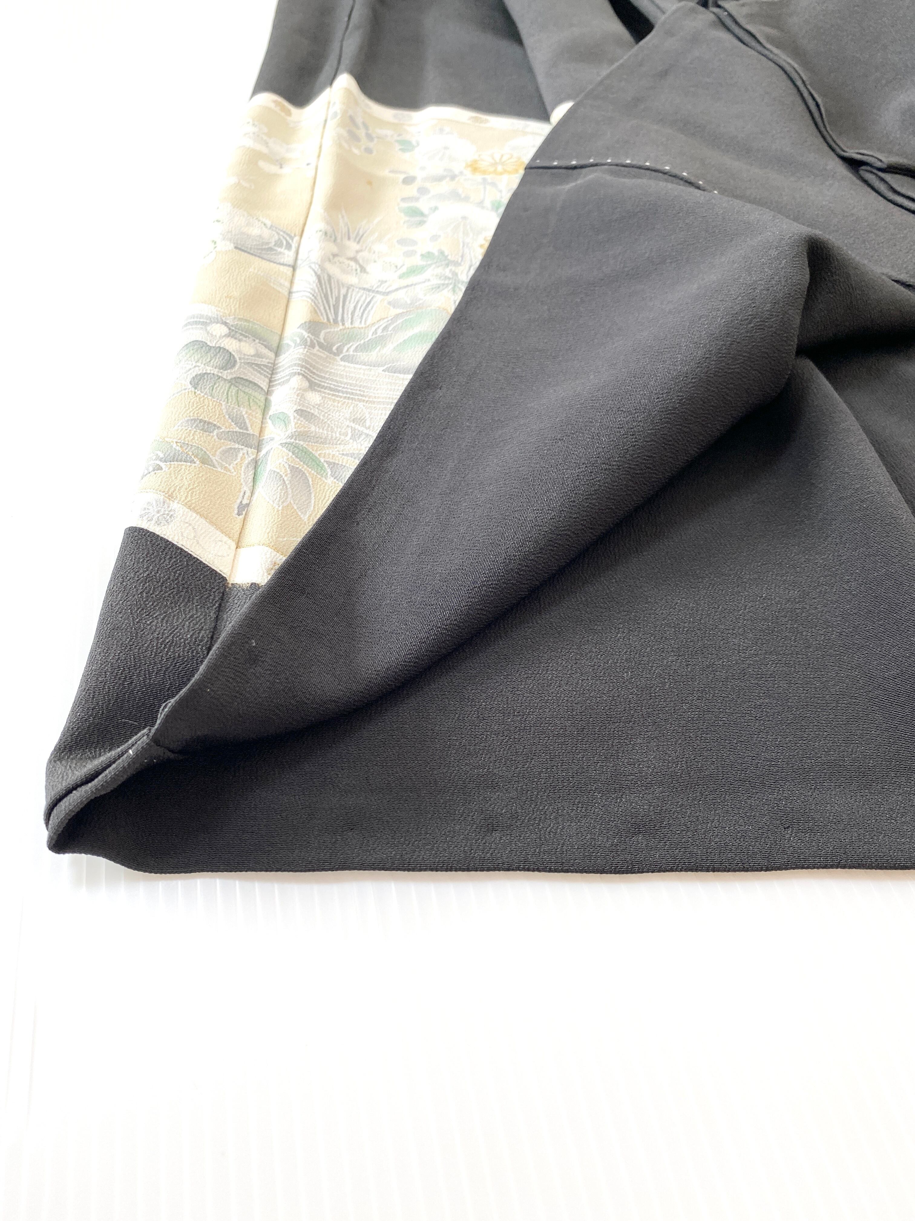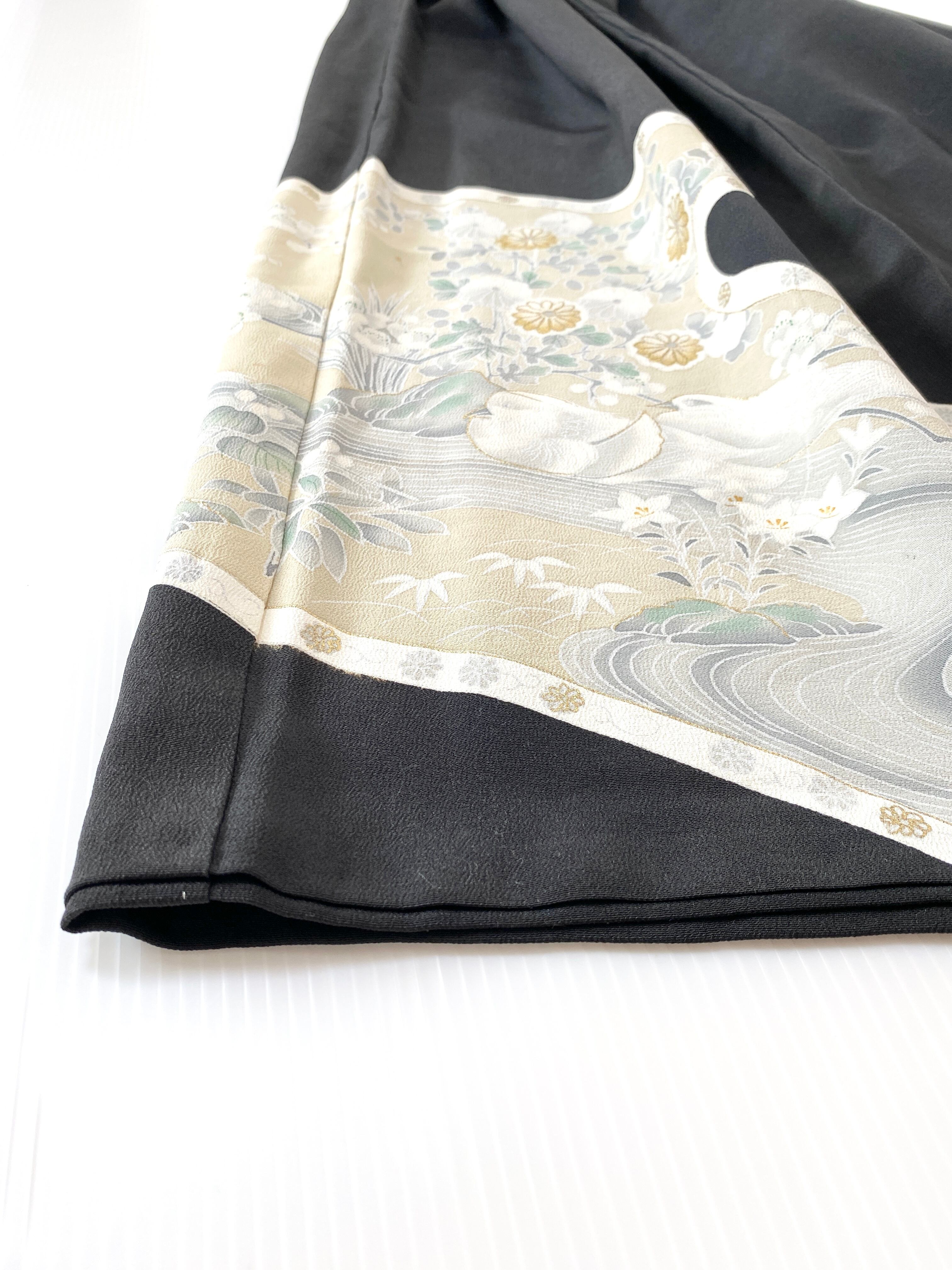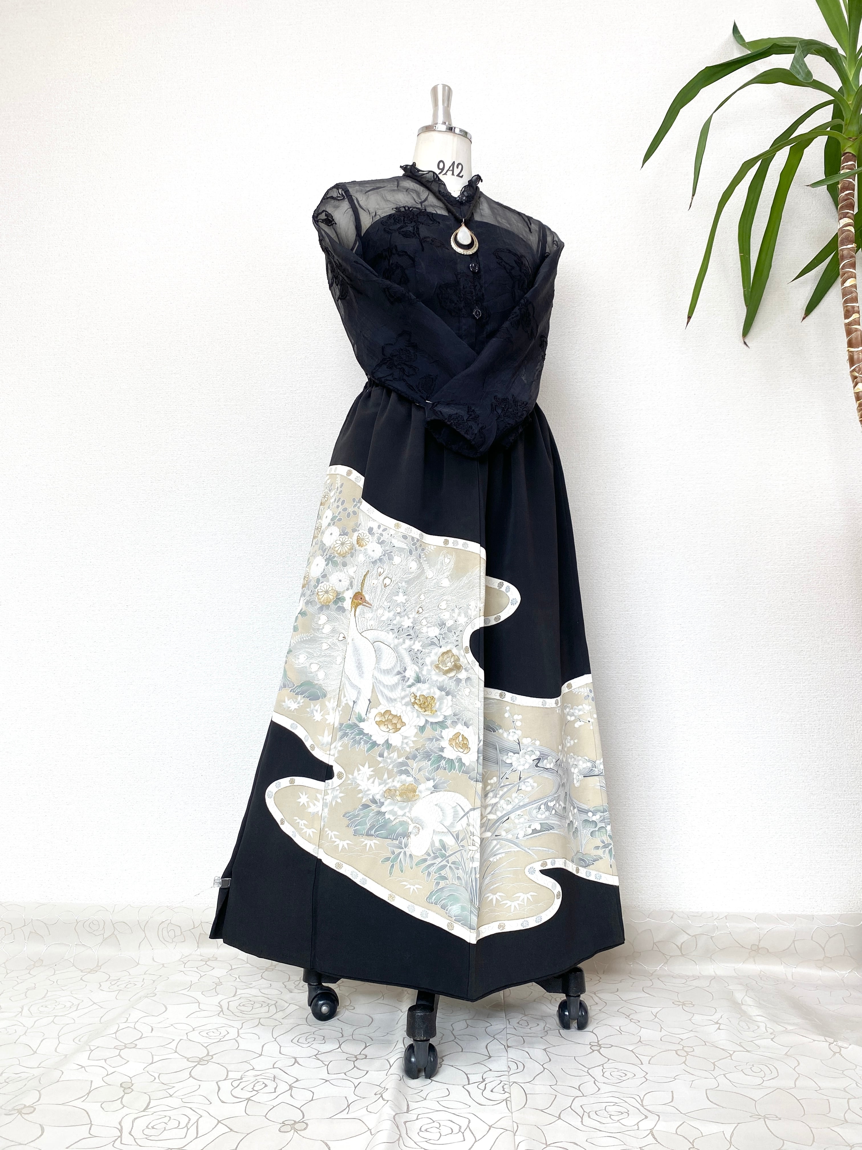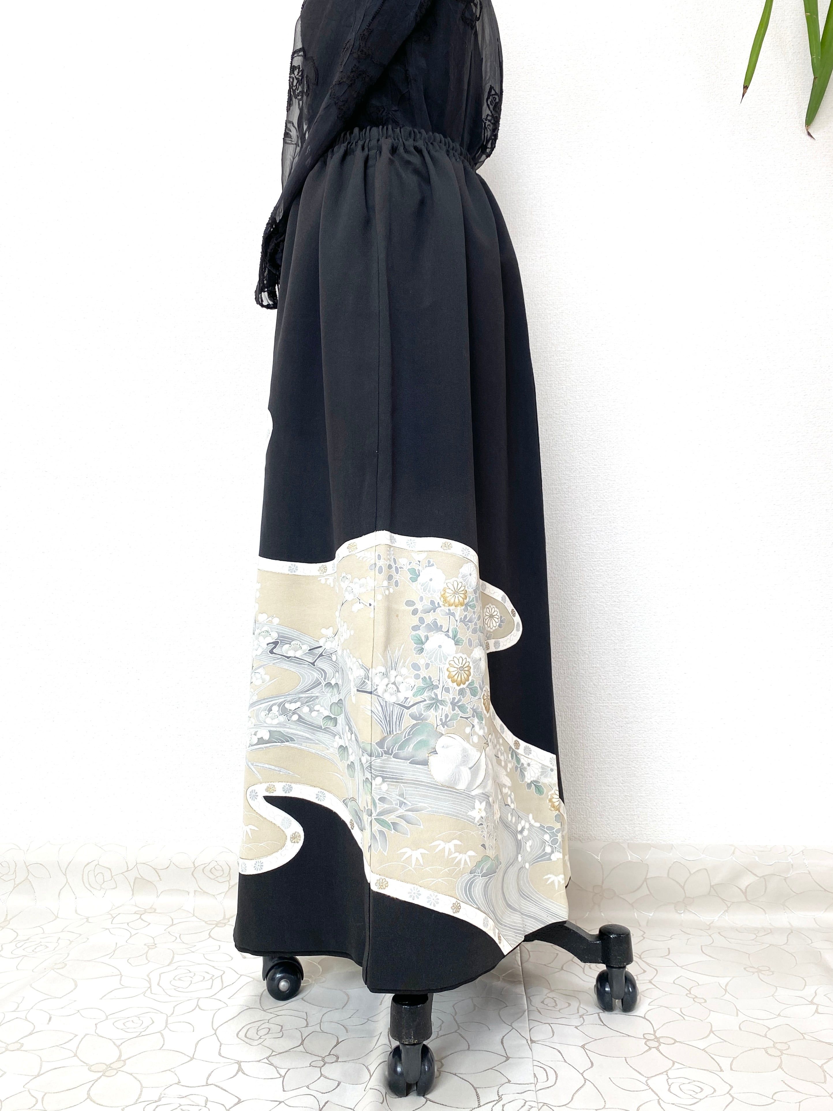 黒留袖着物をリメイクして作製したウエストゴムロングスカートフリーサイズです