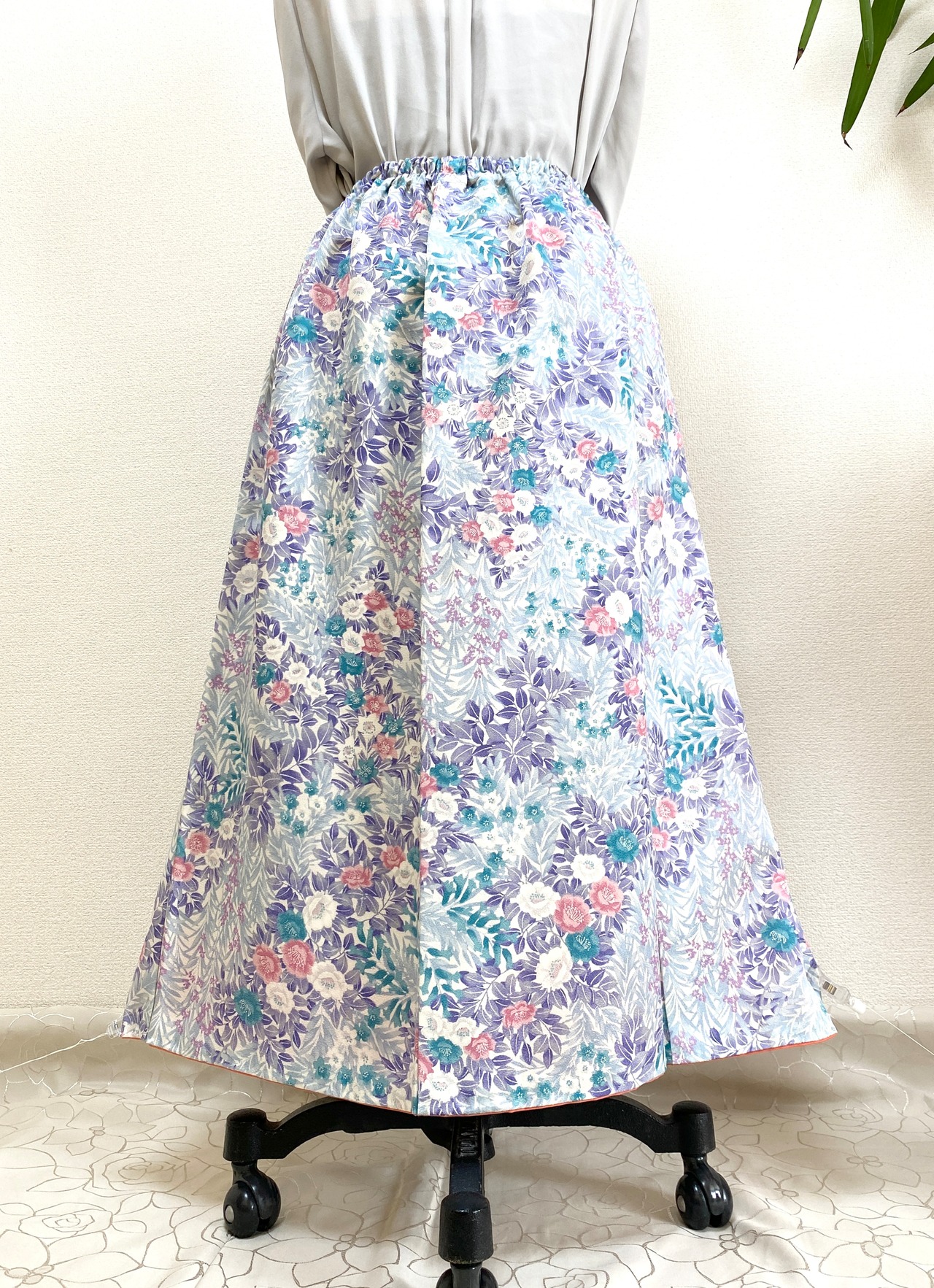 着物をリメイクして作製したウエストゴムロングスカートフリーサイズです