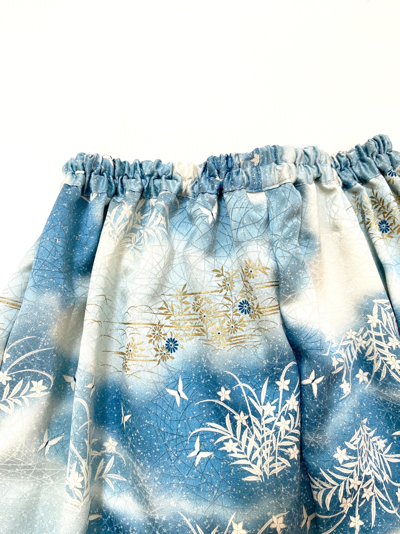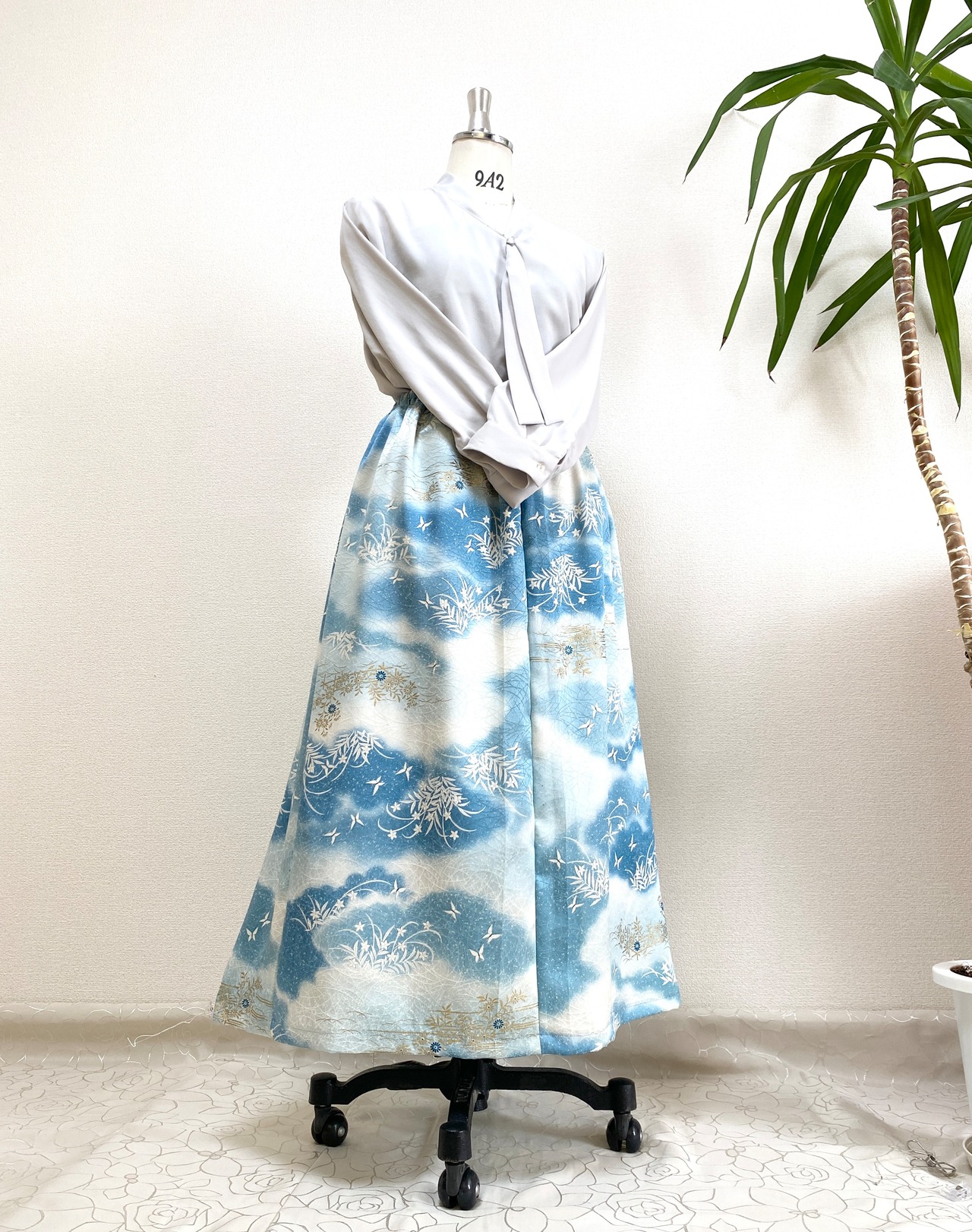 着物をリメイクして作製したウエストゴムロングスカートフリーサイズです