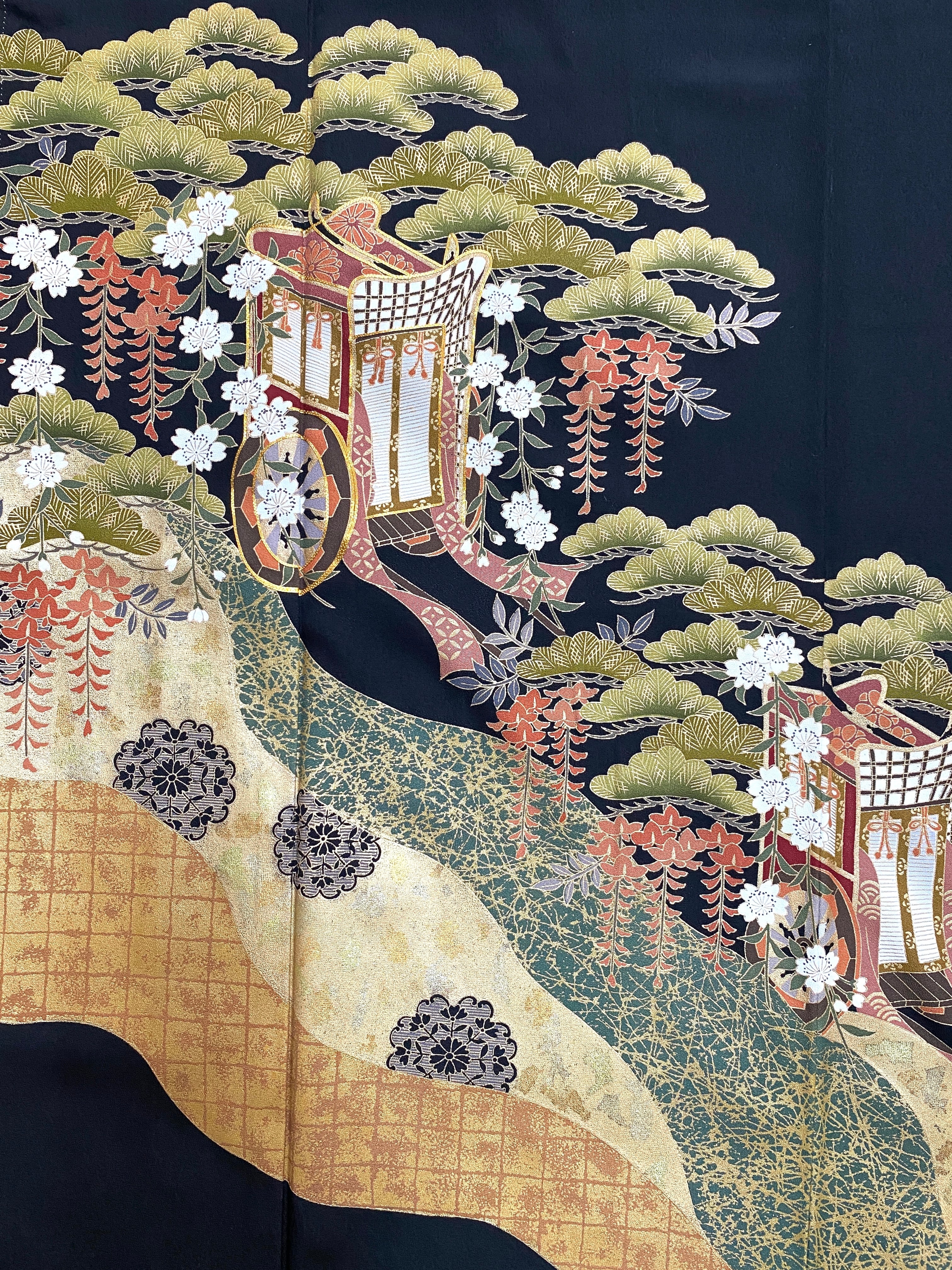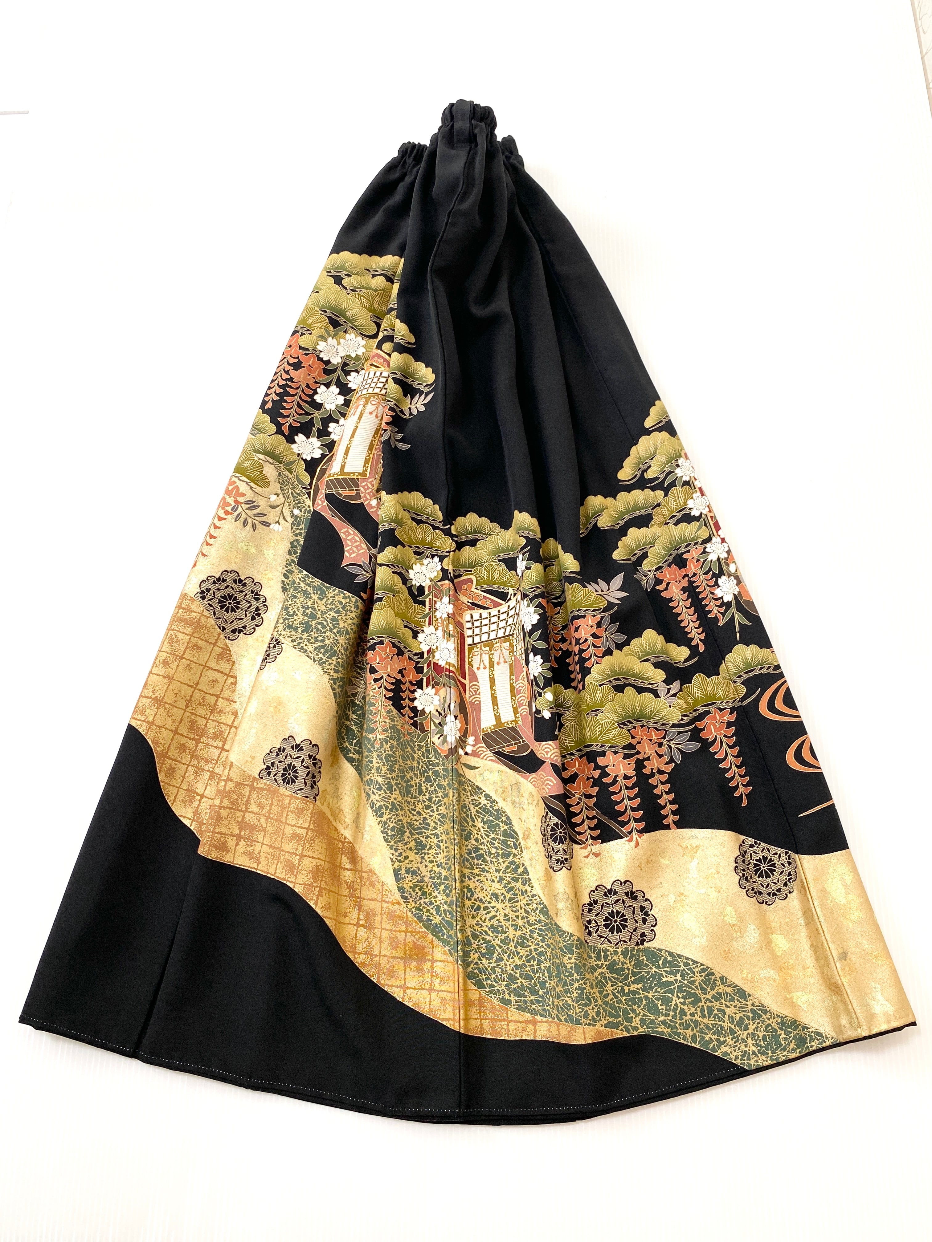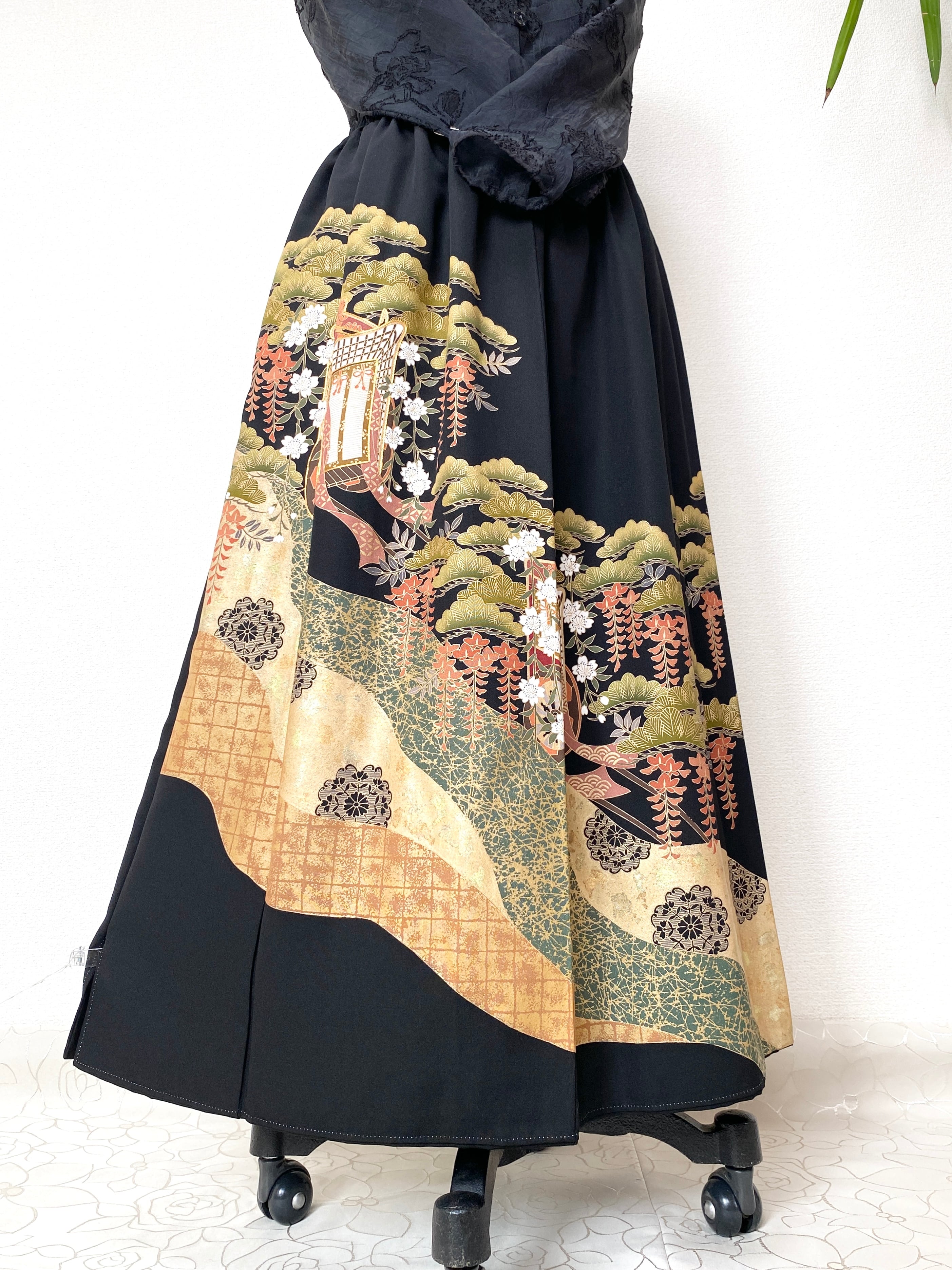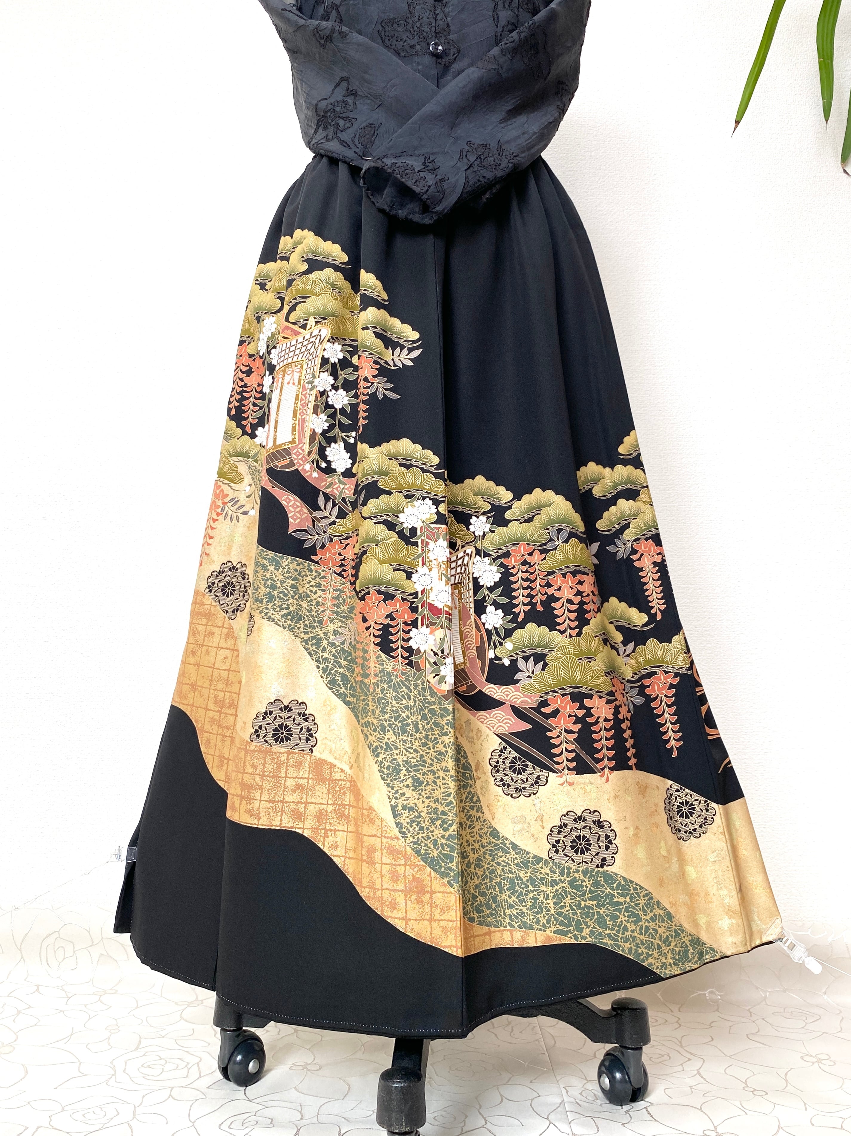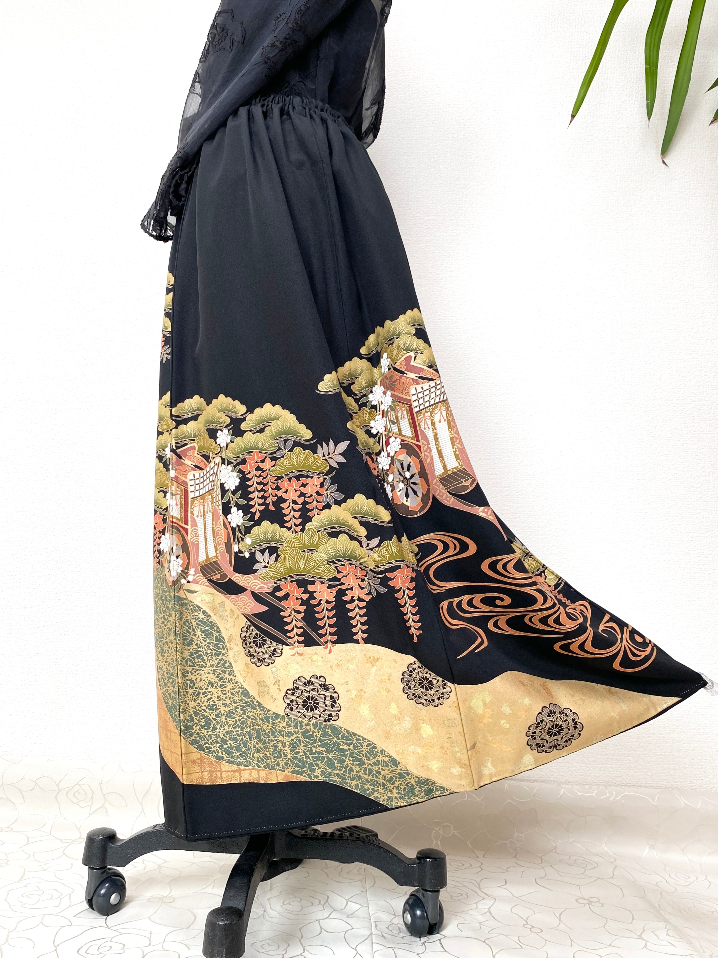 大人可愛いセレブ着物スカートフリーサイズ黒留袖着物リメイクウエストゴムロングスカート送料込みハンドメイドNO.6356