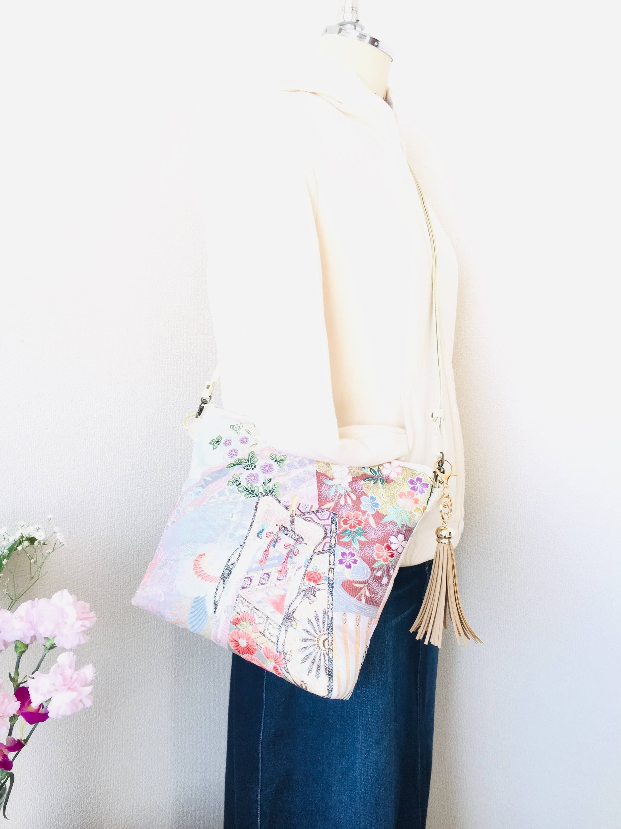 日本の古帯をリメイクして作成したショルダーバッグでハンドメイド品です。 帯リメイクバッグショルダーバッグ