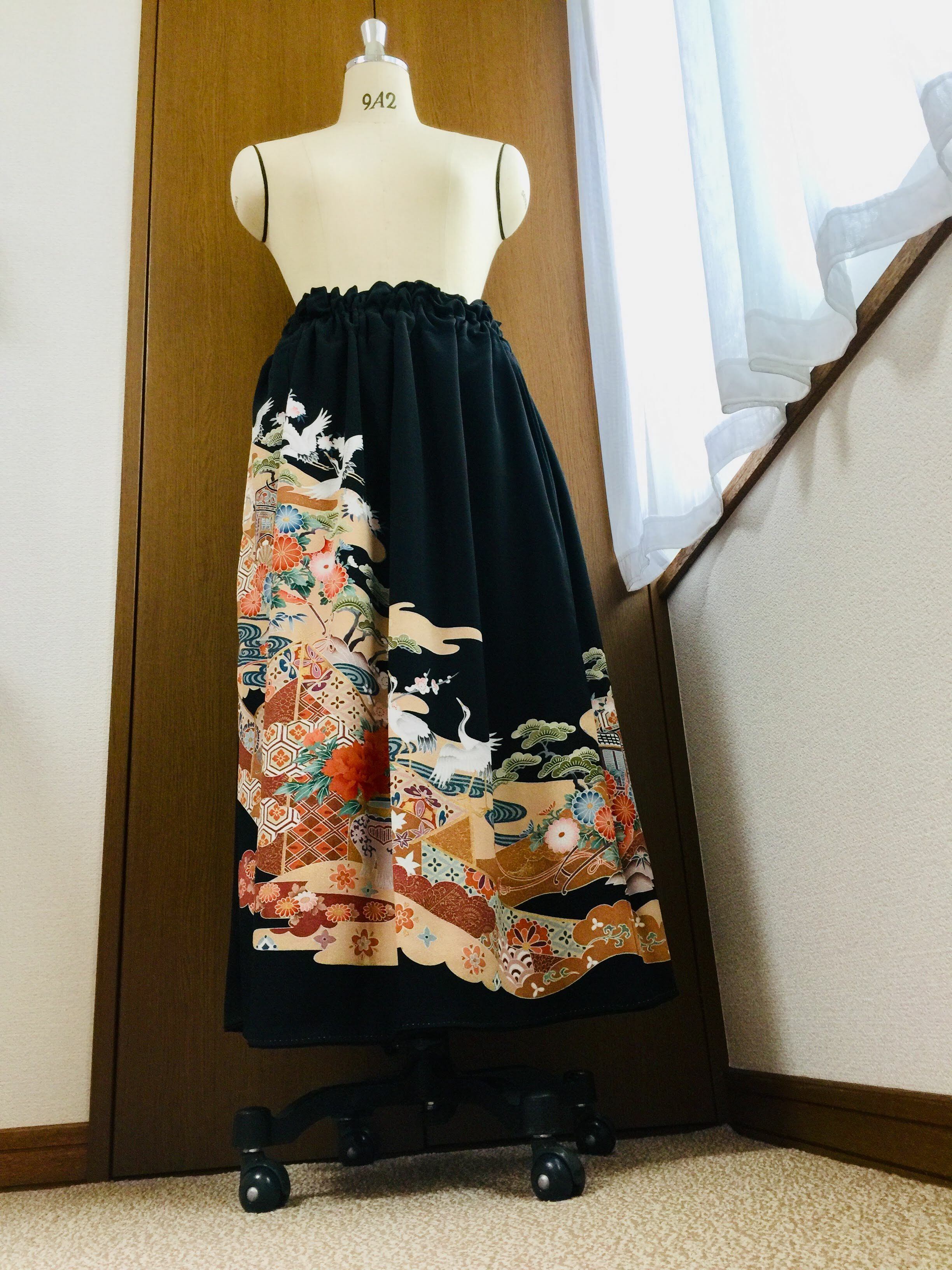 黒留袖で作製したドレススカートです。黒留袖リメイクドレススカート正絹生地。