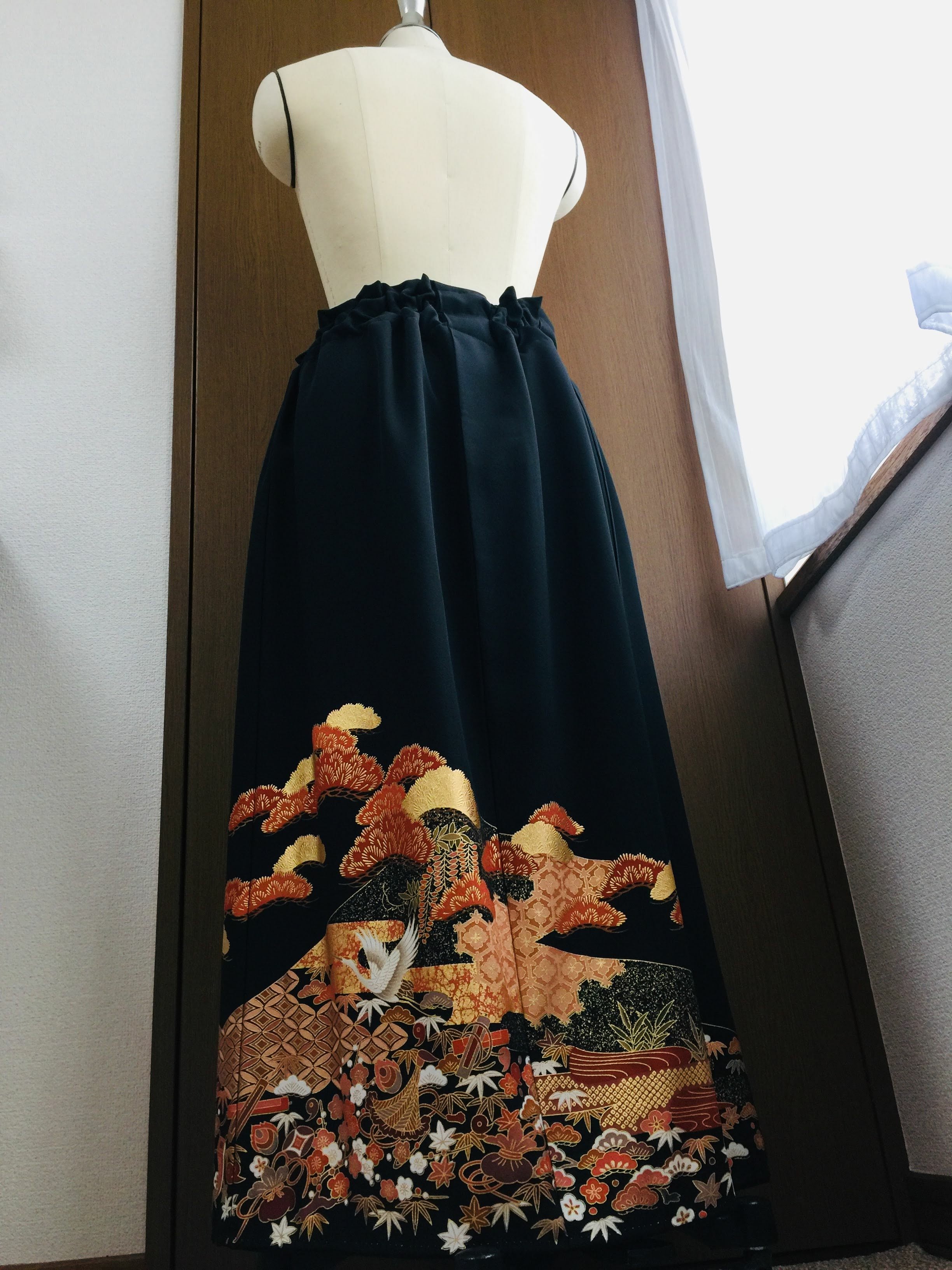 黒留袖をリメイクして作製したウエストゴムギャザースカートです。黒留袖リメイクドレススカート