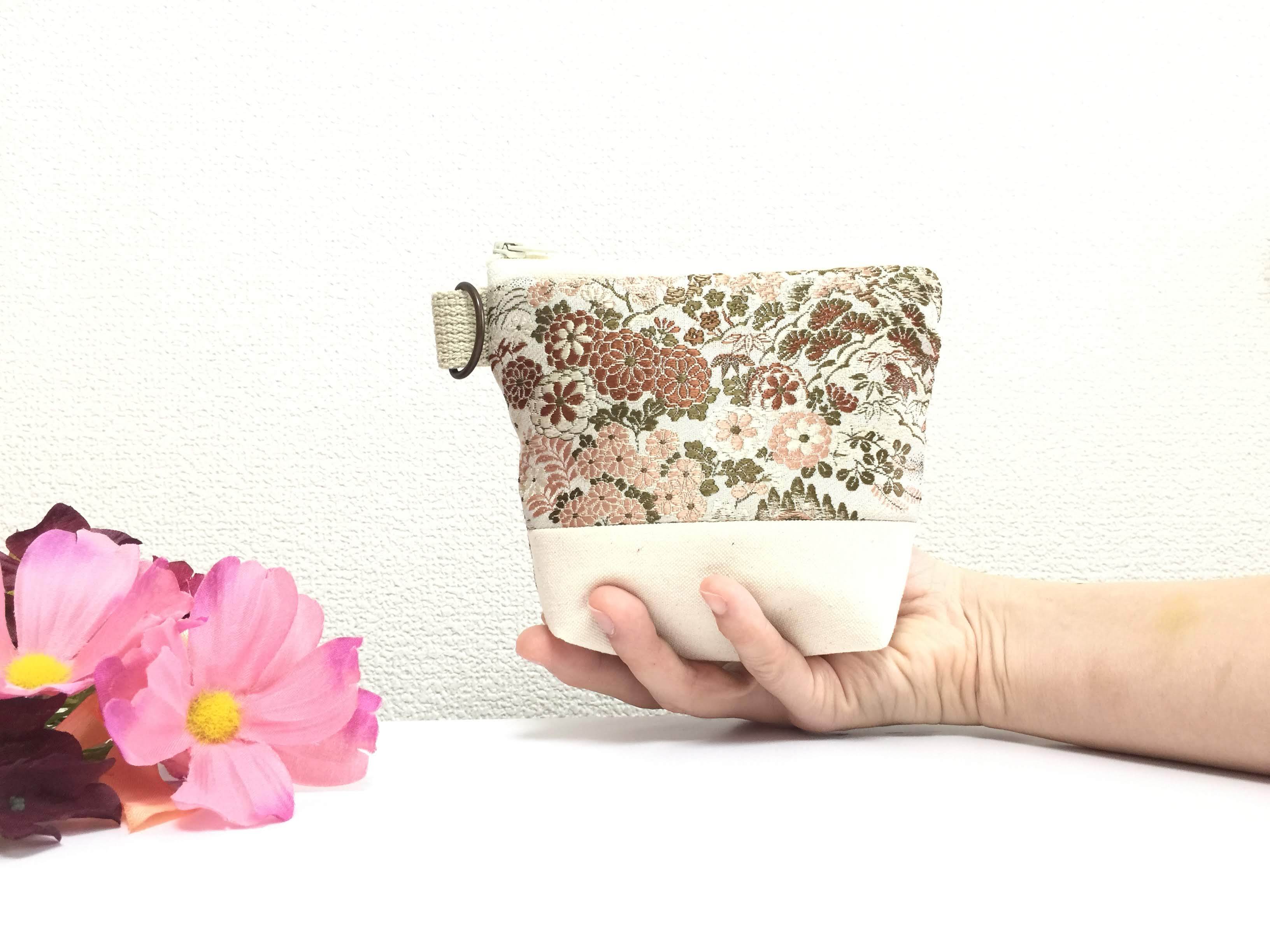 日本の古帯を再利用リメイクして作製したポーチでハンドメイド品です。帯リメイクポーチ化粧ポーチ。