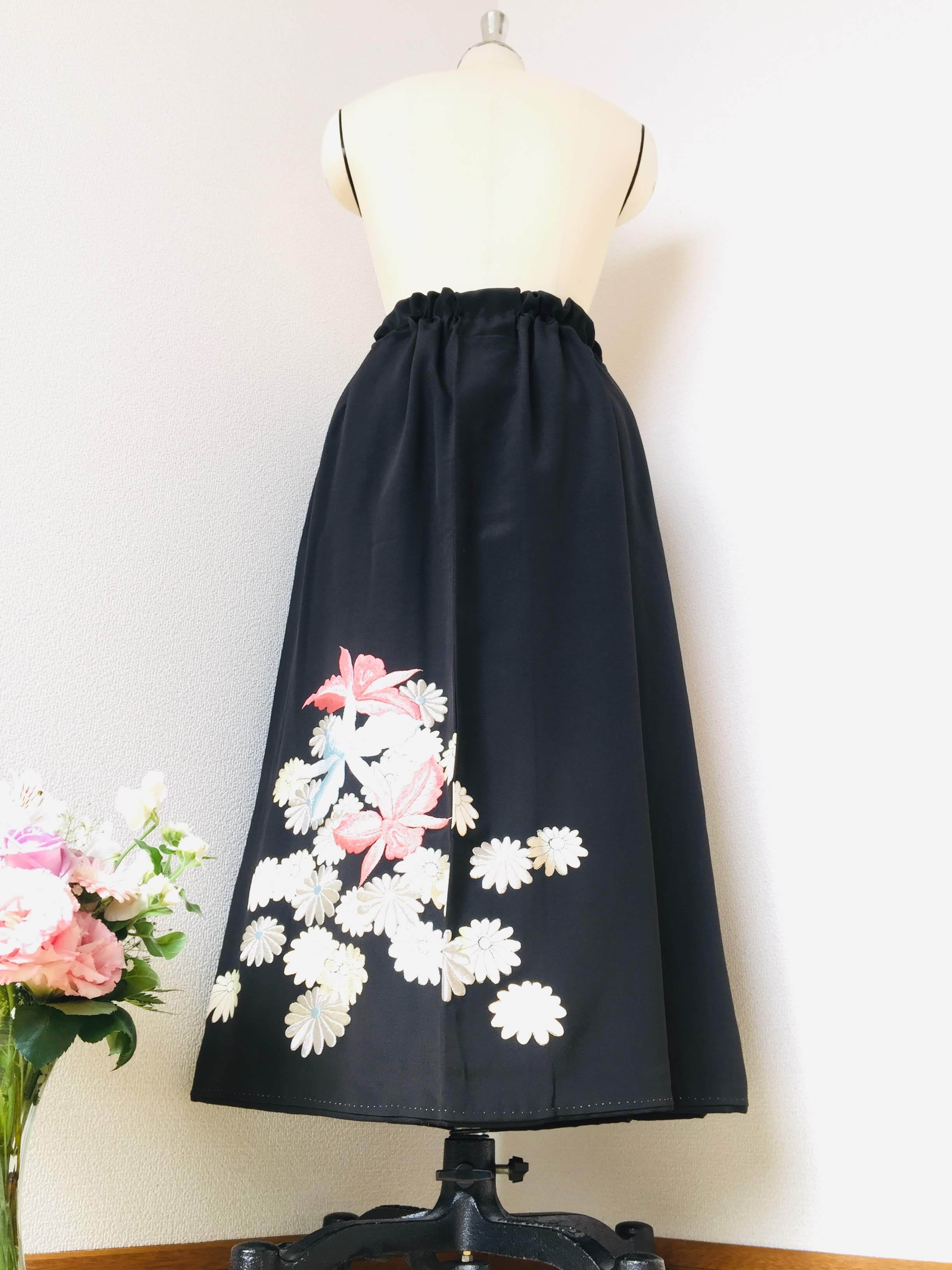 黒留袖着物リメイクウエストゴムギャザースカート送料無料フリーサイズ1点物黒留袖着物リメイクウエストゴムギャザースカートハンドメイド黒留袖着物リメイクスカート1点物NO.278
