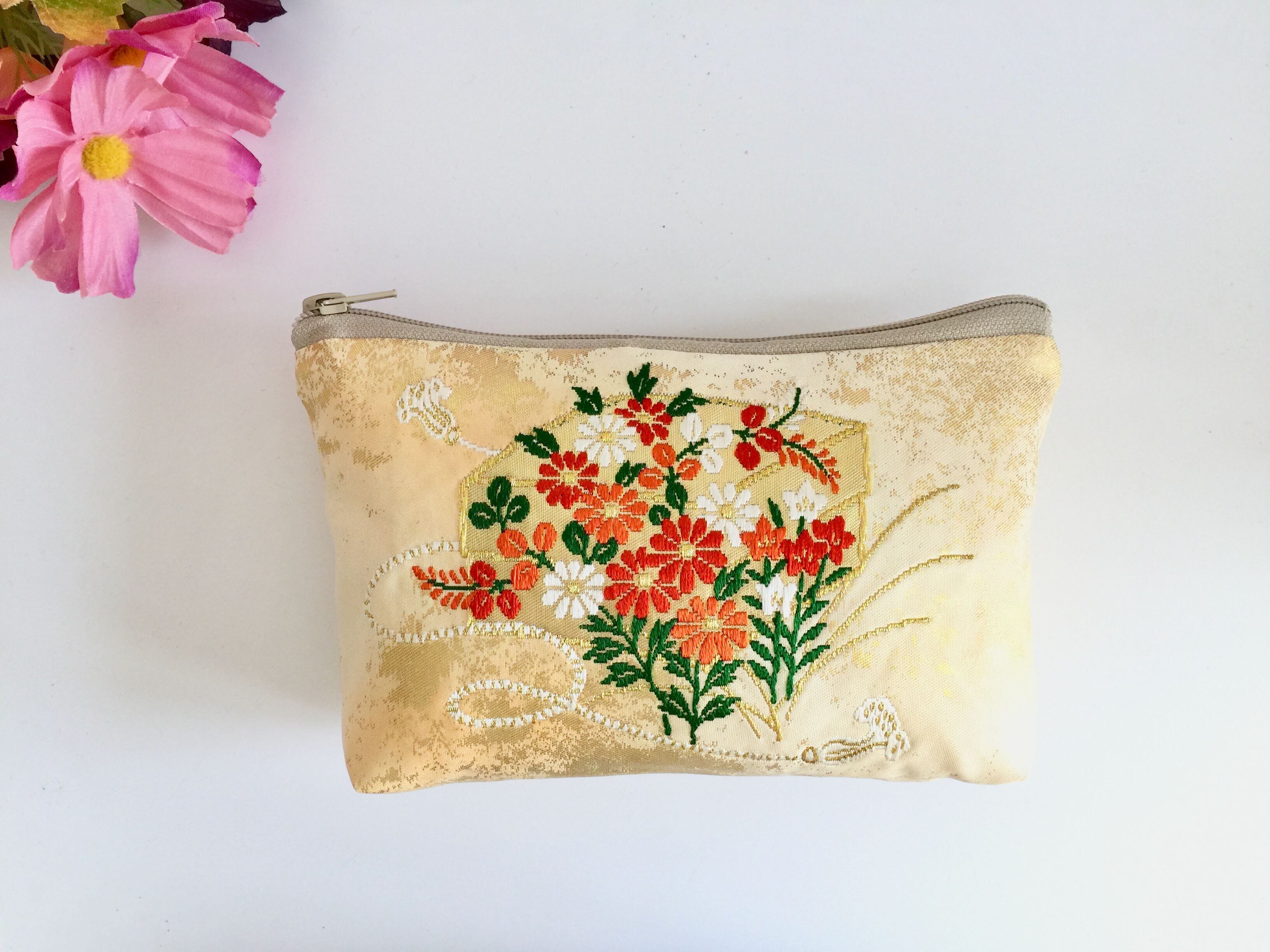 日本の古帯を再利用リメイクして作製したポーチでハンドメイド品です。帯リメイクポーチ化粧ポーチ トラベルポーチ数珠入れなど