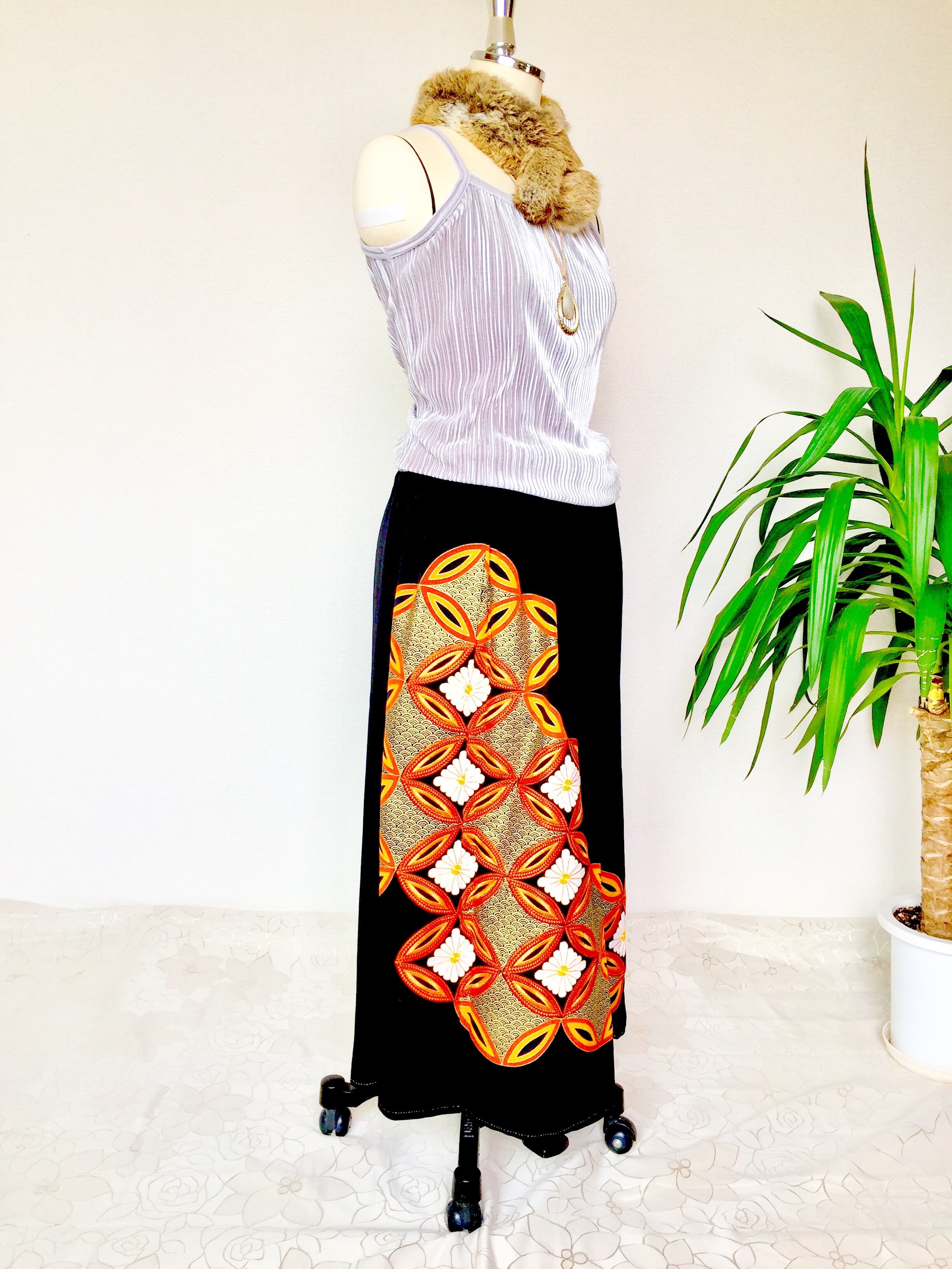 黒留袖着物をリメイクして作製したウエストゴムギャザードレススカートです。
