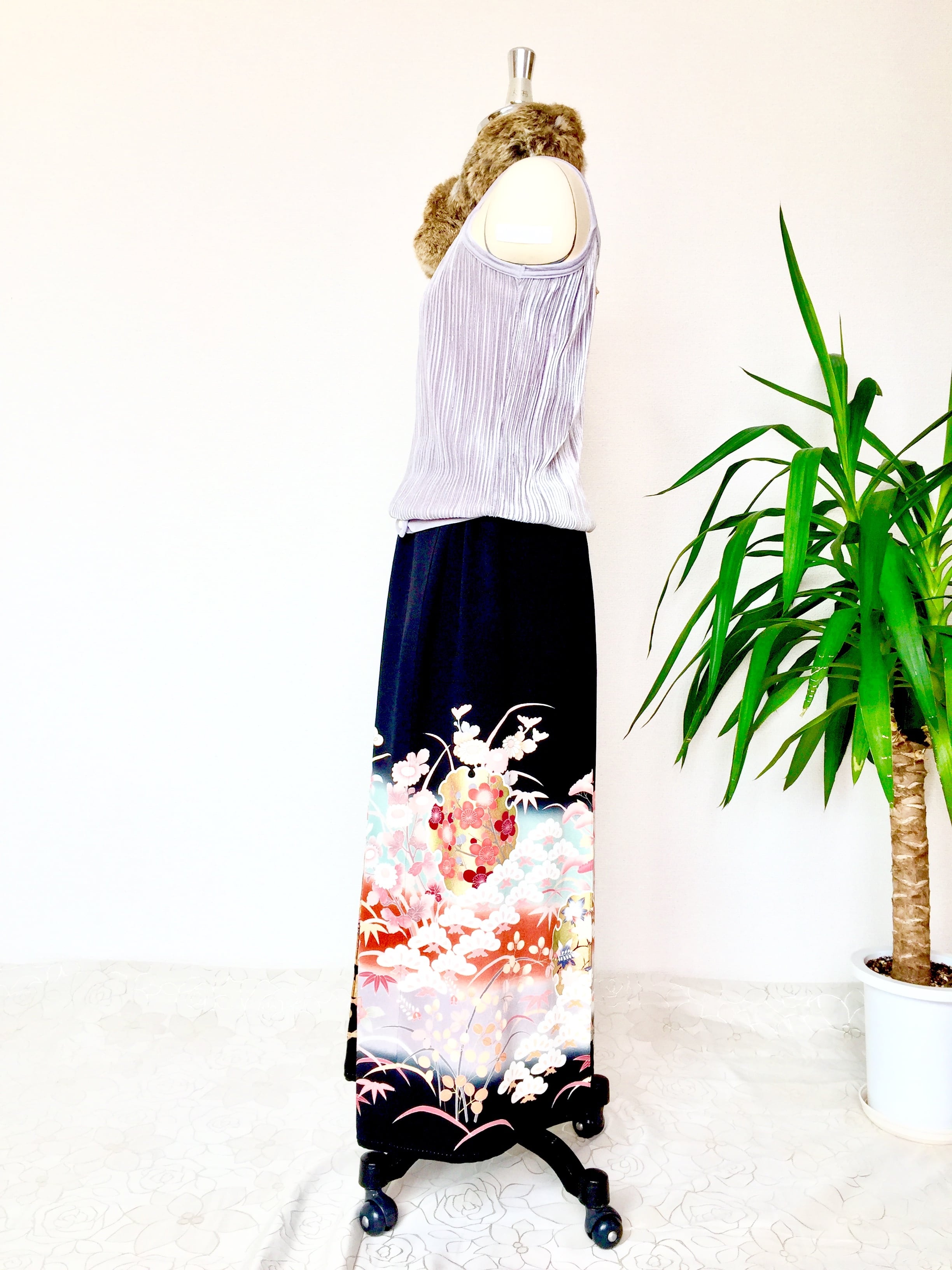 黒留袖着物リメイクウエストゴムギャザードレススカート(フリーサイズ)