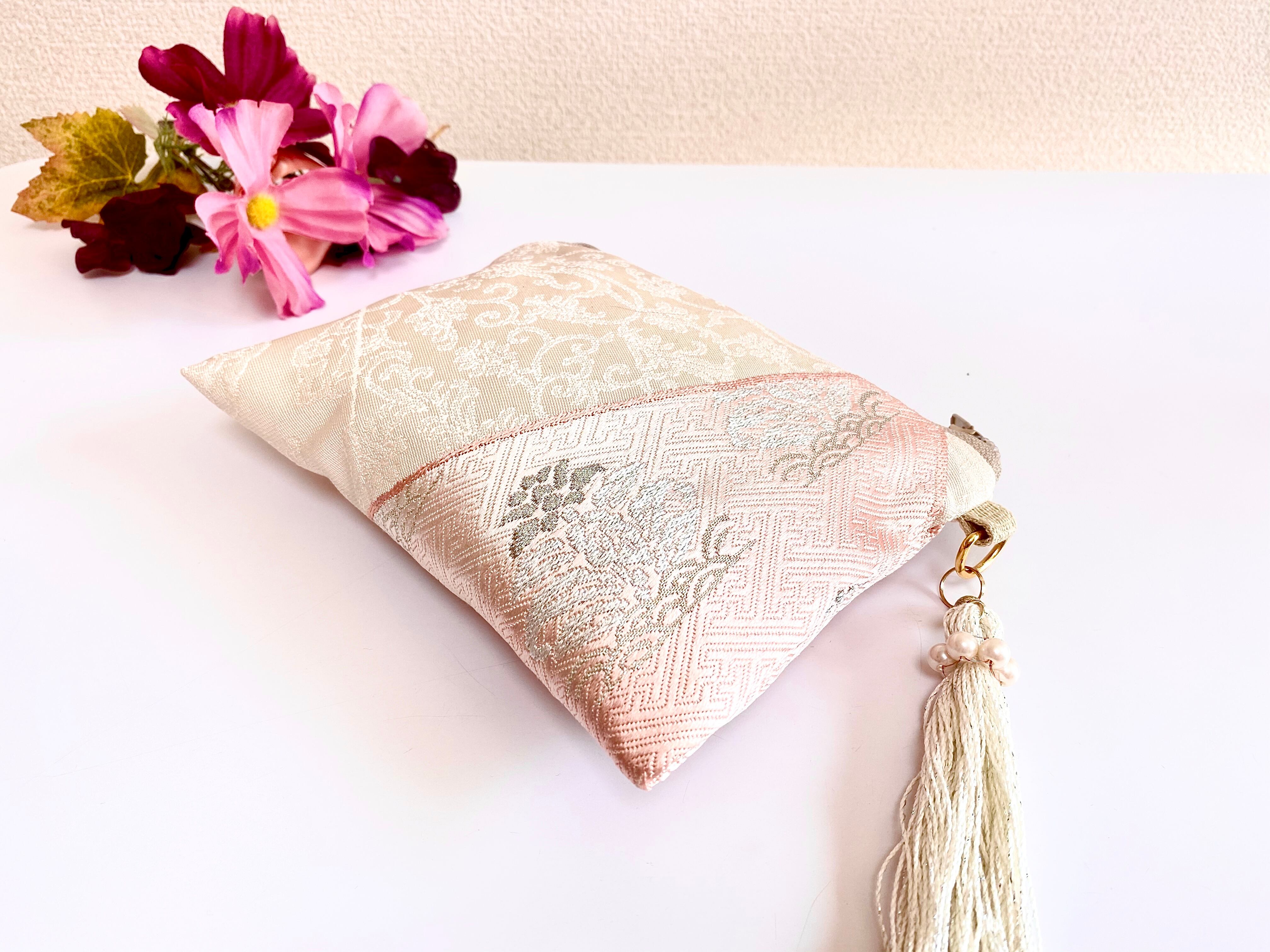 日本の古帯を再利用リメイクして作製したポーチでハンドメイド品です。帯リメイクポーチ化粧ポーチ トラベルポーチ数珠入れなど