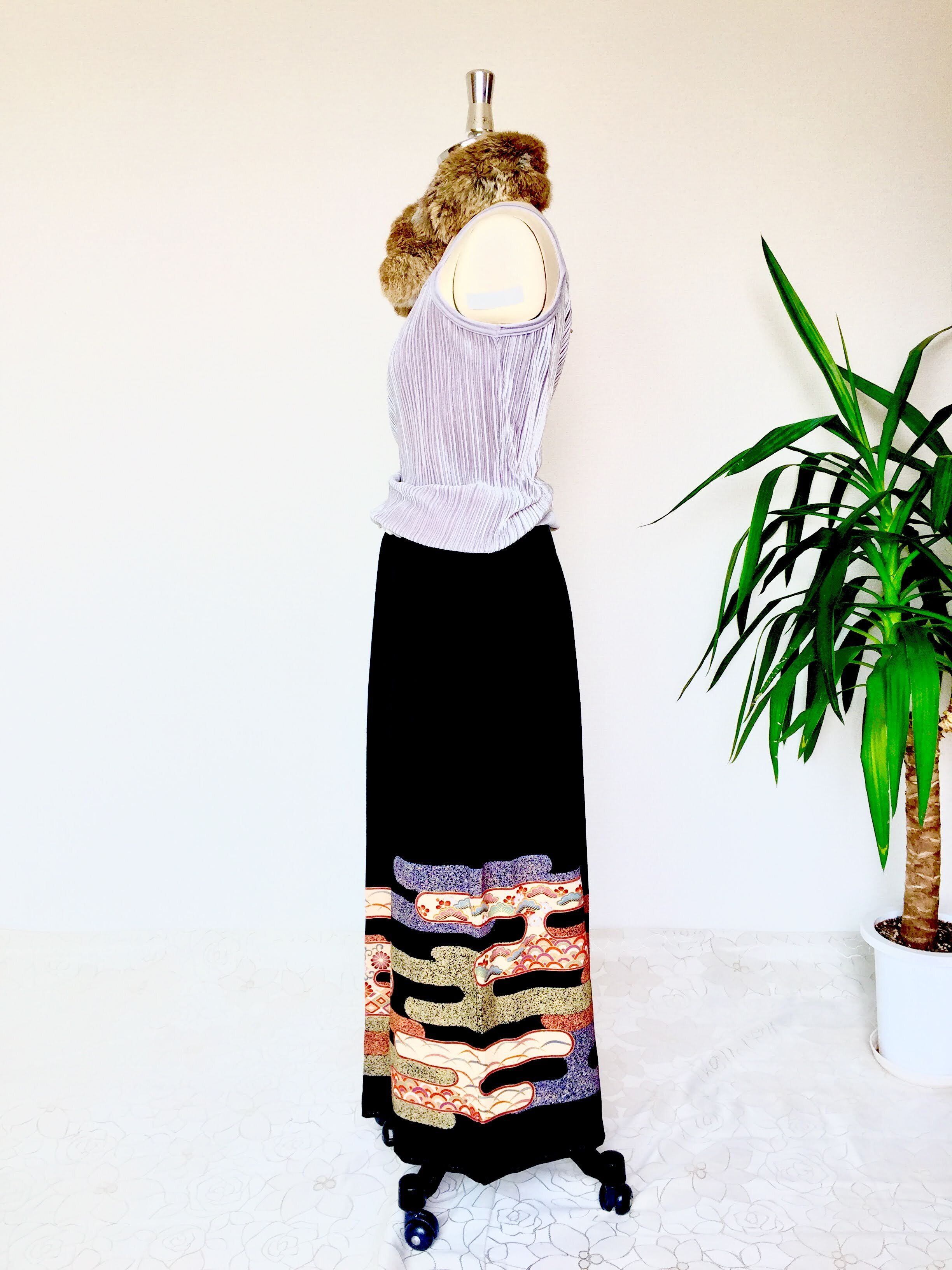 黒留袖着物をリメイクして作製したウエストゴムギャザードレススカートです。