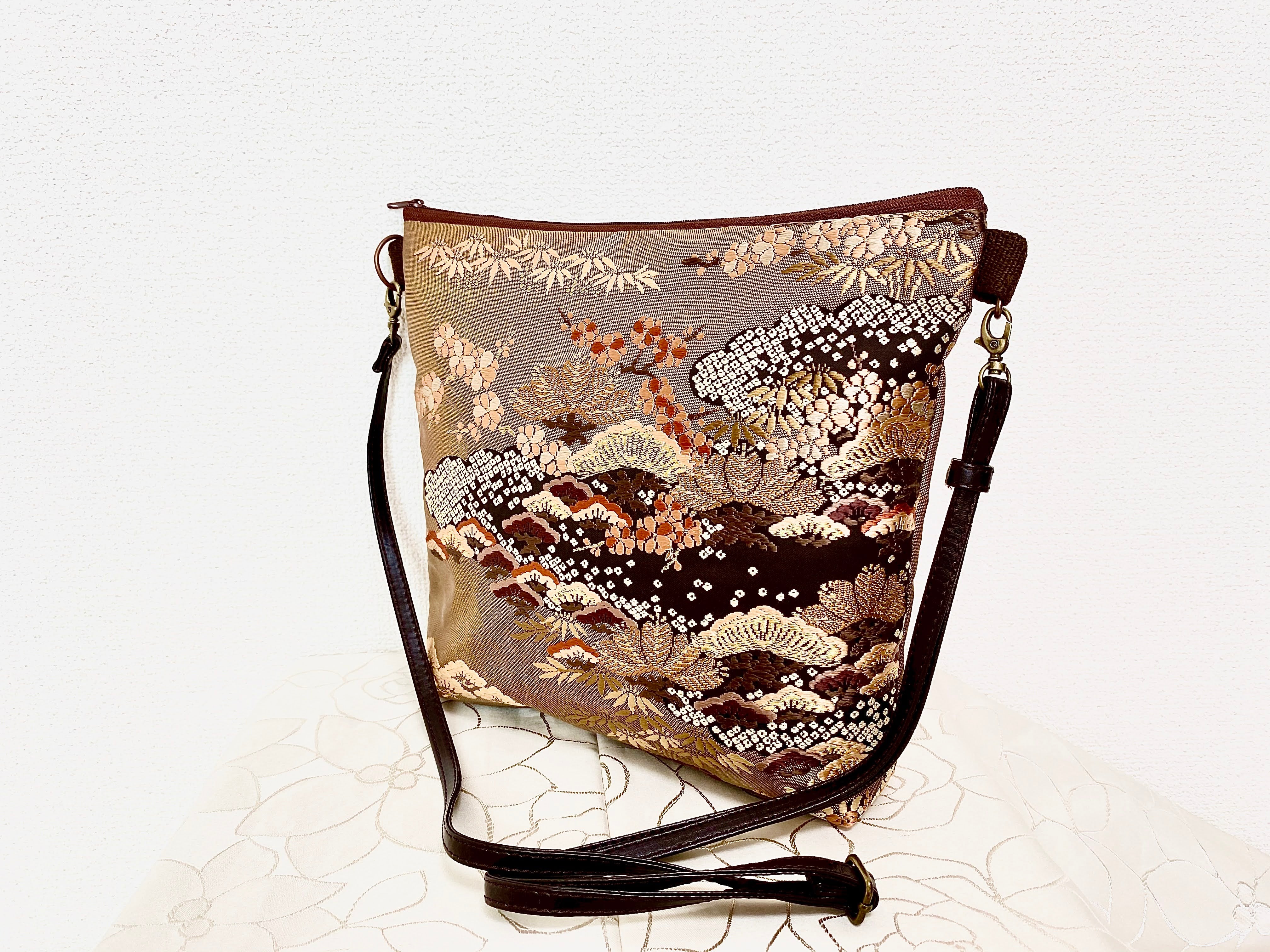 日本の古帯をリメイクして作成したショルダーバッグでハンドメイド品です。 帯リメイクバッグショルダーバッグ斜め掛けバッグポーチ付き