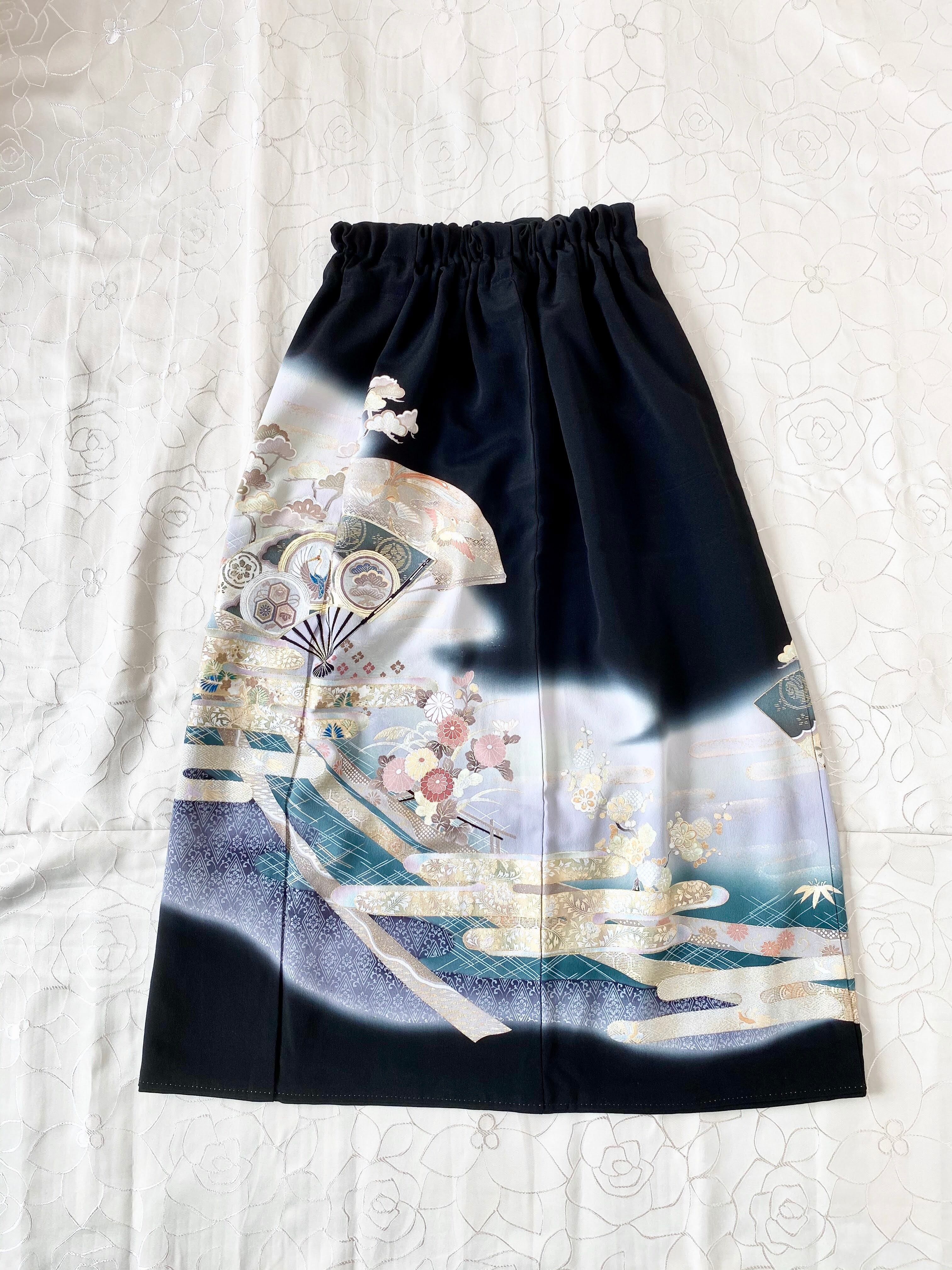 黒留袖着物をリメイクして作製したウエストゴムギャザードレススカートフリーサイズ(超ロング丈)です。