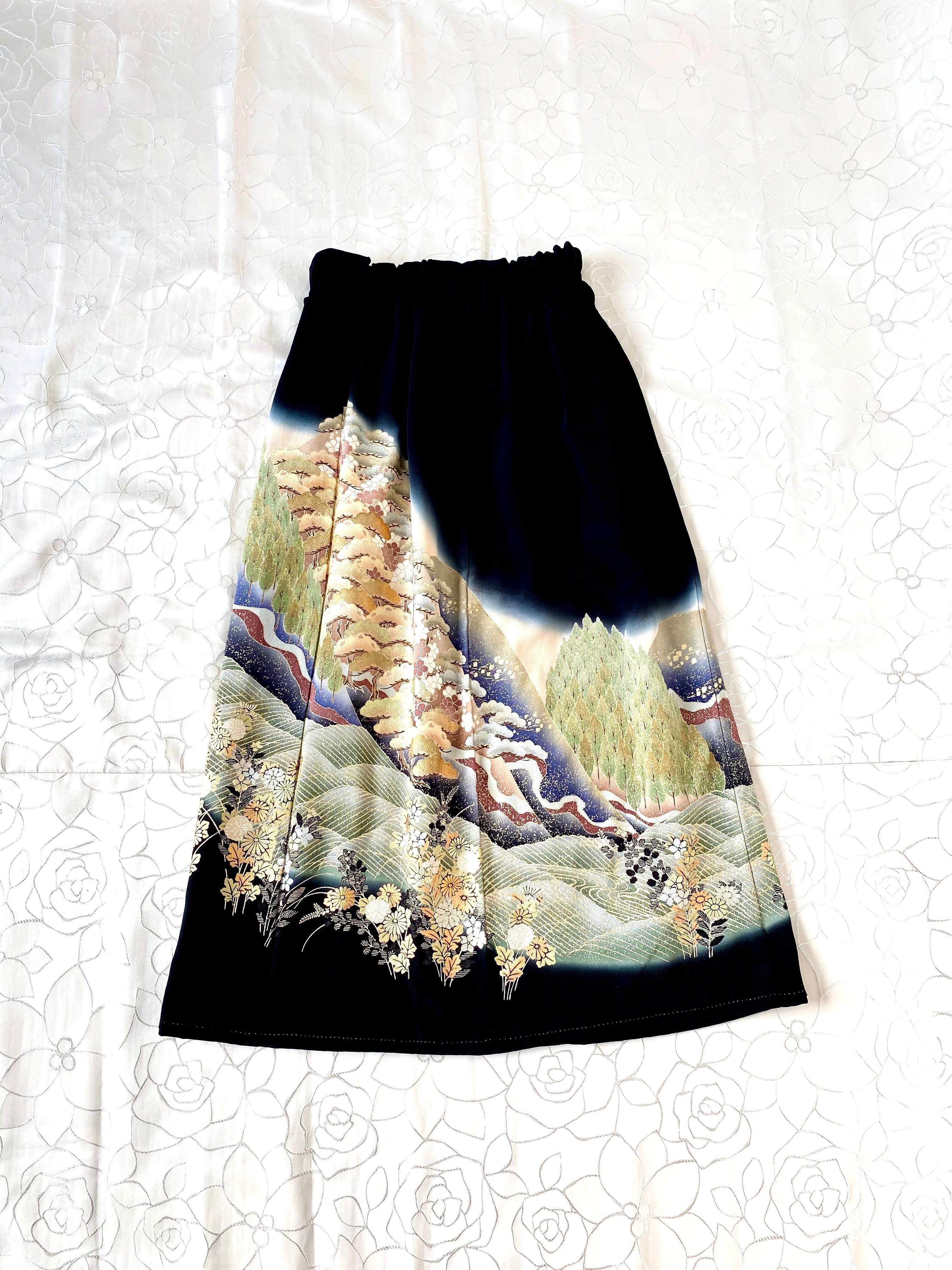 黒留袖着物リメイクウエストゴムスカート送料無料フリーサイズ1点物黒留袖着物リメイクウエストゴムギャザースカートハンドメイド黒留袖着物リメイクスカート1点物NO.436